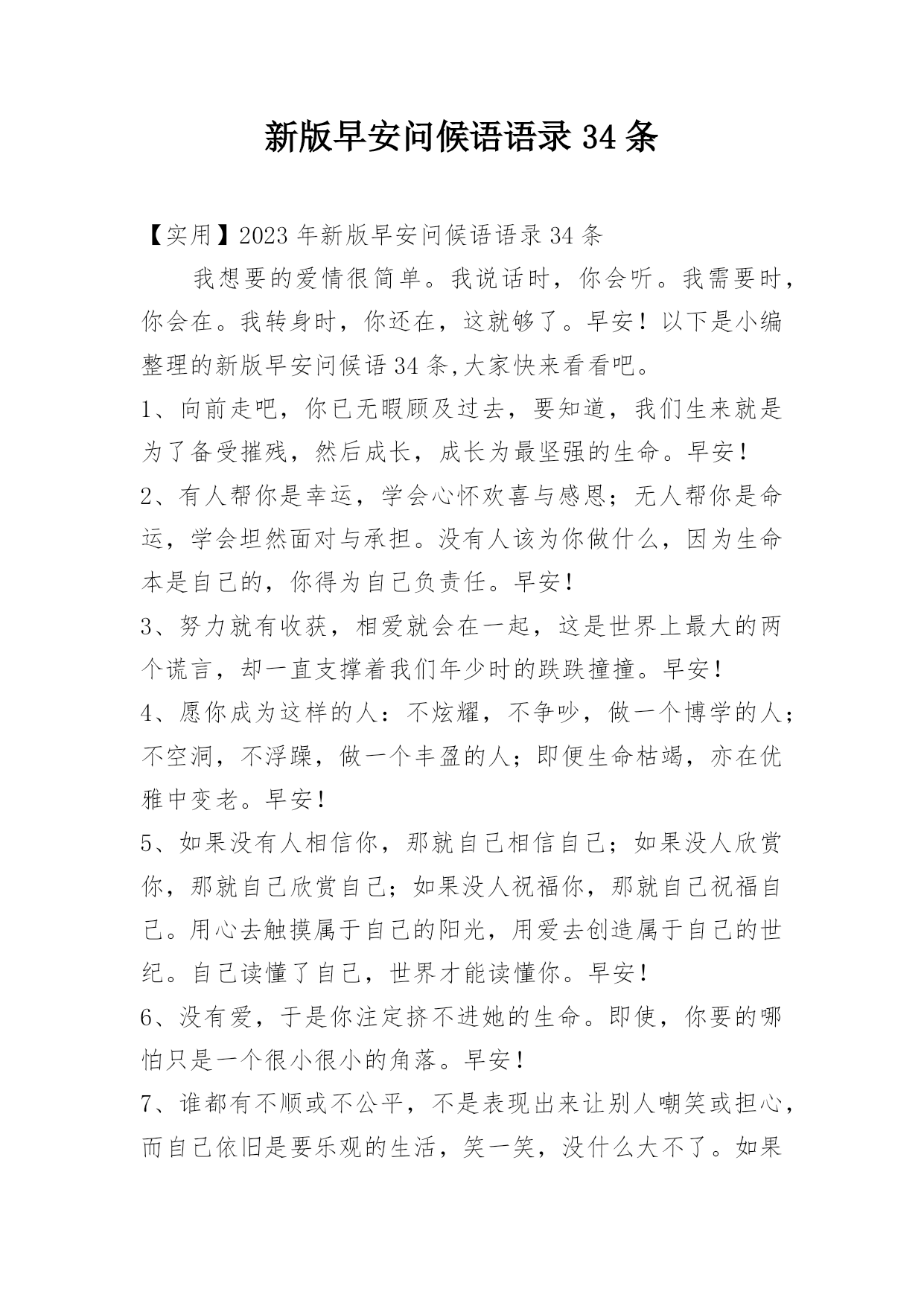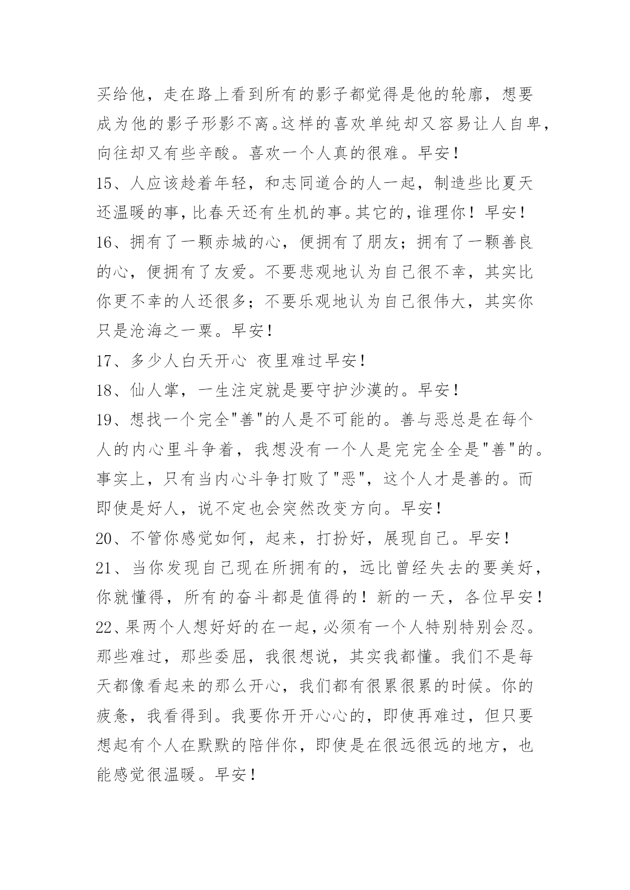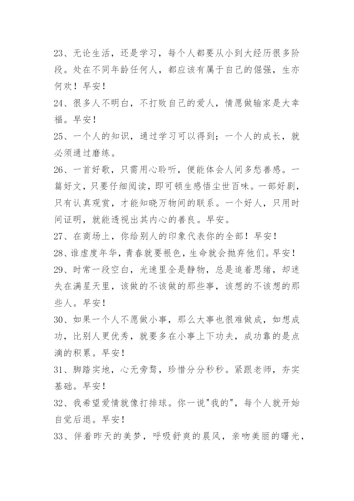 新版早安问候语语录34条 【实用】2023年新版早安问候语语录34条我想要的爱情很简单。我说话时,你会听。我需要时,你会在。我转身时,你还在,这就够了。早安!以下是小编整理的新版早安问候语34条,大家快来看看吧。1、向前走吧,你已无暇顾及过去,要知道,我们生来就是为了备受摧残,然后成长,成长为最坚强的生命。早安!2、有人帮你是幸运,学会心怀欢喜与感恩;无人帮你是命运,学会坦然面对与承担。没有人该为你做什么,因为生命本是自己的,你得为自己负责任。早安!3、努力就有收获,相爱就会在一起,这是世界上最大的两个谎言,却一直支撑着我们年少时的跌跌撞撞。早安!4、愿你成为这样的人:不炫耀,不争吵,做一个博学的人;不空洞,不浮躁,做一个丰盈的人;即便生命枯竭,亦在优雅中变老。早安!5、如果没有人相信你,那就自己相信自己;如果没人欣赏你,那就自己欣赏自己;如果没人祝福你,那就自己祝福自己。用心去触摸属于自己的阳光,用爱去创造属于自己的世纪。自己读懂了自己,世界才能读懂你。早安!6、没有爱,于是你注定挤不进她的生命。即使,你要的哪怕只是一个很小很小的角落。早安!7、谁都有不顺或不公平,不是表现出来让别人嘲笑或担心,而自己依旧是要乐观的生活,笑一笑,没什么大不了。如果你的成功定义是超越别人,那么注定会失败,因为世上总有比你强的人,如果成功的定义是超越自己,那么真的只要努力就会成功。早安!8、成功的秘诀就是抓住目标不放。失败者只所以失败,就在于毫无目标或对目标的遗忘;成功者只所以成功,就在于从不因别人说他的愿望不能实现而彷徨。早安!9、有时候人变得越来越不像自己,被周围环境过分影响,比如看到大家都买名牌了,我也买吧,看到邻居朋友都换车了,我也得跟上步伐,却忘了这个世界还有太多不一样的活法,比如在旅行中,你会看到依然有很多的人,他们不像大多数人那样去生活,依然活得自在充沛。所以,人的视野很重要。加油,早安!10、好好珍惜你拥有的每一个瞬息,尽量多地去珍惜,因为你正在和一些特别的人、那些足够特别的人一起分享你的时刻。记住时间不会为任何人停下脚步。我们再是没有一个更好的时间比当下更能使你快乐了。早安。11、生活在前进。它之所以前进,是因为有希望在;没有了希望,绝望就会把生命毁掉。早安!12、你以为我只是怕疼,我想说,疼痛过后的冷清才是最可怕的。总以为记得疼的滋味,便会一直放松,只是每次的疼都不雷同。早安!13、一个人一生中幸运与不幸的比例本应各占一半,但各种因素漫不经心的组合却常常改变这一比例。早安!14、喜欢一个人的感觉就像,去逛超市看到喜欢的东西都想买给他,走在路上看到所有的影子都觉得是他的轮廓,想要成为他的影子形影不离。这样的喜欢单纯却又容易让人自卑,向往却又有些辛酸。喜欢一个人真的很难。早安!15、人应该趁着年轻,和志同道合的人一起,制造些比夏天还温暖的事,比春天还有生机的事。其它的,谁理你!早安!16、拥有了一颗赤城的心,便拥有了朋友;拥有了一颗善良的心,便拥有了友爱。不要悲观地认为自己很不幸,其实比你更不幸的人还很多;不要乐观地认为自己很伟大,其实你只是沧海之一粟。早安!17、多少人白天开心夜里难过早安!18、仙人掌,一生注定就是要守护沙漠的。早安!19、想找一个完全"善"的人是不可能的。善与恶总是在每个人的内心里斗争着,我想没有一个人是完完全全是"善"的。事实上,只有当内心斗争打败了"恶",这个人才是善的。而即使是好人,说不定也会突然改变方向。早安!20、不管你感觉如何,起来,打扮好,展现自己。早安!21、当你发现自己现在所拥有的,远比曾经失去的要美好,你就懂得,所有的奋斗都是值得的!新的一天,各位早安!22、果两个人想好好的在一起,必须有一个人特别特别会忍。那些难过,那些委屈,我很想说,其实我都懂。我们不是每天都像看起来的那么开心,我们都有很累很累的时候。你的疲惫,我看得到。我要你开开心心的,即使再难过,但只要想起有个人在默默的陪伴你,即使是在很远很远的地方,也能感觉很温暖。早安!23、无论生活,还是学习,每个人都要从小到大经历很多阶段。处在不同年龄任何人,都应该有属于自己的倔强,生亦何欢!早安!24、很多人不明白,不打败自己的爱人,情愿做输家是大幸福。早安!25、一个人的知识,通过学习可以得到;一个人的成长,就必须通过磨练。26、一首好歌,只需用心聆听,便能体会人间多愁善感。一篇好文,只要仔细阅读,即可顿生感悟尘世百味。一部好剧,只有认真观赏,才能知晓万物间的联系。一个好人,只用时间证明,就能透视出其内心的善良。早安。27、在商场上,你给别人的印象代表你的全部!早安!28、谁虚度年华,青春就要裉色,生命就会抛弃他们。早安!29、时常一段空白,光速里全是静物,总是追着思绪,却迷失在满星天里,该做的不该做的那些事,该想的不该想的那些人。早