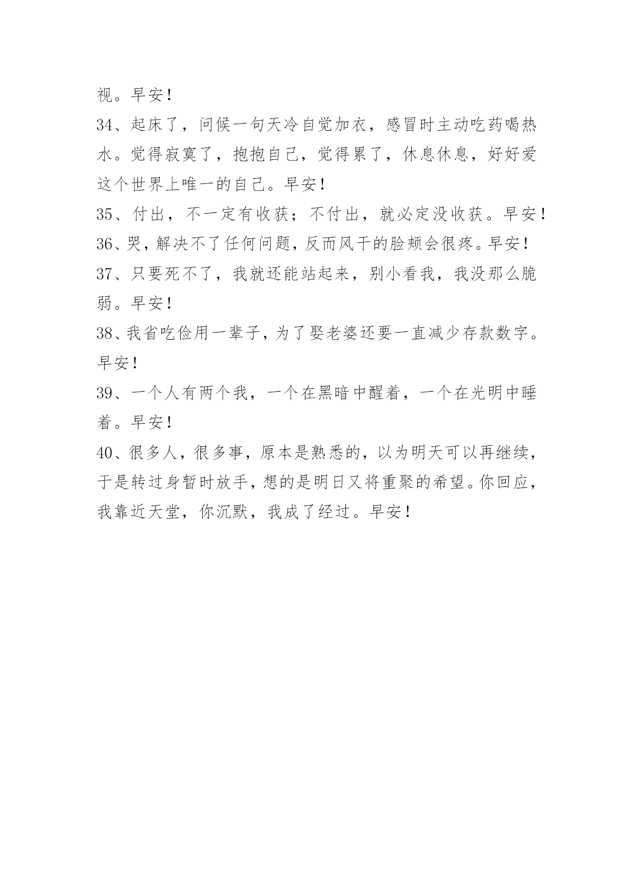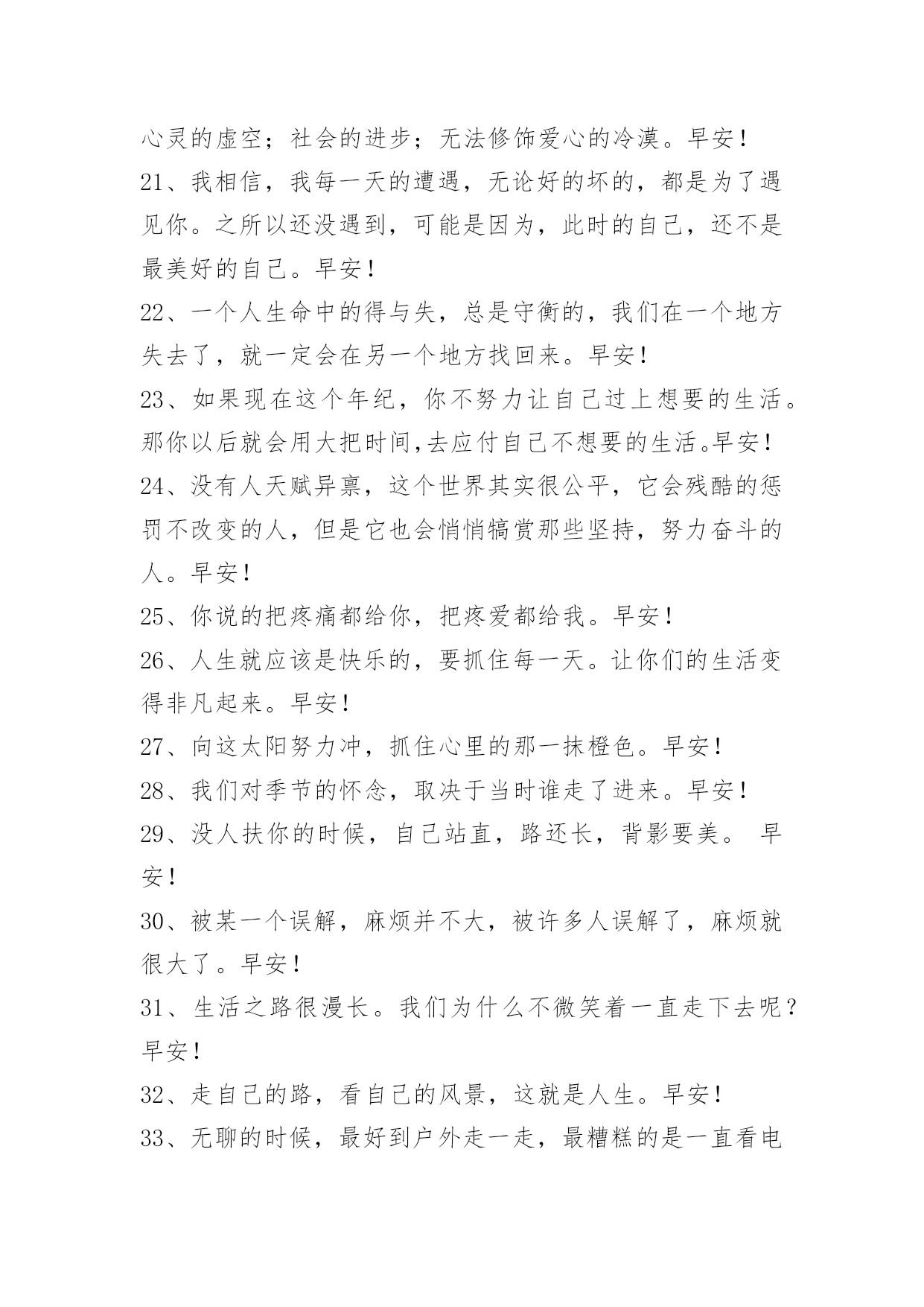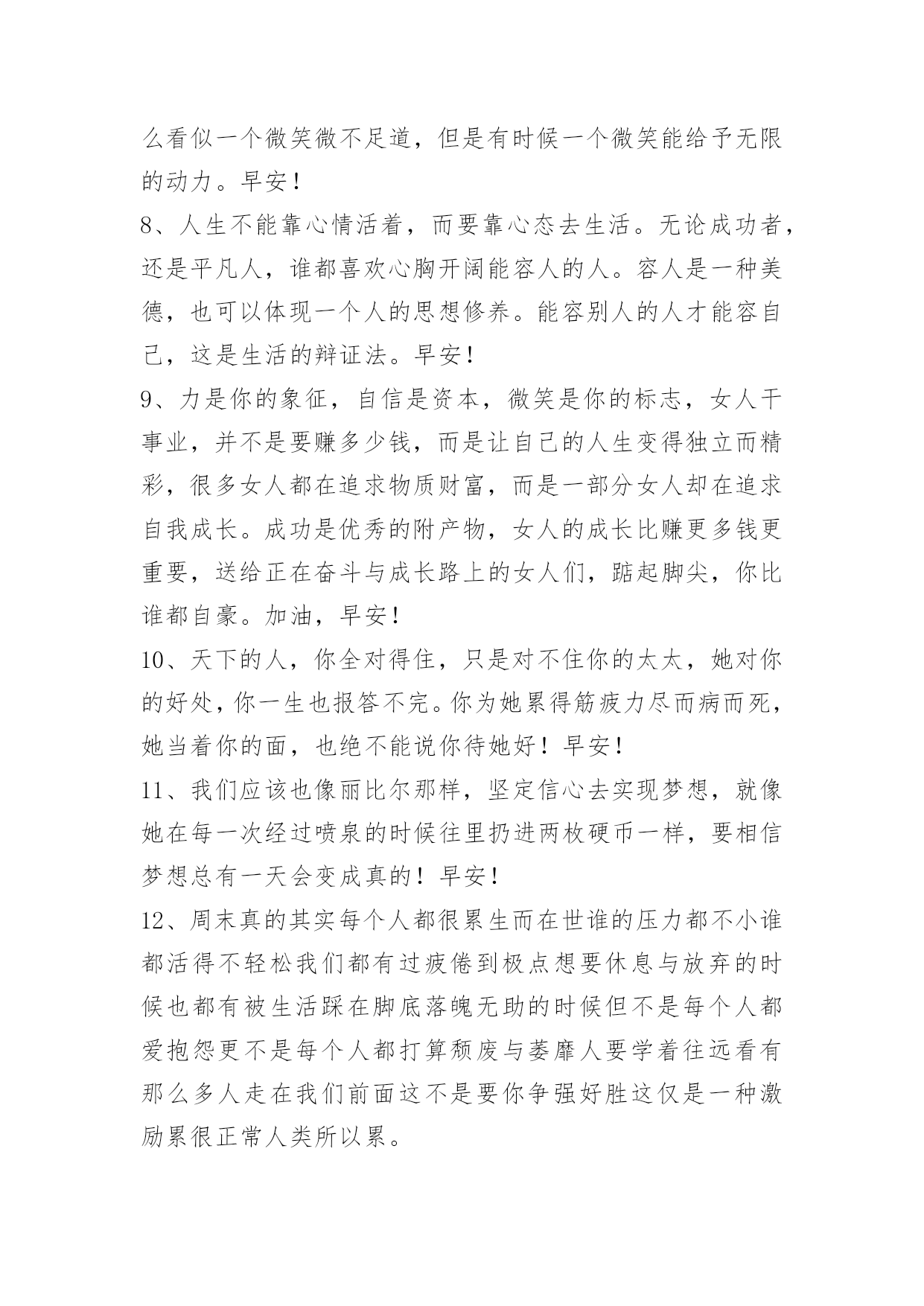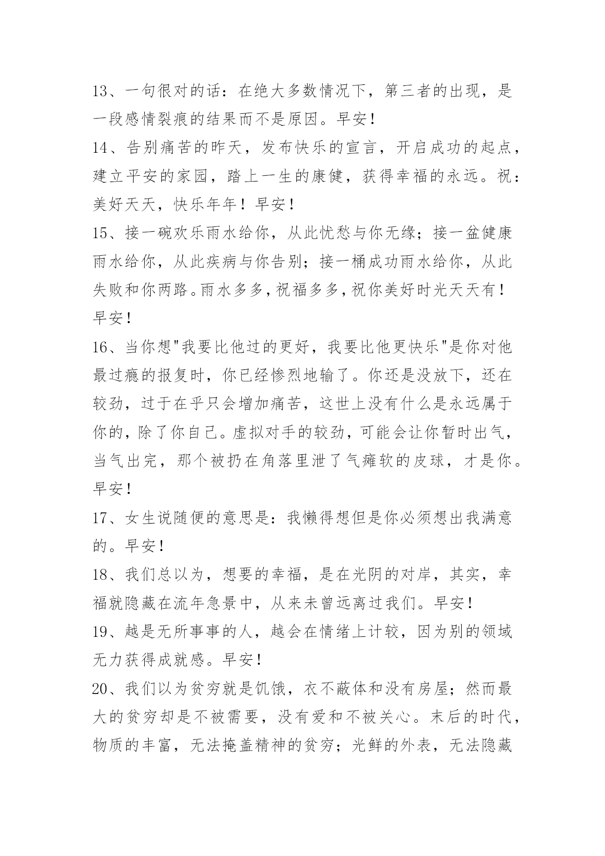 新版早安问候语短信 【推荐】新版早安问候语短信40句只有一个人能界定你一生的成就,那就是你自己。早安!下面是小编精心准备的新版早安问候语40句,感兴趣的一起来看看吧。1、希望曾经的仰望,都能成为以后的日常。早安!2、好的坏的我们都收下吧,然后一声不响,继续生活。胜不窃狂,挫不言败,不轻犯险,不易冒进,不松懈,不停顿,困苦都在脚下,未来终是美丽。早安!3、嫁的人是谁,很重要,因为他决定着你一辈子的生活状态。娶的人是谁,更重要,她很有可能决定着你一生的层次和高度。不要将就的嫁,也别违心的娶。早安!4、再漂亮的人,也会有凄凉;再执着的未来,也会有以往;再潇洒的海鸥,也会有迷惘;再优美的旋律,也会有情殇;再期盼的目光,也会有失望;再低调的故事,也会有倔强;再纯净的文字,也会有悲伤;再动人的风花雪月,也等不到地久天长;仅以此文,献给那些曾经坚强如今绝望的人们。5、有一种心情叫做'雨过天晴',有一种友情能够'风雨同舟',有一种成功犹如'雨后春笋',有一种祝福'风雨无阻',下雨了,愿你雨天心情快乐,幸福围绕。早安!6、与其皱着眉头送人一件贵重礼品,不如面带笑容送上一件小礼物。早安!7、微笑并不只是一种表情,更重要的是这表情所蕴含着什么看似一个微笑微不足道,但是有时候一个微笑能给予无限的动力。早安!8、人生不能靠心情活着,而要靠心态去生活。无论成功者,还是平凡人,谁都喜欢心胸开阔能容人的人。容人是一种美德,也可以体现一个人的思想修养。能容别人的人才能容自己,这是生活的辩证法。早安!9、力是你的象征,自信是资本,微笑是你的标志,女人干事业,并不是要赚多少钱,而是让自己的人生变得独立而精彩,很多女人都在追求物质财富,而是一部分女人却在追求自我成长。成功是优秀的附产物,女人的成长比赚更多钱更重要,送给正在奋斗与成长路上的女人们,踮起脚尖,你比谁都自豪。加油,早安!10、天下的人,你全对得住,只是对不住你的太太,她对你的好处,你一生也报答不完。你为她累得筋疲力尽而病而死,她当着你的面,也绝不能说你待她好!早安!11、我们应该也像丽比尔那样,坚定信心去实现梦想,就像她在每一次经过喷泉的时候往里扔进两枚硬币一样,要相信梦想总有一天会变成真的!早安!12、周末真的其实每个人都很累生而在世谁的压力都不小谁都活得不轻松我们都有过疲倦到极点想要休息与放弃的时候也都有被生活踩在脚底落魄无助的时候但不是每个人都爱抱怨更不是每个人都打算颓废与萎靡人要学着往远看有那么多人走在我们前面这不是要你争强好胜这仅是一种激励累很正常人类所以累。13、一句很对的话:在绝大多数情况下,第三者的出现,是一段感情裂痕的结果而不是原因。早安!14、告别痛苦的昨天,发布快乐的宣言,开启成功的起点,建立平安的家园,踏上一生的康健,获得幸福的永远。祝:美好天天,快乐年年!早安!15、接一碗欢乐雨水给你,从此忧愁与你无缘;接一盆健康雨水给你,从此疾病与你告别;接一桶成功雨水给你,从此失败和你两路。雨水多多,祝福多多,祝你美好时光天天有!早安!16、当你想"我要比他过的更好,我要比他更快乐"是你对他最过瘾的报复时,你已经惨烈地输了。你还是没放下,还在较劲,过于在乎只会增加痛苦,这世上没有什么是永远属于你的,除了你自己。虚拟对手的较劲,可能会让你暂时出气,当气出完,那个被扔在角落里泄了气瘫软的皮球,才是你。早安!17、女生说随便的意思是:我懒得想但是你必须想出我满意的。早安!18、我们总以为,想要的幸福,是在光阴的对岸,其实,幸福就隐藏在流年急景中,从来未曾远离过我们。早安!19、越是无所事事的人,越会在情绪上计较,因为别的领域无力获得成就感。早安!20、我们以为贫穷就是饥饿,衣不蔽体和没有房屋;然而最大的贫穷却是不被需要,没有爱和不被关心。末后的时代,物质的丰富,无法掩盖精神的贫穷;光鲜的外表,无法隐藏心灵的虚空;社会的进步;无法修饰爱心的冷漠。早安!21、我相信,我每一天的遭遇,无论好的坏的,都是为了遇见你。之所以还没遇到,可能是因为,此时的自己,还不是最美好的自己。早安!22、一个人生命中的得与失,总是守衡的,我们在一个地方失去了,就一定会在另一个地方找回来。早安!23、如果现在这个年纪,你不努力让自己过上想要的生活。那你以后就会用大把时间,去应付自己不想要的生活。早安!24、没有人天赋异禀,这个世界其实很公平,它会残酷的惩罚不改变的人,但是它也会悄悄犒赏那些坚持,努力奋斗的人。早安!25、你说的把疼痛都给你,把疼爱都给我。早安!26、人生就应该是快乐的,要抓住每一天。让你们的生活变得非凡起来。早安!27、向这太阳努力冲,抓住心里的那一抹橙色。早安!28、我们对季节的怀念,取决于当时谁走了进来。早安!29、没人扶你的时候,自己站直,路还长,背影要美。早安!30、被某一个误解,麻烦并不大,被许多