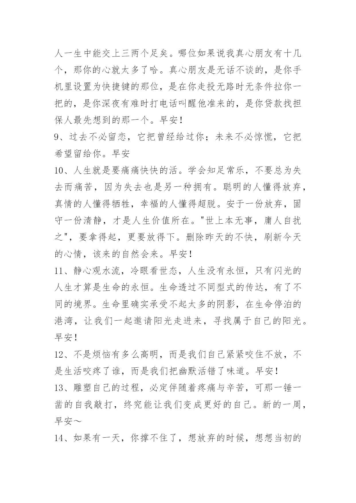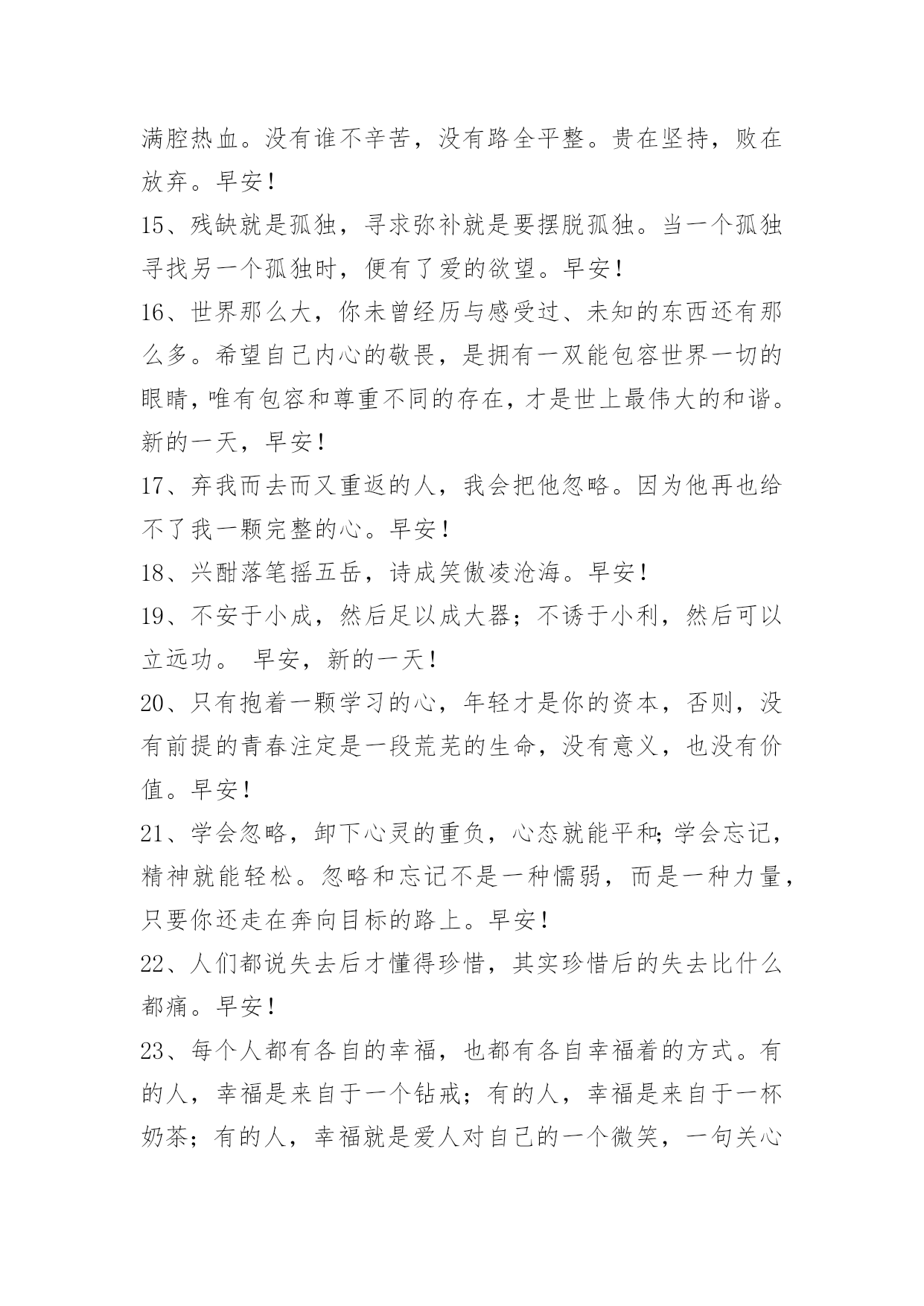 新版早安问候语短信 新版早安问候语短信23句所谓幸福,就是一个笨蛋遇到一个傻瓜,引来无数人的羡慕和嫉妒,风风雨雨,平平淡淡。早安!下面是小编精心准备的新版早安问候语23句,欢迎大家前来欣赏。1、为了生活努力发挥自己的作用,热爱生活吧。早安!2、做人争得他人共鸣,做事方得他人协助。早安!3、爱会让你的生命发光,需要会让你的生命珍贵,希望会让你的生命多彩。正视自我,做好自己,你的生命会如花绽放!早安!4、如果你不能接受最差错的我,你就不配拥有最好的我。你在我最低俗的时候离开,就不要在我辉煌的时候回来。早安!5、生,与其不断追求而无法满足,不如先沉淀自己,看清内心深处真正的需求。只要愿意打开封闭的心,去体会、去拥抱眼前的幸福,就会比别人活得更富足,更开心。早安!6、问候写在蓝天上,云儿白了;将问候写在晨曦里,太阳笑了;将问候写在文字里,你读懂了。送真情,送祝愿,祝朋友开心常如愿。早安!7、对此,仁者见仁,智者见智。有人认为,能否成功在于胸怀大志与老实肯干;有人认为,能否成功在于是不是勤奋;还有人认为,能否成功,关键在于一个人的机遇。早安!8、真心朋友是心灵鸡汤,但不一定每个人都能真正拥有。人一生中能交上三两个足矣。哪位如果说我真心朋友有十几个,那你的心就太多了哈。真心朋友是无话不谈的,是你手机里设置为快捷键的那位,是在你走投无路时无条件拉你一把的,是你深夜有难时打电话叫醒他准来的,是你贷款找担保人最先想到的那一个。早安!9、过去不必留恋,它把曾经给过你;未来不必惊慌,它把希望留给你。早安10、人生就是要痛痛快快的活。学会知足常乐,不要总为失去而痛苦,因为失去也是另一种拥有。聪明的人懂得放弃,真情的人懂得牺牲,幸福的人懂得超脱。安于一份放弃,固守一份清静,才是人生价值所在。"世上本无事,庸人自扰之",要拿得起,更要放得下。删除昨天的不快,刷新今天的心情,该来的自然会来。早安!11、静心观水流,冷眼看世态,人生没有永恒,只有闪光的人生才算是生命的永恒。生命透过不同型式的传达,有了不同的境界。生命里确实承受不起太多的阴影,在生命停泊的港湾,让我们一起邀请阳光走进来,寻找属于自己的阳光。早安!12、不是烦恼有多么高明,而是我们自己紧紧咬住不放,不是生活咬疼了谁,而是我们把幽默活错了味道。早安!13、雕塑自己的过程,必定伴随着疼痛与辛苦,可那一锤一凿的自我敲打,终究能让我们变成更好的自己。新的一周,早安~14、如果有一天,你撑不住了,想放弃的时候,想想当初的满腔热血。没有谁不辛苦,没有路全平整。贵在坚持,败在放弃。早安!15、残缺就是孤独,寻求弥补就是要摆脱孤独。当一个孤独寻找另一个孤独时,便有了爱的欲望。早安!16、世界那么大,你未曾经历与感受过、未知的东西还有那么多。希望自己内心的敬畏,是拥有一双能包容世界一切的眼睛,唯有包容和尊重不同的存在,才是世上最伟大的和谐。新的一天,早安!17、弃我而去而又重返的人,我会把他忽略。因为他再也给不了我一颗完整的心。早安!18、兴酣落笔摇五岳,诗成笑傲凌沧海。早安!19、不安于小成,然后足以成大器;不诱于小利,然后可以立远功。早安,新的一天!20、只有抱着一颗学习的心,年轻才是你的资本,否则,没有前提的青春注定是一段荒芜的生命,没有意义,也没有价值。早安!21、学会忽略,卸下心灵的重负,心态就能平和;学会忘记,精神就能轻松。忽略和忘记不是一种懦弱,而是一种力量,只要你还走在奔向目标的路上。早安!22、人们都说失去后才懂得珍惜,其实珍惜后的失去比什么都痛。早安!23、每个人都有各自的幸福,也都有各自幸福着的方式。有的人,幸福是来自于一个钻戒;有的人,幸福是来自于一杯奶茶;有的人,幸福就是爱人对自己的一个微笑,一句关心的话。不要打扰他人的幸福,幸福也是一种保密。你以为是一种"苦难",或许在别人心中那就是幸福。如人饮水,冷暖自知。早安!
