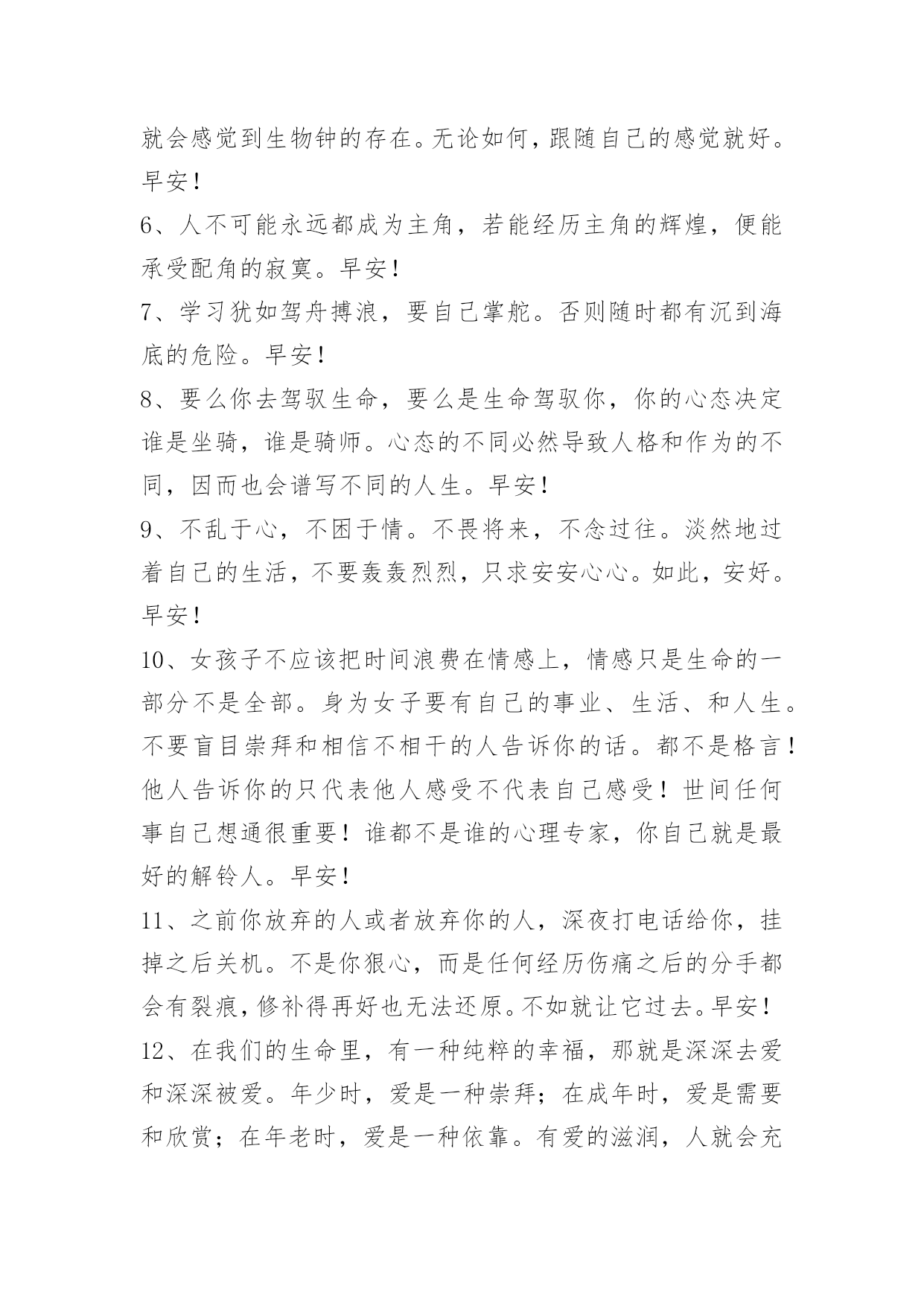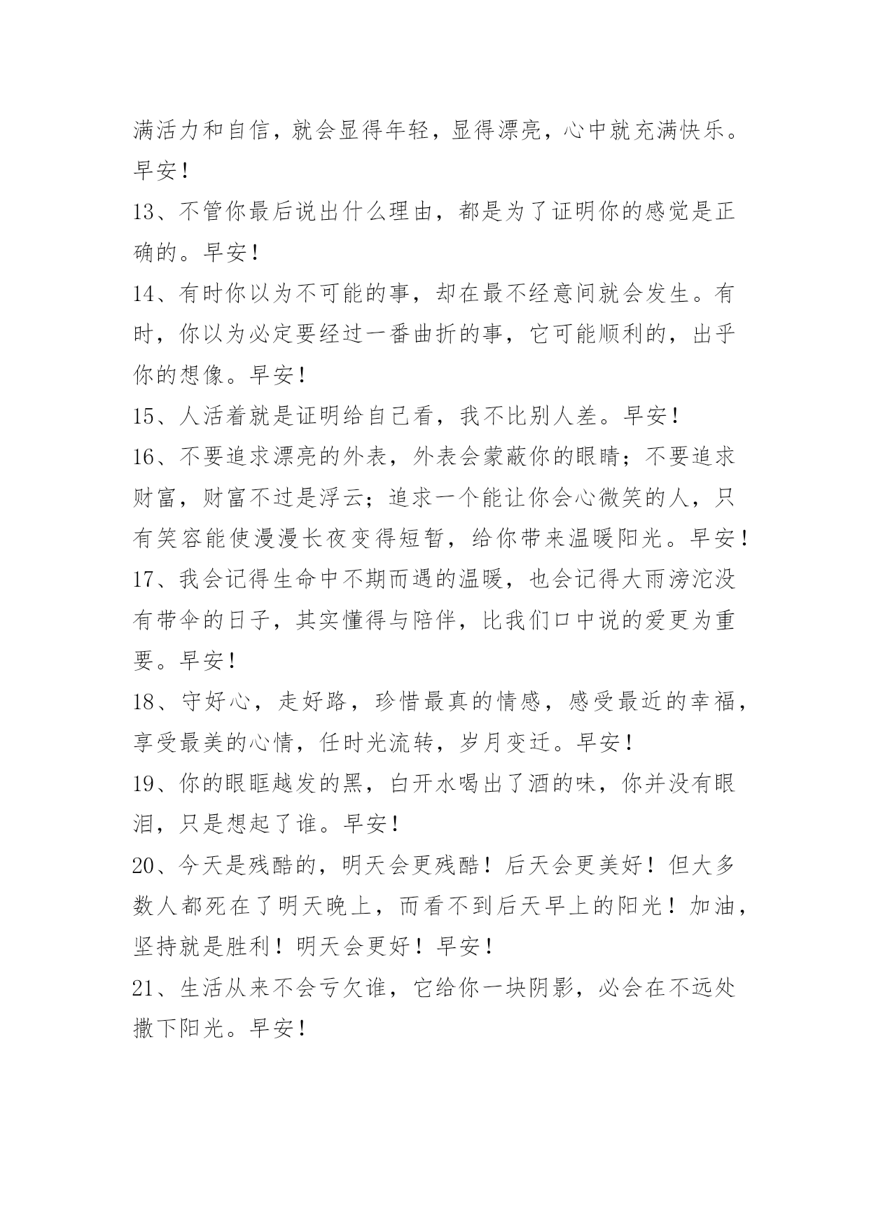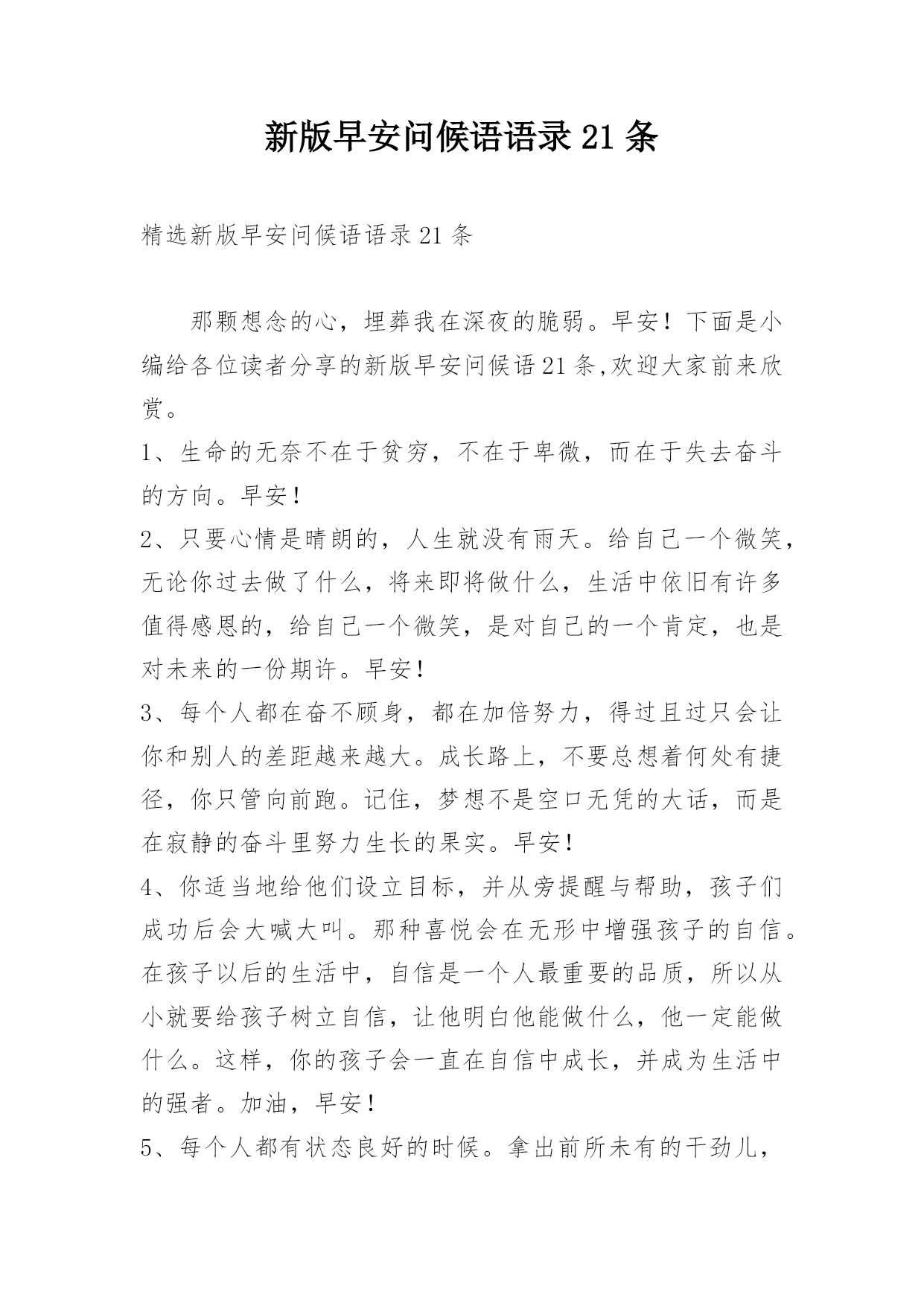 新版早安问候语语录21条 精选新版早安问候语语录21条那颗想念的心,埋葬我在深夜的脆弱。早安!下面是小编给各位读者分享的新版早安问候语21条,欢迎大家前来欣赏。1、生命的无奈不在于贫穷,不在于卑微,而在于失去奋斗的方向。早安!2、只要心情是晴朗的,人生就没有雨天。给自己一个微笑,无论你过去做了什么,将来即将做什么,生活中依旧有许多值得感恩的,给自己一个微笑,是对自己的一个肯定,也是对未来的一份期许。早安!3、每个人都在奋不顾身,都在加倍努力,得过且过只会让你和别人的差距越来越大。成长路上,不要总想着何处有捷径,你只管向前跑。记住,梦想不是空口无凭的大话,而是在寂静的奋斗里努力生长的果实。早安!4、你适当地给他们设立目标,并从旁提醒与帮助,孩子们成功后会大喊大叫。那种喜悦会在无形中增强孩子的自信。在孩子以后的生活中,自信是一个人最重要的品质,所以从小就要给孩子树立自信,让他明白他能做什么,他一定能做什么。这样,你的孩子会一直在自信中成长,并成为生活中的强者。加油,早安!5、每个人都有状态良好的时候。拿出前所未有的干劲儿,就会感觉到生物钟的存在。无论如何,跟随自己的感觉就好。早安!6、人不可能永远都成为主角,若能经历主角的辉煌,便能承受配角的寂寞。早安!7、学习犹如驾舟搏浪,要自己掌舵。否则随时都有沉到海底的危险。早安!8、要么你去驾驭生命,要么是生命驾驭你,你的心态决定谁是坐骑,谁是骑师。心态的不同必然导致人格和作为的不同,因而也会谱写不同的人生。早安!9、不乱于心,不困于情。不畏将来,不念过往。淡然地过着自己的生活,不要轰轰烈烈,只求安安心心。如此,安好。早安!10、女孩子不应该把时间浪费在情感上,情感只是生命的一部分不是全部。身为女子要有自己的事业、生活、和人生。不要盲目崇拜和相信不相干的人告诉你的话。都不是格言!他人告诉你的只代表他人感受不代表自己感受!世间任何事自己想通很重要!谁都不是谁的心理专家,你自己就是最好的解铃人。早安!11、之前你放弃的人或者放弃你的人,深夜打电话给你,挂掉之后关机。不是你狠心,而是任何经历伤痛之后的分手都会有裂痕,修补得再好也无法还原。不如就让它过去。早安!12、在我们的生命里,有一种纯粹的幸福,那就是深深去爱和深深被爱。年少时,爱是一种崇拜;在成年时,爱是需要和欣赏;在年老时,爱是一种依靠。有爱的滋润,人就会充满活力和自信,就会显得年轻,显得漂亮,心中就充满快乐。早安!13、不管你最后说出什么理由,都是为了证明你的感觉是正确的。早安!14、有时你以为不可能的事,却在最不经意间就会发生。有时,你以为必定要经过一番曲折的事,它可能顺利的,出乎你的想像。早安!15、人活着就是证明给自己看,我不比别人差。早安!16、不要追求漂亮的外表,外表会蒙蔽你的眼睛;不要追求财富,财富不过是浮云;追求一个能让你会心微笑的人,只有笑容能使漫漫长夜变得短暂,给你带来温暖阳光。早安!17、我会记得生命中不期而遇的温暖,也会记得大雨滂沱没有带伞的日子,其实懂得与陪伴,比我们口中说的爱更为重要。早安!18、守好心,走好路,珍惜最真的情感,感受最近的幸福,享受最美的心情,任时光流转,岁月变迁。早安!19、你的眼眶越发的黑,白开水喝出了酒的味,你并没有眼泪,只是想起了谁。早安!20、今天是残酷的,明天会更残酷!后天会更美好!但大多数人都死在了明天晚上,而看不到后天早上的阳光!加油,坚持就是胜利!明天会更好!早安!21、生活从来不会亏欠谁,它给你一块阴影,必会在不远处撒下阳光。早安!