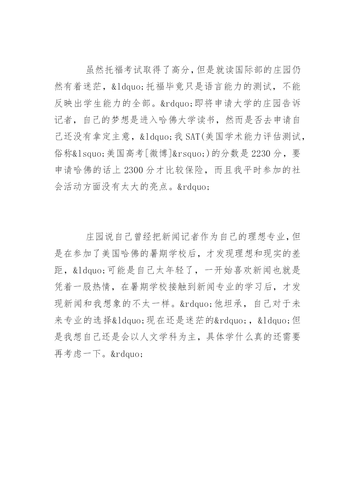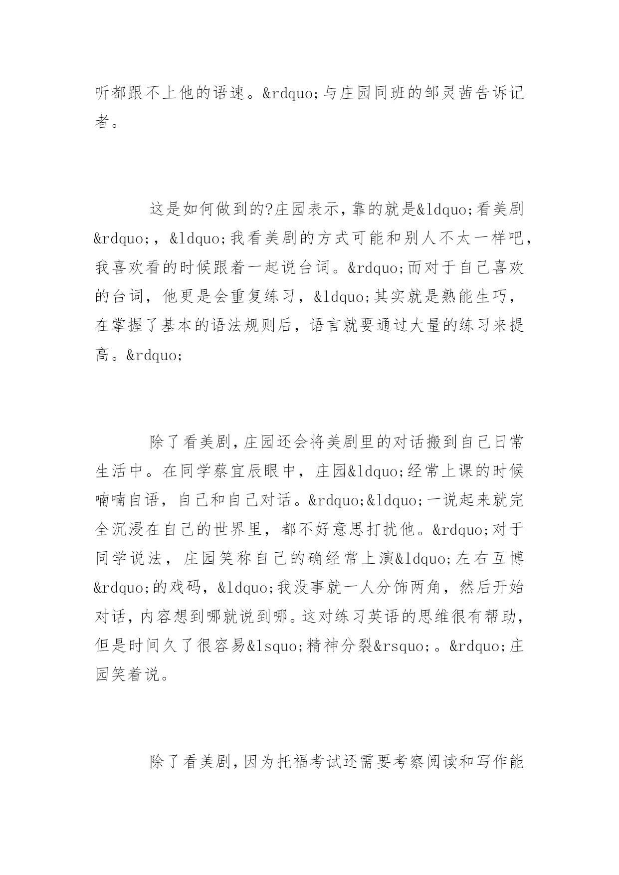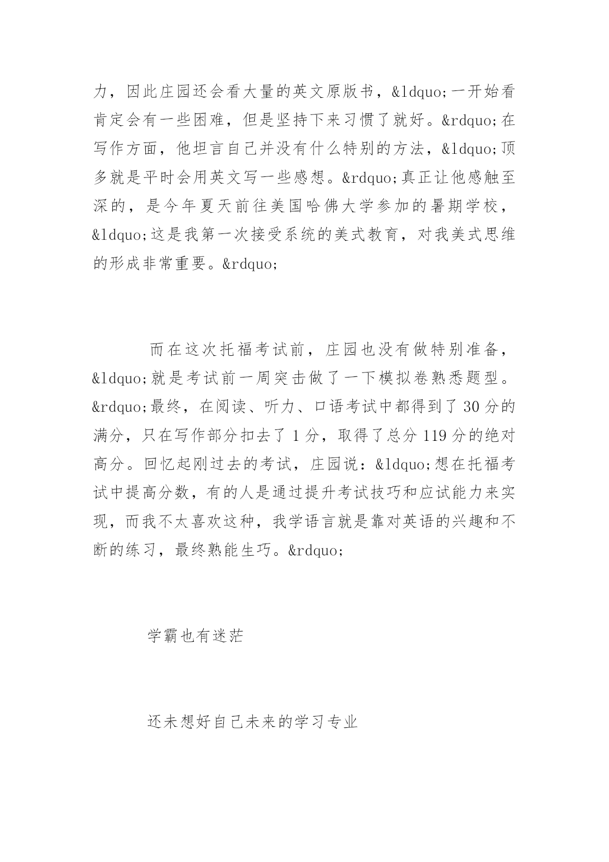 学霸总结的霸托福高分考试经验 学霸总结的霸托福高分考试经验 导语:无限相信书籍的力量,是我的教育信仰的真谛之一。下面是小编为大家整理的,英语知识,想要知更多的资讯,请多多留意CNFLA学习网! 喜欢看美剧“左右互搏” 自言自语 庄园是土生土长的中国人,不过与他交流下来,却感觉他的英文说得要比中文好,当遇到一些难以表达的词汇时,庄园坦承自己的第一反应不是中文而是英文,“英语是一门语言,所以要真正想学好它,就要让自己在说话时习惯用英语的思维。”而在庄园同学的眼里,平时并不是很善于言谈的庄园,一旦说起英语来就足以“让所有人都震惊”。“今年我们国际部的科技节上他就给一部美剧配音,语速极快,我们国际班的不少同学光是听都跟不上他的语速。”与庄园同班的邹灵茜告诉记者。 这是如何做到的?庄园表示,靠的就是“看美剧”,“我看美剧的方式可能和别人不太一样吧,我喜欢看的时候跟着一起说台词。”而对于自己喜欢的台词,他更是会重复练习,“其实就是熟能生巧,在掌握了基本的语法规则后,语言就要通过大量的练习来提高。” 除了看美剧,庄园还会将美剧里的对话搬到自己日常生活中。在同学蔡宜辰眼中,庄园“经常上课的时候喃喃自语,自己和自己对话。”“一说起来就完全沉浸在自己的世界里,都不好意思打扰他。”对于同学说法,庄园笑称自己的确经常上演“左右互博”的戏码,“我没事就一人分饰两角,然后开始对话,内容想到哪就说到哪。这对练习英语的思维很有帮助,但是时间久了很容易‘精神分裂’。”庄园笑着说。 除了看美剧,因为托福考试还需要考察阅读和写作能力,因此庄园还会看大量的英文原版书,“一开始看肯定会有一些困难,但是坚持下来习惯了就好。”在写作方面,他坦言自己并没有什么特别的方法,“顶多就是平时会用英文写一些感想。”真正让他感触至深的,是今年夏天前往美国哈佛大学参加的暑期学校,“这是我第一次接受系统的美式教育,对我美式思维的形成非常重要。” 而在这次托福考试前,庄园也没有做特别准备,“就是考试前一周突击做了一下模拟卷熟悉题型。”最终,在阅读、听力、口语考试中都得到了30分的满分,只在写作部分扣去了1分,取得了总分119分的绝对高分。回忆起刚过去的考试,庄园说:“想在托福考试中提高分数,有的人是通过提升考试技巧和应试能力来实现,而我不太喜欢这种,我学语言就是靠对英语的兴趣和不断的练习,最终熟能生巧。” 学霸也有迷茫 还未想好自己未来的学习专业 虽然托福考试取得了高分,但是就读国际部的庄园仍然有着迷茫,“托福毕竟只是语言能力的测试,不能反映出学生能力的全部。”即将申请大学的庄园告诉记者,自己的梦想是进入哈佛大学读书,然而是否去申请自己还没有拿定主意,“我SAT(美国学术能力评估测试,俗称‘美国高考[微博]’)的分数是2230分,要申请哈佛的话上2300分才比较保险,而且我平时参加的社会活动方面没有太大的亮点。” 庄园说自己曾经把新闻记者作为自己的理想专业,但是在参加了美国哈佛的暑期学校后,才发现理想和现实的差距,“可能是自己太年轻了,一开始喜欢新闻也就是凭着一股热情,在暑期学校接触到新闻专业的学习后,才发现新闻和我想象的不太一样。”他坦承,自己对于未来专业的选择“现在还是迷茫的”,“但是我想自己还是会以人文学科为主,具体学什么真的还需要再考虑一下。”