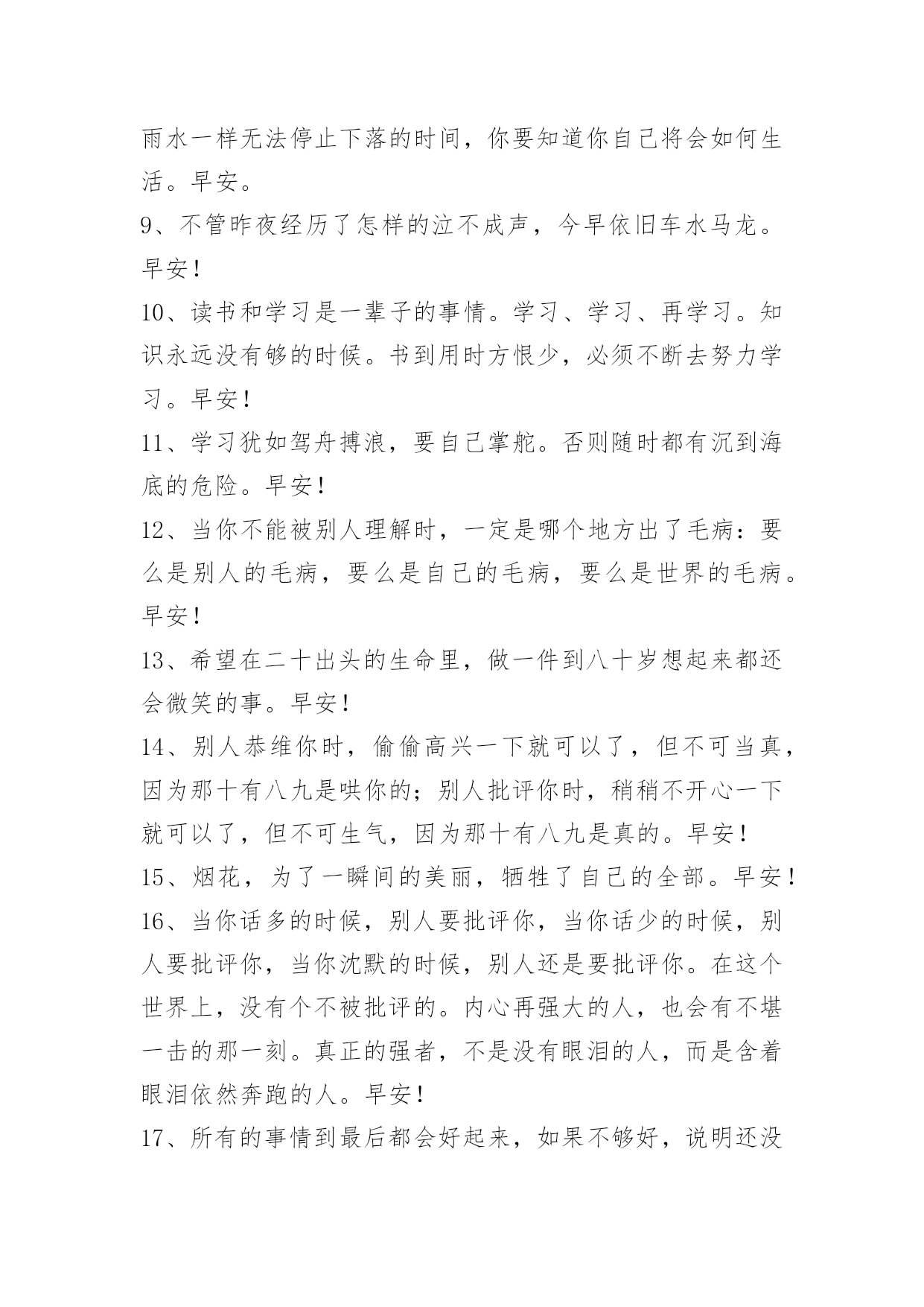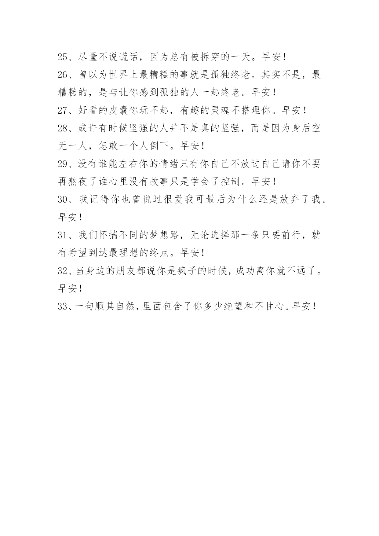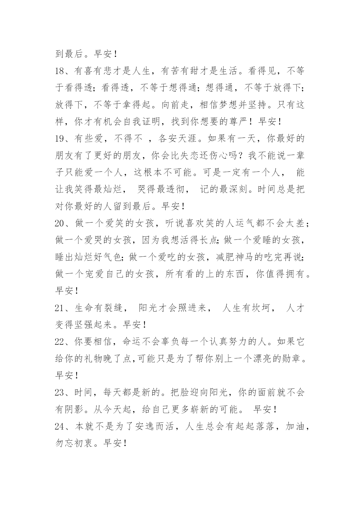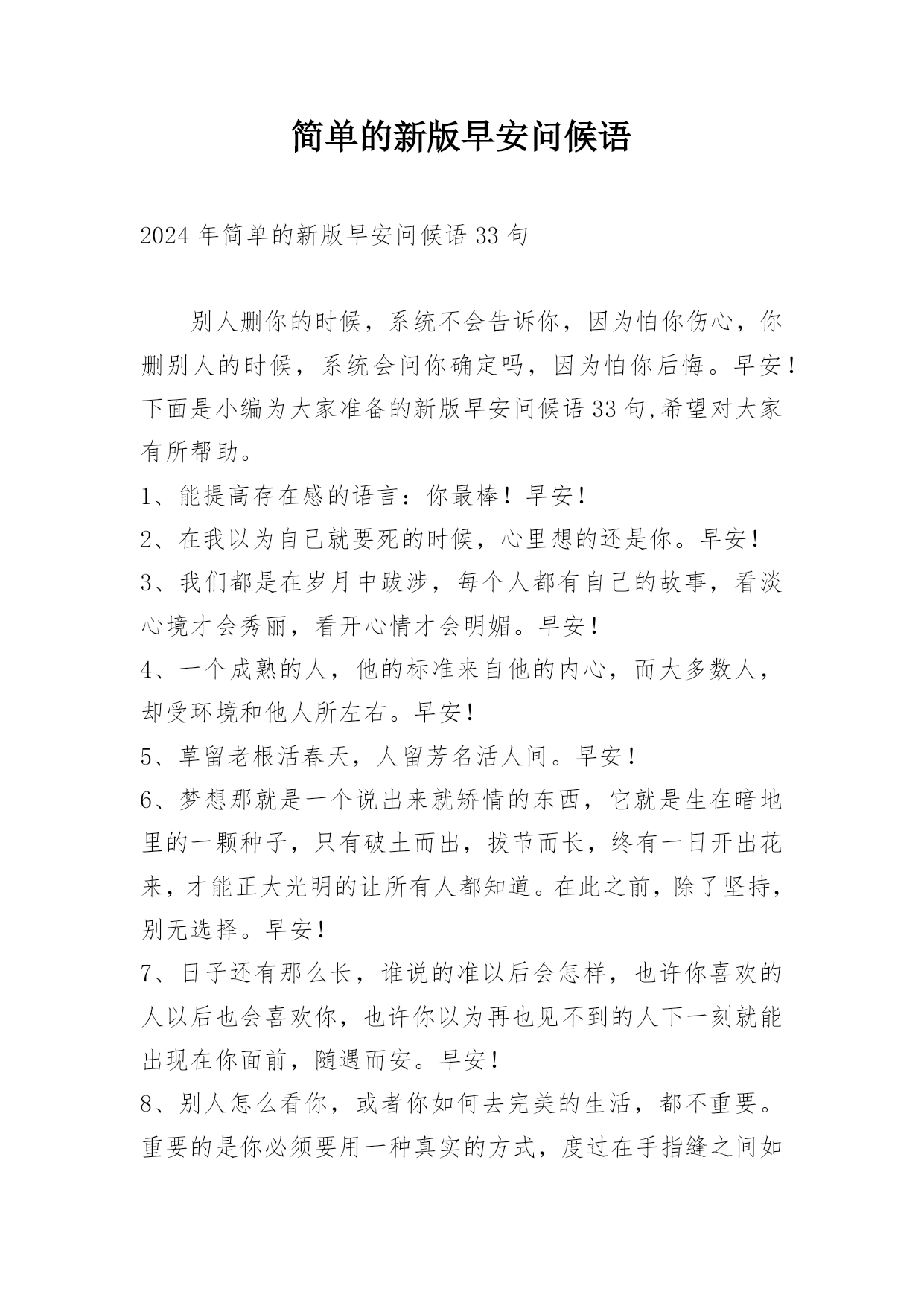 简单的新版早安问候语 2024年简单的新版早安问候语33句别人删你的时候,系统不会告诉你,因为怕你伤心,你删别人的时候,系统会问你确定吗,因为怕你后悔。早安!下面是小编为大家准备的新版早安问候语33句,希望对大家有所帮助。1、能提高存在感的语言:你最棒!早安!2、在我以为自己就要死的时候,心里想的还是你。早安!3、我们都是在岁月中跋涉,每个人都有自己的故事,看淡心境才会秀丽,看开心情才会明媚。早安!4、一个成熟的人,他的标准来自他的内心,而大多数人,却受环境和他人所左右。早安!5、草留老根活春天,人留芳名活人间。早安!6、梦想那就是一个说出来就矫情的东西,它就是生在暗地里的一颗种子,只有破土而出,拔节而长,终有一日开出花来,才能正大光明的让所有人都知道。在此之前,除了坚持,别无选择。早安!7、日子还有那么长,谁说的准以后会怎样,也许你喜欢的人以后也会喜欢你,也许你以为再也见不到的人下一刻就能出现在你面前,随遇而安。早安!8、别人怎么看你,或者你如何去完美的生活,都不重要。重要的是你必须要用一种真实的方式,度过在手指缝之间如雨水一样无法停止下落的时间,你要知道你自己将会如何生活。早安。9、不管昨夜经历了怎样的泣不成声,今早依旧车水马龙。早安!10、读书和学习是一辈子的事情。学习、学习、再学习。知识永远没有够的时候。书到用时方恨少,必须不断去努力学习。早安!11、学习犹如驾舟搏浪,要自己掌舵。否则随时都有沉到海底的危险。早安!12、当你不能被别人理解时,一定是哪个地方出了毛病:要么是别人的毛病,要么是自己的毛病,要么是世界的毛病。早安!13、希望在二十出头的生命里,做一件到八十岁想起来都还会微笑的事。早安!14、别人恭维你时,偷偷高兴一下就可以了,但不可当真,因为那十有八九是哄你的;别人批评你时,稍稍不开心一下就可以了,但不可生气,因为那十有八九是真的。早安!15、烟花,为了一瞬间的美丽,牺牲了自己的全部。早安!16、当你话多的时候,别人要批评你,当你话少的时候,别人要批评你,当你沈默的时候,别人还是要批评你。在这个世界上,没有个不被批评的。内心再强大的人,也会有不堪一击的那一刻。真正的强者,不是没有眼泪的人,而是含着眼泪依然奔跑的人。早安!17、所有的事情到最后都会好起来,如果不够好,说明还没到最后。早安!18、有喜有悲才是人生,有苦有甜才是生活。看得见,不等于看得透;看得透,不等于想得通;想得通,不等于放得下;放得下,不等于拿得起。向前走,相信梦想并坚持。只有这样,你才有机会自我证明,找到你想要的尊严!早安!19、有些爱,不得不,各安天涯。如果有一天,你最好的朋友有了更好的朋友,你会比失恋还伤心吗?我不能说一辈子只能爱一个人,这根本不可能。可是一定有一个人,能让我笑得最灿烂,哭得最透彻,记的最深刻。时间总是把对你最好的人留到最后。早安!20、做一个爱笑的女孩,听说喜欢笑的人运气都不会太差;做一个爱哭的女孩,因为我想活得长点;做一个爱睡的女孩,睡出灿烂好气色;做一个爱吃的女孩,减肥神马的吃完再说;做一个宠爱自己的女孩,所有看的上的东西,你值得拥有。早安!21、生命有裂缝,阳光才会照进来,人生有坎坷,人才变得坚强起来。早安!22、你要相信,命运不会辜负每一个认真努力的人。如果它给你的礼物晚了点,可能只是为了帮你别上一个漂亮的勋章。早安!23、时间,每天都是新的。把脸迎向阳光,你的面前就不会有阴影。从今天起,给自己更多崭新的可能。早安!24、本就不是为了安逸而活,人生总会有起起落落,加油,勿忘初衷。早安!25、尽量不说谎话,因为总有被拆穿的一天。早安!26、曾以为世界上最糟糕的事就是孤独终老。其实不是,最糟糕的,是与让你感到孤独的人一起终老。早安!27、好看的皮囊你玩不起,有趣的灵魂不搭理你。早安!28、或许有时候坚强的人并不是真的坚强,而是因为身后空无一人,怎敢一个人倒下。早安!29、没有谁能左右你的情绪只有你自己不放过自己请你不要再熬夜了谁心里没有故事只是学会了控制。早安!30、我记得你也曾说过很爱我可最后为什么还是放弃了我。早安!31、我们怀揣不同的梦想路,无论选择那一条只要前行,就有希望到达最理想的终点。早安!32、当身边的朋友都说你是疯子的时候,成功离你就不远了。早安!33、一句顺其自然,里面包含了你多少绝望和不甘心。早安!