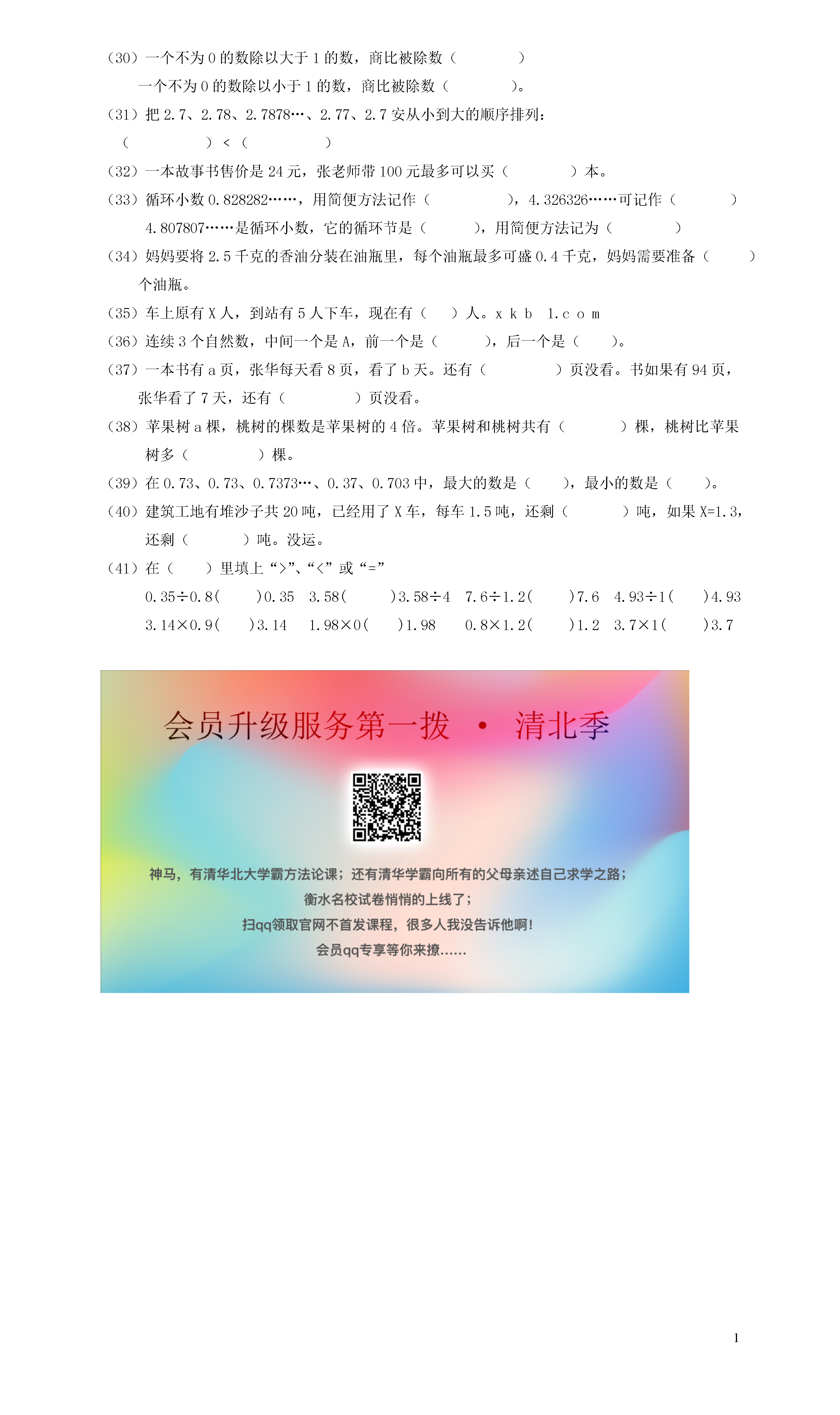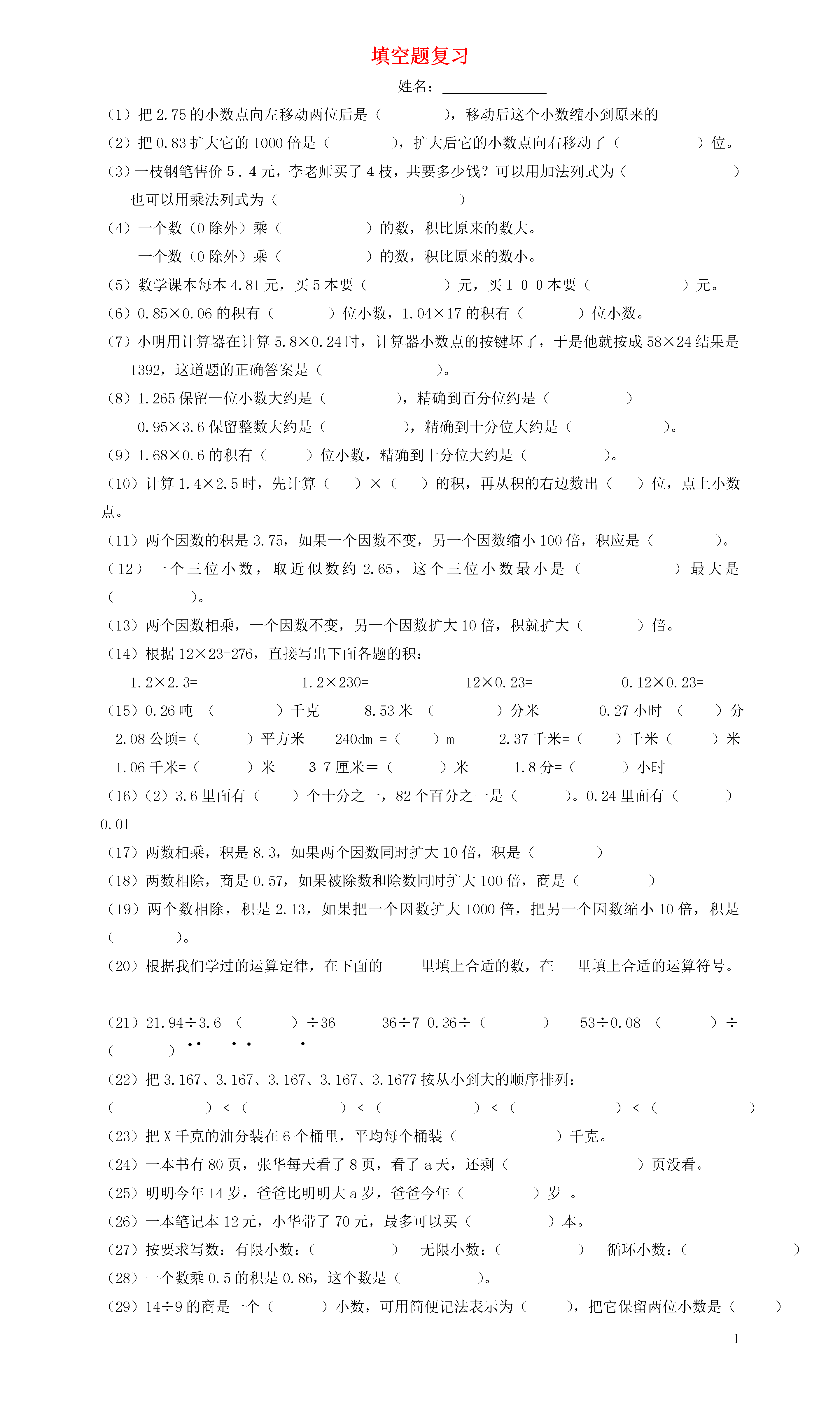 1填空题复习姓名:(1)把2.75的小数点向左移动两位后是(),移动后这个小数缩小到原来的(2)把0.83扩大它的1000倍是(),扩大后它的小数点向右移动了()位。(3)一枝钢笔售价5.4元,李老师买了4枝,共要多少钱?可以用加法列式为()也可以用乘法列式为()(4)一个数(0除外)乘()的数,积比原来的数大。一个数(0除外)乘()的数,积比原来的数小。(5)数学课本每本4.81元,买5本要()元,买100本要()元。(6)0.85×0.06的积有()位小数,1.04×17的积有()位小数。(7)小明用计算器在计算5.8×0.24时,计算器小数点的按键坏了,于是他就按成58×24结果是1392,这道题的正确答案是()。(8)1.265保留一位小数大约是(),精确到百分位约是()0.95×3.6保留整数大约是(),精确到十分位大约是()。(9)1.68×0.6的积有()位小数,精确到十分位大约是()。(10)计算1.4×2.5时,先计算()×()的积,再从积的右边数出()位,点上小数点。(11)两个因数的积是3.75,如果一个因数不变,另一个因数缩小100倍,积应是()。(12)一个三位小数,取近似数约2.65,这个三位小数最小是()最大是()。(13)两个因数相乘,一个因数不变,另一个因数扩大10倍,积就扩大()倍。(14)根据12×23=276,直接写出下面各题的积:1.2×2.3=1.2×230=12×0.23=0.12×0.23=(15)0.26吨=()千克8.53米=()分米0.27小时=()分2.08公顷=()平方米240dm=()m2.37千米=()千米()米1.06千米=()米37厘米=()米1.8分=()小时(16)(2)3.6里面有()个十分之一,82个百分之一是()。0.24里面有()0.01(17)两数相乘,积是8.3,如果两个因数同时扩大10倍,积是()(18)两数相除,商是0.57,如果被除数和除数同时扩大100倍,商是()(19)两个数相除,积是2.13,如果把一个因数扩大1000倍,把另一个因数缩小10倍,积是()。(20)根据我们学过的运算定律,在下面的里填上合适的数,在里填上合适的运算符号。.....(21)21.94÷3.6=()÷3636÷7=0.36÷()53÷0.08=()÷()(22)把3.167、3.167、3.167、3.167、3.1677按从小到大的顺序排列:()﹤()﹤()﹤()﹤()(23)把X千克的油分装在6个桶里,平均每个桶装()千克。(24)一本书有80页,张华每天看了8页,看了a天,还剩()页没看。(25)明明今年14岁,爸爸比明明大a岁,爸爸今年()岁。(26)一本笔记本12元,小华带了70元,最多可以买()本。(27)按要求写数:有限小数:()无限小数:()循环小数:()(28)一个数乘0.5的积是0.86,这个数是()。(29)14÷9的商是一个()小数,可用简便记法表示为(),把它保留两位小数是()(30)一个不为0的数除以大于1的数,商比被除数()一个不为0的数除以小于1的数,商比被除数()。(31)把2.7、2.78、2.7878…、2.77、2.7安从小到大的顺序排列:()﹤()(32)一本故事书售价是24元,张老师带100元最多可以买()本。(33)循环小数0.828282……,用简便方法记作(),4.326326……可记作()4.807807……是循环小数,它的循环节是(),用简便方法记为()(34)妈妈要将2.5千克的香油分装在油瓶里,每个油瓶最多可盛0.4千克,妈妈需要准备()个油瓶。(35)车上原有X人,到站有5人下车,现在有()人。xkb1.com(36)连续3个自然数,中间一个是A,前一个是(),后一个是()。(37)一本书有a页,张华每天看8页,看了b天。还有()页没看。书如果有94页,张华看了7天,还有()页没看。(38)苹果树a棵,桃树的棵数是苹果树的4倍。苹果树和桃树共有()棵,桃树比苹果树多()棵。(39)在0.73、0.73、0.7373…、0.37、0.703中,最大的数是(),最小的数是()。(40)建筑工地有堆沙子共20吨,已经用了X车,每车1.5吨,还剩()吨,如果X=1.3,还剩()吨。没运。(41)在()里填上“>”、“<”或“=”0.35÷0.8()0.353.58()3.58÷47.6÷1.2()7.64.93÷1()4.933.14×0.9()3.141.98×0()1.980.8×1.2()1.23.7×1()3.7