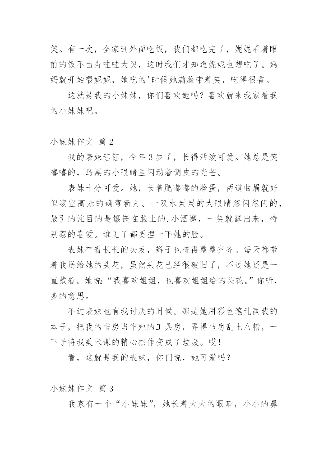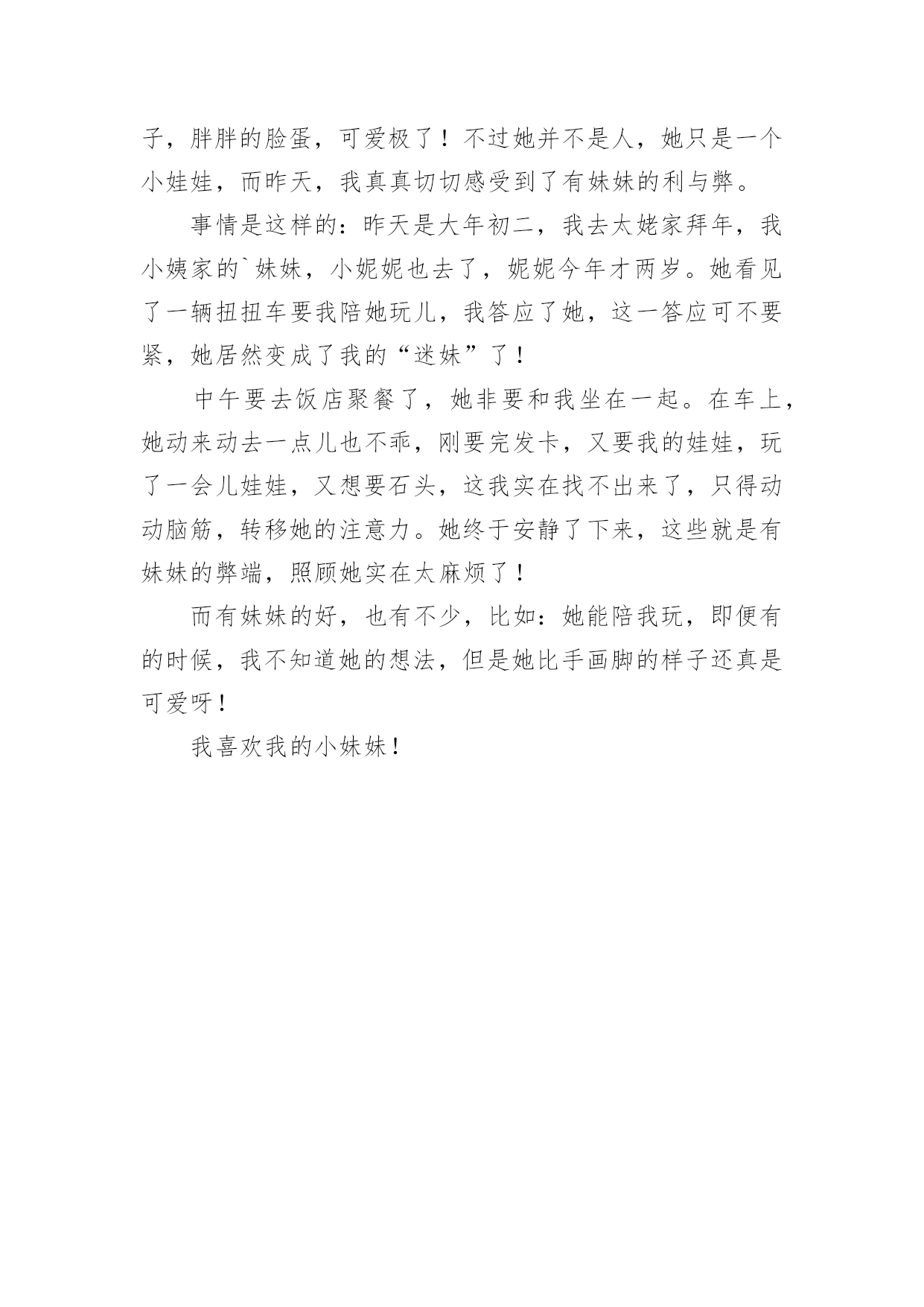 小妹妹作文 实用的小妹妹作文3篇【实用】在平日的学习、工作和生活里,大家总少不了接触作文吧,作文根据体裁的不同可以分为记叙文、说明文、应用文、议论文。那要怎么写好作文呢?以下是小编帮大家整理的小妹妹作文3篇,欢迎阅读,希望大家能够喜欢。小妹妹作文篇1我有一个小妹妹,她叫沈宜冉,我们大家都叫她“妮妮”。她现在七个月零二十二天。她有些胖,但是很可爱。妮妮指甲有些长,要是你的脸在她手前面,过一会儿,她就会猛一下往你脸上抓去,这时,你会感觉非常疼,要是抓得非常狠的时候,就得过七、八天才能完全恢复。妮妮四个月的时候已经会翻身了,在床上翻来翻去,有时候会翻到床边,眼看就要摔地上了,这时,大人就赶紧把她放回床中心。她六个月的时候就会坐了,大约能坐三分钟,现在差不多能坐二十分钟。妮妮现在能爬了,她只能趴在地上不动,她还没有完全学会爬。她现在能站两秒,要是你让她站在地上,松手,她的腿就会硬硬的站在那儿,不会往前迈步。你得把手放在她的附近不能远离,要是她歪倒了,你就能马上把她扶住。我们只要做一些有趣的样子,妮妮看了就会放声哈哈大笑。有一次,全家到外面吃饭,我们都吃完了,妮妮看着眼前的饭不由得哇哇大哭,这时我们才知道妮妮也想吃了。妈妈就开始喂妮妮,她吃的'时候她满脸带着笑,吃得很香。这就是我的小妹妹,你们喜欢她吗?喜欢就来我家看我的小妹妹吧。小妹妹作文篇2我的表妹钰钰,今年3岁了,长得活泼可爱。她总是笑嘻嘻的,乌黑的小眼睛里闪动着调皮的光芒。表妹十分可爱。她,长着肥嘟嘟的脸蛋,两道曲眉就好似凌空高悬的确弯新月。一双水灵灵的大眼睛忽闪忽闪的,最引的注目的是镶嵌在脸上的.小酒窝,一笑就露出来,特别惹的喜爱。谁见了都要捏一下她的脸。表妹有着长长的头发,辫子也梳得整整齐齐。每天都带着我送给她的头花,虽然头花已经很破旧了,不过她还是一直戴着。她说:“我喜欢姐姐,也喜欢姐姐给的头花。”你听,多的意思。不过表妹也有我讨厌的时候。那是她用彩色笔乱画我的本子,把我的书房当作她的工具房,弄得书房乱七八糟,一下子将我美术课的精心杰作变成了垃圾。哎!看,这就是我的表妹,你们说,她可爱吗?小妹妹作文篇3我家有一个“小妹妹”,她长着大大的眼睛,小小的鼻子,胖胖的脸蛋,可爱极了!不过她并不是人,她只是一个小娃娃,而昨天,我真真切切感受到了有妹妹的利与弊。事情是这样的:昨天是大年初二,我去太姥家拜年,我小姨家的`妹妹,小妮妮也去了,妮妮今年才两岁。她看见了一辆扭扭车要我陪她玩儿,我答应了她,这一答应可不要紧,她居然变成了我的“迷妹”了!中午要去饭店聚餐了,她非要和我坐在一起。在车上,她动来动去一点儿也不乖,刚要完发卡,又要我的娃娃,玩了一会儿娃娃,又想要石头,这我实在找不出来了,只得动动脑筋,转移她的注意力。她终于安静了下来,这些就是有妹妹的弊端,照顾她实在太麻烦了!而有妹妹的好,也有不少,比如:她能陪我玩,即便有的时候,我不知道她的想法,但是她比手画脚的样子还真是可爱呀!我喜欢我的小妹妹!