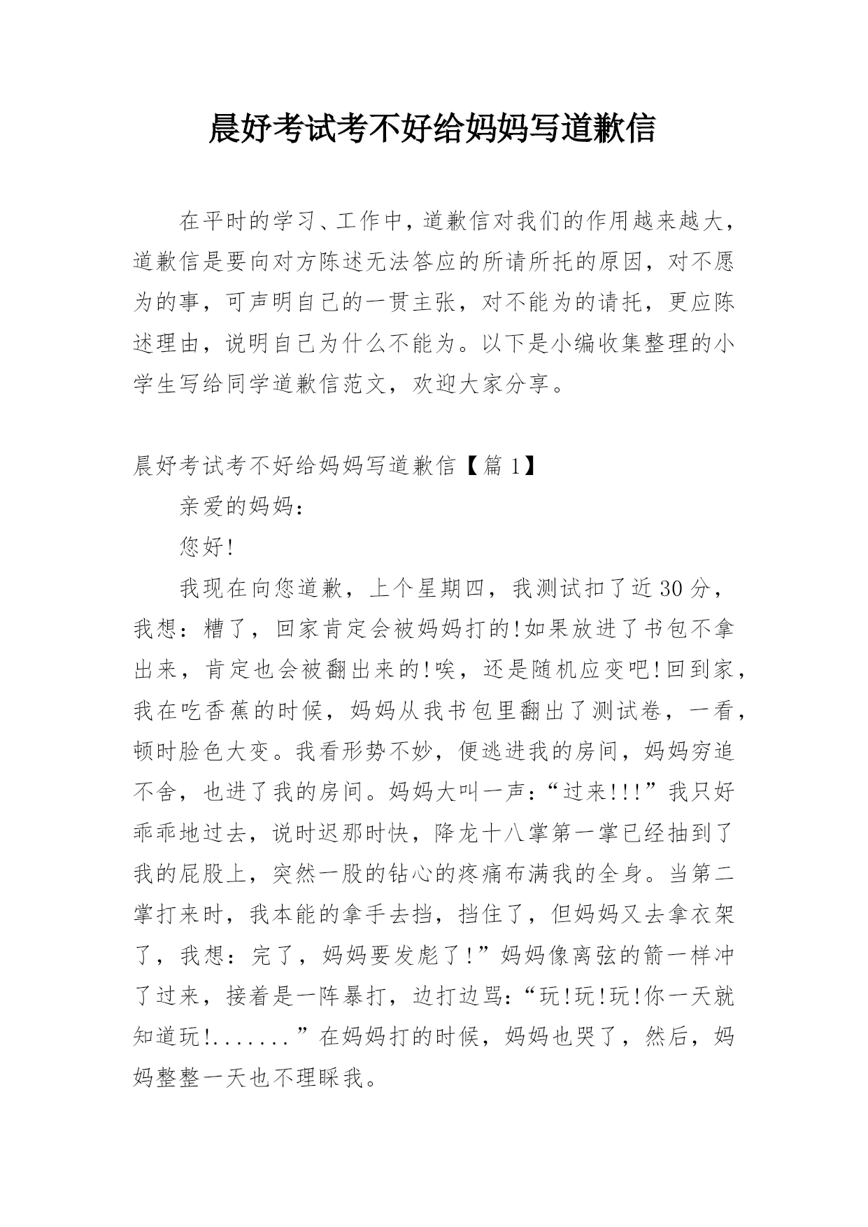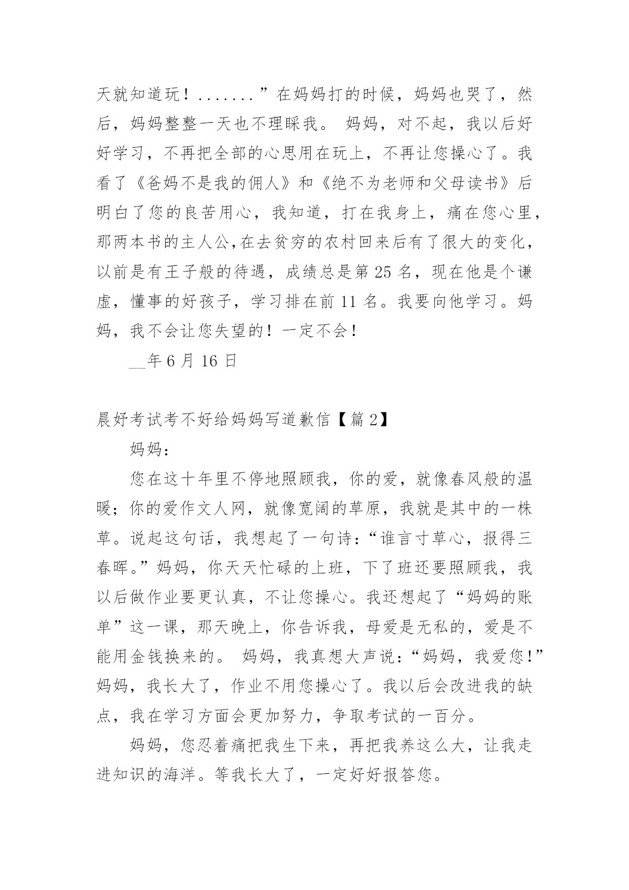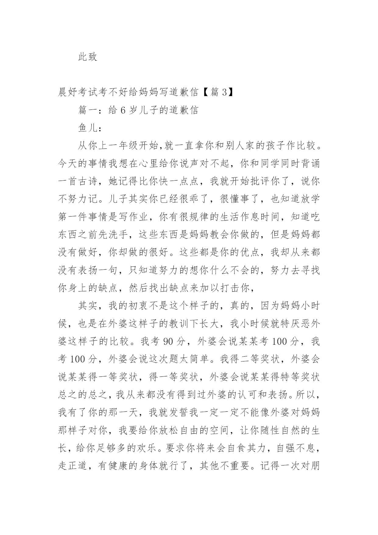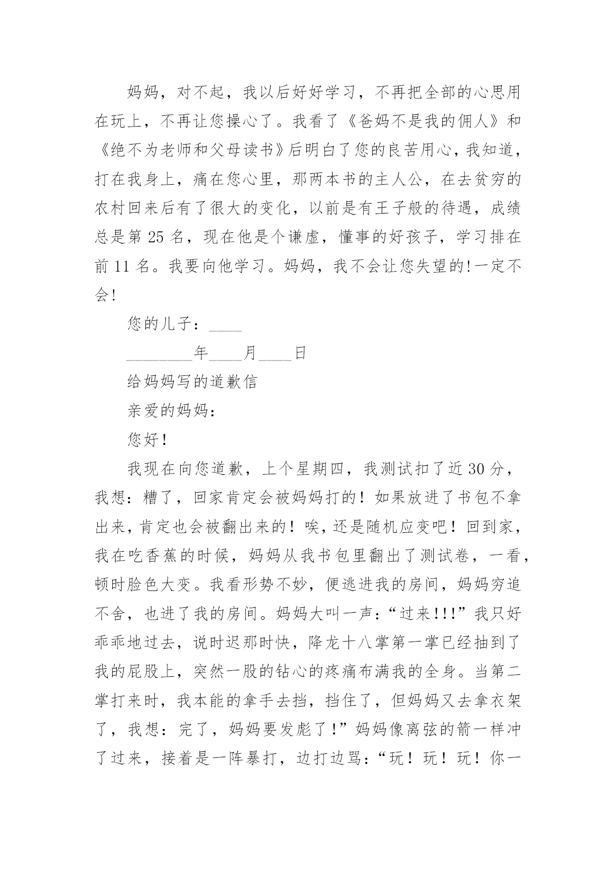 晨妤考试考不好给妈妈写道歉信 在平时的学习、工作中,道歉信对我们的作用越来越大,道歉信是要向对方陈述无法答应的所请所托的原因,对不愿为的事,可声明自己的一贯主张,对不能为的请托,更应陈述理由,说明自己为什么不能为。以下是小编收集整理的小学生写给同学道歉信范文,欢迎大家分享。晨妤考试考不好给妈妈写道歉信【篇1】亲爱的妈妈:您好!我现在向您道歉,上个星期四,我测试扣了近30分,我想:糟了,回家肯定会被妈妈打的!如果放进了书包不拿出来,肯定也会被翻出来的!唉,还是随机应变吧!回到家,我在吃香蕉的时候,妈妈从我书包里翻出了测试卷,一看,顿时脸色大变。我看形势不妙,便逃进我的房间,妈妈穷追不舍,也进了我的房间。妈妈大叫一声:“过来!!!”我只好乖乖地过去,说时迟那时快,降龙十八掌第一掌已经抽到了我的屁股上,突然一股的钻心的疼痛布满我的全身。当第二掌打来时,我本能的拿手去挡,挡住了,但妈妈又去拿衣架了,我想:完了,妈妈要发彪了!”妈妈像离弦的箭一样冲了过来,接着是一阵暴打,边打边骂:“玩!玩!玩!你一天就知道玩!.......”在妈妈打的时候,妈妈也哭了,然后,妈妈整整一天也不理睬我。妈妈,对不起,我以后好好学习,不再把全部的心思用在玩上,不再让您操心了。我看了《爸妈不是我的佣人》和《绝不为老师和父母读书》后明白了您的良苦用心,我知道,打在我身上,痛在您心里,那两本书的主人公,在去贫穷的农村回来后有了很大的变化,以前是有王子般的待遇,成绩总是第25名,现在他是个谦虚,懂事的好孩子,学习排在前11名。我要向他学习。妈妈,我不会让您失望的!一定不会!您的儿子:____________年____月____日给妈妈写的道歉信亲爱的妈妈:您好!我现在向您道歉,上个星期四,我测试扣了近30分,我想:糟了,回家肯定会被妈妈打的!如果放进了书包不拿出来,肯定也会被翻出来的!唉,还是随机应变吧!回到家,我在吃香蕉的时候,妈妈从我书包里翻出了测试卷,一看,顿时脸色大变。我看形势不妙,便逃进我的房间,妈妈穷追不舍,也进了我的房间。妈妈大叫一声:“过来!!!”我只好乖乖地过去,说时迟那时快,降龙十八掌第一掌已经抽到了我的屁股上,突然一股的钻心的疼痛布满我的全身。当第二掌打来时,我本能的拿手去挡,挡住了,但妈妈又去拿衣架了,我想:完了,妈妈要发彪了!”妈妈像离弦的箭一样冲了过来,接着是一阵暴打,边打边骂:“玩!玩!玩!你一天就知道玩!.......”在妈妈打的时候,妈妈也哭了,然后,妈妈整整一天也不理睬我。妈妈,对不起,我以后好好学习,不再把全部的心思用在玩上,不再让您操心了。我看了《爸妈不是我的佣人》和《绝不为老师和父母读书》后明白了您的良苦用心,我知道,打在我身上,痛在您心里,那两本书的主人公,在去贫穷的农村回来后有了很大的变化,以前是有王子般的待遇,成绩总是第25名,现在他是个谦虚,懂事的好孩子,学习排在前11名。我要向他学习。妈妈,我不会让您失望的!一定不会!__年6月16日晨妤考试考不好给妈妈写道歉信【篇2】妈妈:您在这十年里不停地照顾我,你的爱,就像春风般的温暖;你的爱作文人网,就像宽阔的草原,我就是其中的一株草。说起这句话,我想起了一句诗:“谁言寸草心,报得三春晖。”妈妈,你天天忙碌的上班,下了班还要照顾我,我以后做作业要更认真,不让您操心。我还想起了“妈妈的账单”这一课,那天晚上,你告诉我,母爱是无私的,爱是不能用金钱换来的。妈妈,我真想大声说:“妈妈,我爱您!”妈妈,我长大了,作业不用您操心了。我以后会改进我的缺点,我在学习方面会更加努力,争取考试的一百分。妈妈,您忍着痛把我生下来,再把我养这么大,让我走进知识的海洋。等我长大了,一定好好报答您。此致晨妤考试考不好给妈妈写道歉信【篇3】篇一:给6岁儿子的道歉信鱼儿:从你上一年级开始,就一直拿你和别人家的孩子作比较。今天的事情我想在心里给你说声对不起,你和同学同时背诵一首古诗,她记得比你快一点点,我就开始批评你了,说你不努力记。儿子其实你已经很乖了,很懂事了,也知道放学第一件事情是写作业,你有很规律的生活作息时间,知道吃东西之前先洗手,这些东西是妈妈教会你做的,但是妈妈都没有做好,你却做的很好。这些都是你的优点,我却从来都没有表扬一句,只知道努力的想你什么不会的,努力去寻找你身上的缺点,然后找出缺点来加以打击你,其实,我的初衷不是这个样子的,真的,因为妈妈小时候,也是在外婆这样子的教训下长大,我小时候就特厌恶外婆这样子的比较。我考90分,外婆会说某某考100分,我考100分,外婆会说这次题太简单。我得二等奖状,外婆会说某某得一等奖状,得一等奖状,外婆会说某某得特等奖状总之的总之,我从来都没有得到过外婆的认可和表扬。所以,我有了你的那一天,我就发誓我一定一定不能像外婆对妈妈那样子对你,我要给你放松自