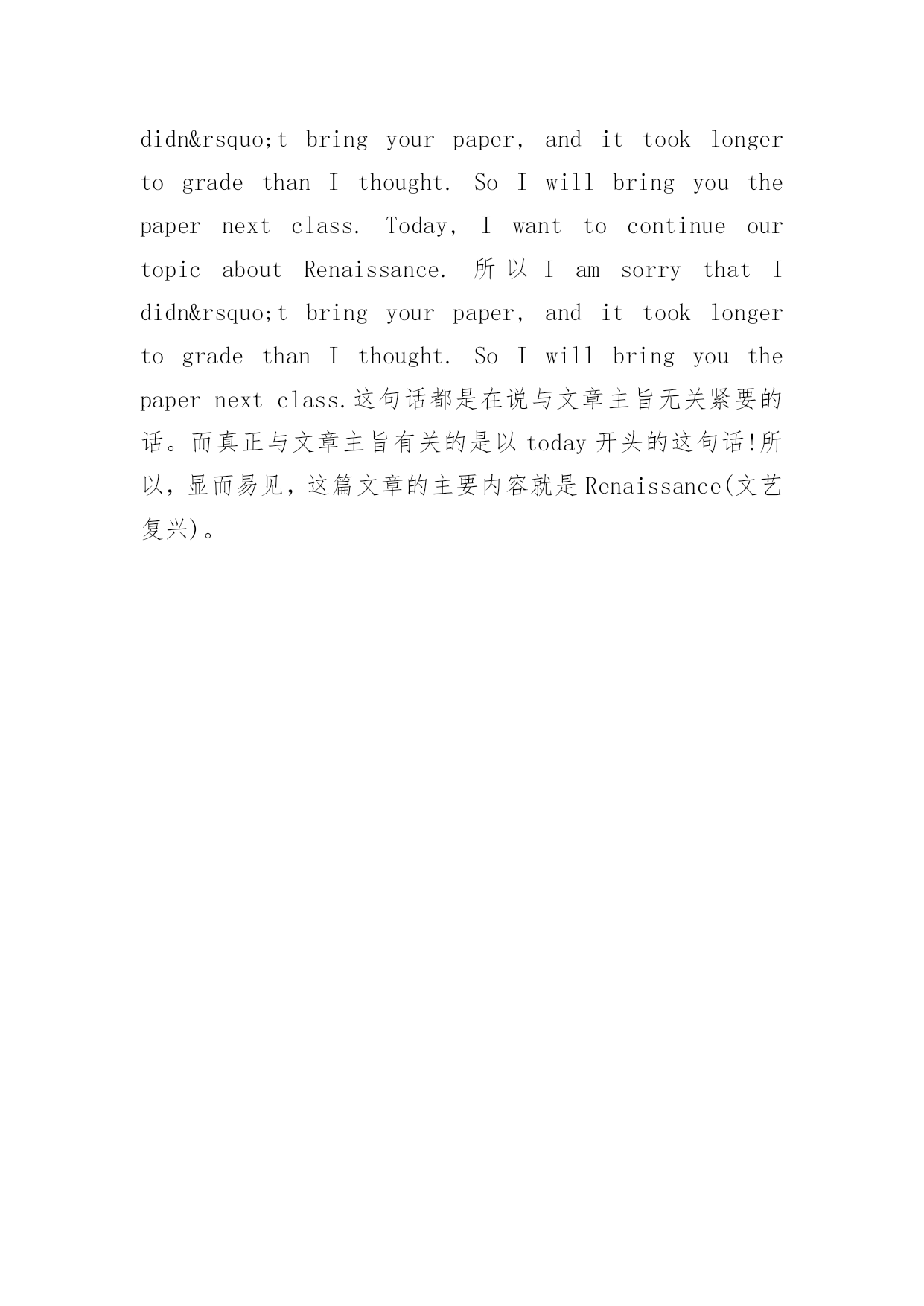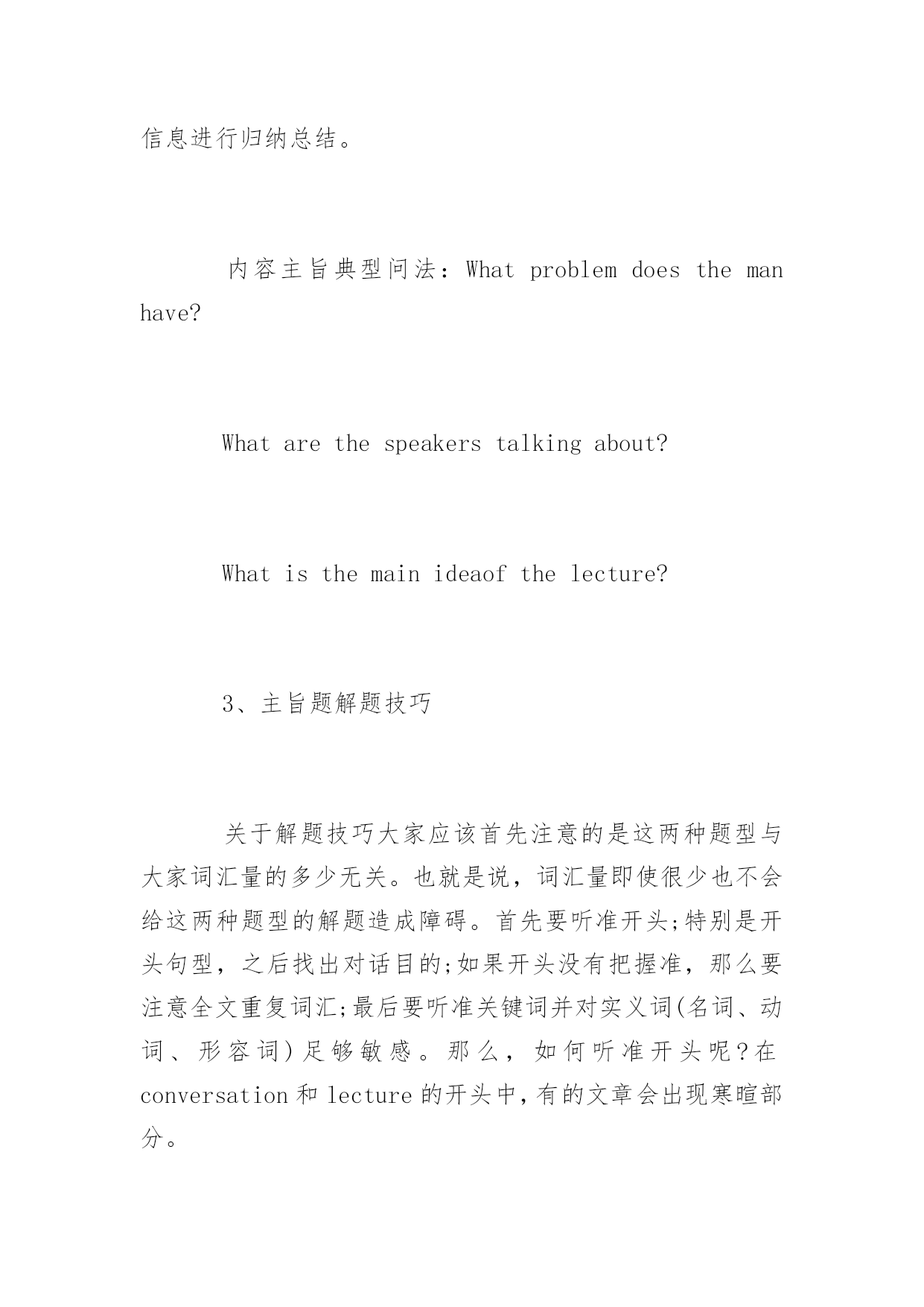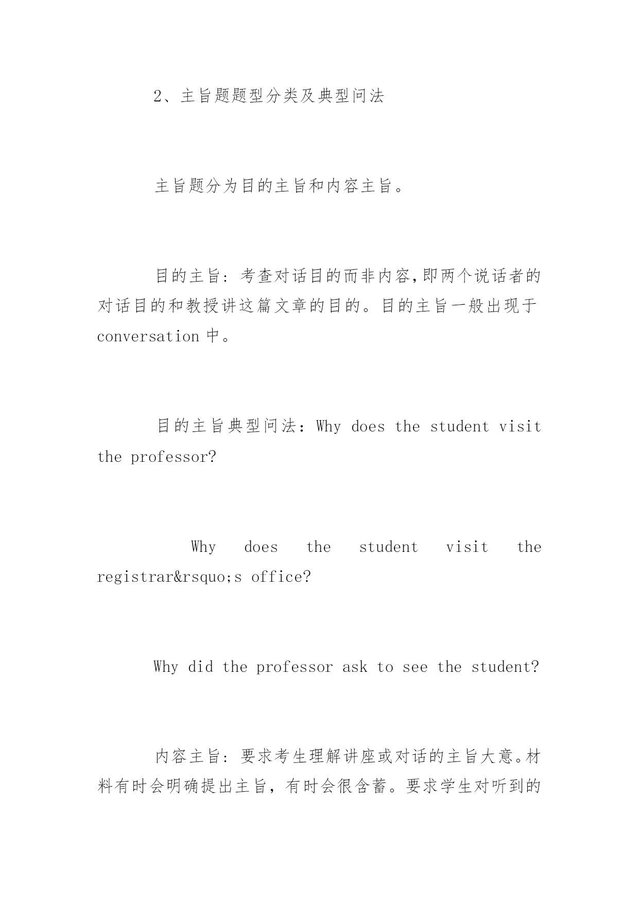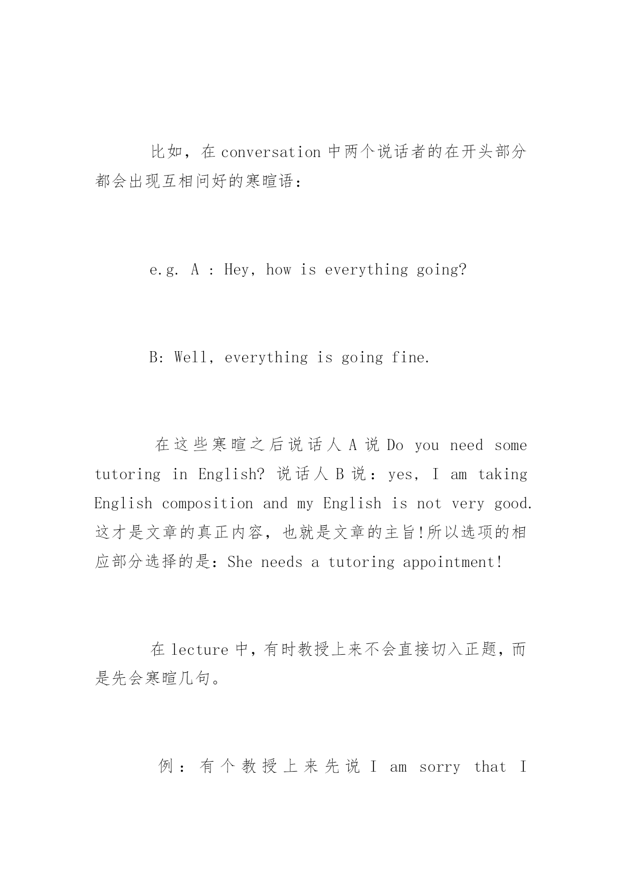 托福听力主旨题的答题技巧 托福听力主旨题的答题技巧 根据历年题目来看,托福听力考试中出现主旨题的机率非常大,下面是小编整理的关于托福听力主旨题的答题技巧,希望对大家有用,更多消息请关注应届毕业生网。 1、主旨题在原文和题目中的位置 首先,大家要明确托福听力考试的一大特色就是题目顺序与文章的行文顺序相一致。所以,同学们要明确的是主旨题出现在文章的.开头部分,绝对不会出现在文章的中间部分。其中需要注意的一点是,在结尾部分同样可能会出现帮助解答主旨题的解题内容。因为老师很可能对文章内容进行概括和总结。那么,结尾部分就可能出现主旨题的答案!但是,这种情况比较少见!所以按照文章的行文顺序,主旨题题目一般只会出现于第一道题。所以通常,不管是conversation还是lecture,主旨题都会出现于首道题目。明确了题目的位置之后,我们来看一下主旨题的分类。 2、主旨题题型分类及典型问法 主旨题分为目的主旨和内容主旨。 目的主旨:考查对话目的而非内容,即两个说话者的对话目的和教授讲这篇文章的目的。目的主旨一般出现于conversation中。 目的主旨典型问法:Whydoesthestudentvisittheprofessor? Whydoesthestudentvisittheregistrar’soffice? Whydidtheprofessorasktoseethestudent? 内容主旨:要求考生理解讲座或对话的主旨大意。材料有时会明确提出主旨,有时会很含蓄。要求学生对听到的信息进行归纳总结。 内容主旨典型问法:Whatproblemdoesthemanhave? Whatarethespeakerstalkingabout? Whatisthemainideaofthelecture? 3、主旨题解题技巧 关于解题技巧大家应该首先注意的是这两种题型与大家词汇量的多少无关。也就是说,词汇量即使很少也不会给这两种题型的解题造成障碍。首先要听准开头;特别是开头句型,之后找出对话目的;如果开头没有把握准,那么要注意全文重复词汇;最后要听准关键词并对实义词(名词、动词、形容词)足够敏感。那么,如何听准开头呢?在conversation和lecture的开头中,有的文章会出现寒暄部分。 比如,在conversation中两个说话者的在开头部分都会出现互相问好的寒暄语: e.g.A:Hey,howiseverythinggoing? B:Well,everythingisgoingfine. 在这些寒暄之后说话人A说DoyouneedsometutoringinEnglish?说话人B说:yes,IamtakingEnglishcompositionandmyEnglishisnotverygood.这才是文章的真正内容,也就是文章的主旨!所以选项的相应部分选择的是:Sheneedsatutoringappointment! 在lecture中,有时教授上来不会直接切入正题,而是先会寒暄几句。 例:有个教授上来先说IamsorrythatIdidn’tbringyourpaper,andittooklongertogradethanIthought.SoIwillbringyouthepapernextclass.Today,IwanttocontinueourtopicaboutRenaissance.所以IamsorrythatIdidn’tbringyourpaper,andittooklongertogradethanIthought.SoIwillbringyouthepapernextclass.这句话都是在说与文章主旨无关紧要的话。而真正与文章主旨有关的是以today开头的这句话!所以,显而易见,这篇文章的主要内容就是Renaissance(文艺复兴)。