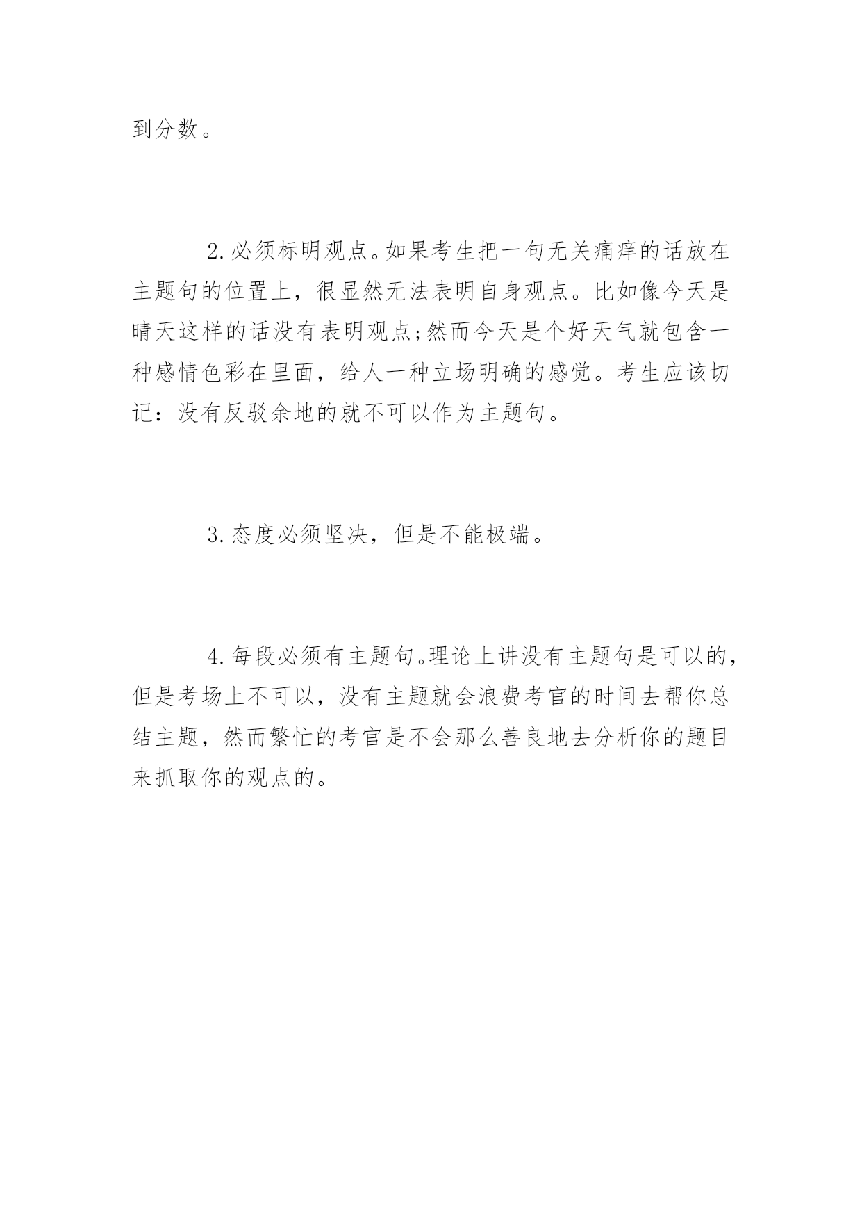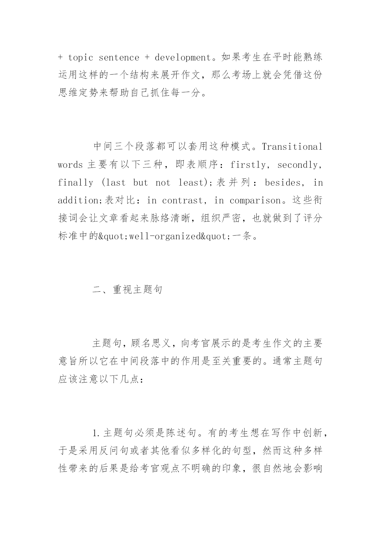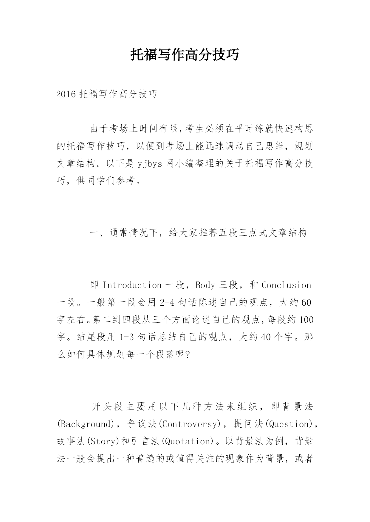 托福写作高分技巧 2016托福写作高分技巧 由于考场上时间有限,考生必须在平时练就快速构思的托福写作技巧,以便到考场上能迅速调动自己思维,规划文章结构。以下是yjbys网小编整理的关于托福写作高分技巧,供同学们参考。 一、通常情况下,给大家推荐五段三点式文章结构 即Introduction一段,Body三段,和Conclusion一段。一般第一段会用2-4句话陈述自己的观点,大约60字左右。第二到四段从三个方面论述自己的观点,每段约100字。结尾段用1-3句话总结自己的观点,大约40个字。那么如何具体规划每一个段落呢? 开头段主要用以下几种方法来组织,即背景法(Background),争议法(Controversy),提问法(Question),故事法(Story)和引言法(Quotation)。以背景法为例,背景法一般会提出一种普遍的或值得关注的现象作为背景,或者是由远到近、由大到小地谈论紧扣论题的社会观点作为背景。 背景法开头段的结构通常是:背景(1-3句)+论题+反方观点+(反方理由)+过度+(正方观点)+作者的观点+作者的理由。 以2007年8月11日的独立写作试题为例:Technologymakespeople'slivesmorecomplicated.题目涉及到了现今社会比较热门的`话题——科技。这样,我们就可以以这种社会比较关注的现象作为我们作文的开头背景。因此这个题目的首段就可以这样开始:Technologyhashadtremendousimpactsoneveryaspectofmodernlife.However,peoplearehavingconflictingopinionsaboutwhetherithasmadepeople'slivesmorecomplicatedornot.Ibelievetechnologyhasbyandlargemadeourlivesmoreconvenient。第一句话就紧贴社会的背景,这样写不但很容易打开考生自己的思路,抓住作文的焦点,还能引起考官的共鸣。 中间段落的文章结构通常如下:Transitionalwords+topicsentence+development。如果考生在平时能熟练运用这样的一个结构来展开作文,那么考场上就会凭借这份思维定势来帮助自己抓住每一分。 中间三个段落都可以套用这种模式。Transitionalwords主要有以下三种,即表顺序:firstly,secondly,finally(lastbutnotleast);表并列:besides,inaddition;表对比:incontrast,incomparison。这些衔接词会让文章看起来脉络清晰,组织严密,也就做到了评分标准中的"well-organized"一条。 二、重视主题句 主题句,顾名思义,向考官展示的是考生作文的主要意旨所以它在中间段落中的作用是至关重要的。通常主题句应该注意以下几点: 1.主题句必须是陈述句。有的考生想在写作中创新,于是采用反问句或者其他看似多样化的句型,然而这种多样性带来的后果是给考官观点不明确的印象,很自然地会影响到分数。 2.必须标明观点。如果考生把一句无关痛痒的话放在主题句的位置上,很显然无法表明自身观点。比如像今天是晴天这样的话没有表明观点;然而今天是个好天气就包含一种感情色彩在里面,给人一种立场明确的感觉。考生应该切记:没有反驳余地的就不可以作为主题句。 3.态度必须坚决,但是不能极端。 4.每段必须有主题句。理论上讲没有主题句是可以的,但是考场上不可以,没有主题就会浪费考官的时间去帮你总结主题,然而繁忙的考官是不会那么善良地去分析你的题目来抓取你的观点的。