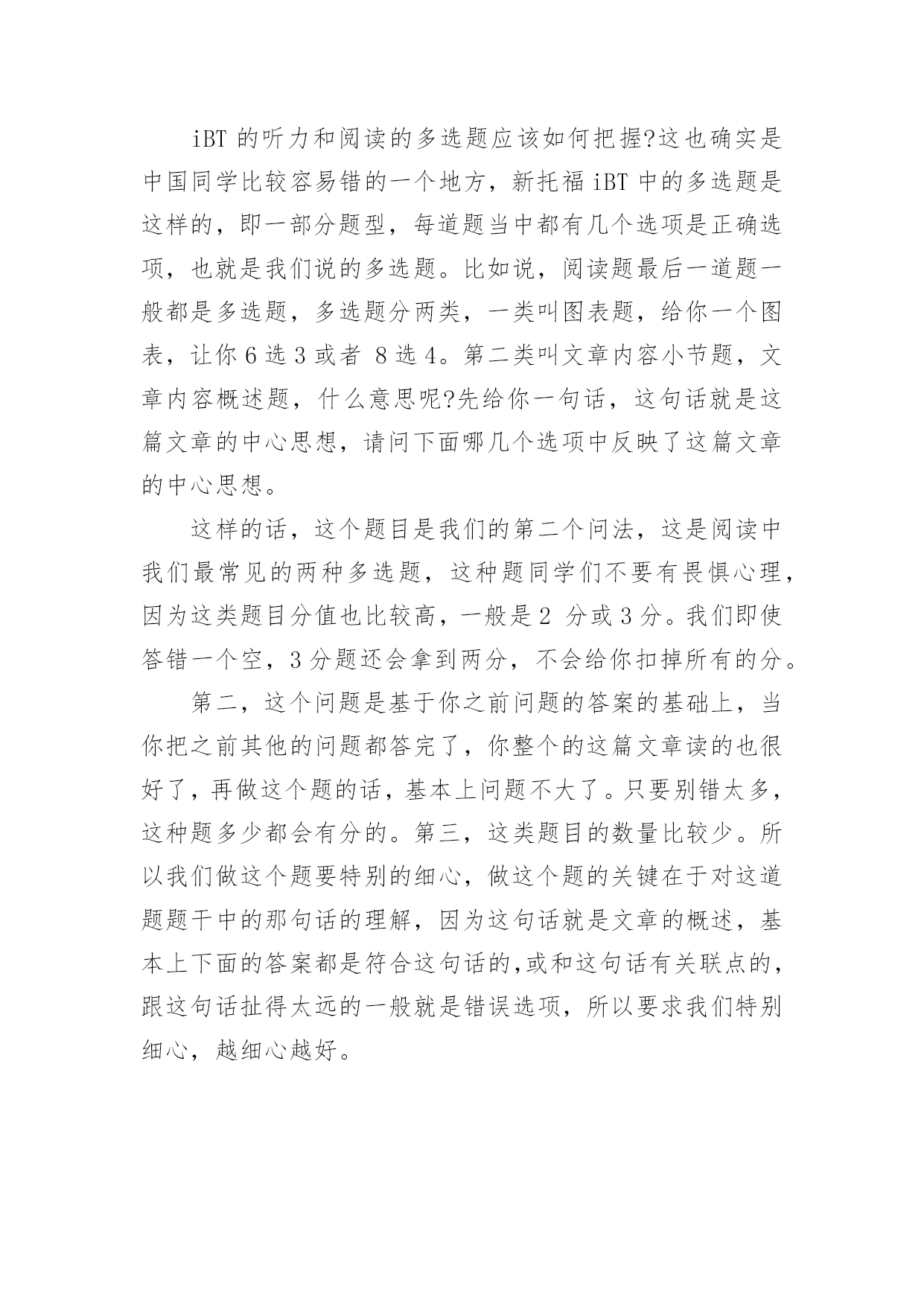 托福阅读答题技巧解析 关于托福阅读答题技巧解析一、新托福阅读的新题型重点考察句子间的关系在托福阅读中有那么一个段落,其中有4个框框,他代表你在题干中的那句话可以拖入这个里面来,做题的方法是:第一步一定要优先阅读题干中要被拖入到原文的那句话。第二步找要被代入原文那句话当中的关键字和要点。因为我们知道,如果要把一句话代入到原文当中,这句话肯定和原文有很强的关联性。然后我们找的是要被代入原文那句话中的关联词,这有很多,比方说一旦看到"因为",前面讲的就可能是原因,因为这个结果后面有一个情况;再比如你看到THUS,通常表示结果,那么正确选项在第一个空和第二个空的可能性不是很大,在第三个空和第四个空的可能性比较大,因为它表示结果,基本都在比较靠后的位置;比如我们看到incontrast,跟前面正好是相反的,所以说这些关键词特别重要,从一定意义上来讲是我们做这种题型成败的关键。我们要找逻辑关系,你要代入这句话的话,跟前面或者后面的话肯定有一种逻辑关系在里面,到底前后是转折还是递进还是表示结果还是什么样的关系,这是我们的情况。一般来说,多数中国同学做这个题还是比较容易的,我建议大家在备考的时候大量练习此类题目的`做法。二、多选题的关键在于题干iBT的听力和阅读的多选题应该如何把握?这也确实是中国同学比较容易错的一个地方,新托福iBT中的多选题是这样的,即一部分题型,每道题当中都有几个选项是正确选项,也就是我们说的多选题。比如说,阅读题最后一道题一般都是多选题,多选题分两类,一类叫图表题,给你一个图表,让你6选3或者8选4。第二类叫文章内容小节题,文章内容概述题,什么意思呢?先给你一句话,这句话就是这篇文章的中心思想,请问下面哪几个选项中反映了这篇文章的中心思想。这样的话,这个题目是我们的第二个问法,这是阅读中我们最常见的两种多选题,这种题同学们不要有畏惧心理,因为这类题目分值也比较高,一般是2分或3分。我们即使答错一个空,3分题还会拿到两分,不会给你扣掉所有的分。第二,这个问题是基于你之前问题的答案的基础上,当你把之前其他的问题都答完了,你整个的这篇文章读的也很好了,再做这个题的话,基本上问题不大了。只要别错太多,这种题多少都会有分的。第三,这类题目的数量比较少。所以我们做这个题要特别的细心,做这个题的关键在于对这道题题干中的那句话的理解,因为这句话就是文章的概述,基本上下面的答案都是符合这句话的,或和这句话有关联点的,跟这句话扯得太远的一般就是错误选项,所以要求我们特别细心,越细心越好。