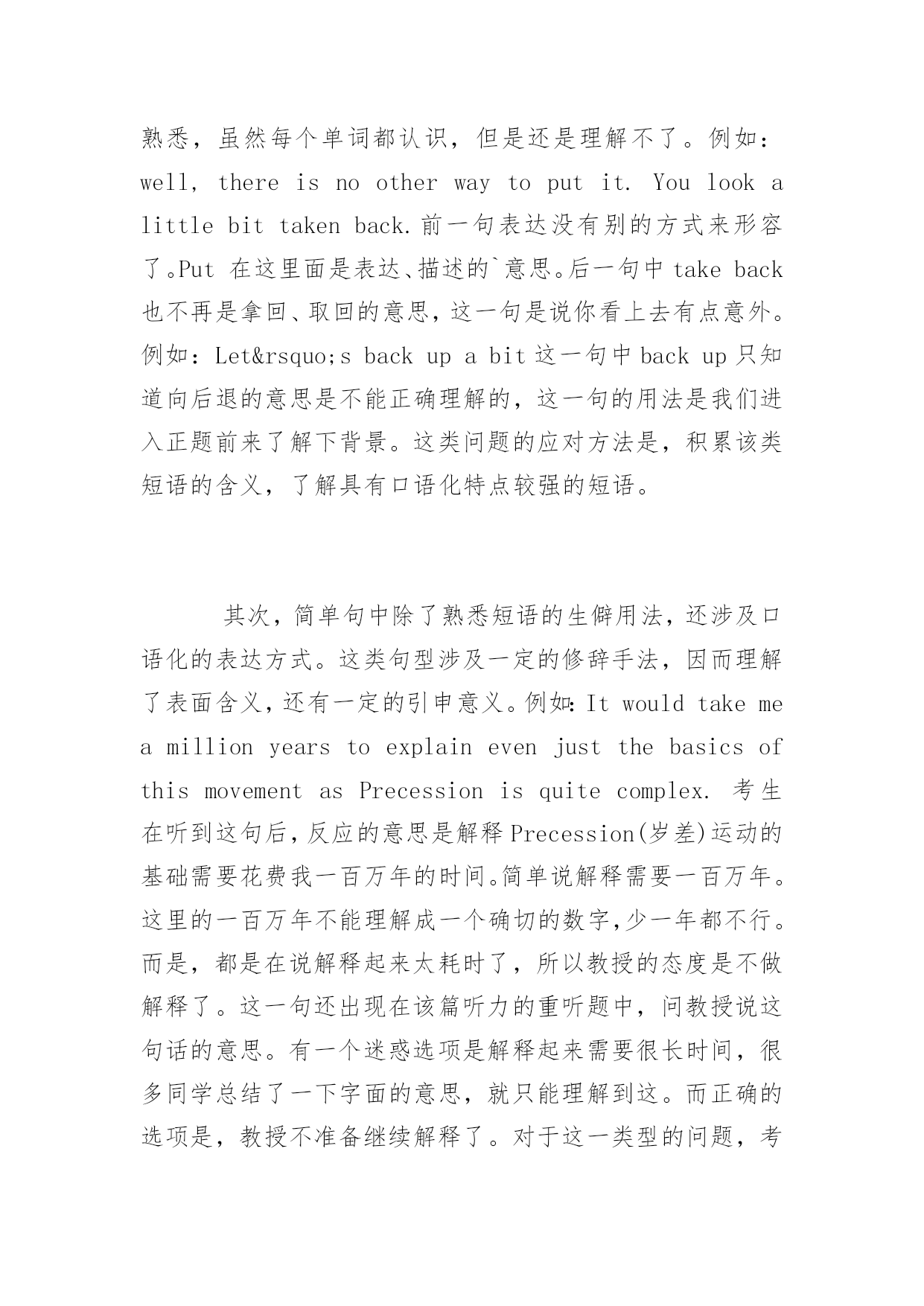 托福听力备考重难点解析 2016托福听力备考重难点解析 托福听力要拿高分并不是那么容易,只有通过不断的练习,不断的积累才能取得好的成绩,为了帮助考生们更加有效的备考托福,下面是yjbys网小编提供给大家关于托福听力备考重难点解析,希望对大家的备考有所帮助。 托福听力备考中,考生出现涉及句子层面的常见问题不仅会涉及复杂的长难句,简单句也会出现理解问题。这是由托福听力内容的决定的。托福听力对话部分模拟校园生活场景,讲座部分模仿教师授课场景,尤其是教授在讲授学术话题时会和学生进行互动,因而口语特征明显,会用到很多地道的表达。考生对于口语化的表达没有足够积累,会影响考生对文章的理解。 首先,从简单句开始。托福听力材料中涉及部分简单句,由于是比较口语化的表达,很多句子的用法,考生们不熟悉,虽然每个单词都认识,但是还是理解不了。例如:well,thereisnootherwaytoputit.Youlookalittlebittakenback.前一句表达没有别的方式来形容了。Put在这里面是表达、描述的`意思。后一句中takeback也不再是拿回、取回的意思,这一句是说你看上去有点意外。例如:Let’sbackupabit这一句中backup只知道向后退的意思是不能正确理解的,这一句的用法是我们进入正题前来了解下背景。这类问题的应对方法是,积累该类短语的含义,了解具有口语化特点较强的短语。 其次,简单句中除了熟悉短语的生僻用法,还涉及口语化的表达方式。这类句型涉及一定的修辞手法,因而理解了表面含义,还有一定的引申意义。例如:ItwouldtakemeamillionyearstoexplainevenjustthebasicsofthismovementasPrecessionisquitecomplex.考生在听到这句后,反应的意思是解释Precession(岁差)运动的基础需要花费我一百万年的时间。简单说解释需要一百万年。这里的一百万年不能理解成一个确切的数字,少一年都不行。而是,都是在说解释起来太耗时了,所以教授的态度是不做解释了。这一句还出现在该篇听力的重听题中,问教授说这句话的意思。有一个迷惑选项是解释起来需要很长时间,很多同学总结了一下字面的意思,就只能理解到这。而正确的选项是,教授不准备继续解释了。对于这一类型的问题,考生应该在听力中多注意类似的表达,同时也要注重上下文,帮助理解。海知音小编提醒大家在备考的时候可以了解一些关于托福听力评分标准的相关信息,多做托福听力题,提高自己的成绩。 考生还会听到托福听力文章中的长难句,在较长的句子中迷失了主语和动词,因而难以抓住核心意思,例如,Thisgasishydrogensulfide,risesupandmixeswithoxygenintheundergroundwaterthatsitsinthecracksandfissuresinthelimestone.这一句翻译起来内容依然繁杂,这个气体是硫化氢,上升,和氧气混合,氧气来自石灰石裂缝中存在的地下水。对于长难句,考生不必太过耗时,应对方法一是通过抓住句子主语,及重要动词,来理解句子大意,此外,也注意上下文。 托福听力内容口语化特征明显,所以要通过在平时练习中多关注、积累没听出来的表达,习惯听力讲座中的口语化表达,同时注意说话人的语气,以及上下文来辅助理解。 通过上面对于托福听力材料中句子问题的介绍相信各位能看出一些不同的用法也会影响大家对于托福听力的理解,这都需要大家在托福听力备考中事先准备好,这样才能有一个好的成绩。