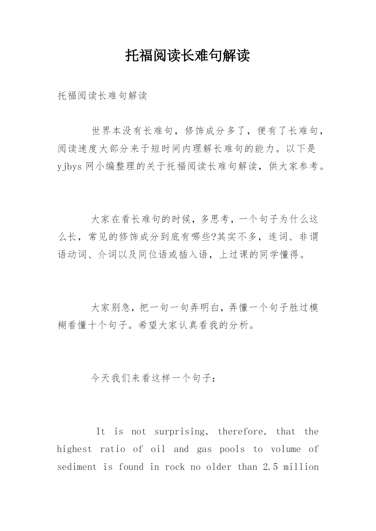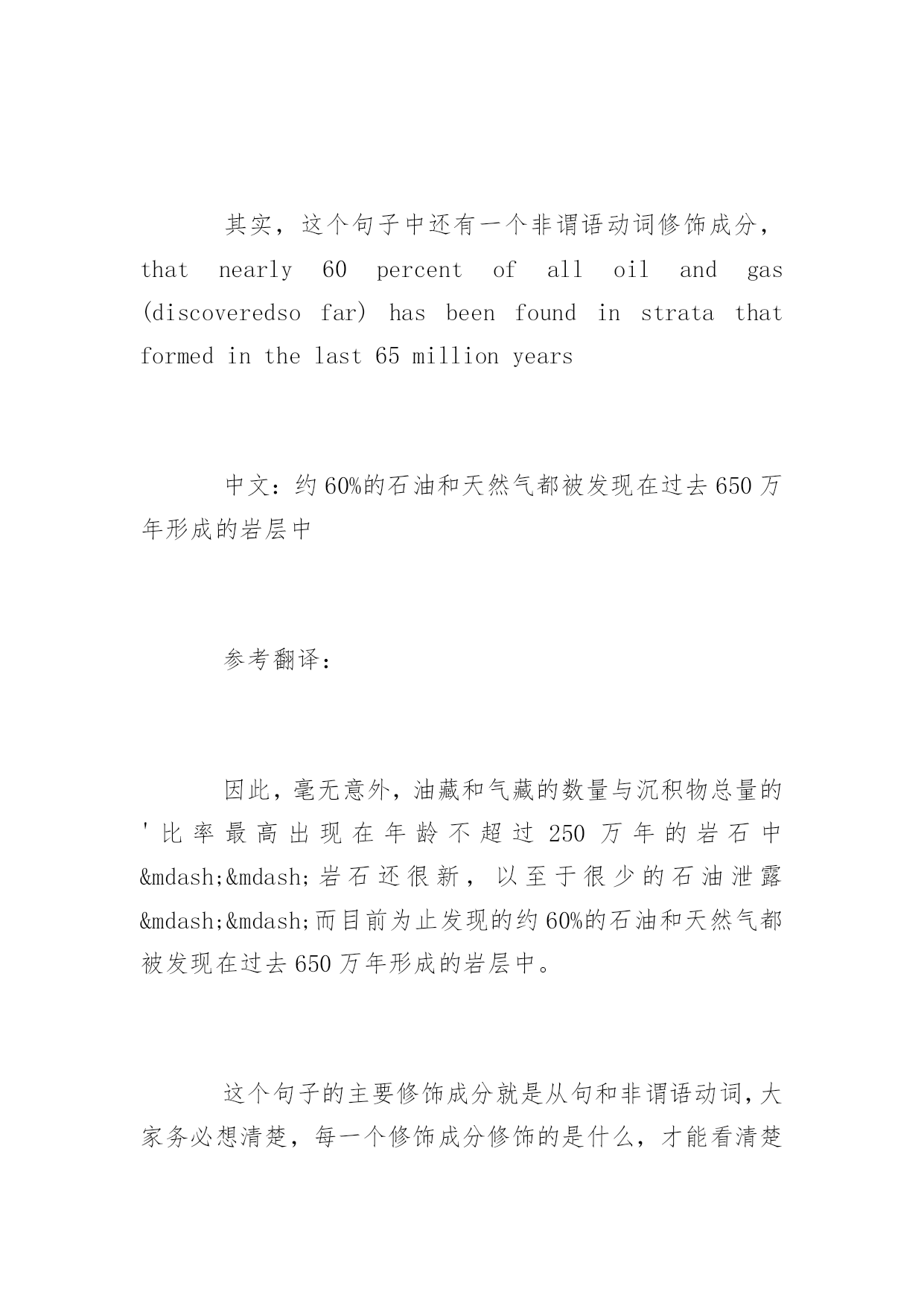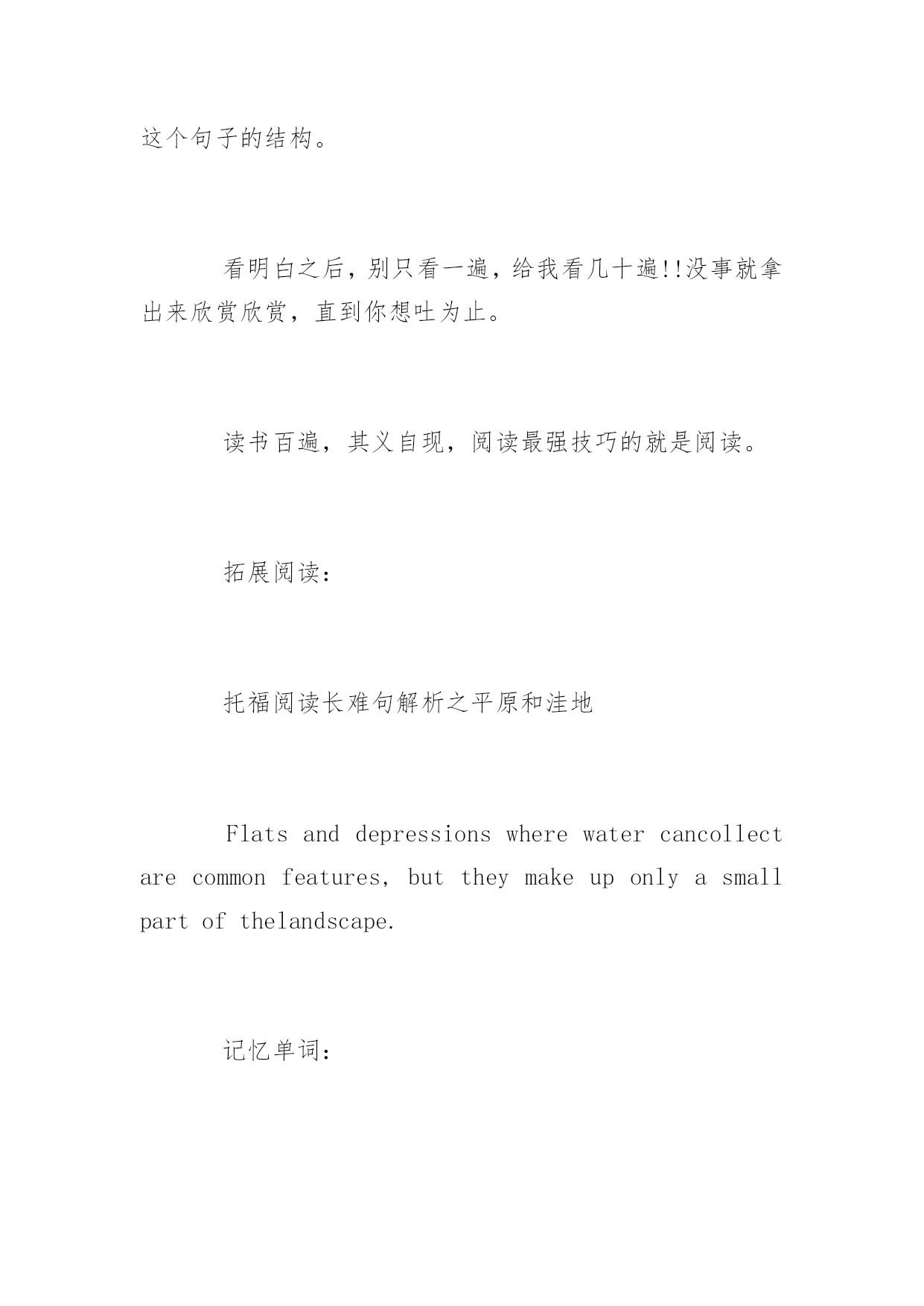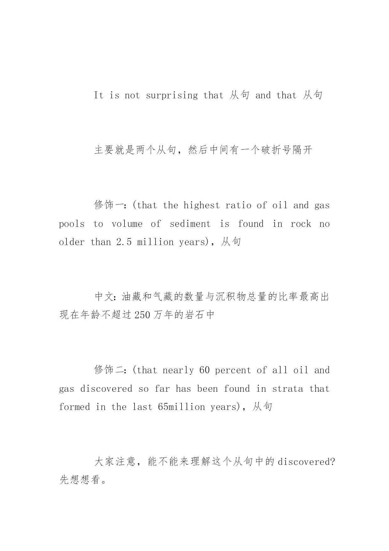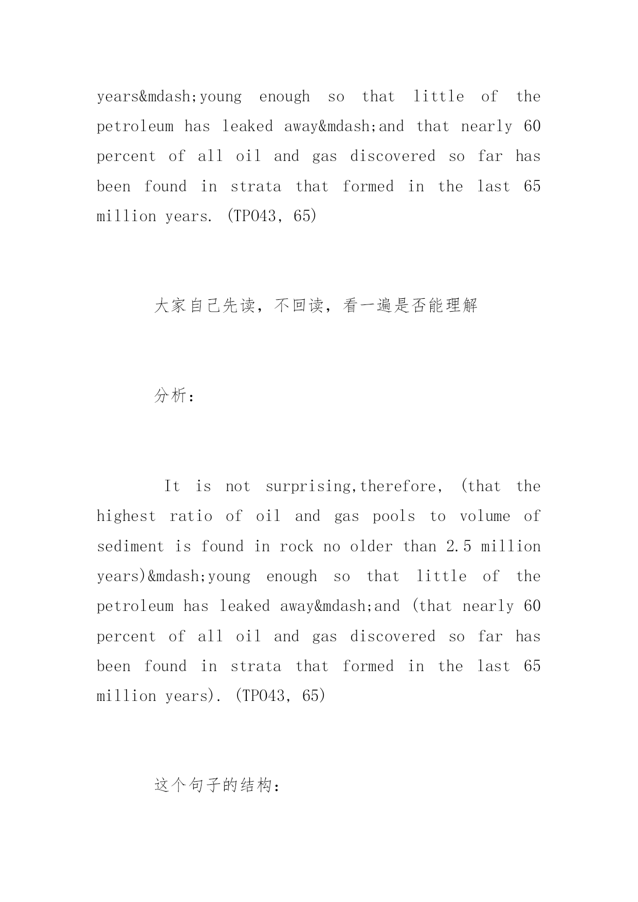 托福阅读长难句解读 托福阅读长难句解读 世界本没有长难句,修饰成分多了,便有了长难句,阅读速度大部分来于短时间内理解长难句的能力。以下是yjbys网小编整理的关于托福阅读长难句解读,供大家参考。 大家在看长难句的时候,多思考,一个句子为什么这么长,常见的修饰成分到底有哪些?其实不多,连词、非谓语动词、介词以及同位语或插入语,上过课的同学懂得。 大家别急,把一句一句弄明白,弄懂一个句子胜过模糊看懂十个句子。希望大家认真看我的分析。 今天我们来看这样一个句子: Itisnotsurprising,therefore,thatthehighestratioofoilandgaspoolstovolumeofsedimentisfoundinrocknoolderthan2.5millionyears—youngenoughsothatlittleofthepetroleumhasleakedaway—andthatnearly60percentofalloilandgasdiscoveredsofarhasbeenfoundinstratathatformedinthelast65millionyears.(TPO43,65) 大家自己先读,不回读,看一遍是否能理解 分析: Itisnotsurprising,therefore,(thatthehighestratioofoilandgaspoolstovolumeofsedimentisfoundinrocknoolderthan2.5millionyears)—youngenoughsothatlittleofthepetroleumhasleakedaway—and(thatnearly60percentofalloilandgasdiscoveredsofarhasbeenfoundinstratathatformedinthelast65millionyears).(TPO43,65) 这个句子的结构: Itisnotsurprisingthat从句andthat从句 主要就是两个从句,然后中间有一个破折号隔开 修饰一:(thatthehighestratioofoilandgaspoolstovolumeofsedimentisfoundinrocknoolderthan2.5millionyears),从句 中文:油藏和气藏的数量与沉积物总量的比率最高出现在年龄不超过250万年的岩石中 修饰二:(thatnearly60percentofalloilandgasdiscoveredsofarhasbeenfoundinstratathatformedinthelast65millionyears),从句 大家注意,能不能来理解这个从句中的discovered?先想想看。 其实,这个句子中还有一个非谓语动词修饰成分,thatnearly60percentofalloilandgas(discoveredsofar)hasbeenfoundinstratathatformedinthelast65millionyears 中文:约60%的石油和天然气都被发现在过去650万年形成的岩层中 参考翻译: 因此,毫无意外,油藏和气藏的数量与沉积物总量的'比率最高出现在年龄不超过250万年的岩石中——岩石还很新,以至于很少的石油泄露——而目前为止发现的约60%的石油和天然气都被发现在过去650万年形成的岩层中。 这个句子的主要修饰成分就是从句和非谓语动词,大家务必想清楚,每一个修饰成分修饰的是什么,才能看清楚这个句子的结构。 看明白之后,别只看一遍,给我看几十遍!!没事就拿出来欣赏欣赏,直到你想吐为止。 读书百遍,其义自现,阅读最强技巧的就是阅读。 拓展阅读: 托福阅读长难句解析之平原和洼地 Flatsanddepressionswherewatercancollectarecommonfeatures,buttheymakeuponlyasmallpartofthelandscape. 记忆单词: depressionn.洼地;沮丧 landscapen.地貌 理解句子: where引导的定语从句,修饰flatsanddepressions。 此句译文: 平原和洼地是水源聚集的共同地貌特征,但是它们只占地表的很小一部分。