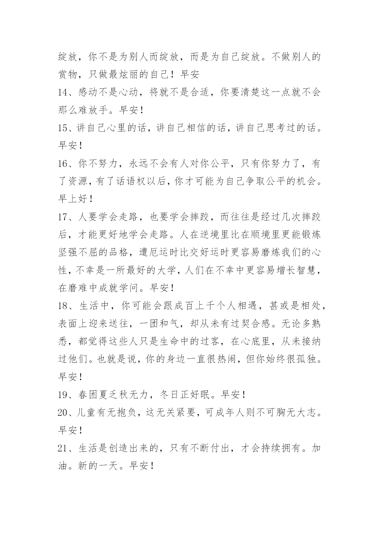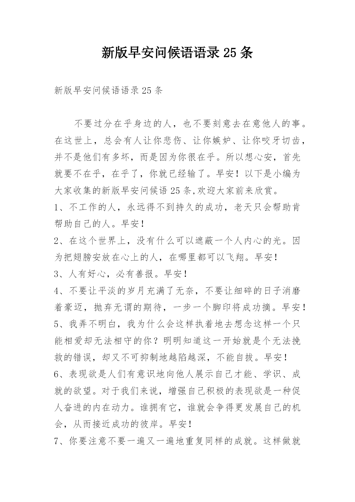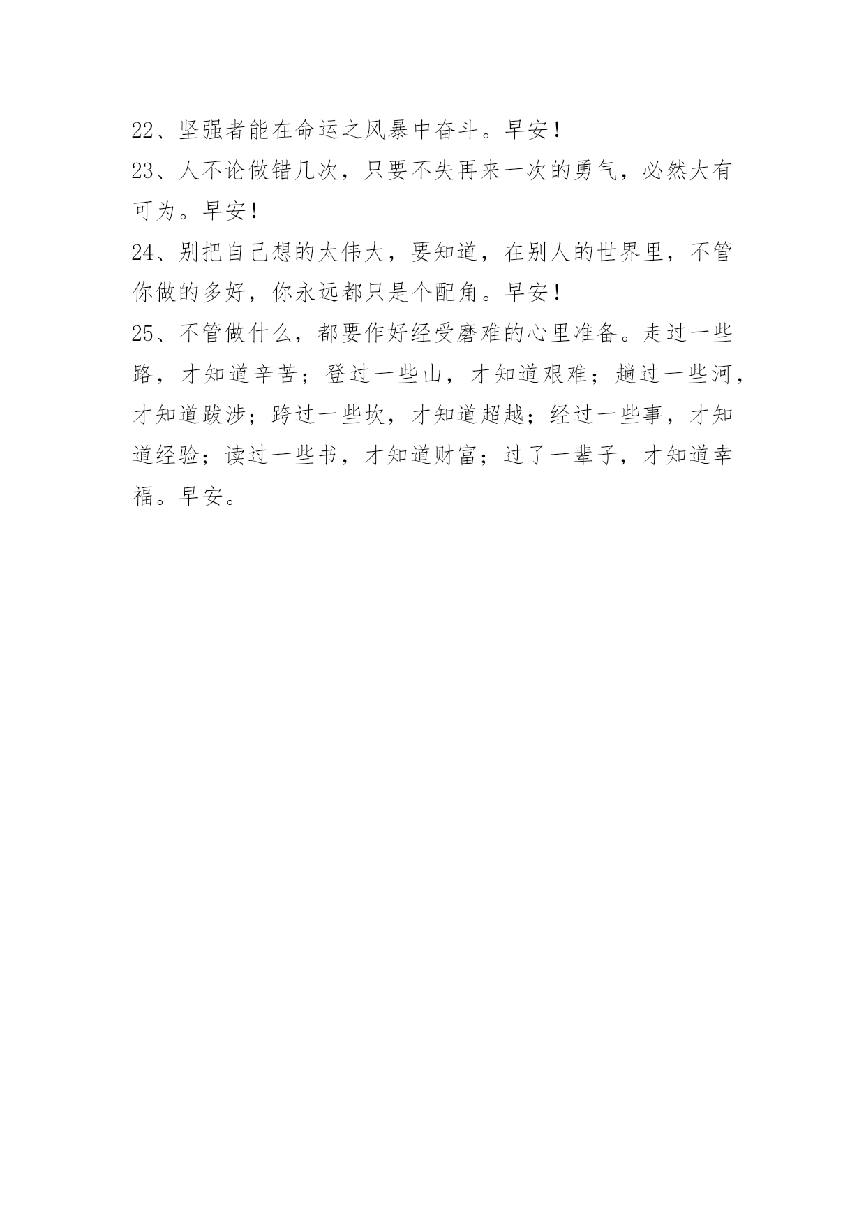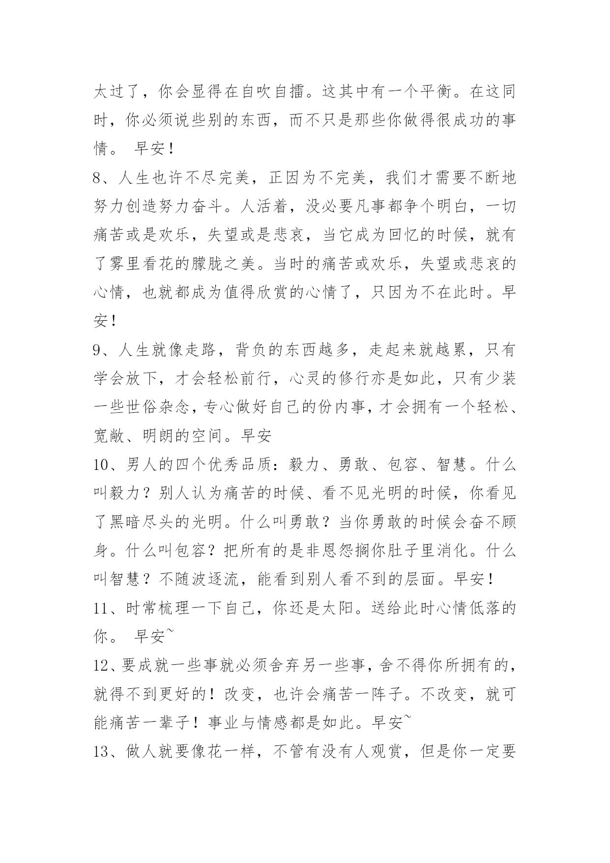 新版早安问候语语录25条 新版早安问候语语录25条不要过分在乎身边的人,也不要刻意去在意他人的事。在这世上,总会有人让你悲伤、让你嫉妒、让你咬牙切齿,并不是他们有多坏,而是因为你很在乎。所以想心安,首先就要不在乎,在乎了,你就已经输了。早安!以下是小编为大家收集的新版早安问候语25条,欢迎大家前来欣赏。1、不工作的人,永远得不到持久的成功,老天只会帮助肯帮助自己的人。早安!2、在这个世界上,没有什么可以遮蔽一个人内心的光。因为把翅膀安放在心上的人,在哪里都可以飞翔。早安!3、人有好心,必有善报。早安!4、不要让平淡的岁月充满了无奈,不要让细碎的日子消磨着豪迈,抛弃无谓的期待,一步一个脚印将成功摘。早安!5、我弄不明白,我为什么会这样执着地去想念这样一个只能相爱却无法相守的你?明明知道这一开始就是个无法挽救的错误,却又不可抑制地越陷越深,不能自拔。早安!6、表现欲是人们有意识地向他人展示自己才能、学识、成就的欲望。对于我们来说,增强自己积极的表现欲是一种促人奋进的内在动力。谁拥有它,谁就会争得更发展自己的机会,从而接近成功的彼岸。早安!7、你要注意不要一遍又一遍地重复同样的成就。这样做就太过了,你会显得在自吹自擂。这其中有一个平衡。在这同时,你必须说些别的东西,而不只是那些你做得很成功的事情。早安!8、人生也许不尽完美,正因为不完美,我们才需要不断地努力创造努力奋斗。人活着,没必要凡事都争个明白,一切痛苦或是欢乐,失望或是悲哀,当它成为回忆的时候,就有了雾里看花的朦胧之美。当时的痛苦或欢乐,失望或悲哀的心情,也就都成为值得欣赏的心情了,只因为不在此时。早安!9、人生就像走路,背负的东西越多,走起来就越累,只有学会放下,才会轻松前行,心灵的修行亦是如此,只有少装一些世俗杂念,专心做好自己的份内事,才会拥有一个轻松、宽敞、明朗的空间。早安10、男人的四个优秀品质:毅力、勇敢、包容、智慧。什么叫毅力?别人认为痛苦的时候、看不见光明的时候,你看见了黑暗尽头的光明。什么叫勇敢?当你勇敢的时候会奋不顾身。什么叫包容?把所有的是非恩怨搁你肚子里消化。什么叫智慧?不随波逐流,能看到别人看不到的层面。早安!11、时常梳理一下自己,你还是太阳。送给此时心情低落的你。早安~12、要成就一些事就必须舍弃另一些事,舍不得你所拥有的,就得不到更好的!改变,也许会痛苦一阵子。不改变,就可能痛苦一辈子!事业与情感都是如此。早安~13、做人就要像花一样,不管有没有人观赏,但是你一定要绽放,你不是为别人而绽放,而是为自己绽放。不做别人的赏物,只做最炫丽的自己!早安14、感动不是心动,将就不是合适,你要清楚这一点就不会那么难放手。早安!15、讲自己心里的话,讲自己相信的话,讲自己思考过的话。早安!16、你不努力,永远不会有人对你公平,只有你努力了,有了资源,有了话语权以后,你才可能为自己争取公平的机会。早上好!17、人要学会走路,也要学会摔跤,而往往是经过几次摔跤后,才能更好地学会走路。人在逆境里比在顺境里更能锻炼坚强不屈的品格,遭厄运时比交好运时更容易磨炼我们的心性,不幸是一所最好的大学,人们在不幸中更容易增长智慧,在磨难中成就学问。早安!18、生活中,你可能会跟成百上千个人相遇,甚或是相处,表面上迎来送往,一团和气,却从未有过契合感。无论多熟悉,都觉得这些人只是生命中的过客,在心底里,从未接纳过他们。也就是说,你的身边一直很热闹,但你始终很孤独。早安!19、春困夏乏秋无力,冬日正好眠。早安!20、儿童有无抱负,这无关紧要,可成年人则不可胸无大志。早安!21、生活是创造出来的,只有不断付出,才会持续拥有。加油。新的一天。早安!22、坚强者能在命运之风暴中奋斗。早安!23、人不论做错几次,只要不失再来一次的勇气,必然大有可为。早安!24、别把自己想的太伟大,要知道,在别人的世界里,不管你做的多好,你永远都只是个配角。早安!25、不管做什么,都要作好经受磨难的心里准备。走过一些路,才知道辛苦;登过一些山,才知道艰难;趟过一些河,才知道跋涉;跨过一些坎,才知道超越;经过一些事,才知道经验;读过一些书,才知道财富;过了一辈子,才知道幸福。早安。