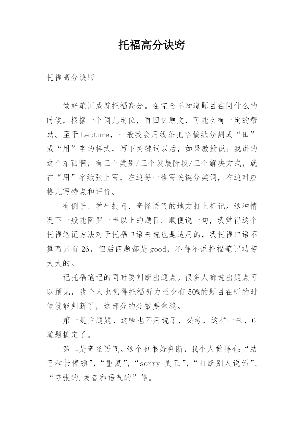 托福高分诀窍 托福高分诀窍做好笔记成就托福高分。在完全不知道题目在问什么的时候,根据一个词儿定位,再回忆原文,可能会有一定的帮助。至于Lecture,一般我会用线条把草稿纸分割成“田”或“用”字的样式,写下关键词以后,如果教授说:我讲的这个东西啊,有三个类别/三个发展阶段/三个解决方式,就在“用”字纸张上写,左边每一格写关键分类词,右边对应格儿写特点和评价。有例子、学生提问、奇怪语气的地方打上标记。这种情况下一般能网罗一半以上的题目。顺便说一句,我觉得这个托福笔记方法对于托福口语来说也是适用的,我托福口语不算高只有26,但后四题都是good,不得不说托福笔记功劳大大的。记托福笔记的同时要判断出题点。很多人都说出题点可以预见,我个人也觉得托福听力至少有50%的题目在听的时候就能判断了,这部分的分数要拿稳。第一是主题题。这啥也不用说了,必考,这样一来,6道题搞定了。第二是奇怪语气。这个也很好判断,我个人觉得有:“结巴和长停顿”,“重复”,“sorry+更正”,“打断别人说话”、“夸张的.发音和语气的”等。第三是我自己的感觉。如果是总分-列举型的文章(3个方案,3种方法,3个阶段,3个类别之类),最后一个列举考到可能性非常大。所以如果前两个都没听明白,别放弃,因为最后可能出题的是最后一个。相关阅读:专家支招:托福/雅思备考指南新托福考试写作十大高分句型