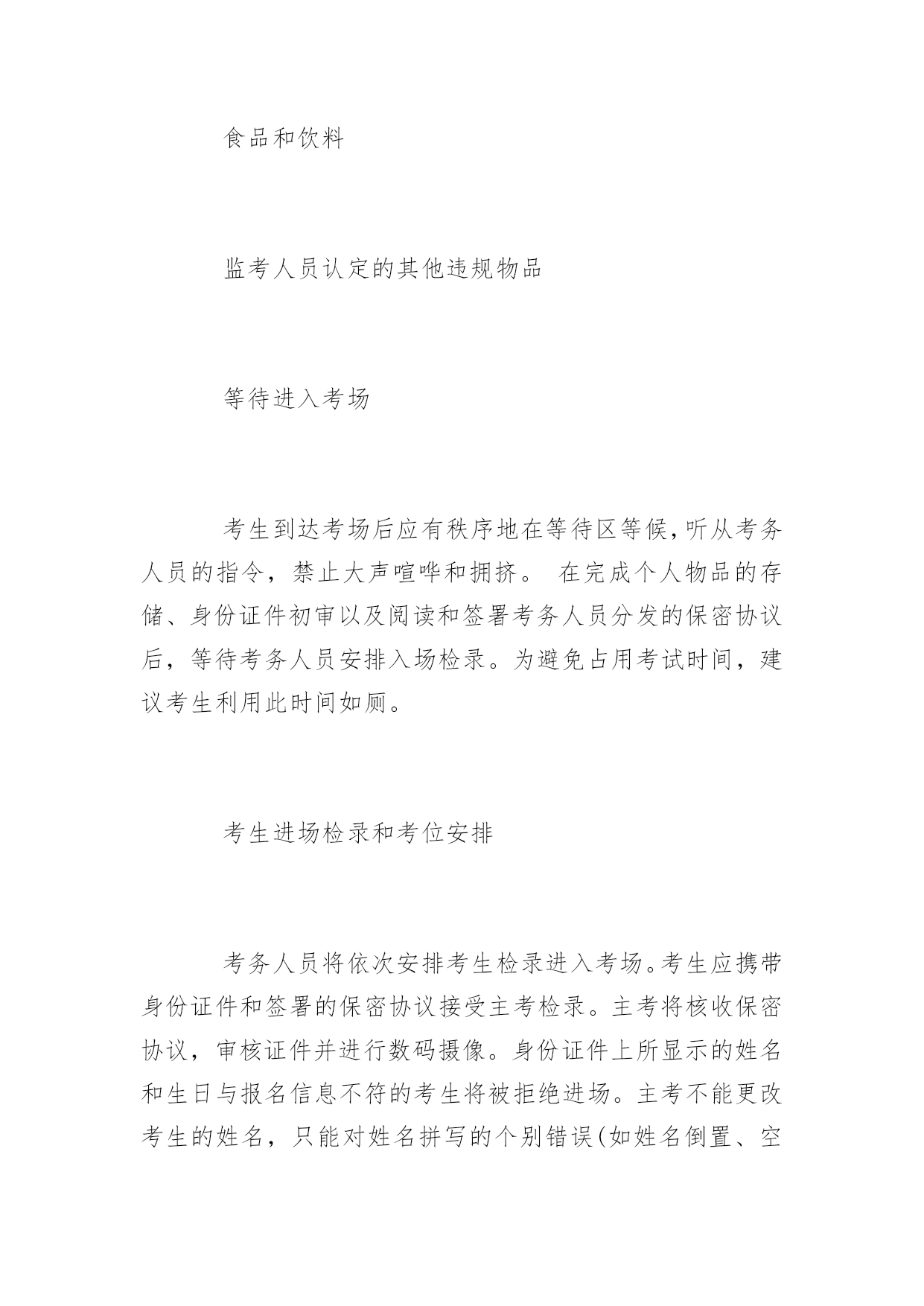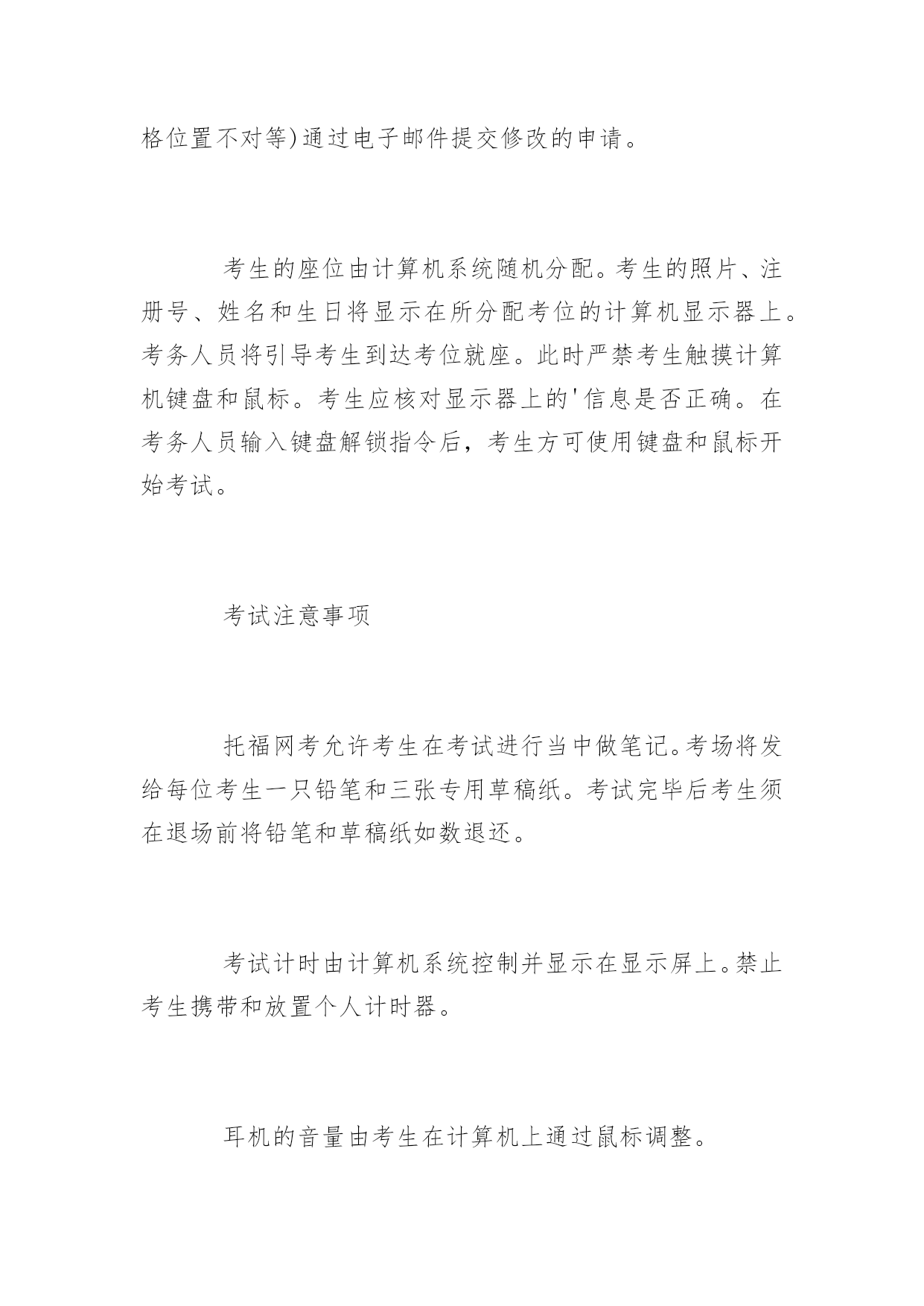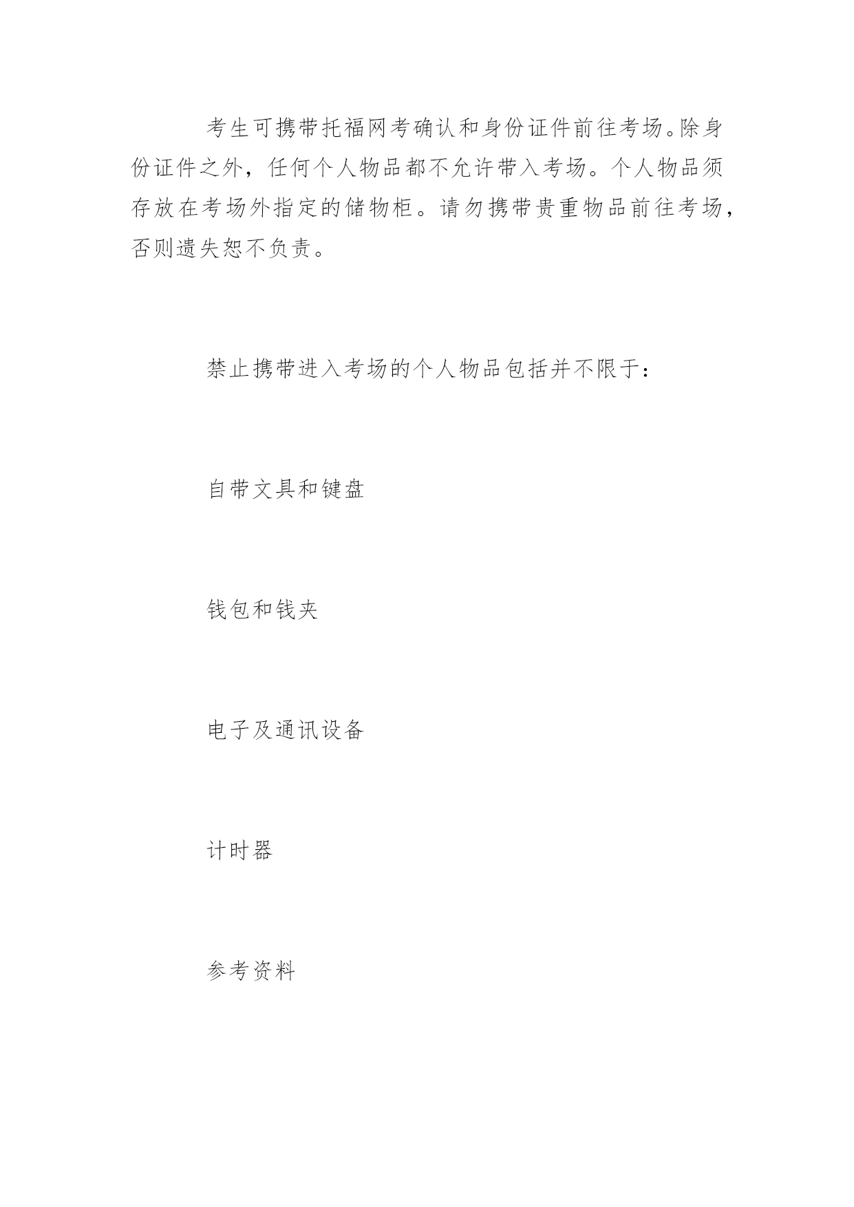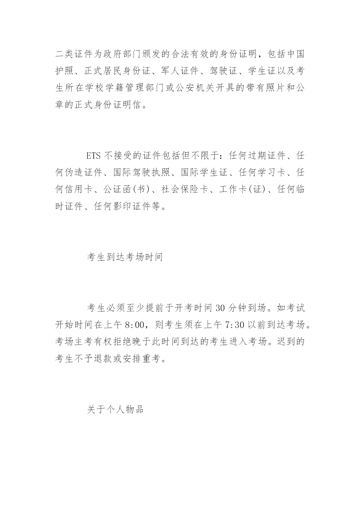 托福考试要求与流程 托福考试要求与流程 游手好闲的学习并不比学习游手好闲好。以下是小编为大家搜索整理的托福考试要求与流程,希望能给大家带来帮助!更多精彩内容请及时关注我们应届毕业生考试网! 证件要求 托福网考要求考生参加考试时须携带有本人签字的护照或同时携带两类证件,其中至少有一种是一类证件。台湾地区居民必须且只能携带台湾地区居民往来大陆通行证。非中国籍考生只能携带护照参加考试。证件上的姓名和生日等个人信息必须与报名信息完全一致。考生如未携带ETS要求提供的证件或携带证件不符合要求,将被拒绝进入考场,考费不予退还。 ETS接受的一类证件包括合法有效的中国护照、正式居民身份证(含香港和澳门身份证)和中国军人证件。接受的二类证件为政府部门颁发的合法有效的身份证明,包括中国护照、正式居民身份证、军人证件、驾驶证、学生证以及考生所在学校学籍管理部门或公安机关开具的带有照片和公章的正式身份证明信。 ETS不接受的证件包括但不限于:任何过期证件、任何伪造证件、国际驾驶执照、国际学生证、任何学习卡、任何信用卡、公证函(书)、社会保险卡、工作卡(证)、任何临时证件、任何影印证件等。 考生到达考场时间 考生必须至少提前于开考时间30分钟到场。如考试开始时间在上午8:00,则考生须在上午7:30以前到达考场。考场主考有权拒绝晚于此时间到达的考生进入考场。迟到的考生不予退款或安排重考。 关于个人物品 考生可携带托福网考确认和身份证件前往考场。除身份证件之外,任何个人物品都不允许带入考场。个人物品须存放在考场外指定的储物柜。请勿携带贵重物品前往考场,否则遗失恕不负责。 禁止携带进入考场的个人物品包括并不限于: 自带文具和键盘 钱包和钱夹 电子及通讯设备 计时器 参考资料 食品和饮料 监考人员认定的其他违规物品 等待进入考场 考生到达考场后应有秩序地在等待区等候,听从考务人员的指令,禁止大声喧哗和拥挤。在完成个人物品的存储、身份证件初审以及阅读和签署考务人员分发的保密协议后,等待考务人员安排入场检录。为避免占用考试时间,建议考生利用此时间如厕。 考生进场检录和考位安排 考务人员将依次安排考生检录进入考场。考生应携带身份证件和签署的保密协议接受主考检录。主考将核收保密协议,审核证件并进行数码摄像。身份证件上所显示的姓名和生日与报名信息不符的考生将被拒绝进场。主考不能更改考生的姓名,只能对姓名拼写的个别错误(如姓名倒置、空格位置不对等)通过电子邮件提交修改的申请。 考生的座位由计算机系统随机分配。考生的照片、注册号、姓名和生日将显示在所分配考位的计算机显示器上。考务人员将引导考生到达考位就座。此时严禁考生触摸计算机键盘和鼠标。考生应核对显示器上的'信息是否正确。在考务人员输入键盘解锁指令后,考生方可使用键盘和鼠标开始考试。 考试注意事项 托福网考允许考生在考试进行当中做笔记。考场将发给每位考生一只铅笔和三张专用草稿纸。考试完毕后考生须在退场前将铅笔和草稿纸如数退还。 考试计时由计算机系统控制并显示在显示屏上。禁止考生携带和放置个人计时器。 耳机的音量由考生在计算机上通过鼠标调整。 考生在考试时,只需使用计算机的键盘、鼠标和耳机进行考试,不得擅自触摸和拔插计算机其他部件。因考生非正常使用而导致计算机及耳机损坏(如将耳机电缆拉断),由考生负责赔偿。 如遇计算机系统故障或死机,请考生不要紧张,立即举手示意考务人员帮助重新启动考试系统。停机期间考试的计时停止。重新启动系统后将从停止时刻开始。 考场规则 考生须服从考务人员的指令,不得大声喧哗扰乱考场秩序。有问题须举手示意等待考务人员前来解决。 考生在考场的任何违规或舞弊行为都将被如实报告给ETS,违规或舞弊行为将会影响考生的考试成绩甚至考试资格。因违规舞弊而被取消考试成绩或考试资格的考生不得申请更改、退考或退款;情节严重者有可能被禁止参加以后的考试。 违规舞弊行为包括但不限于: 代替他人考试或请他人替考 采取任何形式协助他人进行舞弊或本人舞弊 在考场内携有或使用上述违规物品 通过不正当的手段获取考试信息 将草稿纸(全部或部分)或试题内容带出考场 不听从监考人员指令或警告 故意毁坏考场设施或考试设施 故意扰乱考场秩序或影响他人考试 监考人员认定的属于违规或舞弊的其他情况