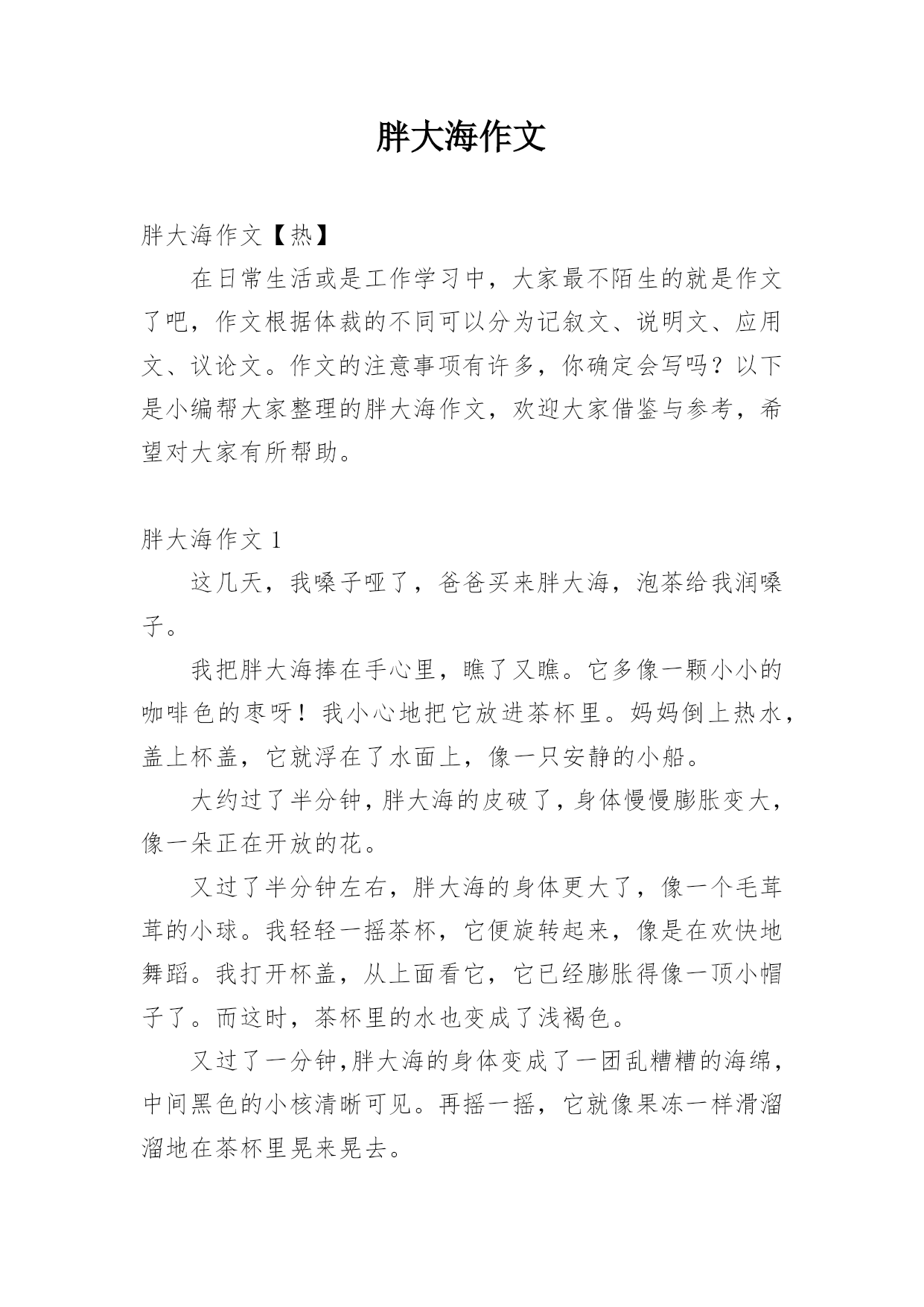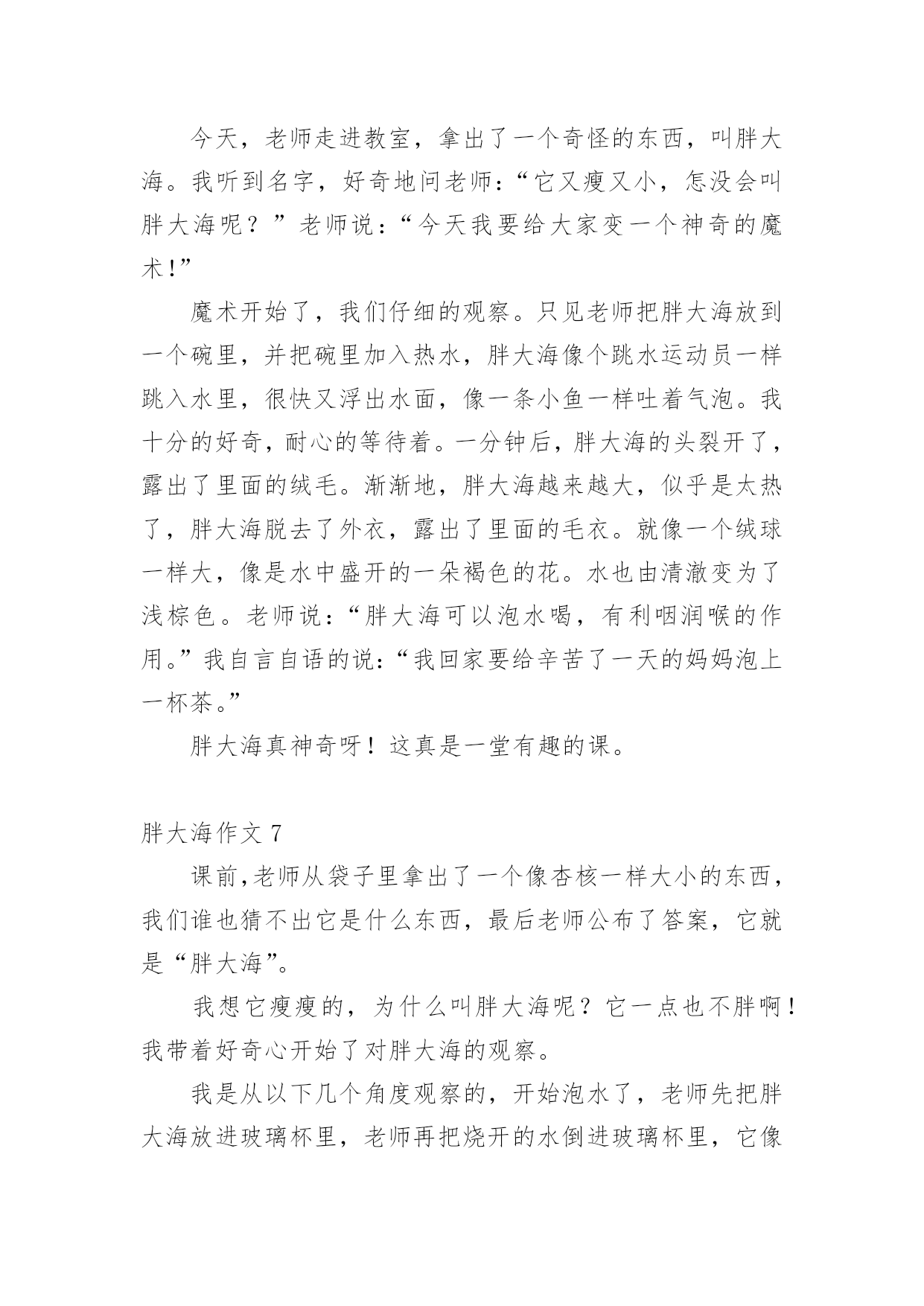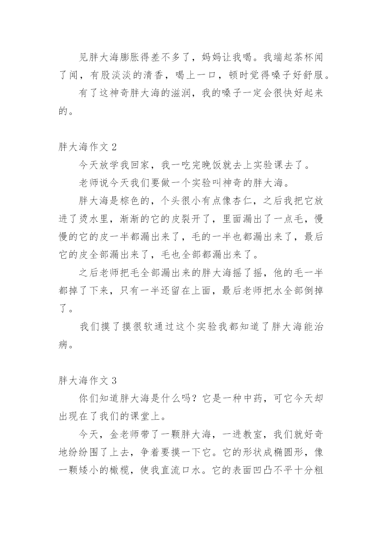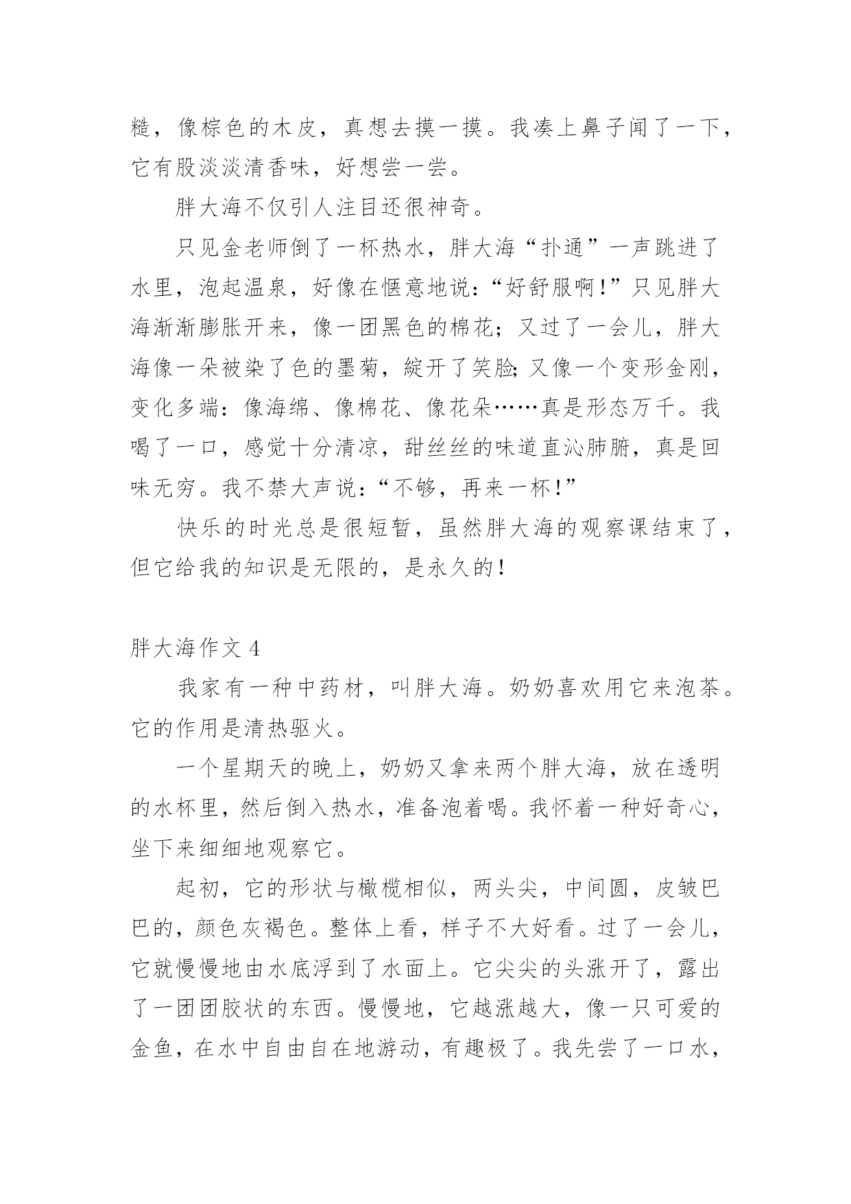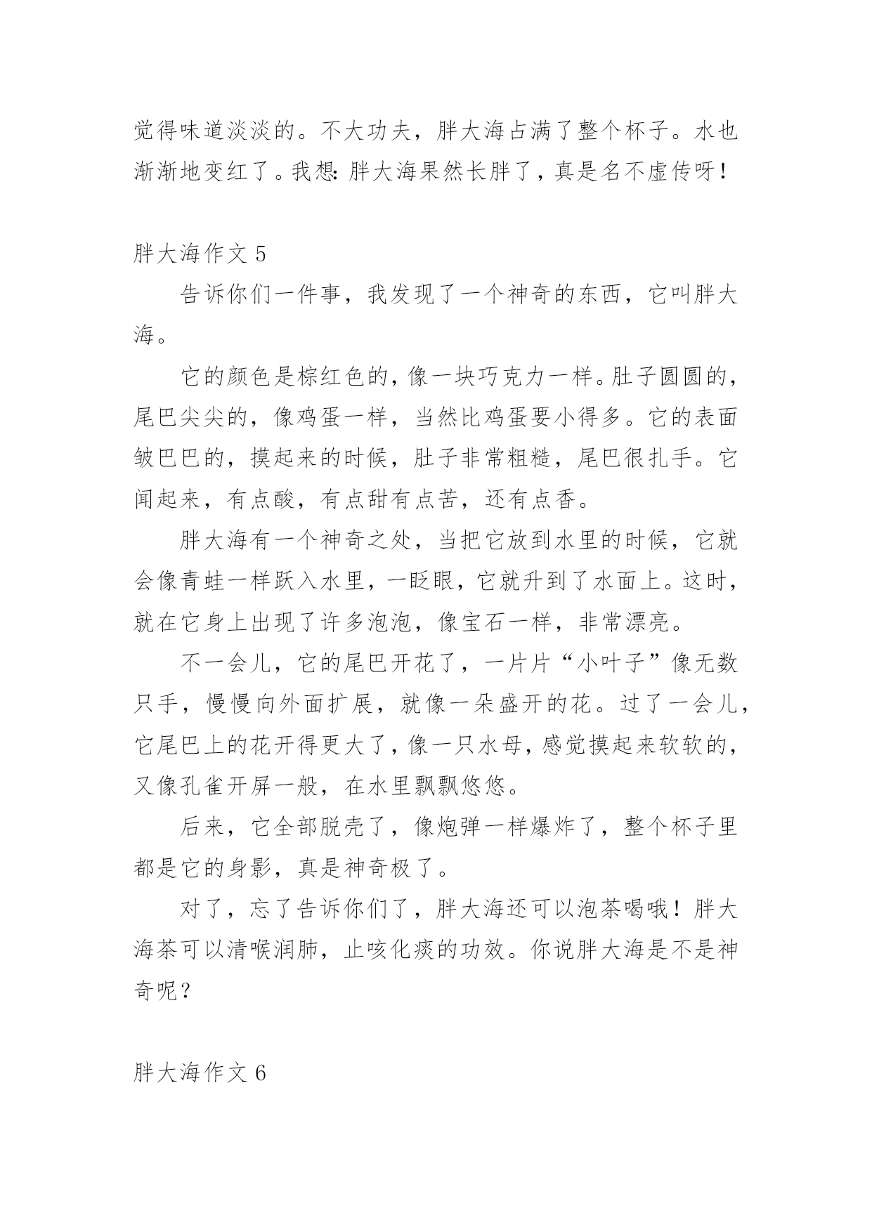 胖大海作文 胖大海作文【热】在日常生活或是工作学习中,大家最不陌生的就是作文了吧,作文根据体裁的不同可以分为记叙文、说明文、应用文、议论文。作文的注意事项有许多,你确定会写吗?以下是小编帮大家整理的胖大海作文,欢迎大家借鉴与参考,希望对大家有所帮助。胖大海作文1这几天,我嗓子哑了,爸爸买来胖大海,泡茶给我润嗓子。我把胖大海捧在手心里,瞧了又瞧。它多像一颗小小的咖啡色的枣呀!我小心地把它放进茶杯里。妈妈倒上热水,盖上杯盖,它就浮在了水面上,像一只安静的小船。大约过了半分钟,胖大海的皮破了,身体慢慢膨胀变大,像一朵正在开放的花。又过了半分钟左右,胖大海的身体更大了,像一个毛茸茸的小球。我轻轻一摇茶杯,它便旋转起来,像是在欢快地舞蹈。我打开杯盖,从上面看它,它已经膨胀得像一顶小帽子了。而这时,茶杯里的水也变成了浅褐色。又过了一分钟,胖大海的身体变成了一团乱糟糟的海绵,中间黑色的小核清晰可见。再摇一摇,它就像果冻一样滑溜溜地在茶杯里晃来晃去。见胖大海膨胀得差不多了,妈妈让我喝。我端起茶杯闻了闻,有股淡淡的清香,喝上一口,顿时觉得嗓子好舒服。有了这神奇胖大海的滋润,我的嗓子一定会很快好起来的。胖大海作文2今天放学我回家,我一吃完晚饭就去上实验课去了。老师说今天我们要做一个实验叫神奇的胖大海。胖大海是棕色的,个头很小有点像杏仁,之后我把它放进了烫水里,渐渐的它的皮裂开了,里面漏出了一点毛,慢慢的它的皮一半都漏出来了,毛的一半也都漏出来了,最后它的皮全部漏出来了,毛也全部都漏出来了。之后老师把毛全部漏出来的胖大海摇了摇,他的毛一半都掉了下来,只有一半还留在上面,最后老师把水全部倒掉了。我们摸了摸很软通过这个实验我都知道了胖大海能治病。胖大海作文3你们知道胖大海是什么吗?它是一种中药,可它今天却出现在了我们的课堂上。今天,金老师带了一颗胖大海,一进教室,我们就好奇地纷纷围了上去,争着要摸一下它。它的形状成椭圆形,像一颗矮小的橄榄,使我直流口水。它的表面凹凸不平十分粗糙,像棕色的木皮,真想去摸一摸。我凑上鼻子闻了一下,它有股淡淡清香味,好想尝一尝。胖大海不仅引人注目还很神奇。只见金老师倒了一杯热水,胖大海“扑通”一声跳进了水里,泡起温泉,好像在惬意地说:“好舒服啊!”只见胖大海渐渐膨胀开来,像一团黑色的棉花;又过了一会儿,胖大海像一朵被染了色的墨菊,綻开了笑脸;又像一个变形金刚,变化多端:像海绵、像棉花、像花朵……真是形态万千。我喝了一口,感觉十分清凉,甜丝丝的味道直沁肺腑,真是回味无穷。我不禁大声说:“不够,再来一杯!”快乐的时光总是很短暂,虽然胖大海的观察课结束了,但它给我的知识是无限的,是永久的!胖大海作文4我家有一种中药材,叫胖大海。奶奶喜欢用它来泡茶。它的作用是清热驱火。一个星期天的晚上,奶奶又拿来两个胖大海,放在透明的水杯里,然后倒入热水,准备泡着喝。我怀着一种好奇心,坐下来细细地观察它。起初,它的形状与橄榄相似,两头尖,中间圆,皮皱巴巴的,颜色灰褐色。整体上看,样子不大好看。过了一会儿,它就慢慢地由水底浮到了水面上。它尖尖的头涨开了,露出了一团团胶状的东西。慢慢地,它越涨越大,像一只可爱的金鱼,在水中自由自在地游动,有趣极了。我先尝了一口水,觉得味道淡淡的。不大功夫,胖大海占满了整个杯子。水也渐渐地变红了。我想:胖大海果然长胖了,真是名不虚传呀!胖大海作文5告诉你们一件事,我发现了一个神奇的东西,它叫胖大海。它的颜色是棕红色的,像一块巧克力一样。肚子圆圆的,尾巴尖尖的,像鸡蛋一样,当然比鸡蛋要小得多。它的表面皱巴巴的,摸起来的时候,肚子非常粗糙,尾巴很扎手。它闻起来,有点酸,有点甜有点苦,还有点香。胖大海有一个神奇之处,当把它放到水里的时候,它就会像青蛙一样跃入水里,一眨眼,它就升到了水面上。这时,就在它身上出现了许多泡泡,像宝石一样,非常漂亮。不一会儿,它的尾巴开花了,一片片“小叶子”像无数只手,慢慢向外面扩展,就像一朵盛开的花。过了一会儿,它尾巴上的花开得更大了,像一只水母,感觉摸起来软软的,又像孔雀开屏一般,在水里飘飘悠悠。后来,它全部脱壳了,像炮弹一样爆炸了,整个杯子里都是它的身影,真是神奇极了。对了,忘了告诉你们了,胖大海还可以泡茶喝哦!胖大海茶可以清喉润肺,止咳化痰的功效。你说胖大海是不是神奇呢?胖大海作文6今天,老师走进教室,拿出了一个奇怪的东西,叫胖大海。我听到名字,好奇地问老师:“它又瘦又小,怎没会叫胖大海呢?”老师说:“今天我要给大家变一个神奇的魔术!”魔术开始了,我们仔细的观察。只见老师把胖大海放到一个碗里,并把碗里加入热水,胖大海像个跳水运动员一样跳入水里,很快又浮出水面,像一条小鱼一样吐着气泡。我十分的好奇,耐心的等待着。一分钟后,胖大海的头裂开了,露出了里面的绒毛。渐渐地,胖大海越来越大,似乎是太热了