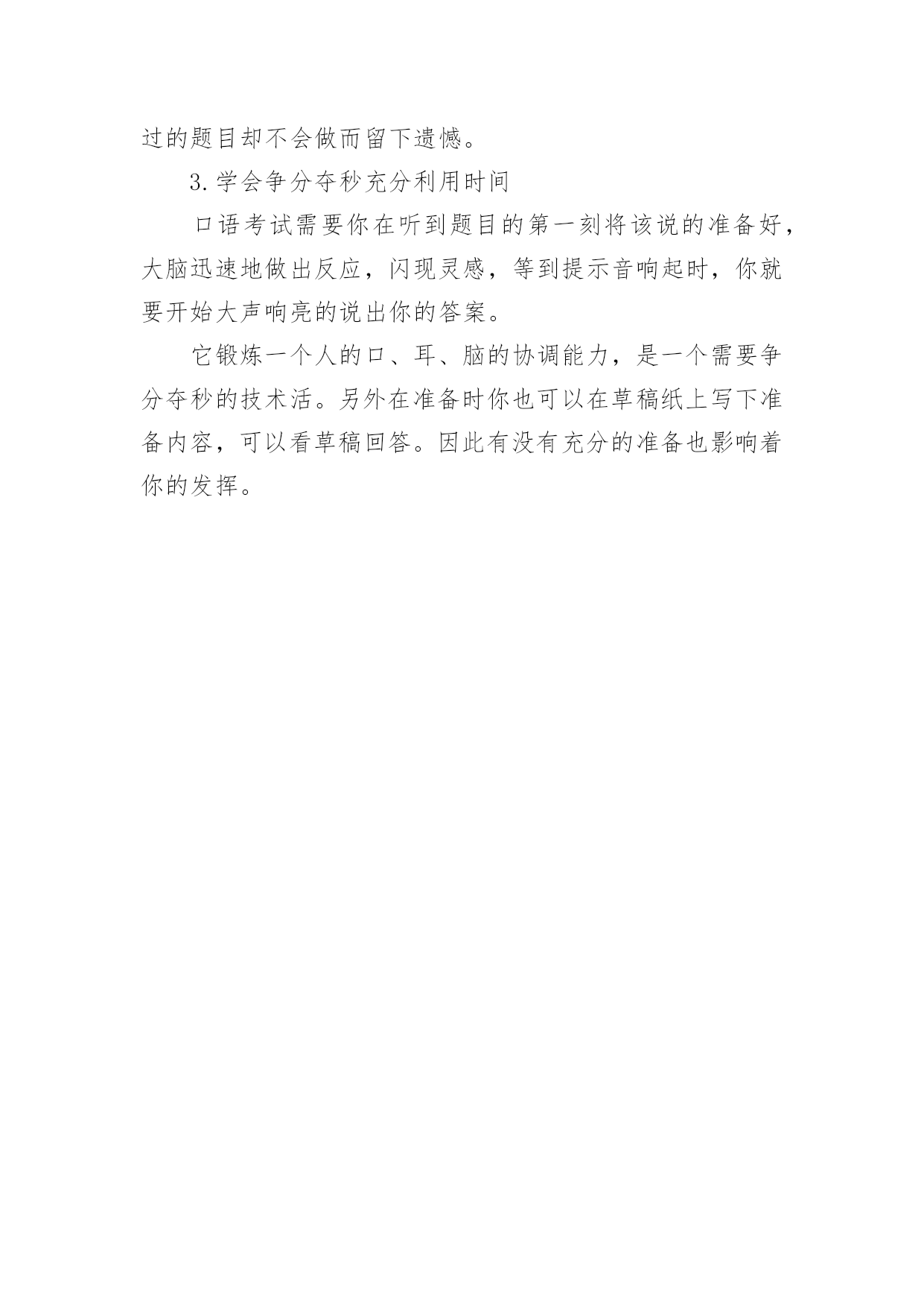 托福口语考试考前的准备 托福口语考试考前的准备1.托福口语模板的准备针对新托福口语的第一题,准备一些常用的口语段子。例如敬佩的人,喜欢的动物,喜欢的地方,难忘的事,对你最有影响的人……很多段子是可以回答不同的题目的。例如,题目要你说对你最有影响的人,或让你说你最敬佩的人,就可以使用同一个段子。所以大家可以根据人、事、物、地点等,准备几个属于自己的口语段子,这样在需要时就可得心应手。针对新托福口语的3-6题,大家可以做出问题的基本框架,利用这个框架来帮住自己理清思路。把听到的.内容填进空中,再在相关的地方填上自己的看法,这样答案便可轻松得到了。2.从模拟练习中测水平在做了上述准备后,你便可以自己实战练习,看看自己的能力了。你可以利用OG和两大模拟考软件kaplan和barron来多加练习。另外到了考前最后一个月,你需要做的就是下载机经和预测,把预测的题目全部做一遍,测一下自己的新托福口语水平。建议你把预测的题目一个不漏的全部做完,这样不仅可以锻炼口语,增强能力,重要的不会为自己考试时遇到出现过的题目却不会做而留下遗憾。3.学会争分夺秒充分利用时间口语考试需要你在听到题目的第一刻将该说的准备好,大脑迅速地做出反应,闪现灵感,等到提示音响起时,你就要开始大声响亮的说出你的答案。它锻炼一个人的口、耳、脑的协调能力,是一个需要争分夺秒的技术活。另外在准备时你也可以在草稿纸上写下准备内容,可以看草稿回答。因此有没有充分的准备也影响着你的发挥。