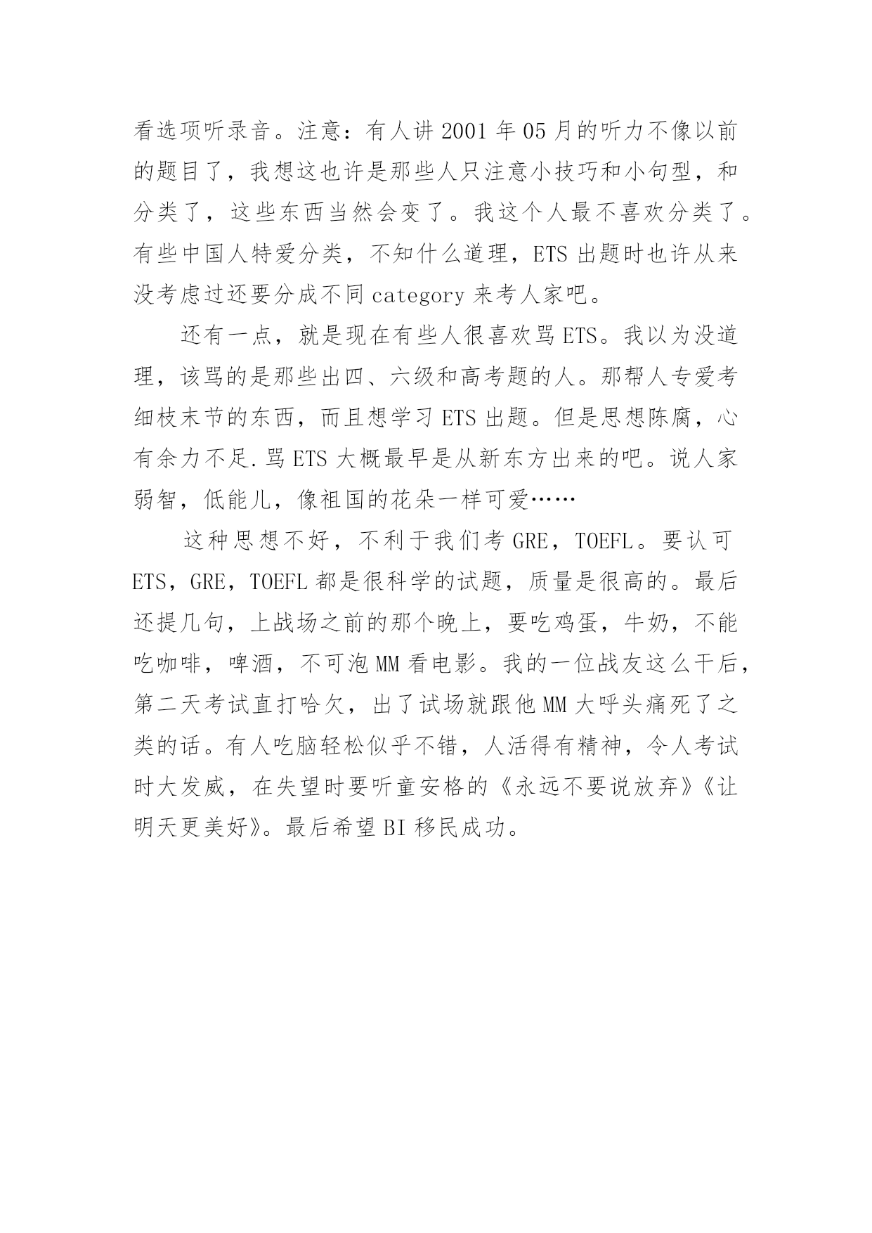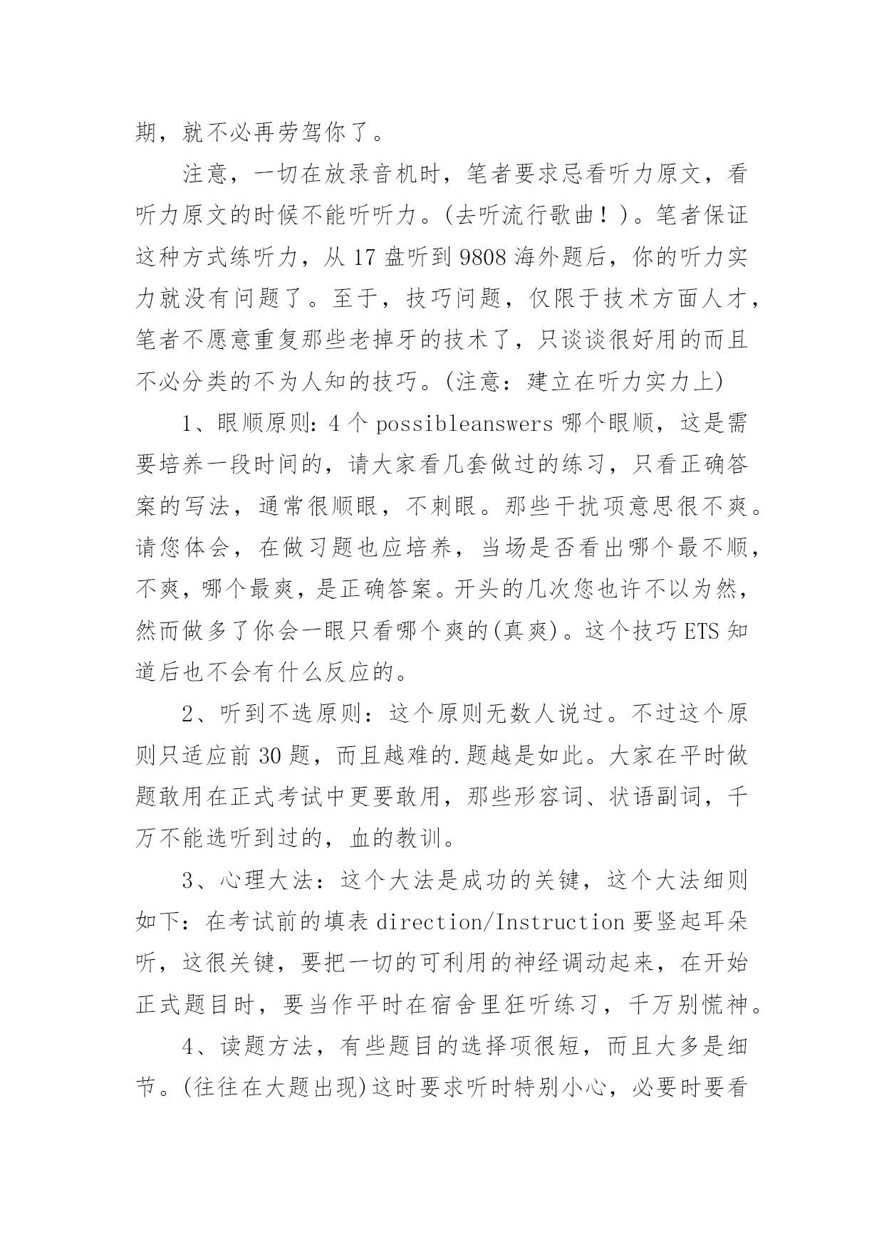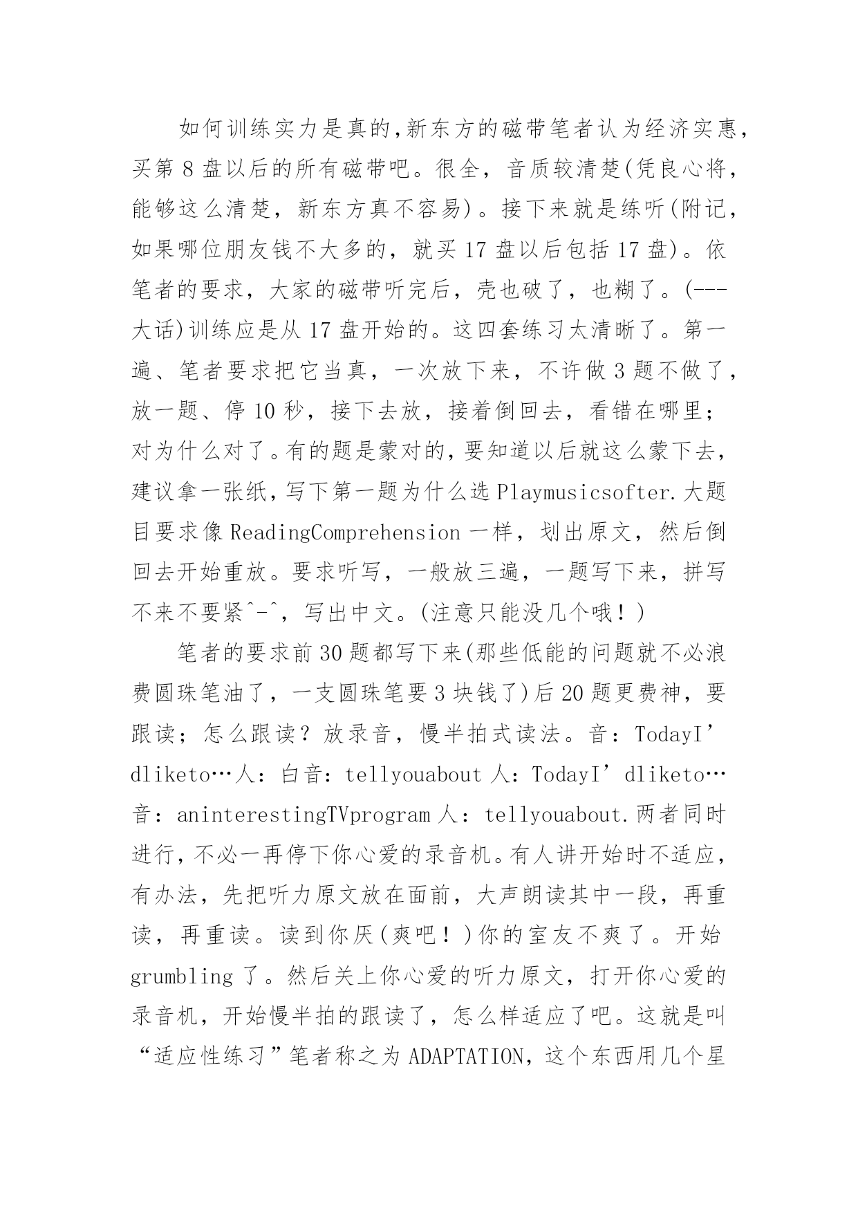 托福听力考试得高分的方法 托福听力考试得高分的方法无论是过去、现在,亦或是将来,考托福中比较难的始终是听力。听力难使那些GRE考过2300的人都头痛,为什么?因为听力本来就是人们英文考试的弱点。事实上,获取听力的高分也并非想象的那么不可能。笔者遇见过这么一个人,TOEFL90年考了580分以后,去了美国。其中结构65分、阅读63分,听力只拿了50分不到。但是他GRE考到了2150分,这个分数在当时的价值不亚于今日2300,他也认为听力很难。而最近TOEFL改成机考了,他便有兴趣参加了2000年中的一期,以鼓励他的GF,TOEFL考好。结果他听力28分,阅读28分,结构却只有25分。当然这个总分是很高的。他后来说,听力确实是凭实力的,而结构,中国人研究得太精了。这就告诉我们实力是第一位的,新东方的那一套东西,事实并不怎么样。笔者没有去过新东方,只有一本《听力的玄外之音》。这本书笔者认为是TOEFL听力大大小小的书中最好的一本。这本书好,不是好在后面的投机取巧。而是编的《词汇》那一部分。笔者认为这个词表比较实用,而且言辞生动,适合入门者,而后面的技巧笔者建议大家摒弃之。只看GTER上总结的《听力笔记》(不是那本36元的书,是只有几页的小文件)和俞敏洪写的《听力句型》(100句)。如何训练实力是真的,新东方的磁带笔者认为经济实惠,买第8盘以后的所有磁带吧。很全,音质较清楚(凭良心将,能够这么清楚,新东方真不容易)。接下来就是练听(附记,如果哪位朋友钱不大多的,就买17盘以后包括17盘)。依笔者的要求,大家的磁带听完后,壳也破了,也糊了。(---大话)训练应是从17盘开始的。这四套练习太清晰了。第一遍、笔者要求把它当真,一次放下来,不许做3题不做了,放一题、停10秒,接下去放,接着倒回去,看错在哪里;对为什么对了。有的题是蒙对的,要知道以后就这么蒙下去,建议拿一张纸,写下第一题为什么选Playmusicsofter.大题目要求像ReadingComprehension一样,划出原文,然后倒回去开始重放。要求听写,一般放三遍,一题写下来,拼写不来不要紧^-^,写出中文。(注意只能没几个哦!)笔者的要求前30题都写下来(那些低能的问题就不必浪费圆珠笔油了,一支圆珠笔要3块钱了)后20题更费神,要跟读;怎么跟读?放录音,慢半拍式读法。音:TodayI’dliketo…人:白音:tellyouabout人:TodayI’dliketo…音:aninterestingTVprogram人:tellyouabout.两者同时进行,不必一再停下你心爱的录音机。有人讲开始时不适应,有办法,先把听力原文放在面前,大声朗读其中一段,再重读,再重读。读到你厌(爽吧!)你的室友不爽了。开始grumbling了。然后关上你心爱的听力原文,打开你心爱的录音机,开始慢半拍的跟读了,怎么样适应了吧。这就是叫“适应性练习”笔者称之为ADAPTATION,这个东西用几个星期,就不必再劳驾你了。注意,一切在放录音机时,笔者要求忌看听力原文,看听力原文的时候不能听听力。(去听流行歌曲!)。笔者保证这种方式练听力,从17盘听到9808海外题后,你的听力实力就没有问题了。至于,技巧问题,仅限于技术方面人才,笔者不愿意重复那些老掉牙的技术了,只谈谈很好用的而且不必分类的不为人知的技巧。(注意:建立在听力实力上)1、眼顺原则:4个possibleanswers哪个眼顺,这是需要培养一段时间的,请大家看几套做过的练习,只看正确答案的写法,通常很顺眼,不刺眼。那些干扰项意思很不爽。请您体会,在做习题也应培养,当场是否看出哪个最不顺,不爽,哪个最爽,是正确答案。开头的几次您也许不以为然,然而做多了你会一眼只看哪个爽的(真爽)。这个技巧ETS知道后也不会有什么反应的。2、听到不选原则:这个原则无数人说过。不过这个原则只适应前30题,而且越难的.题越是如此。大家在平时做题敢用在正式考试中更要敢用,那些形容词、状语副词,千万不能选听到过的,血的教训。3、心理大法:这个大法是成功的关键,这个大法细则如下:在考试前的填表direction/Instruction要竖起耳朵听,这很关键,要把一切的可利用的神经调动起来,在开始正式题目时,要当作平时在宿舍里狂听练习,千万别慌神。4、读题方法,有些题目的选择项很短,而且大多是细节。(往往在大题出现)这时要求听时特别小心,必要时要看看选项听录音。注意:有人讲2001年05月的听力不像以前的题目了,我想这也许是那些人只注意小技巧和小句型,和分类了,这些东西当然会变了。我这个人最不喜欢分类了。有些中国人特爱分类,不知什么道理,ETS出题时也许从来没考虑过还要分成不同category来考人家吧。还有一点,就是现在有些人很喜欢骂ETS。我以为没道理,该骂的是那些