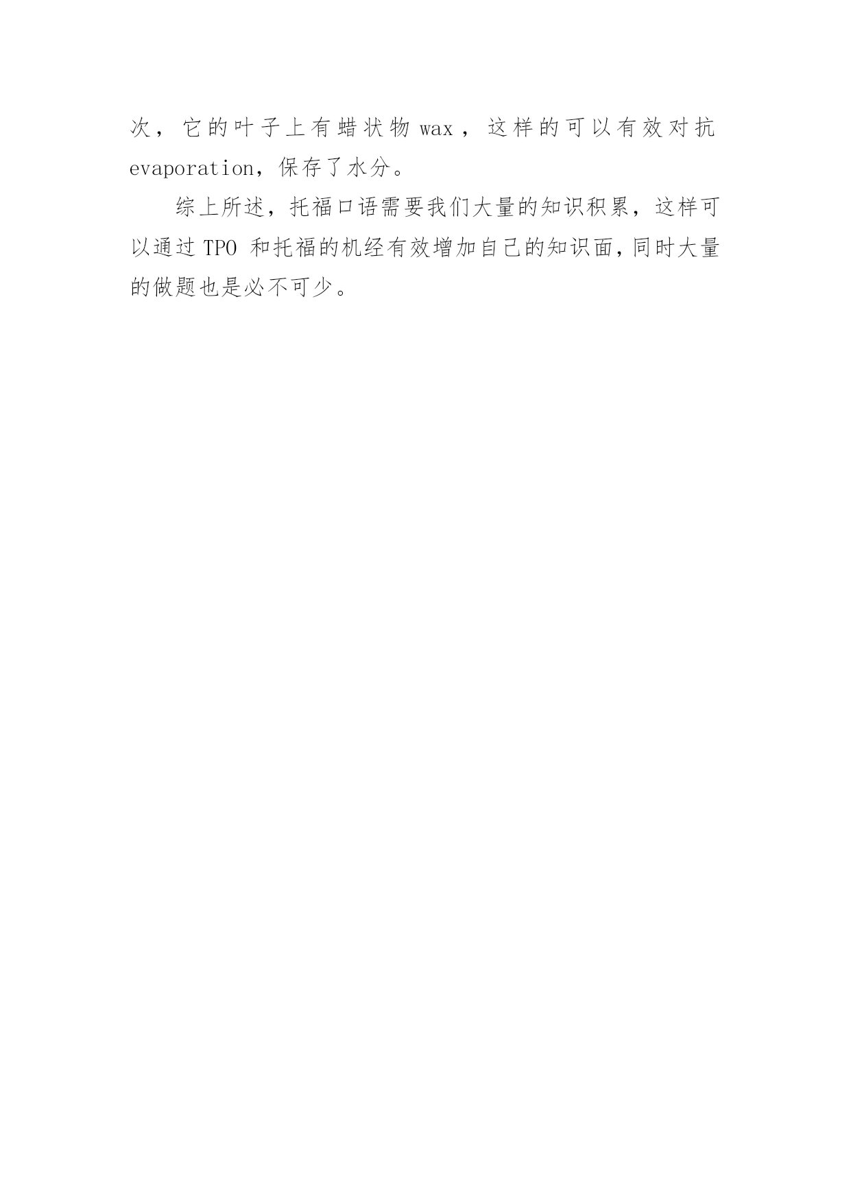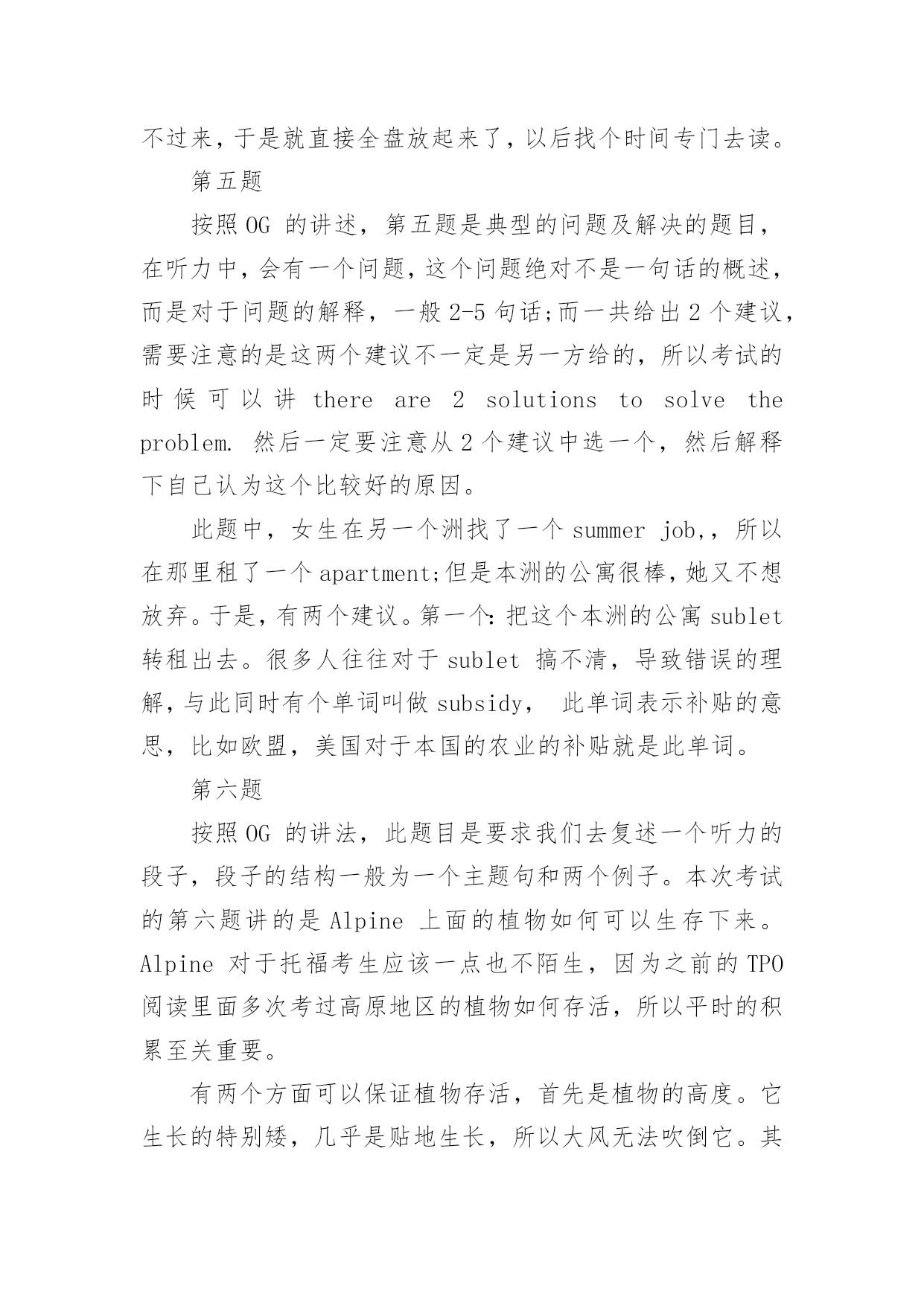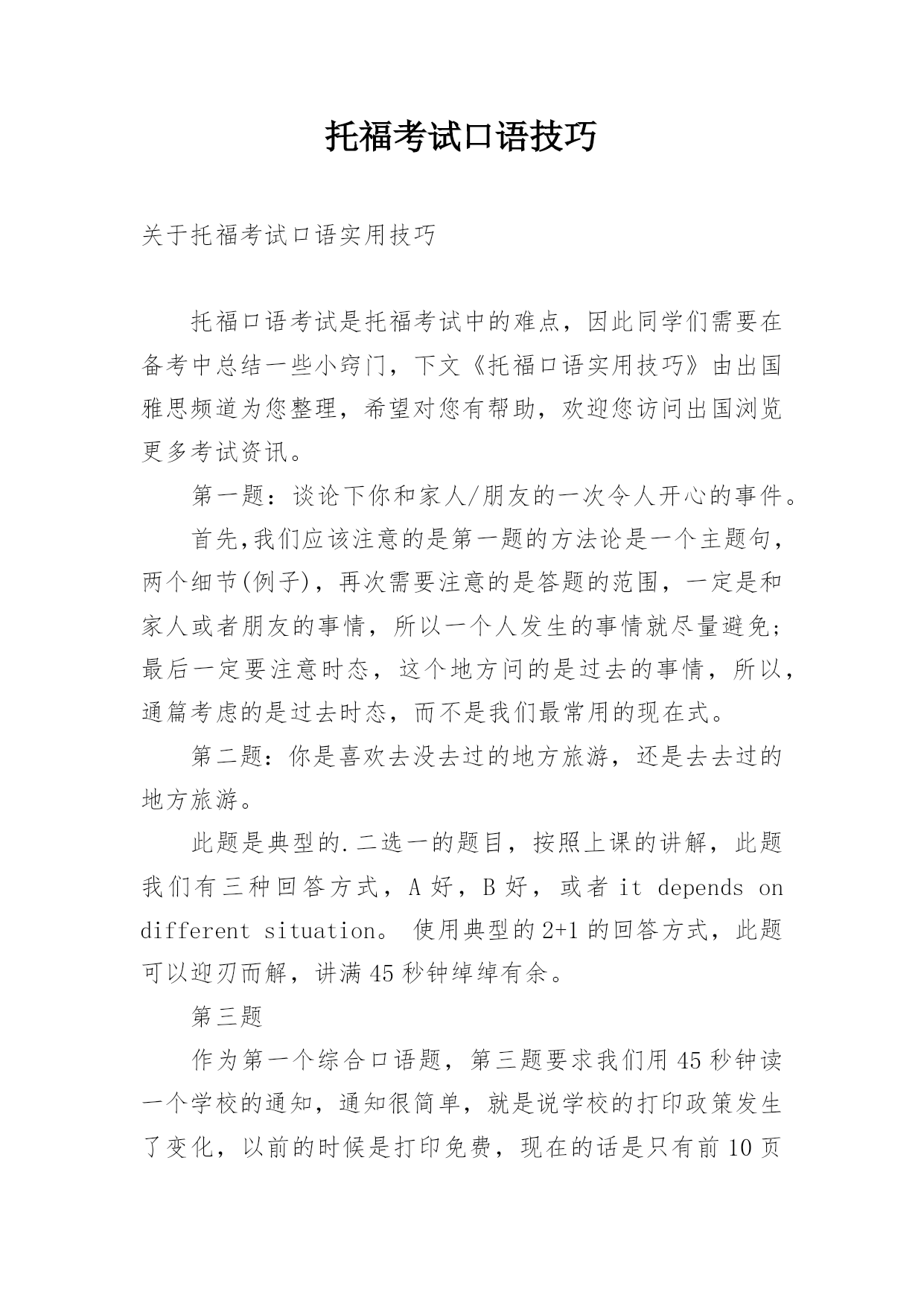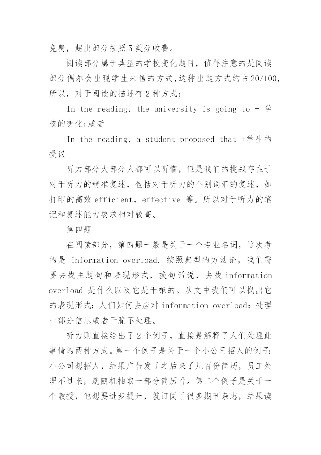 托福考试口语技巧 关于托福考试口语实用技巧托福口语考试是托福考试中的难点,因此同学们需要在备考中总结一些小窍门,下文《托福口语实用技巧》由出国雅思频道为您整理,希望对您有帮助,欢迎您访问出国浏览更多考试资讯。第一题:谈论下你和家人/朋友的一次令人开心的事件。首先,我们应该注意的是第一题的方法论是一个主题句,两个细节(例子),再次需要注意的是答题的范围,一定是和家人或者朋友的事情,所以一个人发生的事情就尽量避免;最后一定要注意时态,这个地方问的是过去的事情,所以,通篇考虑的是过去时态,而不是我们最常用的现在式。第二题:你是喜欢去没去过的地方旅游,还是去去过的地方旅游。此题是典型的.二选一的题目,按照上课的讲解,此题我们有三种回答方式,A好,B好,或者itdependsondifferentsituation。使用典型的2+1的回答方式,此题可以迎刃而解,讲满45秒钟绰绰有余。第三题作为第一个综合口语题,第三题要求我们用45秒钟读一个学校的通知,通知很简单,就是说学校的打印政策发生了变化,以前的时候是打印免费,现在的话是只有前10页免费,超出部分按照5美分收费。阅读部分属于典型的学校变化题目,值得注意的是阅读部分偶尔会出现学生来信的方式,这种出题方式约占20/100,所以,对于阅读的描述有2种方式:Inthereading,theuniversityisgoingto+学校的变化;或者Inthereading,astudentproposedthat+学生的提议听力部分大部分人都可以听懂,但是我们的挑战存在于对于听力的精准复述,包括对于听力的个别词汇的复述,如打印的高效efficient,effective等。所以对于听力的笔记和复述能力要求相对较高。第四题在阅读部分,第四题一般是关于一个专业名词,这次考的是informationoverload.按照典型的方法论,我们需要去找主题句和表现形式,换句话说,去找informationoverload是什么以及它是干嘛的。从文中我们可以找出它的表现形式:人们如何去应对informationoverload:处理一部分信息或者干脆不处理。听力则直接给出了2个例子,直接是解释了人们处理此事情的两种方式。第一个例子是关于一个小公司招人的例子:小公司想招人,结果广告发了之后来了几百份简历,员工处理不过来,就随机抽取一部分简历看。第二个例子是关于一个教授,他想要进步提升,就订阅了很多期刊杂志,结果读不过来,于是就直接全盘放起来了,以后找个时间专门去读。第五题按照OG的讲述,第五题是典型的问题及解决的题目,在听力中,会有一个问题,这个问题绝对不是一句话的概述,而是对于问题的解释,一般2-5句话;而一共给出2个建议,需要注意的是这两个建议不一定是另一方给的,所以考试的时候可以讲thereare2solutionstosolvetheproblem.然后一定要注意从2个建议中选一个,然后解释下自己认为这个比较好的原因。此题中,女生在另一个洲找了一个summerjob,,所以在那里租了一个apartment;但是本洲的公寓很棒,她又不想放弃。于是,有两个建议。第一个:把这个本洲的公寓sublet转租出去。很多人往往对于sublet搞不清,导致错误的理解,与此同时有个单词叫做subsidy,此单词表示补贴的意思,比如欧盟,美国对于本国的农业的补贴就是此单词。第六题按照OG的讲法,此题目是要求我们去复述一个听力的段子,段子的结构一般为一个主题句和两个例子。本次考试的第六题讲的是Alpine上面的植物如何可以生存下来。Alpine对于托福考生应该一点也不陌生,因为之前的TPO阅读里面多次考过高原地区的植物如何存活,所以平时的积累至关重要。有两个方面可以保证植物存活,首先是植物的高度。它生长的特别矮,几乎是贴地生长,所以大风无法吹倒它。其次,它的叶子上有蜡状物wax,这样的可以有效对抗evaporation,保存了水分。综上所述,托福口语需要我们大量的知识积累,这样可以通过TPO和托福的机经有效增加自己的知识面,同时大量的做题也是必不可少。
