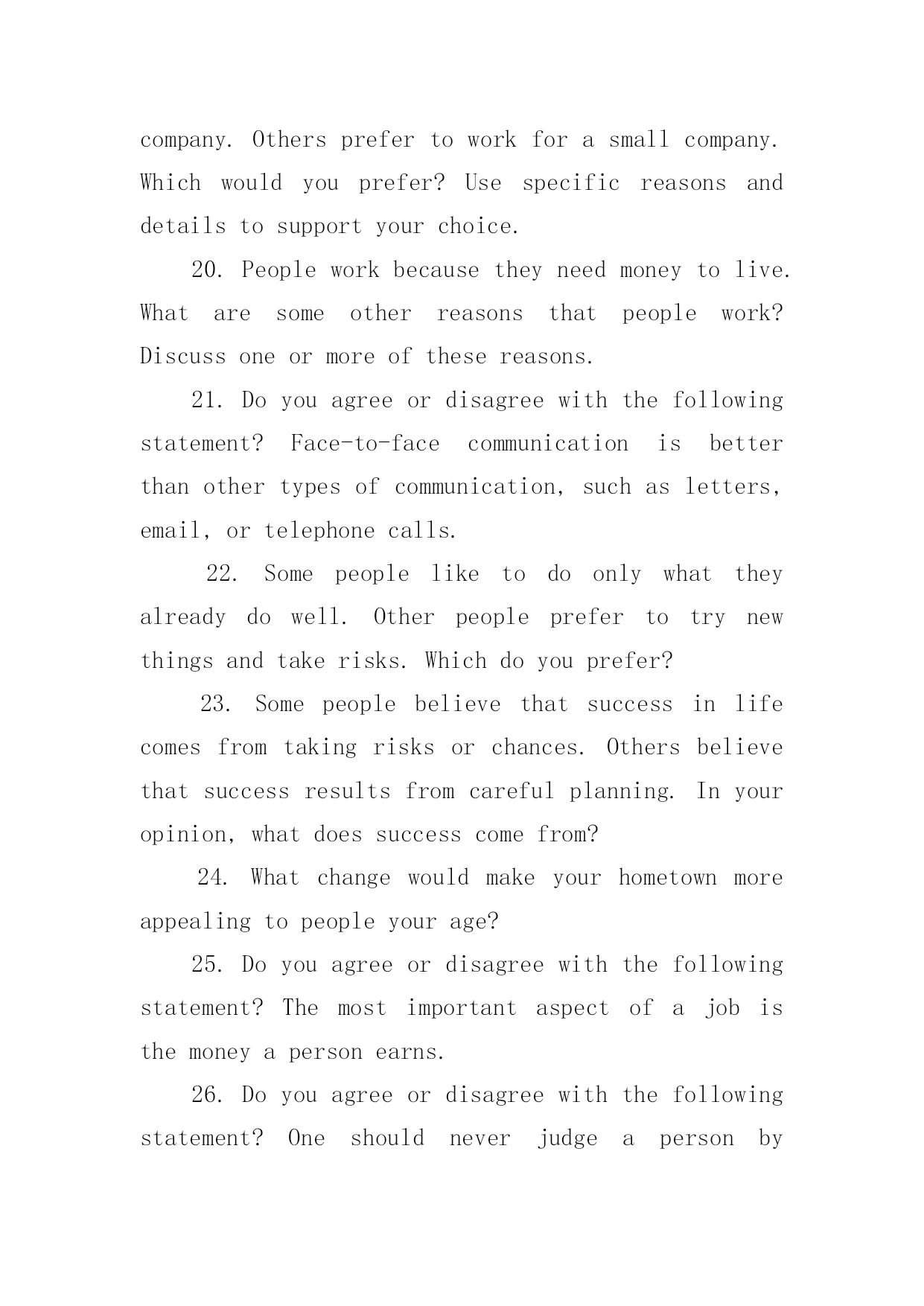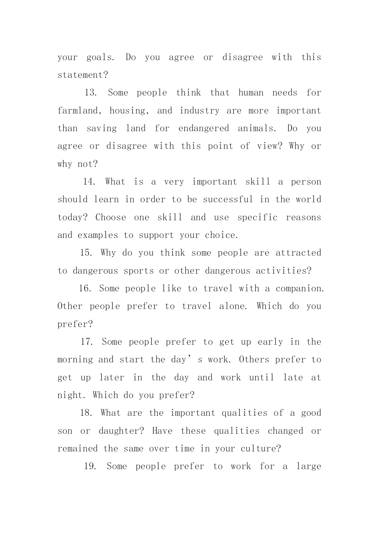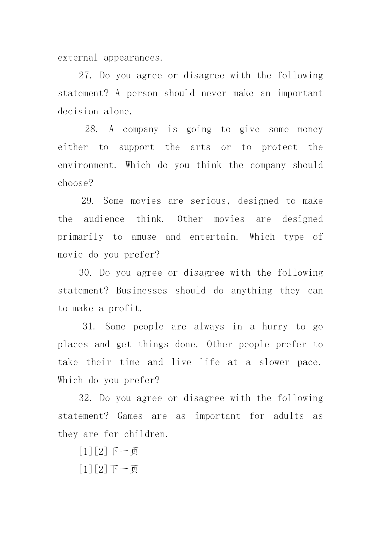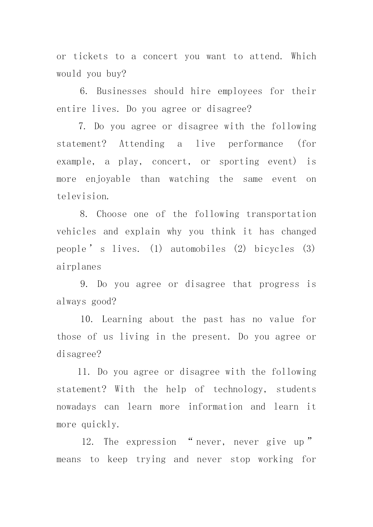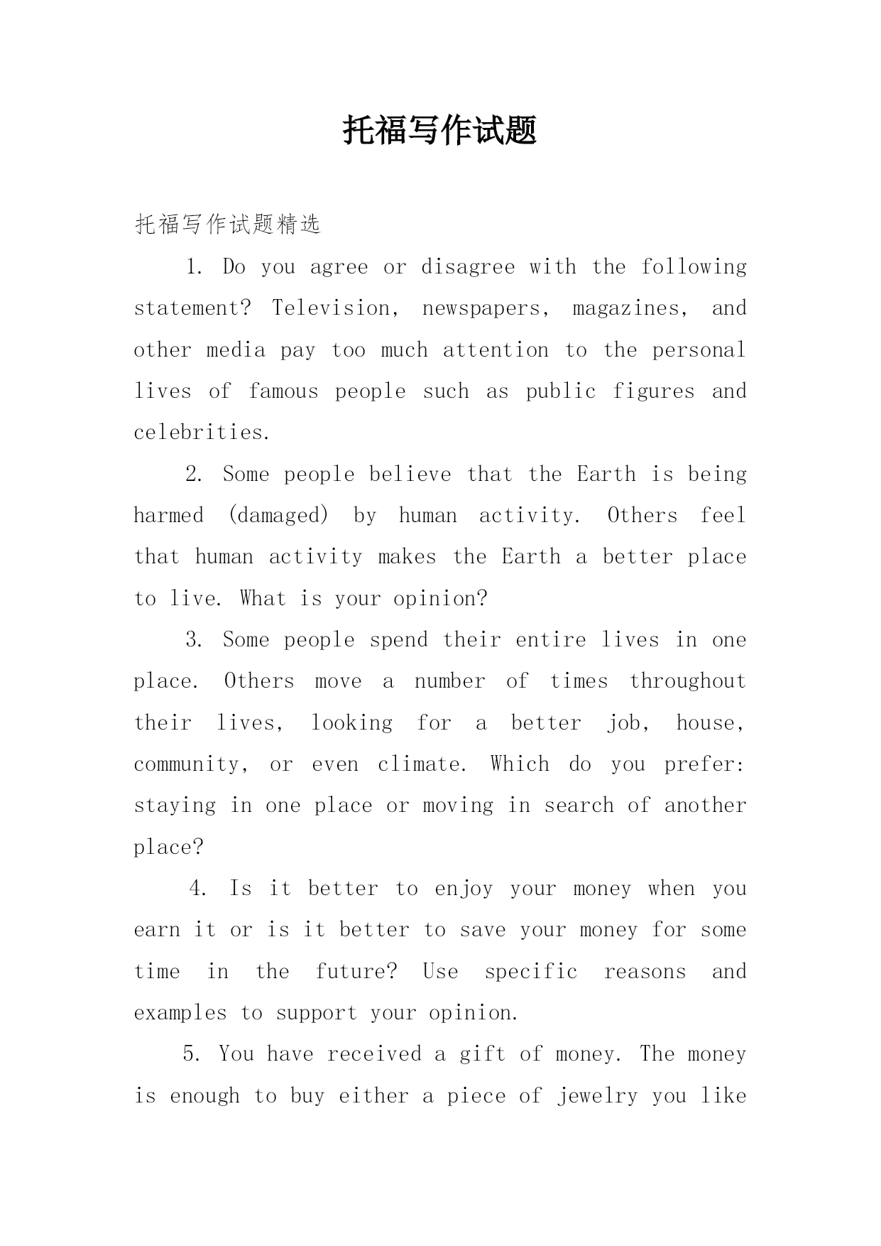 托福写作试题 托福写作试题精选1.Doyouagreeordisagreewiththefollowingstatement?Television,newspapers,magazines,andothermediapaytoomuchattentiontothepersonallivesoffamouspeoplesuchaspublicfiguresandcelebrities.2.SomepeoplebelievethattheEarthisbeingharmed(damaged)byhumanactivity.OthersfeelthathumanactivitymakestheEarthabetterplacetolive.Whatisyouropinion?3.Somepeoplespendtheirentirelivesinoneplace.Othersmoveanumberoftimesthroughouttheirlives,lookingforabetterjob,house,community,orevenclimate.Whichdoyouprefer:stayinginoneplaceormovinginsearchofanotherplace?4.Isitbettertoenjoyyourmoneywhenyouearnitorisitbettertosaveyourmoneyforsometimeinthefuture?Usespecificreasonsandexamplestosupportyouropinion.5.Youhavereceivedagiftofmoney.Themoneyisenoughtobuyeitherapieceofjewelryyoulikeorticketstoaconcertyouwanttoattend.Whichwouldyoubuy?6.Businessesshouldhireemployeesfortheirentirelives.Doyouagreeordisagree?7.Doyouagreeordisagreewiththefollowingstatement?Attendingaliveperformance(forexample,aplay,concert,orsportingevent)ismoreenjoyablethanwatchingthesameeventontelevision.8.Chooseoneofthefollowingtransportationvehiclesandexplainwhyyouthinkithaschangedpeople’slives.(1)automobiles(2)bicycles(3)airplanes9.Doyouagreeordisagreethatprogressisalwaysgood?10.Learningaboutthepasthasnovalueforthoseofuslivinginthepresent.Doyouagreeordisagree?11.Doyouagreeordisagreewiththefollowingstatement?Withthehelpoftechnology,studentsnowadayscanlearnmoreinformationandlearnitmorequickly.12.Theexpression“never,nevergiveup”meanstokeeptryingandneverstopworkingforyourgoals.Doyouagreeordisagreewiththisstatement?13.Somepeoplethinkthathumanneedsforfarmland,housing,andindustryaremoreimportantthansavinglandforendangeredanimals.Doyouagreeordisagreewiththispointofview?Whyorwhynot?14.Whatisaveryimportantskillapersonshouldlearninordertobesuccessfulintheworldtoday?Chooseoneskillandusespecificreasonsandexamplestosupportyourchoice.15.Whydoyouthinksomepeopleareattractedtodangeroussportsorotherdangerousactivities?16.Somepeopleliketotravelwit