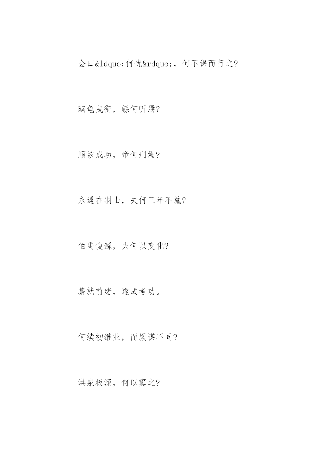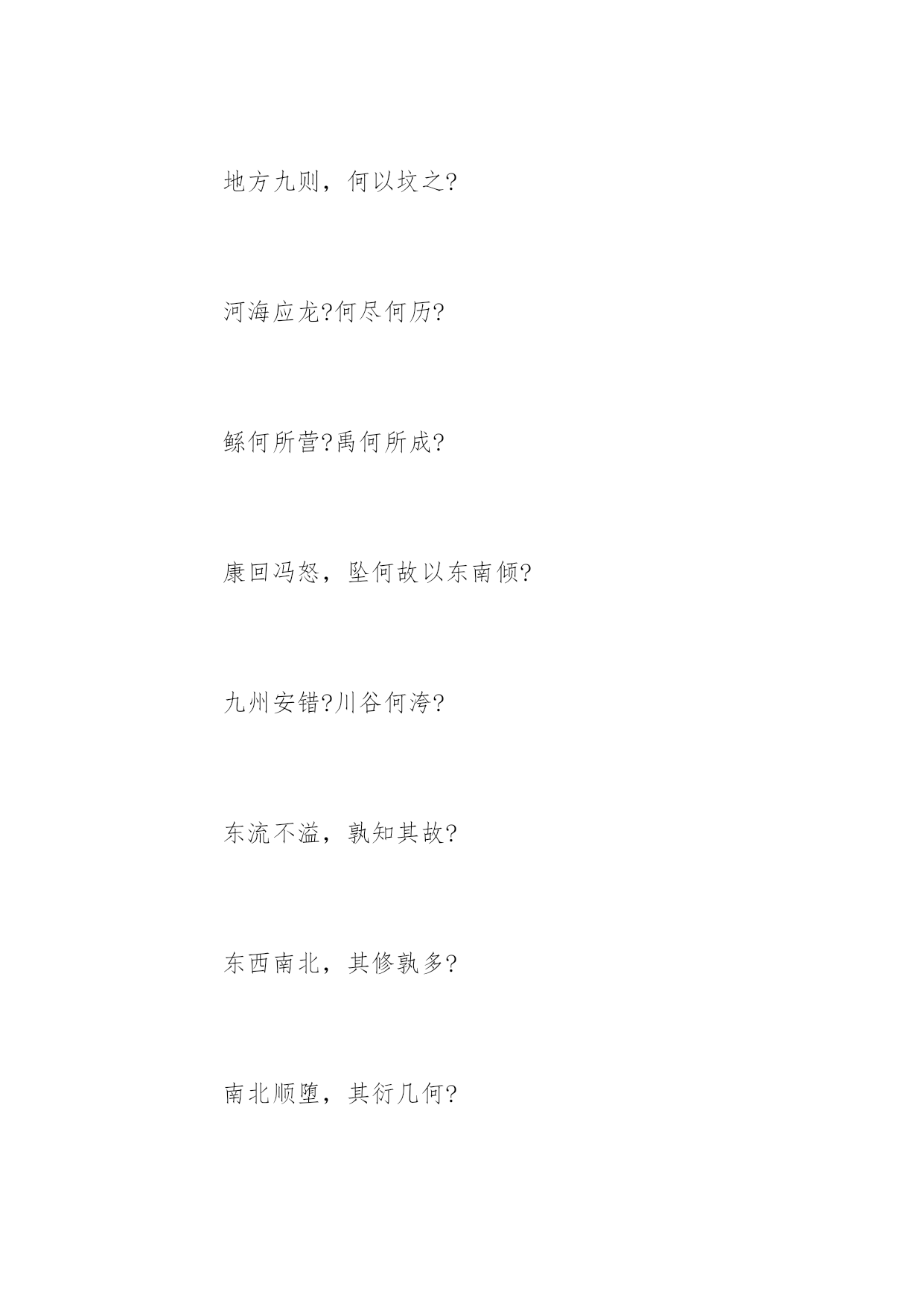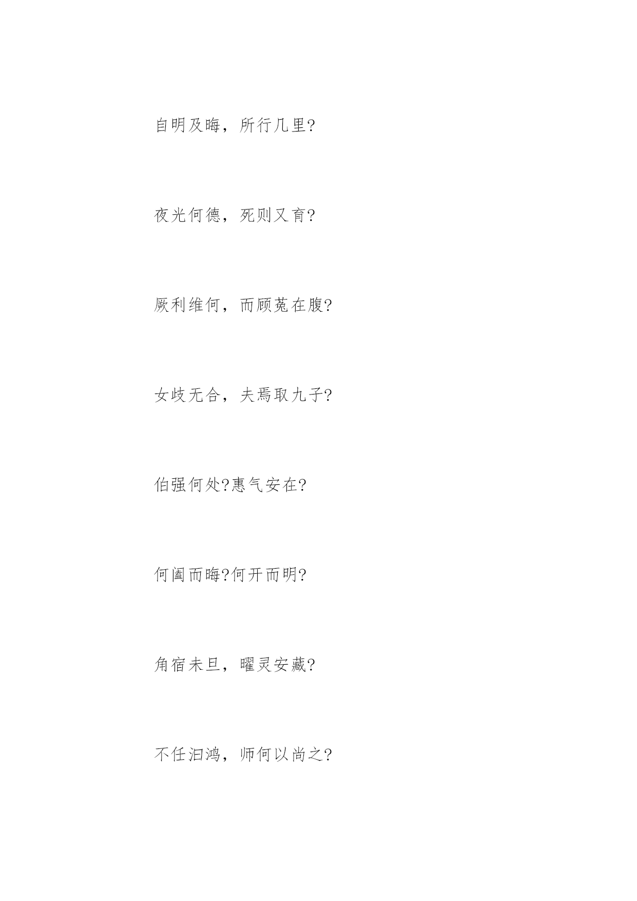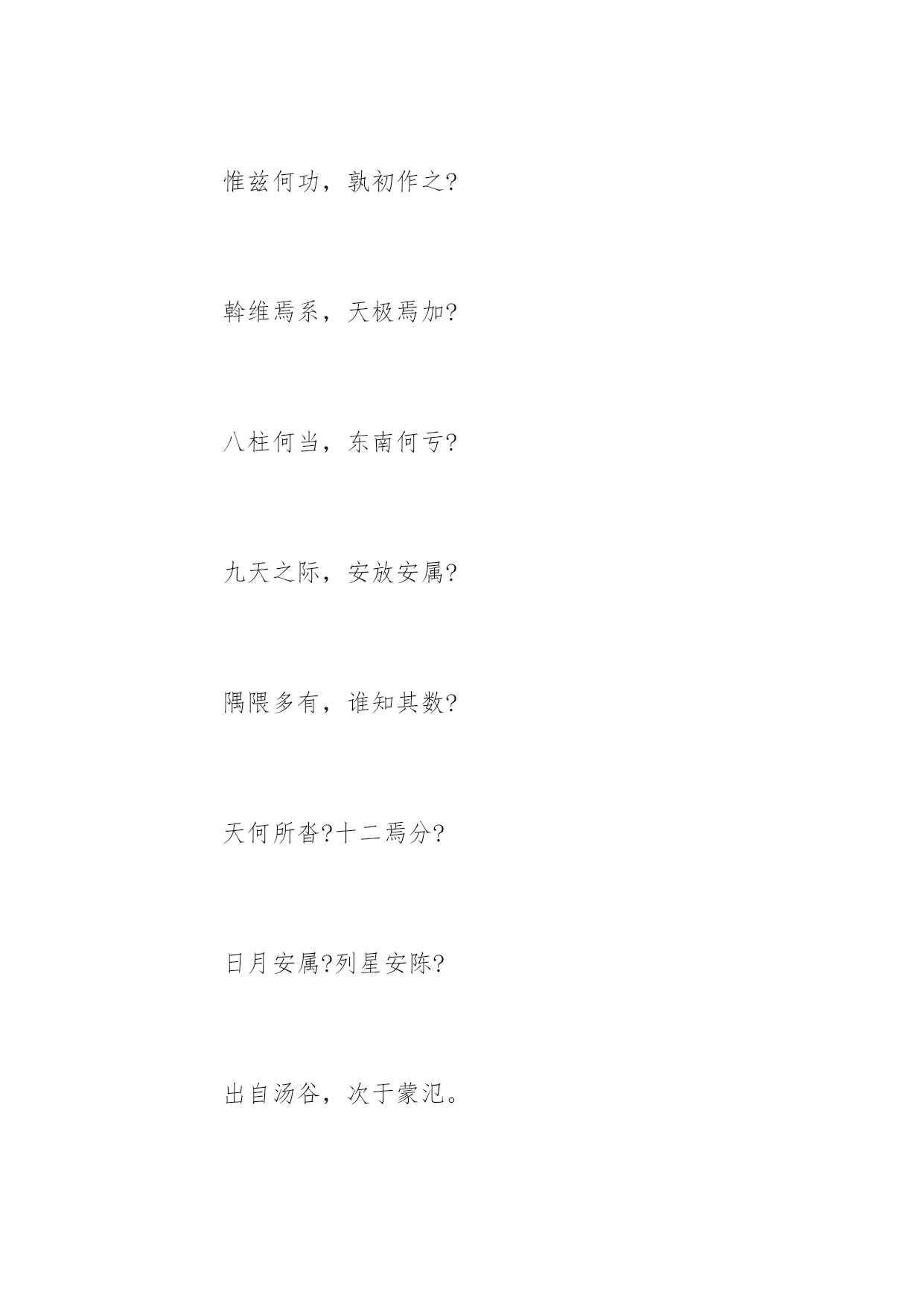 天问 天问 曰遂古之初,谁传道之? 上下未形,何由考之? 冥昭瞢闇,谁能极之? 冯翼惟像,何以识之? 明明闇闇,惟时何为? 阴阳三合,何本何化? 圜则九重,孰营度之? 惟兹何功,孰初作之? 斡维焉系,天极焉加? 八柱何当,东南何亏? 九天之际,安放安属? 隅隈多有,谁知其数? 天何所沓?十二焉分? 日月安属?列星安陈? 出自汤谷,次于蒙氾。 自明及晦,所行几里? 夜光何德,死则又育? 厥利维何,而顾菟在腹? 女歧无合,夫焉取九子? 伯强何处?惠气安在? 何阖而晦?何开而明? 角宿未旦,曜灵安藏? 不任汩鸿,师何以尚之? 佥曰“何忧”,何不课而行之? 鸱龟曳衔,鲧何听焉? 顺欲成功,帝何刑焉? 永遏在羽山,夫何三年不施? 伯禹愎鲧,夫何以变化? 纂就前绪,遂成考功。 何续初继业,而厥谋不同? 洪泉极深,何以窴之? 地方九则,何以坟之? 河海应龙?何尽何历? 鲧何所营?禹何所成? 康回冯怒,坠何故以东南倾? 九州安错?川谷何洿? 东流不溢,孰知其故? 东西南北,其修孰多? 南北顺堕,其衍几何? 昆仑县圃,其尻安在? 增城九重,其高几里? 四方之门,其谁从焉? 西北辟启,何气通焉? 日安不到?烛龙何照? 羲和之未扬,若华何光? 何所冬暖?何所夏寒? 焉有石林?何兽能言? 焉有虬龙、负熊以游? 雄虺九首,鯈忽焉在? 何所不死?长人何守? 靡蓱九衢,枲华安居? 灵蛇吞象,厥大何如? 黑水、玄趾,三危安在? 延年不死,寿何所止? 鲮鱼何所?鬿堆焉处? 羿焉彃日?乌焉解羽? 禹之力献功,降省下土四方。 焉得彼嵞山女,而通之於台桑? 闵妃匹合,厥身是继。 胡为嗜不同味,而快朝饱? 启代益作后,卒然离蠥。 何启惟忧,而能拘是达? 皆归射鞠,而无害厥躬。 何后益作革,而禹播降? 启棘宾商,《九辨》、《九歌》。