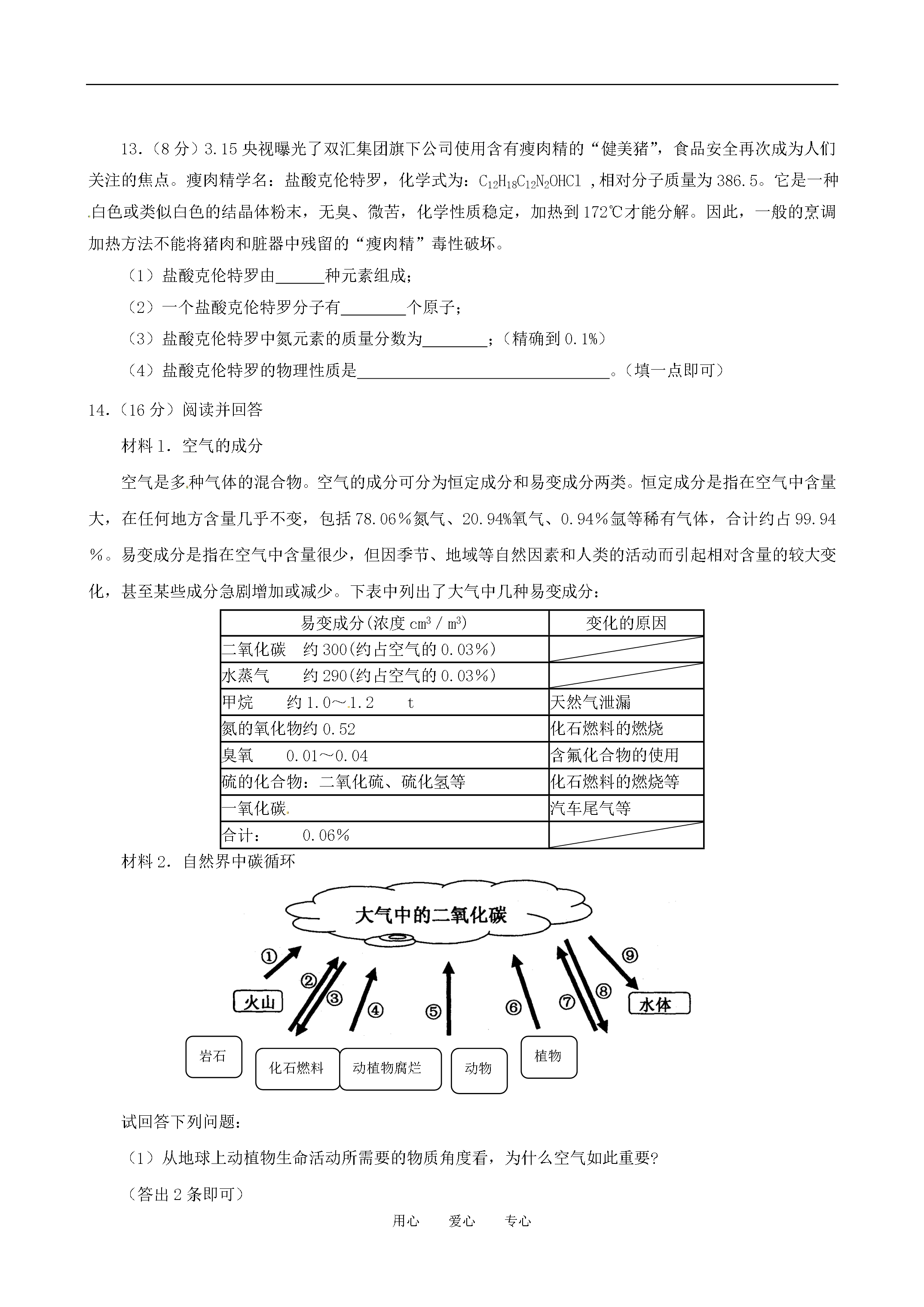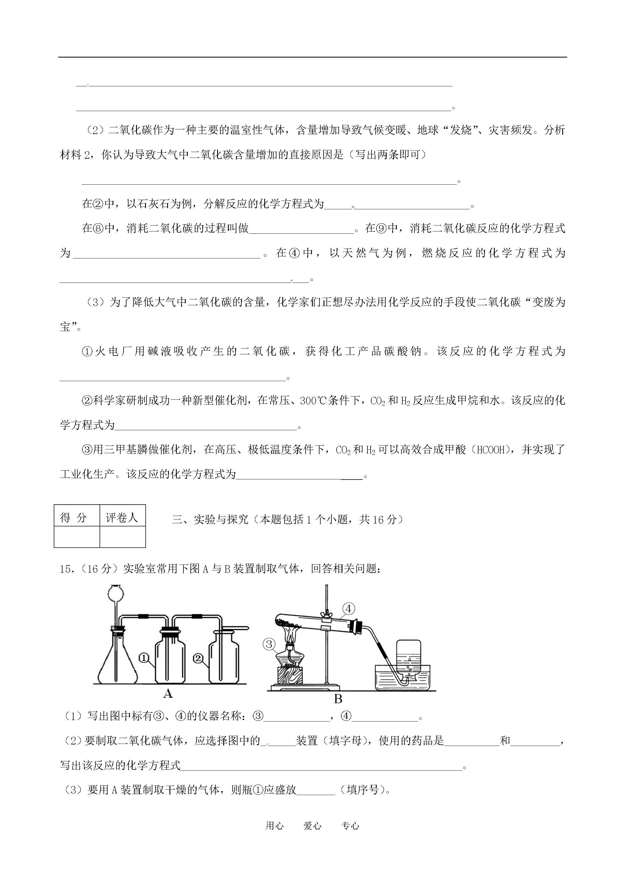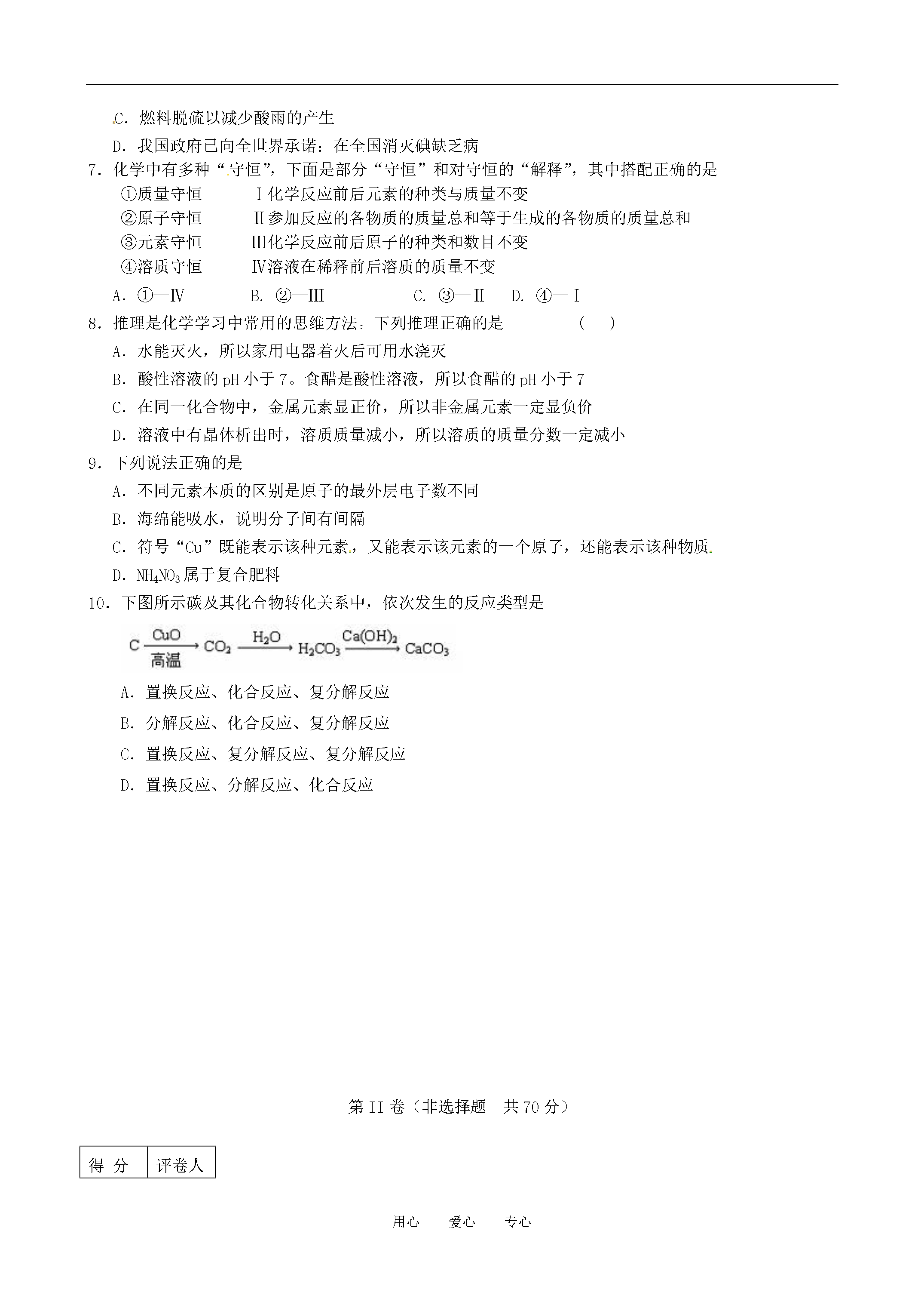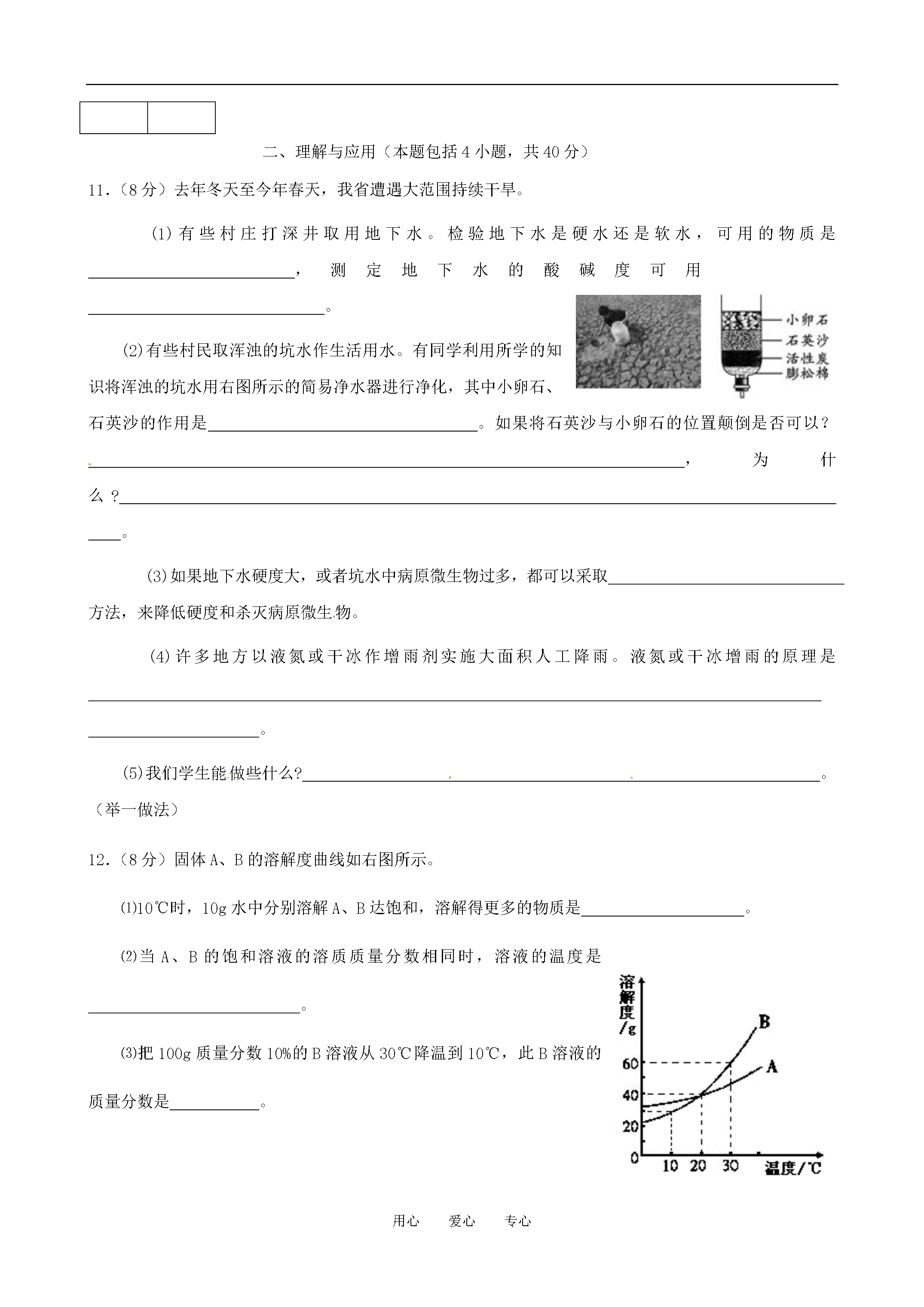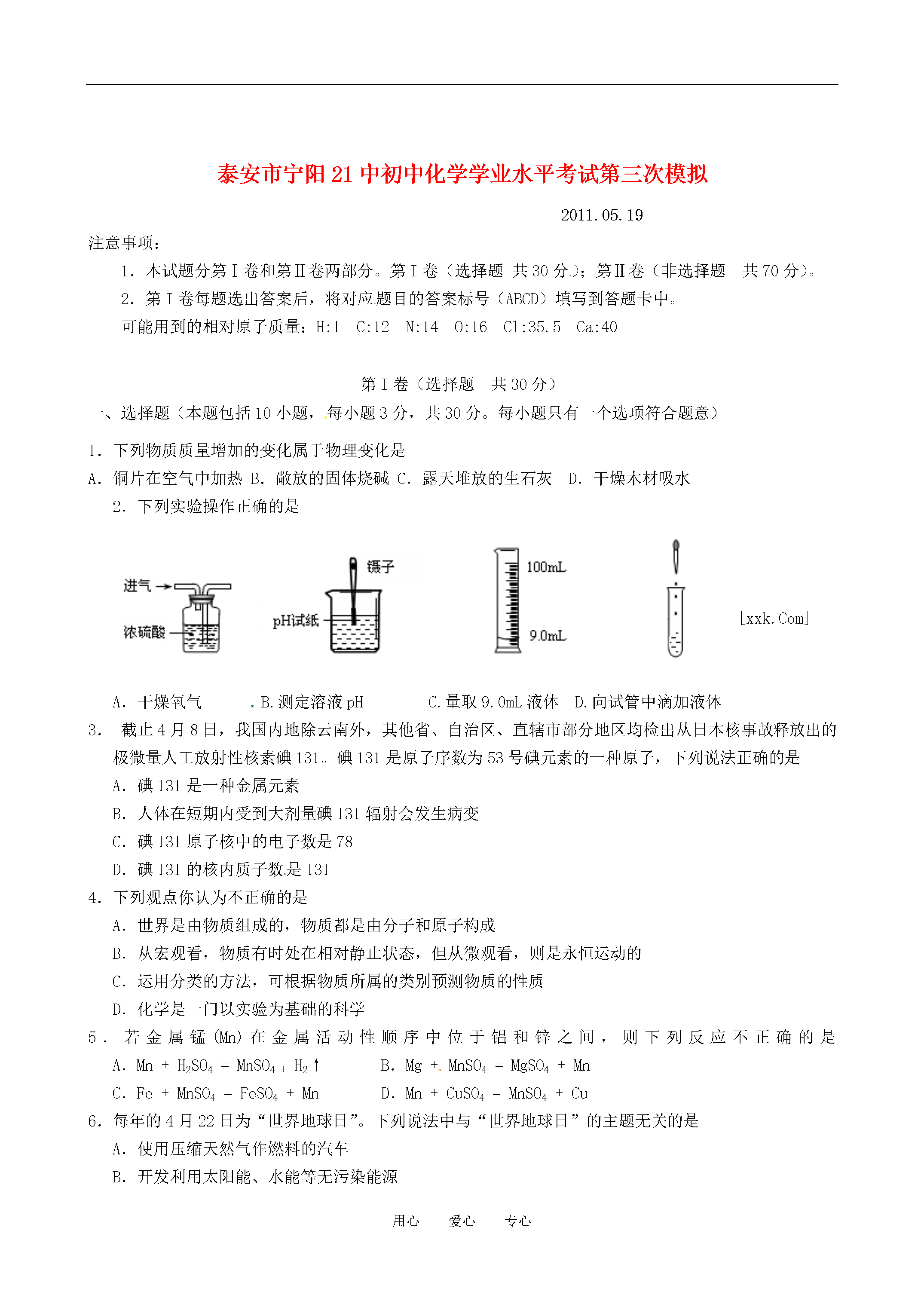 用心爱心专心泰安市宁阳21中初中化学学业水平考试第三次模拟2011.05.19注意事项:1.本试题分第Ⅰ卷和第Ⅱ卷两部分。第I卷(选择题共30分);第Ⅱ卷(非选择题共70分)。2.第I卷每题选出答案后,将对应题目的答案标号(ABCD)填写到答题卡中。可能用到的相对原子质量:H:1C:12N:14O:16Cl:35.5Ca:40第I卷(选择题共30分)一、选择题(本题包括10小题,每小题3分,共30分。每小题只有一个选项符合题意)1.下列物质质量增加的变化属于物理变化是A.铜片在空气中加热B.敞放的固体烧碱C.露天堆放的生石灰D.干燥木材吸水2.下列实验操作正确的是[xxk.Com]A.干燥氧气B.测定溶液pHC.量取9.0mL液体D.向试管中滴加液体3.截止4月8日,我国内地除云南外,其他省、自治区、直辖市部分地区均检出从日本核事故释放出的极微量人工放射性核素碘131。碘131是原子序数为53号碘元素的一种原子,下列说法正确的是A.碘131是一种金属元素B.人体在短期内受到大剂量碘131辐射会发生病变C.碘131原子核中的电子数是78D.碘131的核内质子数是1314.下列观点你认为不正确的是A.世界是由物质组成的,物质都是由分子和原子构成B.从宏观看,物质有时处在相对静止状态,但从微观看,则是永恒运动的C.运用分类的方法,可根据物质所属的类别预测物质的性质D.化学是一门以实验为基础的科学5.若金属锰(Mn)在金属活动性顺序中位于铝和锌之间,则下列反应不正确的是A.Mn+H2SO4=MnSO4+H2↑B.Mg+MnSO4=MgSO4+MnC.Fe+MnSO4=FeSO4+MnD.Mn+CuSO4=MnSO4+Cu6.每年的4月22日为“世界地球日”。下列说法中与“世界地球日”的主题无关的是A.使用压缩天然气作燃料的汽车B.开发利用太阳能、水能等无污染能源C.燃料脱硫以减少酸雨的产生D.我国政府已向全世界承诺:在全国消灭碘缺乏病7.化学中有多种“守恒”,下面是部分“守恒”和对守恒的“解释”,其中搭配正确的是①质量守恒Ⅰ化学反应前后元素的种类与质量不变②原子守恒Ⅱ参加反应的各物质的质量总和等于生成的各物质的质量总和③元素守恒Ⅲ化学反应前后原子的种类和数目不变④溶质守恒Ⅳ溶液在稀释前后溶质的质量不变A.①—ⅣB.②—ⅢC.③—ⅡD.④—Ⅰ8.推理是化学学习中常用的思维方法。下列推理正确的是()A.水能灭火,所以家用电器着火后可用水浇灭B.酸性溶液的pH小于7。食醋是酸性溶液,所以食醋的pH小于7C.在同一化合物中,金属元素显正价,所以非金属元素一定显负价D.溶液中有晶体析出时,溶质质量减小,所以溶质的质量分数一定减小9.下列说法正确的是A.不同元素本质的区别是原子的最外层电子数不同B.海绵能吸水,说明分子间有间隔C.符号“Cu”既能表示该种元素,又能表示该元素的一个原子,还能表示该种物质D.NH4NO3属于复合肥料10.下图所示碳及其化合物转化关系中,依次发生的反应类型是A.置换反应、化合反应、复分解反应B.分解反应、化合反应、复分解反应C.置换反应、复分解反应、复分解反应D.置换反应、分解反应、化合反应第II卷(非选择题共70分)得分评卷人二、理解与应用(本题包括4小题,共40分)11.(8分)去年冬天至今年春天,我省遭遇大范围持续干旱。(1)有些村庄打深井取用地下水。检验地下水是硬水还是软水,可用的物质是,测定地下水的酸碱度可用。(2)有些村民取浑浊的坑水作生活用水。有同学利用所学的知识将浑浊的坑水用右图所示的简易净水器进行净化,其中小卵石、石英沙的作用是。如果将石英沙与小卵石的位置颠倒是否可以?,为什么?。(3)如果地下水硬度大,或者坑水中病原微生物过多,都可以采取方法,来降低硬度和杀灭病原微生物。(4)许多地方以液氮或干冰作增雨剂实施大面积人工降雨。液氮或干冰增雨的原理是。(5)我们学生能做些什么?。(举一做法)12.(8分)固体A、B的溶解度曲线如右图所示。⑴10℃时,10g水中分别溶解A、B达饱和,溶解得更多的物质是。⑵当A、B的饱和溶液的溶质质量分数相同时,溶液的温度是。⑶把100g质量分数10%的B溶液从30℃降温到10℃,此B溶液的质量分数是。13.(8分)3.15央视曝光了双汇集团旗下公司使用含有瘦肉精的“健美猪”,食品安全再次成为人们关注的焦点。瘦肉精学名:盐酸克伦特罗,化学式为:C12H18Cl2N2OHCl,相对分子质量为386.5。它是一种白色或类似白色的结晶体粉末,无臭、微苦,化学性质稳定,加热到172℃才能分解。因此,一般的烹调加热方法不能将猪肉和脏器中残留的“瘦肉精”毒性破坏。(1)盐酸克伦特罗由种元素组成;(2)一个盐酸克伦特罗分子有个原子;(3)盐酸克伦特罗中氮元素的质量分数为;(精确到0.1%