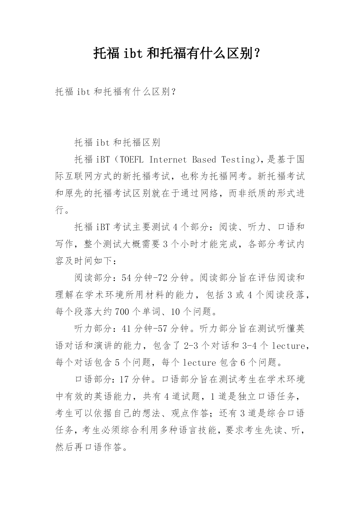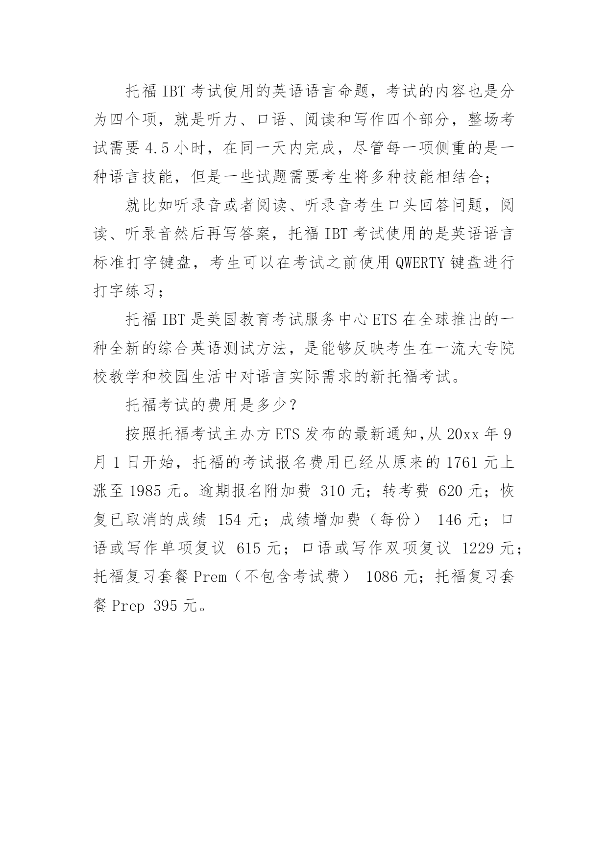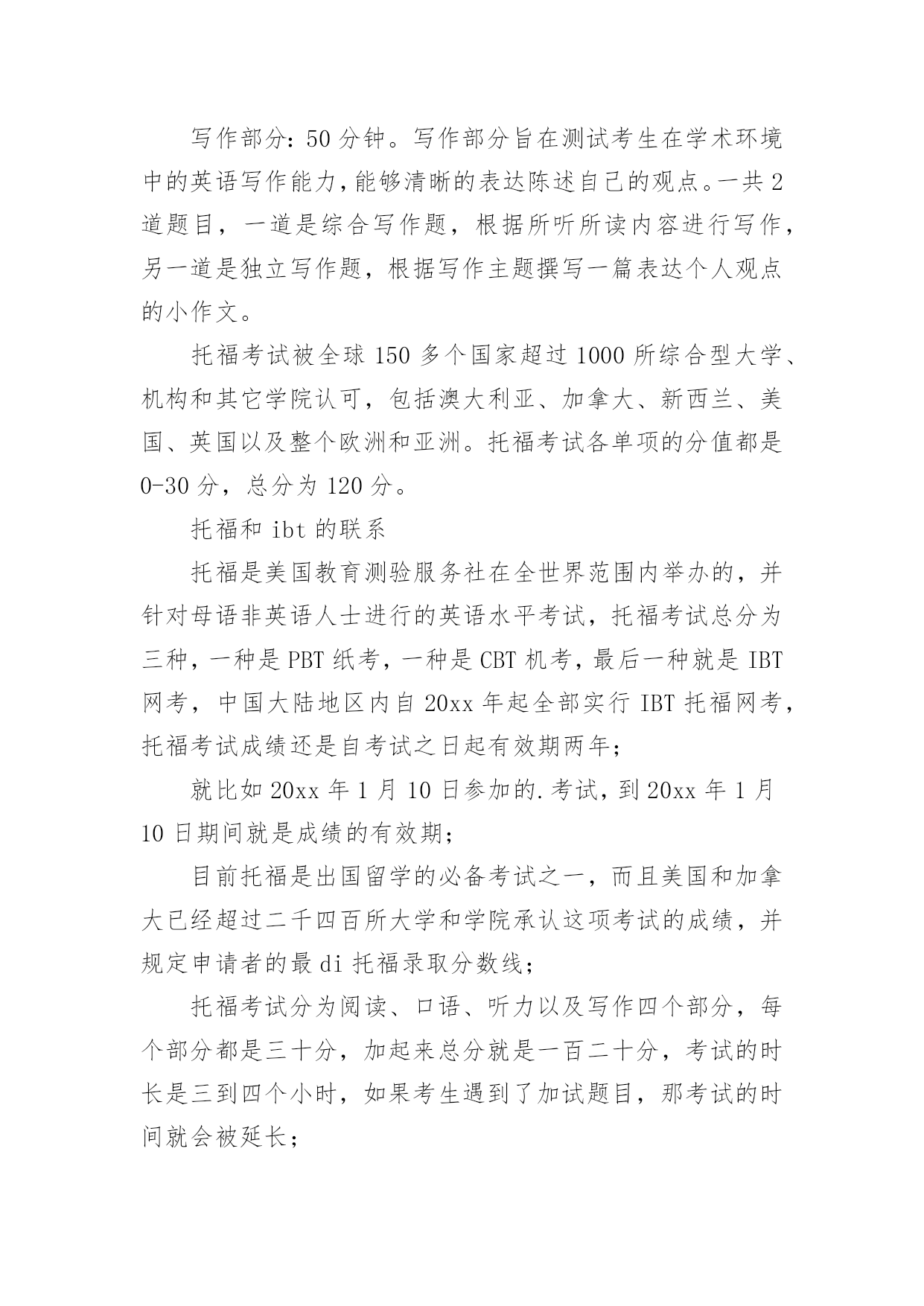 托福ibt和托福有什么区别? 托福ibt和托福有什么区别?托福ibt和托福区别托福iBT(TOEFLInternetBasedTesting),是基于国际互联网方式的新托福考试,也称为托福网考。新托福考试和原先的托福考试区别就在于通过网络,而非纸质的形式进行。托福iBT考试主要测试4个部分:阅读、听力、口语和写作,整个测试大概需要3个小时才能完成,各部分考试内容及时间如下:阅读部分:54分钟-72分钟。阅读部分旨在评估阅读和理解在学术环境所用材料的能力,包括3或4个阅读段落,每个段落大约700个单词、10个问题。听力部分:41分钟-57分钟。听力部分旨在测试听懂英语对话和演讲的能力,包含了2-3个对话和3-4个lecture,每个对话包含5个问题,每个lecture包含6个问题。口语部分:17分钟。口语部分旨在测试考生在学术环境中有效的英语能力,共有4道试题,1道是独立口语任务,考生可以依据自己的想法、观点作答;还有3道是综合口语任务,考生必须综合利用多种语言技能,要求考生先读、听,然后再口语作答。写作部分:50分钟。写作部分旨在测试考生在学术环境中的英语写作能力,能够清晰的表达陈述自己的观点。一共2道题目,一道是综合写作题,根据所听所读内容进行写作,另一道是独立写作题,根据写作主题撰写一篇表达个人观点的小作文。托福考试被全球150多个国家超过1000所综合型大学、机构和其它学院认可,包括澳大利亚、加拿大、新西兰、美国、英国以及整个欧洲和亚洲。托福考试各单项的分值都是0-30分,总分为120分。托福和ibt的联系托福是美国教育测验服务社在全世界范围内举办的,并针对母语非英语人士进行的英语水平考试,托福考试总分为三种,一种是PBT纸考,一种是CBT机考,最后一种就是IBT网考,中国大陆地区内自20xx年起全部实行IBT托福网考,托福考试成绩还是自考试之日起有效期两年;就比如20xx年1月10日参加的.考试,到20xx年1月10日期间就是成绩的有效期;目前托福是出国留学的必备考试之一,而且美国和加拿大已经超过二千四百所大学和学院承认这项考试的成绩,并规定申请者的最di托福录取分数线;托福考试分为阅读、口语、听力以及写作四个部分,每个部分都是三十分,加起来总分就是一百二十分,考试的时长是三到四个小时,如果考生遇到了加试题目,那考试的时间就会被延长;托福IBT考试使用的英语语言命题,考试的内容也是分为四个项,就是听力、口语、阅读和写作四个部分,整场考试需要4.5小时,在同一天内完成,尽管每一项侧重的是一种语言技能,但是一些试题需要考生将多种技能相结合;就比如听录音或者阅读、听录音考生口头回答问题,阅读、听录音然后再写答案,托福IBT考试使用的是英语语言标准打字键盘,考生可以在考试之前使用QWERTY键盘进行打字练习;托福IBT是美国教育考试服务中心ETS在全球推出的一种全新的综合英语测试方法,是能够反映考生在一流大专院校教学和校园生活中对语言实际需求的新托福考试。托福考试的费用是多少?按照托福考试主办方ETS发布的最新通知,从20xx年9月1日开始,托福的考试报名费用已经从原来的1761元上涨至1985元。逾期报名附加费310元;转考费620元;恢复已取消的成绩154元;成绩增加费(每份)146元;口语或写作单项复议615元;口语或写作双项复议1229元;托福复习套餐Prem(不包含考试费)1086元;托福复习套餐Prep395元。
