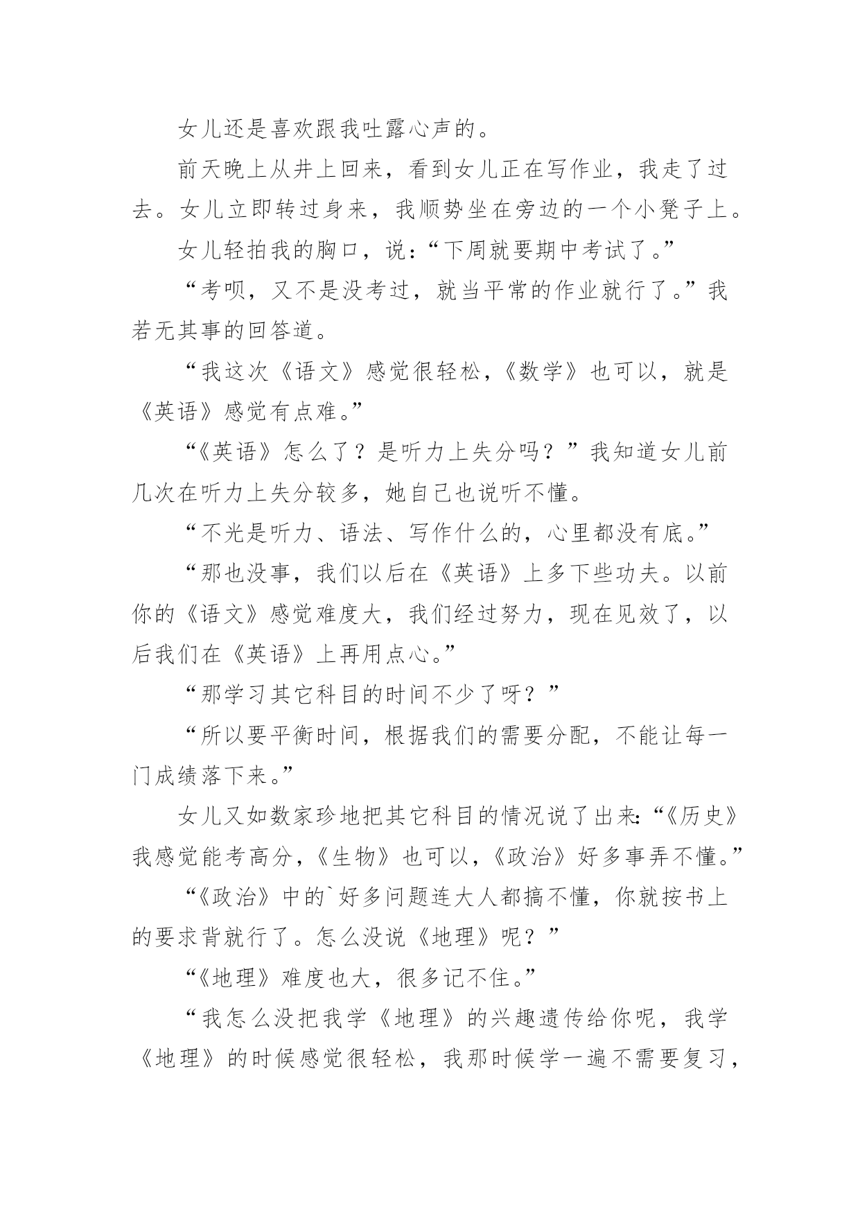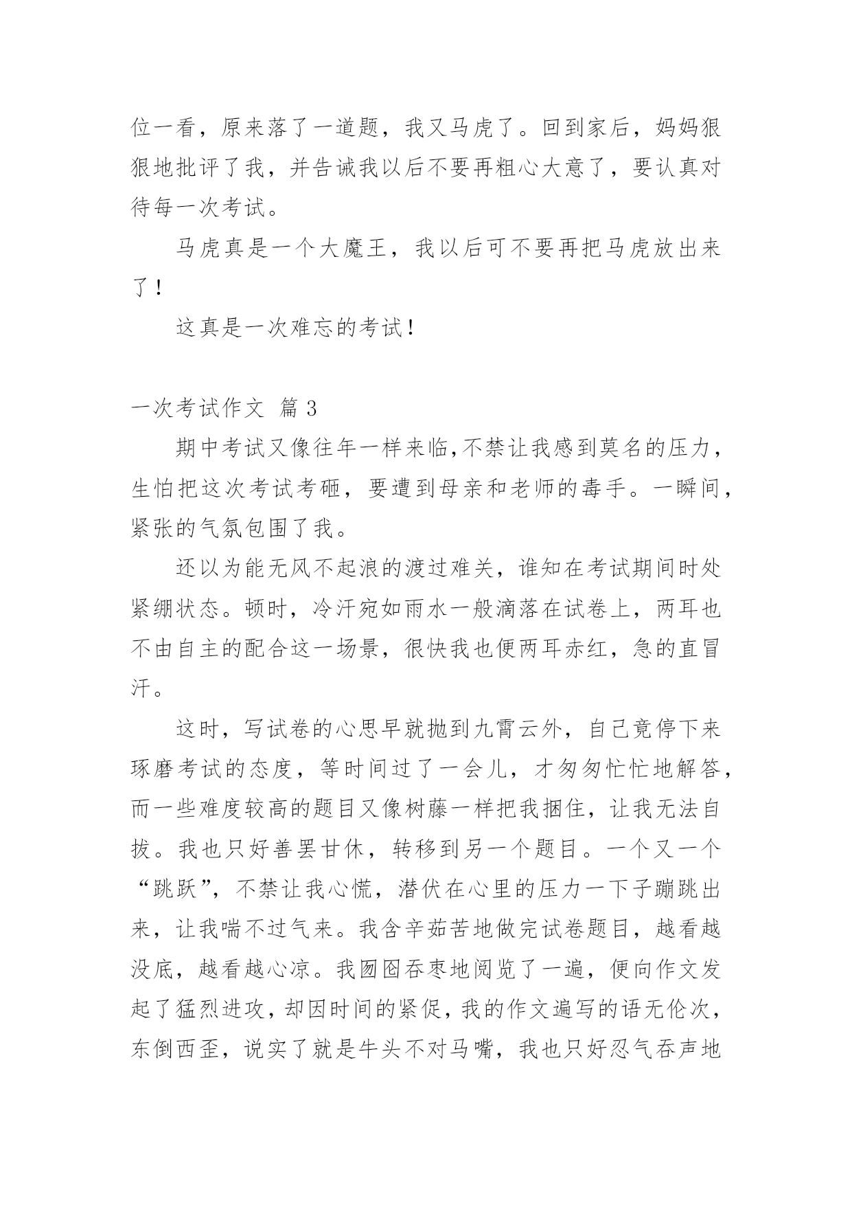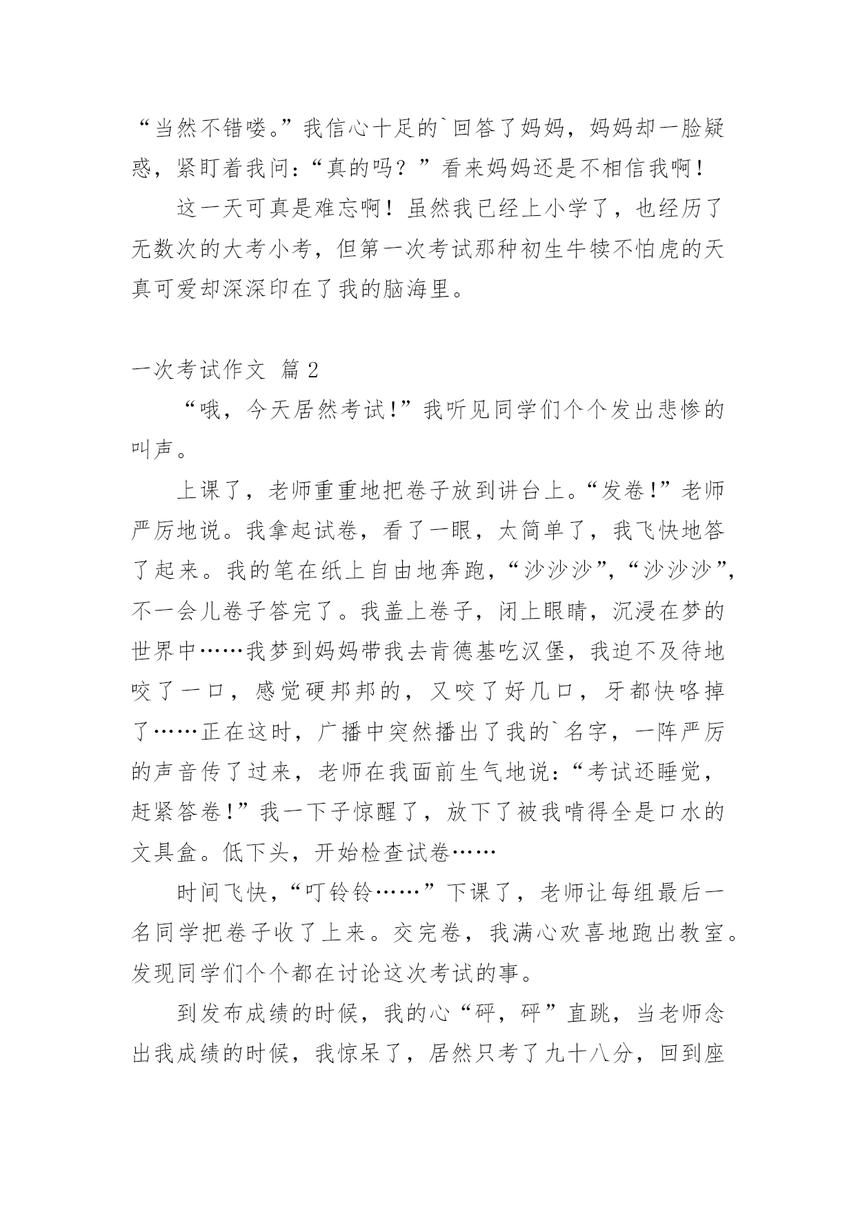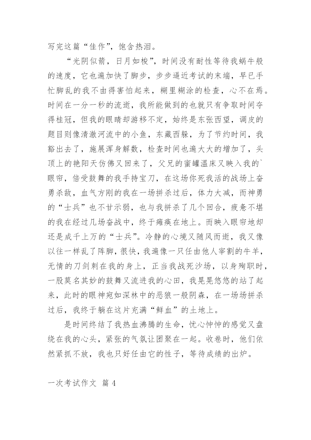 一次考试作文 一次考试作文[必备8篇]在学习、工作、生活中,大家最不陌生的就是作文了吧,写作文是培养人们的观察力、联想力、想象力、思考力和记忆力的重要手段。那么你有了解过作文吗?以下是小编精心整理的一次考试作文8篇,欢迎大家分享。一次考试作文篇1在升一年级报到的前一天晚上,妈妈告诉我:明天还要举行分班考试。我一听紧张极了,毕竟这是我升小学的第一次考试,为了明天的考试,我让妈妈出了一份题,我很认真的把卷纸做了一遍。第二天早上,我一听到闹钟刺耳的声音,便赶快一骨碌的爬下了床,吃完饭以后,我便利索地背上书包上学了。来到学校,看见学校蓝色的大门,漂亮的大楼,还有一些花园里的花花草草,美丽极了,心情也格外的激动。妈妈陪我一起排着队。终于我们在学校老师的组织下有序的进入了教室,我的心里紧张地像是在打鼓一样,我看见老师在教室里来回转,感到特别好奇,我做了一会儿题,又东看西看一会儿,好不容易把题做完了,我也不知道检查,便开始玩了起来,玩没意思了,就期盼考试赶快结束,我终于知道,考试有多么的枯燥。终于考完试了,妈妈带我回家,妈妈问我考的怎么样:“当然不错喽。”我信心十足的`回答了妈妈,妈妈却一脸疑惑,紧盯着我问:“真的吗?”看来妈妈还是不相信我啊!这一天可真是难忘啊!虽然我已经上小学了,也经历了无数次的大考小考,但第一次考试那种初生牛犊不怕虎的天真可爱却深深印在了我的脑海里。一次考试作文篇2“哦,今天居然考试!”我听见同学们个个发出悲惨的叫声。上课了,老师重重地把卷子放到讲台上。“发卷!”老师严厉地说。我拿起试卷,看了一眼,太简单了,我飞快地答了起来。我的笔在纸上自由地奔跑,“沙沙沙”,“沙沙沙”,不一会儿卷子答完了。我盖上卷子,闭上眼睛,沉浸在梦的世界中……我梦到妈妈带我去肯德基吃汉堡,我迫不及待地咬了一口,感觉硬邦邦的,又咬了好几口,牙都快咯掉了……正在这时,广播中突然播出了我的`名字,一阵严厉的声音传了过来,老师在我面前生气地说:“考试还睡觉,赶紧答卷!”我一下子惊醒了,放下了被我啃得全是口水的文具盒。低下头,开始检查试卷……时间飞快,“叮铃铃……”下课了,老师让每组最后一名同学把卷子收了上来。交完卷,我满心欢喜地跑出教室。发现同学们个个都在讨论这次考试的事。到发布成绩的时候,我的心“砰,砰”直跳,当老师念出我成绩的时候,我惊呆了,居然只考了九十八分,回到座位一看,原来落了一道题,我又马虎了。回到家后,妈妈狠狠地批评了我,并告诫我以后不要再粗心大意了,要认真对待每一次考试。马虎真是一个大魔王,我以后可不要再把马虎放出来了!这真是一次难忘的考试!一次考试作文篇3期中考试又像往年一样来临,不禁让我感到莫名的压力,生怕把这次考试考砸,要遭到母亲和老师的毒手。一瞬间,紧张的气氛包围了我。还以为能无风不起浪的渡过难关,谁知在考试期间时处紧绷状态。顿时,冷汗宛如雨水一般滴落在试卷上,两耳也不由自主的配合这一场景,很快我也便两耳赤红,急的直冒汗。这时,写试卷的心思早就抛到九霄云外,自己竟停下来琢磨考试的态度,等时间过了一会儿,才匆匆忙忙地解答,而一些难度较高的题目又像树藤一样把我捆住,让我无法自拔。我也只好善罢甘休,转移到另一个题目。一个又一个“跳跃”,不禁让我心慌,潜伏在心里的压力一下子蹦跳出来,让我喘不过气来。我含辛茹苦地做完试卷题目,越看越没底,越看越心凉。我囫囵吞枣地阅览了一遍,便向作文发起了猛烈进攻,却因时间的紧促,我的作文遍写的语无伦次,东倒西歪,说实了就是牛头不对马嘴,我也只好忍气吞声地写完这篇“佳作”,饱含热泪。“光阴似箭,日月如梭”,时间没有耐性等待我蜗牛般的速度,它也遍加快了脚步,步步逼近考试的末端,早已手忙脚乱的我不由得害怕起来,糊里糊涂的检查,心不在焉。时间在一分一秒的流逝,我所能做到的也就只有争取时间夺得桂冠,但我的眼睛却游移不定,始终是东张西望,调皮的题目则像清澈河流中的小鱼,东藏西躲,为了节约时间,我豁出去了,施展浑身解数,检查时间也遍大大的增加了,头顶上的艳阳天仿佛又回来了,父兄的蜜罐温床又映入我的`眼帘,倍受鼓舞的我手持宝刀,在这场你死我活的战场上奋勇杀敌,血气方刚的我在一场拼杀过后,体力大减,而神勇的“士兵”也不甘示弱,也与我拼杀了几个回合,疲惫不堪的我在经过几场奋战中,终于瘫痪在地上。而映入眼帘地却还是成千上万的“士兵”。冷静的心境又随风而逝,我又像以往一样乱了阵脚,很快,我遍像一只任由他人宰割的牛羊,无情的刀剑刺在我的身上,正当我战死沙场,以身殉职时,一股莫名其妙的鼓舞又流进我的心田,我晃晃悠悠的站了起来,此时的眼神宛如深林中的恶狼一般阴森,在一场场拼杀过后,我终于躺在这片充满“鲜血”的土地上。是时间终结了我热血沸腾的生命,忧心忡忡的感觉又盘绕在我的心头,紧张的气氛让团聚在一起。收卷时,他们依然紧抓不放,我也只