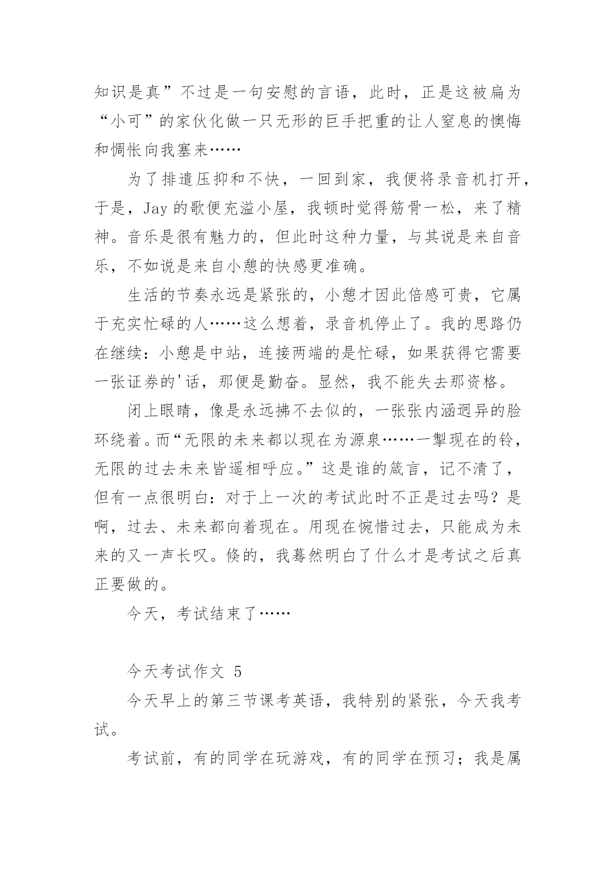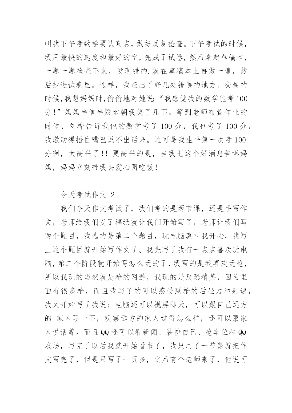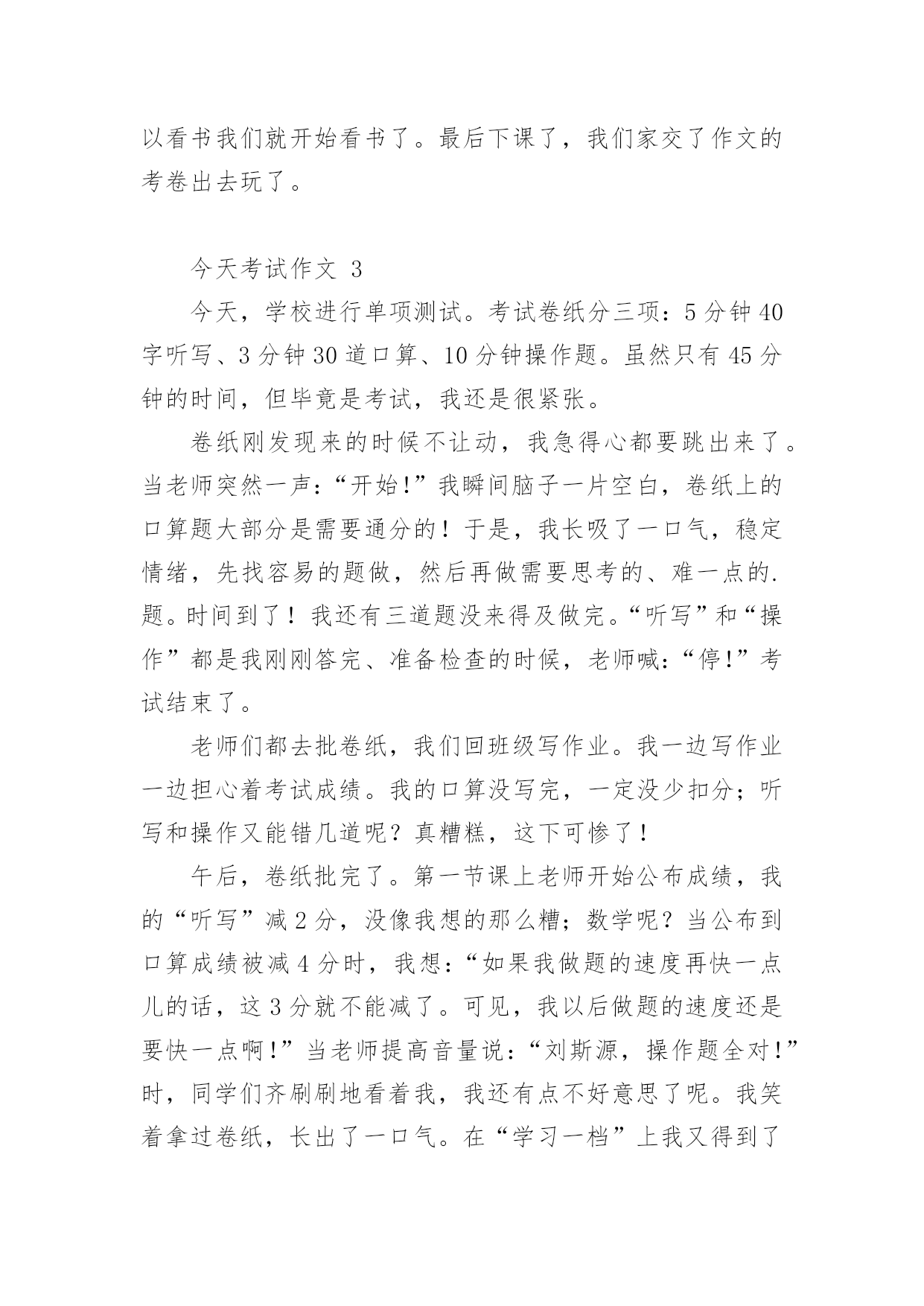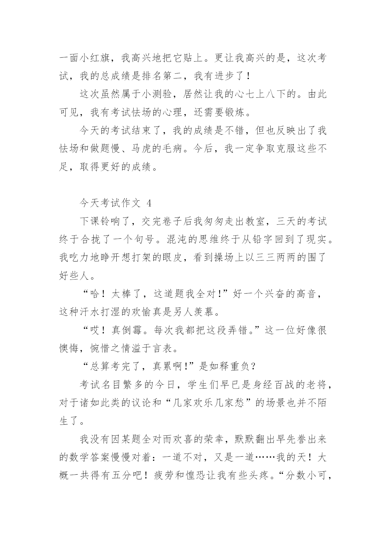 今天考试作文 精选今天考试作文31篇在日常生活或是工作学习中,大家都经常看到作文的身影吧,作文根据写作时限的不同可以分为限时作文和非限时作文。一篇什么样的作文才能称之为优秀作文呢?以下是小编帮大家整理的精选今天考试作文,仅供参考,希望能够帮助到大家。今天考试作文1今天是大考的日子,同学们都早早地来到学校,复习语文。当第一节课的铃声响起的时候,我的心就像弦一样绷紧了,我憧憬着时间已到了放学的时候,我问老师我考得怎么样,老师告诉我我考了一百分,我把这个好消息告诉妈妈,妈妈就夸我真棒,那该多好啊!想着想着,刘桦推了我一下:“喂,试卷要不要的?”我才清醒回来,开始匆匆忙忙地写上名字。考试的时候,遇到简单的题目,我就不假思索地写下答案,碰到难题时,就皱着眉头认真思考。写作文的时候,我想了半天才选择了写童话,因为我觉得童话最有话可说,像“我真的很棒”这样的题目,我实在想不出我棒在哪里。我埋头写啊写,当我终于写完,开始准备检查的时候,老师偏偏就说“要交卷了”。中午的时候,妈妈告诉我语文考得不够仔细,挺粗心的,叫我下午考数学要认真点,做好反复检查。下午考试的时候,我用最快的速度和最好的字,完成了试卷,然后拿起草稿本,一题一题检查下来,发现错的.就在草稿本上再做一遍,然后抄进试卷里。这样,我查出了好几处错误的地方。交卷的时候,我想妈妈时,偷偷地对她说:“我感觉我的数学能考100分!”妈妈半信半疑地朝我笑了几下。等到老师布置作业的时候,刘桦告诉我他的数学考了100分,我也考了100分,我激动得捂住嘴巴说不出话来。这可是我生平第一次考100分啊,太高兴了!!更高兴的是,当我把这个好消息告诉妈妈,妈妈立刻带我去爱心园吃饭!今天考试作文2我们今天作文考试了,我们考的是两节课,还是手写作文,老师给我们发了稿纸就让我们开始写了,老师让我们写两个题目,我选的是第二个题目,玩电脑真叫我开心,我写上这个题目就开始写作文了。我先写了我有一点点喜欢玩电脑,第二个阶段就开始写怎么玩的了,我写的是我喜欢玩枪,所以我玩的当然就是枪的网游,我玩的是反恐精英,因为里面有很多枪,而且我写了的可以感受到枪的后坐力和射速,我又开始写了我说:电脑还可以视屏聊天,可以跟自己远方的`家人聊一下,观察远方的家人过得怎么样,还可以跟家人说话等。而且QQ还可以看新闻、装扮自己、抢车位和QQ农场,写完了以后我就开始看书了,我只用了一节课就把作文写完了,但是只写了一页多,之后有个老师来了,他说可以看书我们就开始看书了。最后下课了,我们家交了作文的考卷出去玩了。今天考试作文3今天,学校进行单项测试。考试卷纸分三项:5分钟40字听写、3分钟30道口算、10分钟操作题。虽然只有45分钟的时间,但毕竟是考试,我还是很紧张。卷纸刚发现来的时候不让动,我急得心都要跳出来了。当老师突然一声:“开始!”我瞬间脑子一片空白,卷纸上的口算题大部分是需要通分的!于是,我长吸了一口气,稳定情绪,先找容易的题做,然后再做需要思考的、难一点的.题。时间到了!我还有三道题没来得及做完。“听写”和“操作”都是我刚刚答完、准备检查的时候,老师喊:“停!”考试结束了。老师们都去批卷纸,我们回班级写作业。我一边写作业一边担心着考试成绩。我的口算没写完,一定没少扣分;听写和操作又能错几道呢?真糟糕,这下可惨了!午后,卷纸批完了。第一节课上老师开始公布成绩,我的“听写”减2分,没像我想的那么糟;数学呢?当公布到口算成绩被减4分时,我想:“如果我做题的速度再快一点儿的话,这3分就不能减了。可见,我以后做题的速度还是要快一点啊!”当老师提高音量说:“刘斯源,操作题全对!”时,同学们齐刷刷地看着我,我还有点不好意思了呢。我笑着拿过卷纸,长出了一口气。在“学习一档”上我又得到了一面小红旗,我高兴地把它贴上。更让我高兴的是,这次考试,我的总成绩是排名第二,我有进步了!这次虽然属于小测验,居然让我的心七上八下的。由此可见,我有考试怯场的心理,还需要锻炼。今天的考试结束了,我的成绩是不错,但也反映出了我怯场和做题慢、马虎的毛病。今后,我一定争取克服这些不足,取得更好的成绩。今天考试作文4下课铃响了,交完卷子后我匆匆走出教室,三天的考试终于合拢了一个句号。混沌的思维终于从铅字回到了现实。我吃力地睁开想打架的眼皮,看到操场上以三三两两的围了好些人。“哈!太棒了,这道题我全对!”好一个兴奋的高音,这种汗水打湿的欢愉真是另人羡慕。“哎!真倒霉。每次我都把这段弄错。”这一位好像很懊悔,惋惜之情溢于言表。“总算考完了,真累啊!”是如释重负?考试名目繁多的今日,学生们早已是身经百战的老将,对于诸如此类的议论和“几家欢乐几家愁”的场景也并不陌生了。我没有因某题全对而欢喜的荣幸,默默翻出早先誊出来的数学答案慢慢对着:一道不对,又是一道……我的天!大概一共得有五分吧!疲