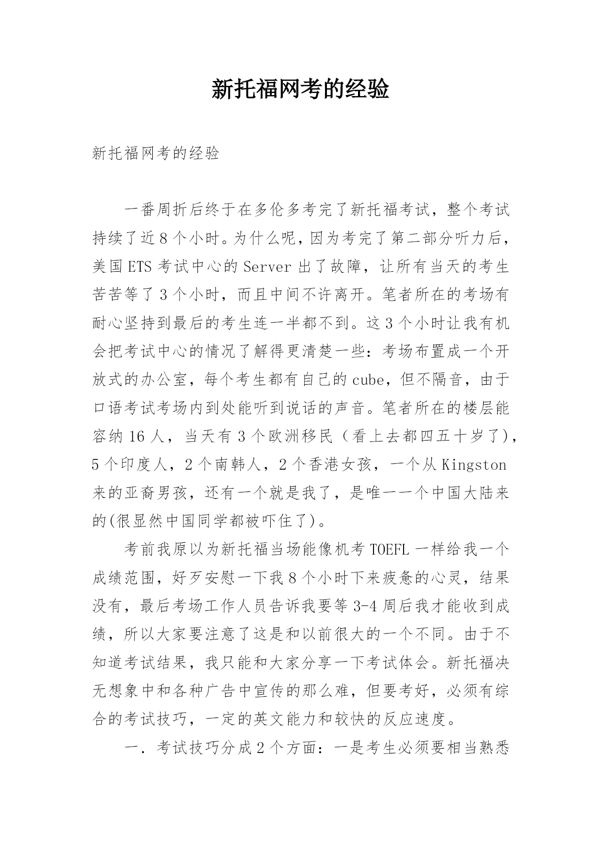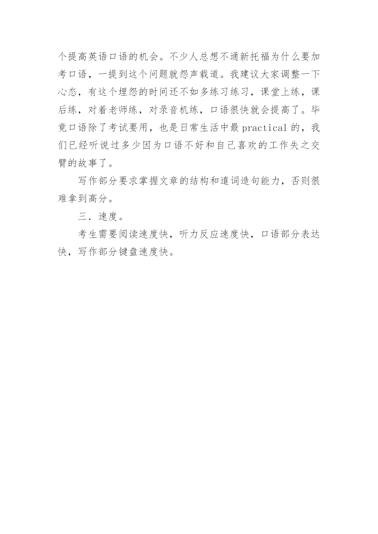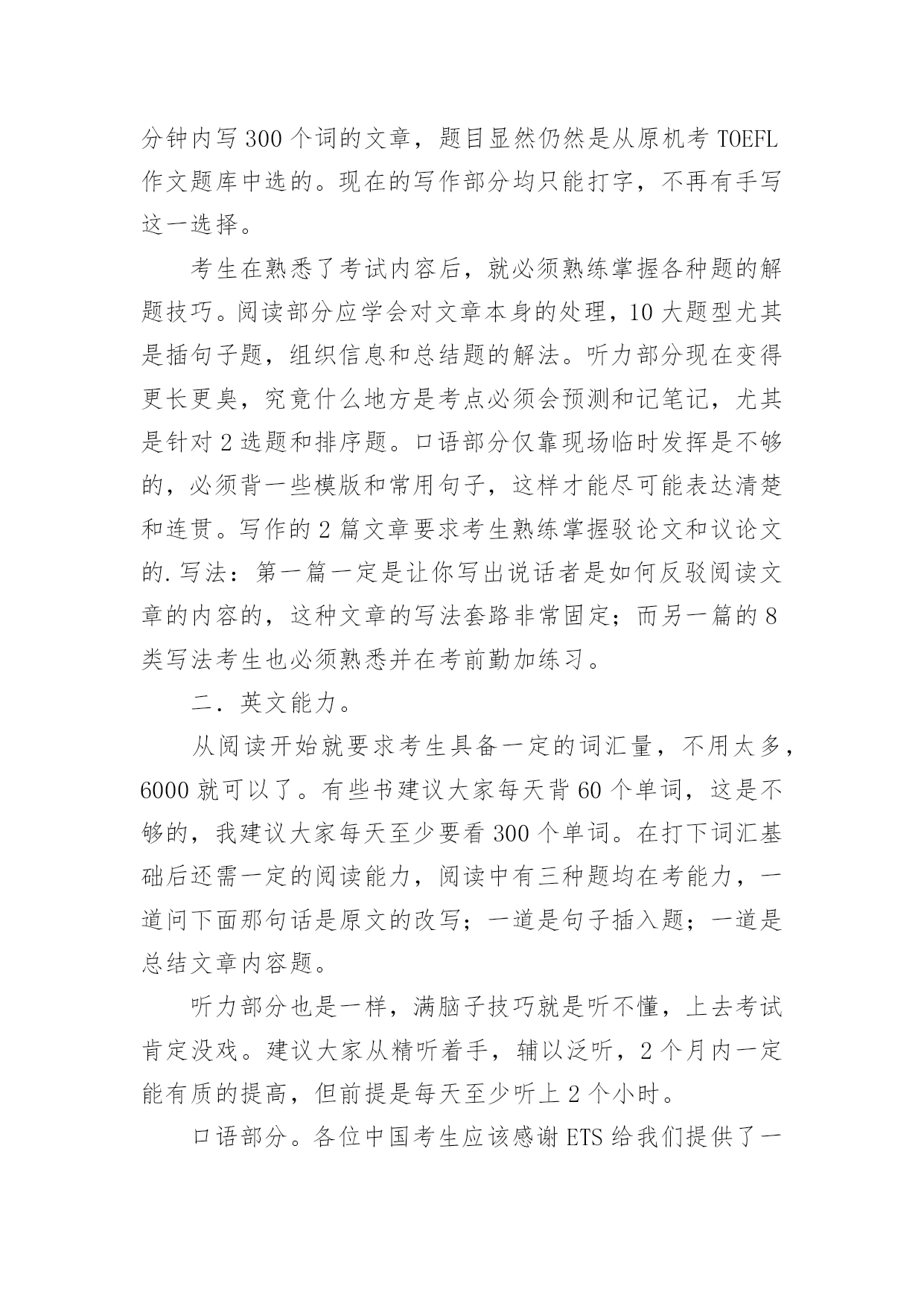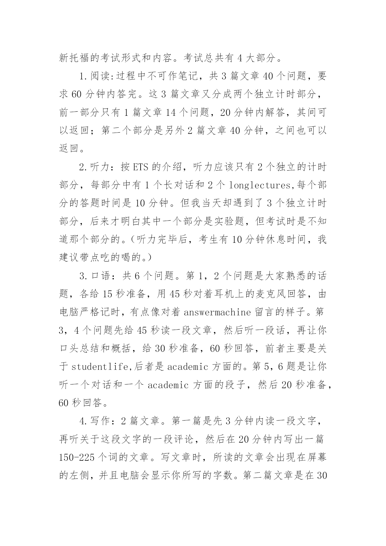 新托福网考的经验 新托福网考的经验一番周折后终于在多伦多考完了新托福考试,整个考试持续了近8个小时。为什么呢,因为考完了第二部分听力后,美国ETS考试中心的Server出了故障,让所有当天的考生苦苦等了3个小时,而且中间不许离开。笔者所在的考场有耐心坚持到最后的考生连一半都不到。这3个小时让我有机会把考试中心的情况了解得更清楚一些:考场布置成一个开放式的办公室,每个考生都有自己的cube,但不隔音,由于口语考试考场内到处能听到说话的声音。笔者所在的楼层能容纳16人,当天有3个欧洲移民(看上去都四五十岁了),5个印度人,2个南韩人,2个香港女孩,一个从Kingston来的亚裔男孩,还有一个就是我了,是唯一一个中国大陆来的(很显然中国同学都被吓住了)。考前我原以为新托福当场能像机考TOEFL一样给我一个成绩范围,好歹安慰一下我8个小时下来疲惫的心灵,结果没有,最后考场工作人员告诉我要等3-4周后我才能收到成绩,所以大家要注意了这是和以前很大的一个不同。由于不知道考试结果,我只能和大家分享一下考试体会。新托福决无想象中和各种广告中宣传的那么难,但要考好,必须有综合的考试技巧,一定的英文能力和较快的反应速度。一.考试技巧分成2个方面:一是考生必须要相当熟悉新托福的考试形式和内容。考试总共有4大部分。1.阅读:过程中不可作笔记,共3篇文章40个问题,要求60分钟内答完。这3篇文章又分成两个独立计时部分,前一部分只有1篇文章14个问题,20分钟内解答,其间可以返回;第二个部分是另外2篇文章40分钟,之间也可以返回。2.听力:按ETS的介绍,听力应该只有2个独立的计时部分,每部分中有1个长对话和2个longlectures,每个部分的答题时间是10分钟。但我当天却遇到了3个独立计时部分,后来才明白其中一个部分是实验题,但考试时是不知道那个部分的。(听力完毕后,考生有10分钟休息时间,我建议带点吃的喝的。)3.口语:共6个问题。第1,2个问题是大家熟悉的话题,各给15秒准备,用45秒对着耳机上的麦克风回答,由电脑严格记时,有点像对着answermachine留言的样子。第3,4个问题先给45秒读一段文章,然后听一段话,再让你口头总结和概括,给30秒准备,60秒回答,前者主要是关于studentlife,后者是academic方面的。第5,6题是让你听一个对话和一个academic方面的段子,然后20秒准备,60秒回答。4.写作:2篇文章。第一篇是先3分钟内读一段文字,再听关于这段文字的一段评论,然后在20分钟内写出一篇150-225个词的文章。写文章时,所读的文章会出现在屏幕的左侧,并且电脑会显示你所写的字数。第二篇文章是在30分钟内写300个词的文章,题目显然仍然是从原机考TOEFL作文题库中选的。现在的写作部分均只能打字,不再有手写这一选择。考生在熟悉了考试内容后,就必须熟练掌握各种题的解题技巧。阅读部分应学会对文章本身的处理,10大题型尤其是插句子题,组织信息和总结题的解法。听力部分现在变得更长更臭,究竟什么地方是考点必须会预测和记笔记,尤其是针对2选题和排序题。口语部分仅靠现场临时发挥是不够的,必须背一些模版和常用句子,这样才能尽可能表达清楚和连贯。写作的2篇文章要求考生熟练掌握驳论文和议论文的.写法:第一篇一定是让你写出说话者是如何反驳阅读文章的内容的,这种文章的写法套路非常固定;而另一篇的8类写法考生也必须熟悉并在考前勤加练习。二.英文能力。从阅读开始就要求考生具备一定的词汇量,不用太多,6000就可以了。有些书建议大家每天背60个单词,这是不够的,我建议大家每天至少要看300个单词。在打下词汇基础后还需一定的阅读能力,阅读中有三种题均在考能力,一道问下面那句话是原文的改写;一道是句子插入题;一道是总结文章内容题。听力部分也是一样,满脑子技巧就是听不懂,上去考试肯定没戏。建议大家从精听着手,辅以泛听,2个月内一定能有质的提高,但前提是每天至少听上2个小时。口语部分。各位中国考生应该感谢ETS给我们提供了一个提高英语口语的机会。不少人总想不通新托福为什么要加考口语,一提到这个问题就怨声载道。我建议大家调整一下心态,有这个埋怨的时间还不如多练习练习,课堂上练,课后练,对着老师练,对录音机练,口语很快就会提高了。毕竟口语除了考试要用,也是日常生活中最practical的,我们已经听说过多少因为口语不好和自己喜欢的工作失之交臂的故事了。写作部分要求掌握文章的结构和遣词造句能力,否则很难拿到高分。三.速度。考生需要阅读速度快,听力反应速度快,口语部分表达快,写作部分键盘速度快。