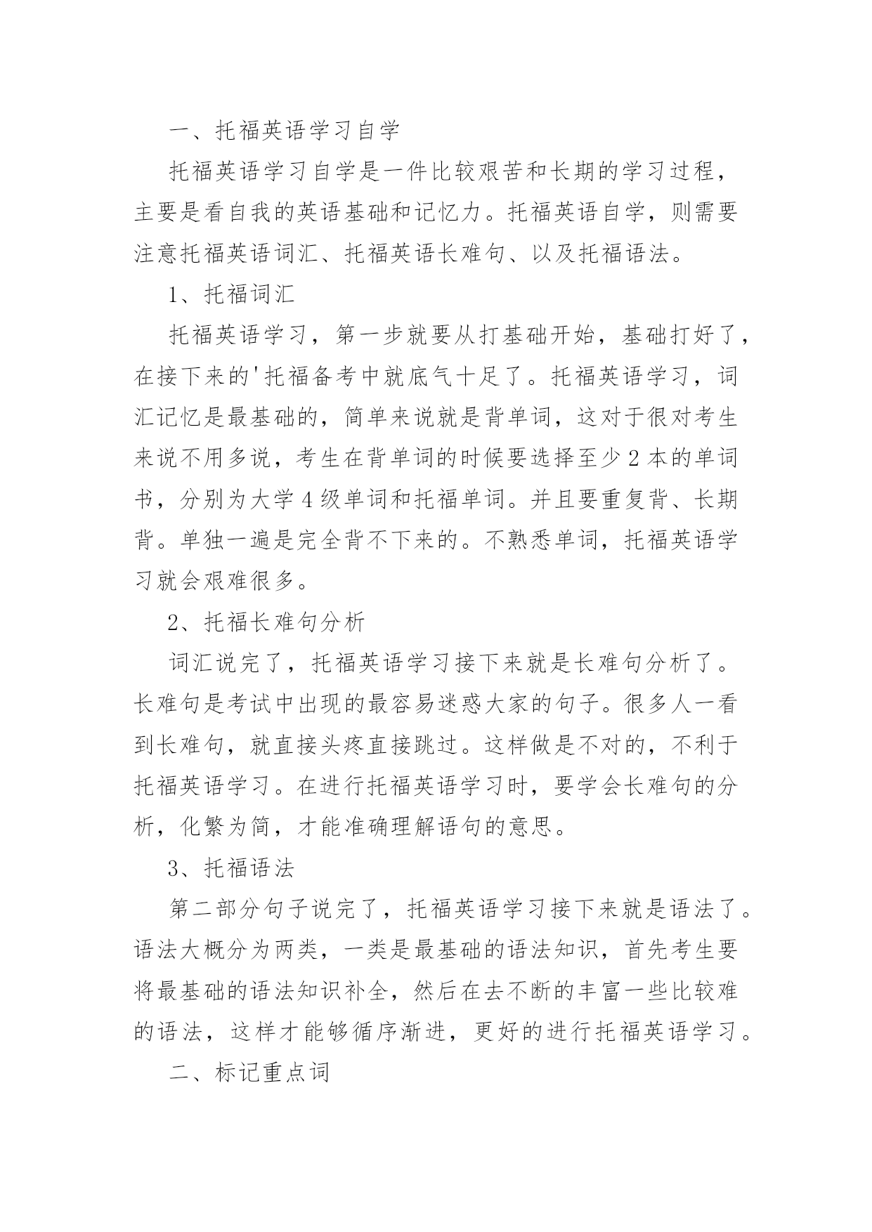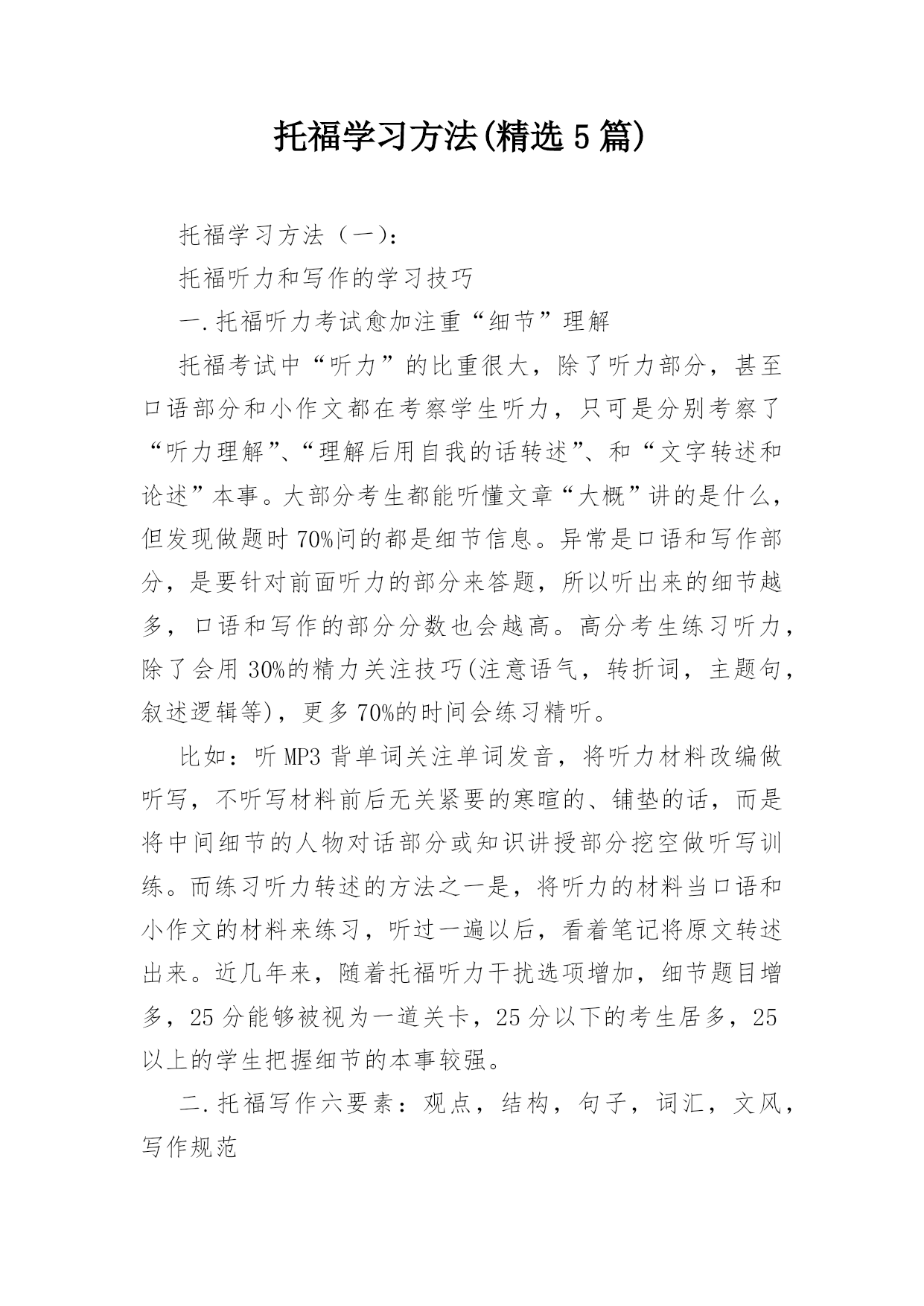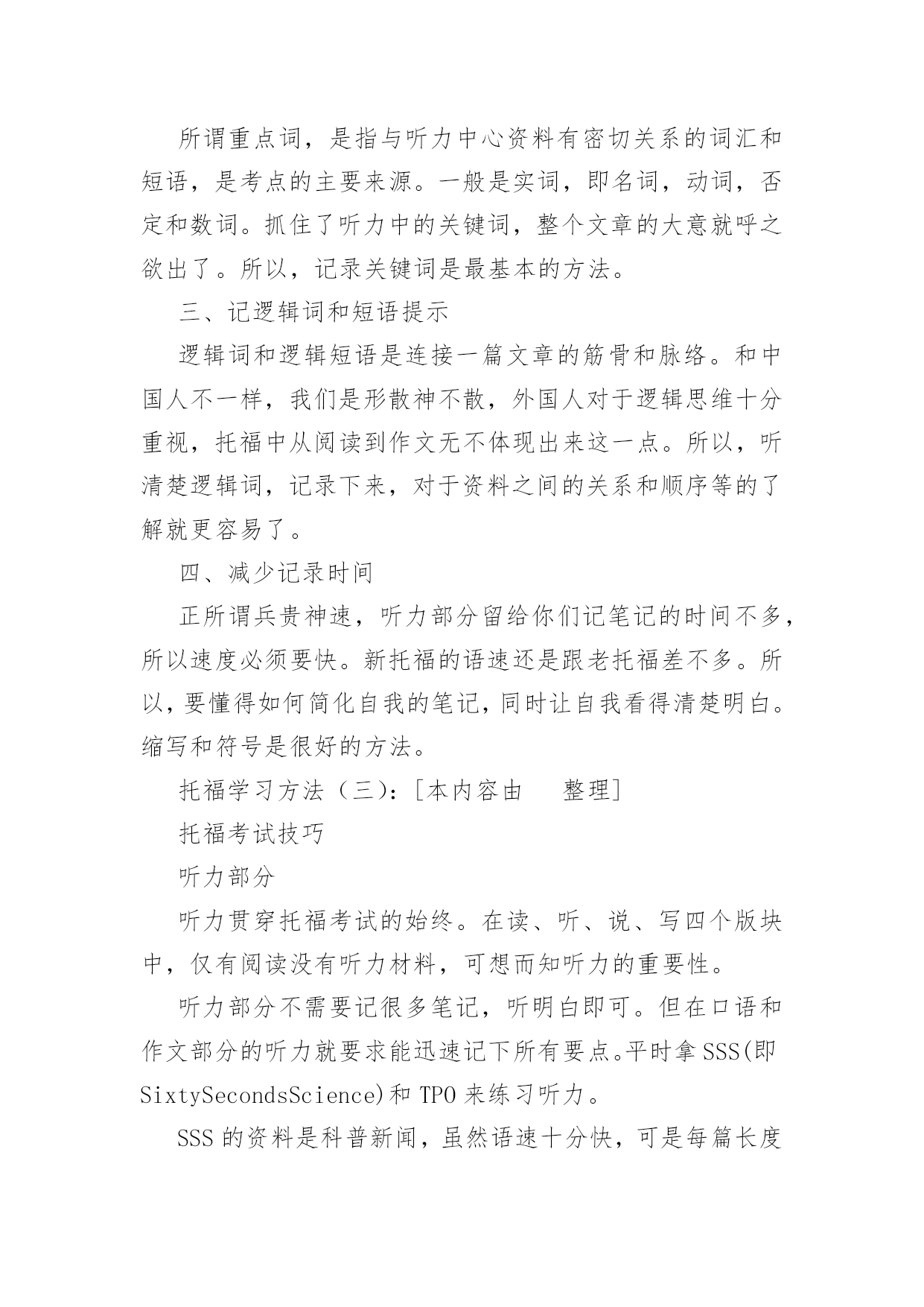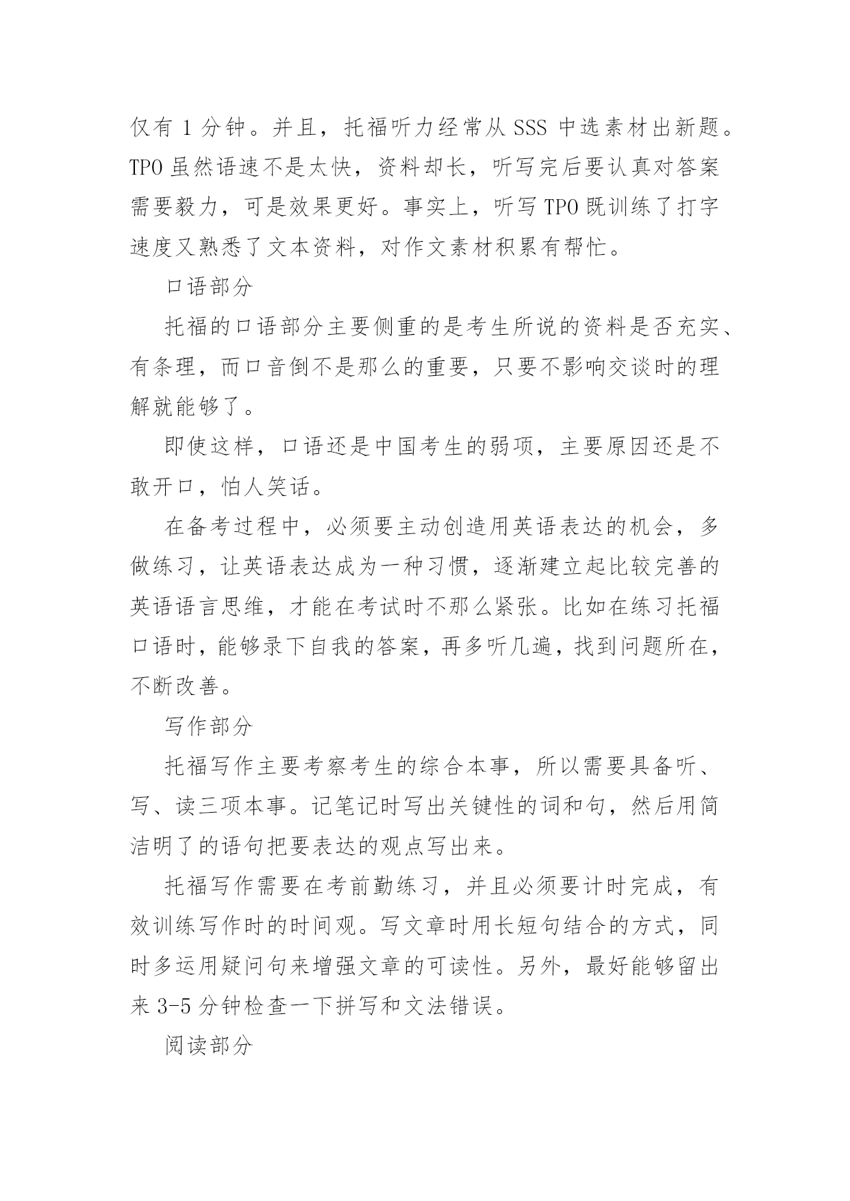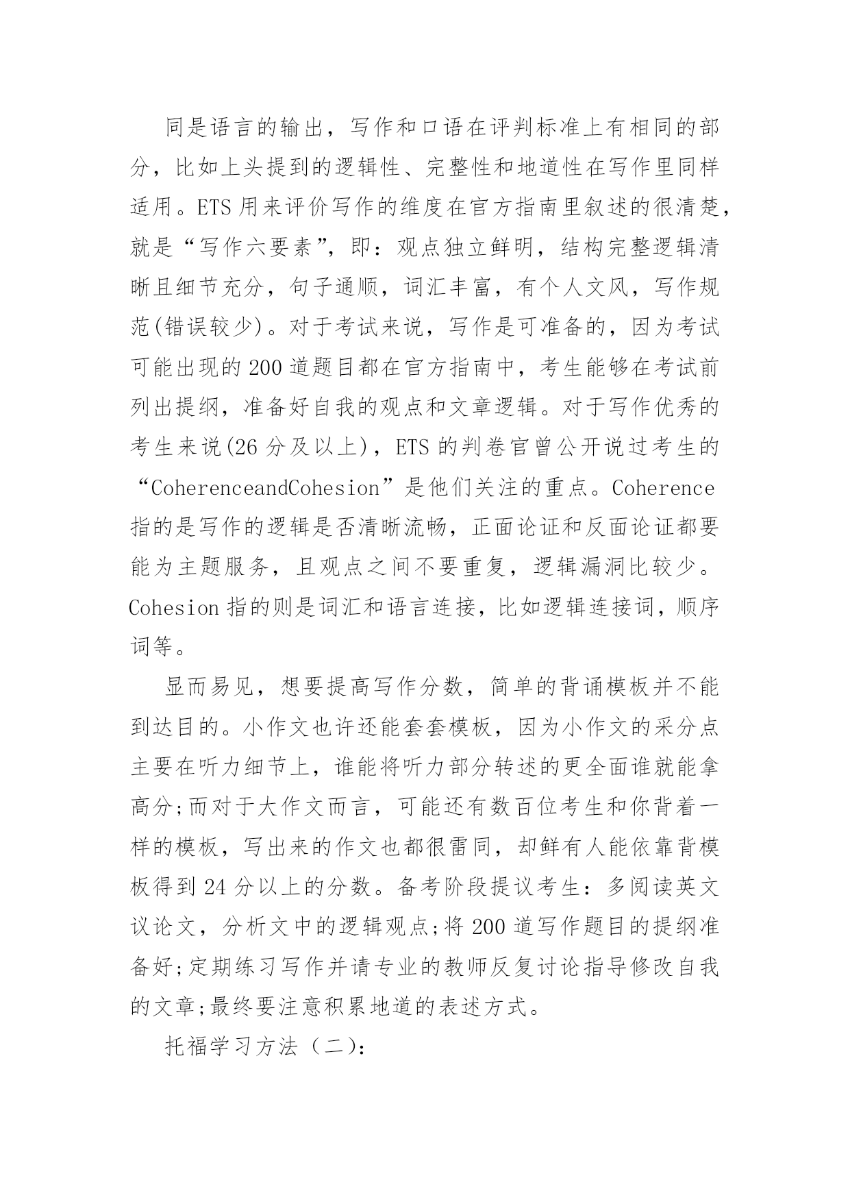 托福学习方法(精选5篇) 托福学习方法(一):托福听力和写作的学习技巧一.托福听力考试愈加注重“细节”理解托福考试中“听力”的比重很大,除了听力部分,甚至口语部分和小作文都在考察学生听力,只可是分别考察了“听力理解”、“理解后用自我的话转述”、和“文字转述和论述”本事。大部分考生都能听懂文章“大概”讲的是什么,但发现做题时70%问的都是细节信息。异常是口语和写作部分,是要针对前面听力的部分来答题,所以听出来的细节越多,口语和写作的部分分数也会越高。高分考生练习听力,除了会用30%的精力关注技巧(注意语气,转折词,主题句,叙述逻辑等),更多70%的时间会练习精听。比如:听MP3背单词关注单词发音,将听力材料改编做听写,不听写材料前后无关紧要的寒暄的、铺垫的话,而是将中间细节的人物对话部分或知识讲授部分挖空做听写训练。而练习听力转述的方法之一是,将听力的材料当口语和小作文的材料来练习,听过一遍以后,看着笔记将原文转述出来。近几年来,随着托福听力干扰选项增加,细节题目增多,25分能够被视为一道关卡,25分以下的考生居多,25以上的学生把握细节的本事较强。二.托福写作六要素:观点,结构,句子,词汇,文风,写作规范同是语言的输出,写作和口语在评判标准上有相同的部分,比如上头提到的逻辑性、完整性和地道性在写作里同样适用。ETS用来评价写作的维度在官方指南里叙述的很清楚,就是“写作六要素”,即:观点独立鲜明,结构完整逻辑清晰且细节充分,句子通顺,词汇丰富,有个人文风,写作规范(错误较少)。对于考试来说,写作是可准备的,因为考试可能出现的200道题目都在官方指南中,考生能够在考试前列出提纲,准备好自我的观点和文章逻辑。对于写作优秀的考生来说(26分及以上),ETS的判卷官曾公开说过考生的“CoherenceandCohesion”是他们关注的重点。Coherence指的是写作的逻辑是否清晰流畅,正面论证和反面论证都要能为主题服务,且观点之间不要重复,逻辑漏洞比较少。Cohesion指的则是词汇和语言连接,比如逻辑连接词,顺序词等。显而易见,想要提高写作分数,简单的背诵模板并不能到达目的。小作文也许还能套套模板,因为小作文的采分点主要在听力细节上,谁能将听力部分转述的更全面谁就能拿高分;而对于大作文而言,可能还有数百位考生和你背着一样的模板,写出来的作文也都很雷同,却鲜有人能依靠背模板得到24分以上的分数。备考阶段提议考生:多阅读英文议论文,分析文中的逻辑观点;将200道写作题目的提纲准备好;定期练习写作并请专业的教师反复讨论指导修改自我的文章;最终要注意积累地道的表述方式。托福学习方法(二):一、托福英语学习自学托福英语学习自学是一件比较艰苦和长期的学习过程,主要是看自我的英语基础和记忆力。托福英语自学,则需要注意托福英语词汇、托福英语长难句、以及托福语法。1、托福词汇托福英语学习,第一步就要从打基础开始,基础打好了,在接下来的'托福备考中就底气十足了。托福英语学习,词汇记忆是最基础的,简单来说就是背单词,这对于很对考生来说不用多说,考生在背单词的时候要选择至少2本的单词书,分别为大学4级单词和托福单词。并且要重复背、长期背。单独一遍是完全背不下来的。不熟悉单词,托福英语学习就会艰难很多。2、托福长难句分析词汇说完了,托福英语学习接下来就是长难句分析了。长难句是考试中出现的最容易迷惑大家的句子。很多人一看到长难句,就直接头疼直接跳过。这样做是不对的,不利于托福英语学习。在进行托福英语学习时,要学会长难句的分析,化繁为简,才能准确理解语句的意思。3、托福语法第二部分句子说完了,托福英语学习接下来就是语法了。语法大概分为两类,一类是最基础的语法知识,首先考生要将最基础的语法知识补全,然后在去不断的丰富一些比较难的语法,这样才能够循序渐进,更好的进行托福英语学习。二、标记重点词所谓重点词,是指与听力中心资料有密切关系的词汇和短语,是考点的主要来源。一般是实词,即名词,动词,否定和数词。抓住了听力中的关键词,整个文章的大意就呼之欲出了。所以,记录关键词是最基本的方法。三、记逻辑词和短语提示逻辑词和逻辑短语是连接一篇文章的筋骨和脉络。和中国人不一样,我们是形散神不散,外国人对于逻辑思维十分重视,托福中从阅读到作文无不体现出来这一点。所以,听清楚逻辑词,记录下来,对于资料之间的关系和顺序等的了解就更容易了。四、减少记录时间正所谓兵贵神速,听力部分留给你们记笔记的时间不多,所以速度必须要快。新托福的语速还是跟老托福差不多。所以,要懂得如何简化自我的笔记,同时让自我看得清楚明白。缩写和符号是很好的方法。托福学习方法(三):[本内容由整理]托福考试技巧听力部分听力贯穿托福考试的始终。在读、听、说、写四个版块中,仅有阅读没有听力材料,可想而知听力的重要性。听力