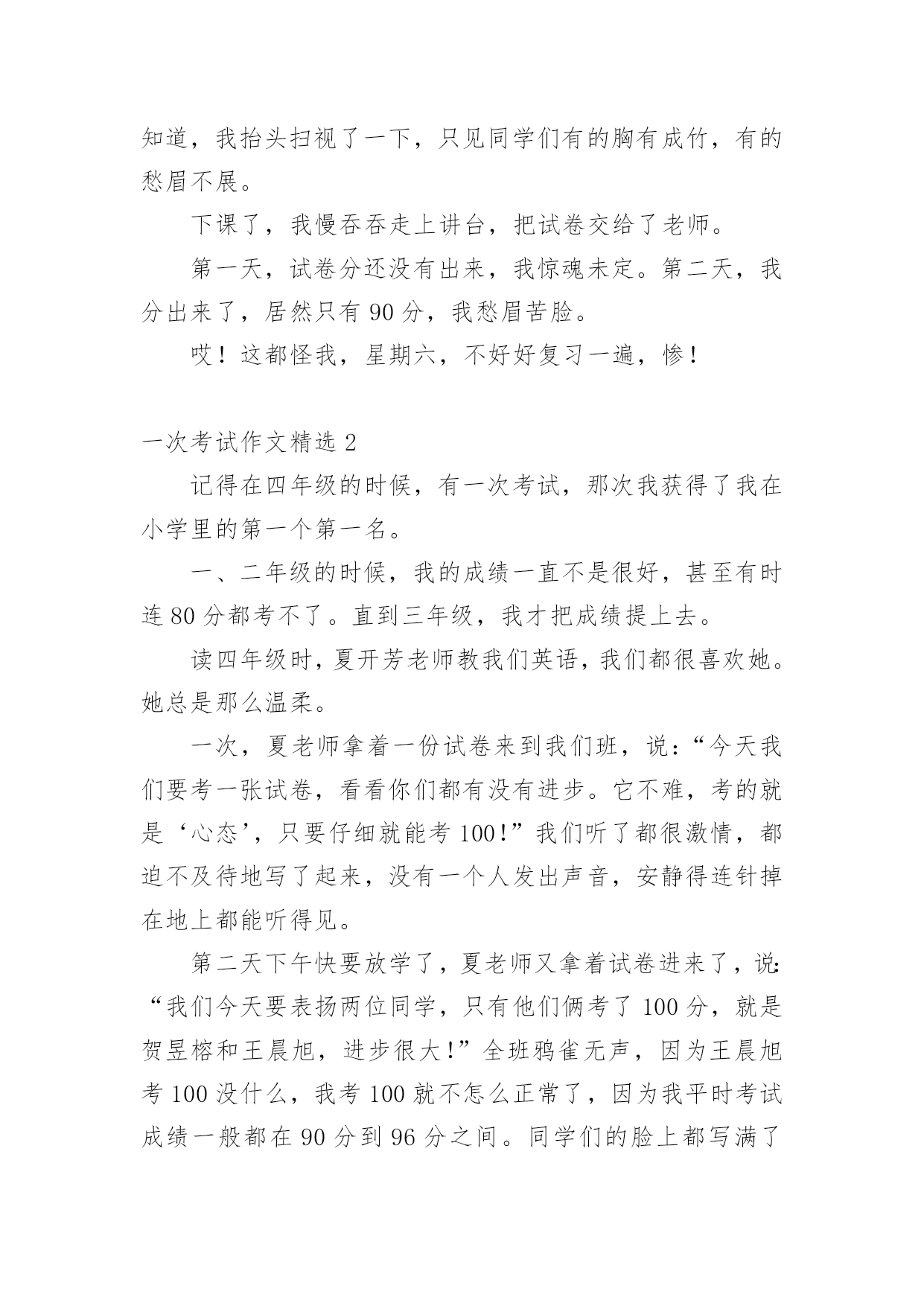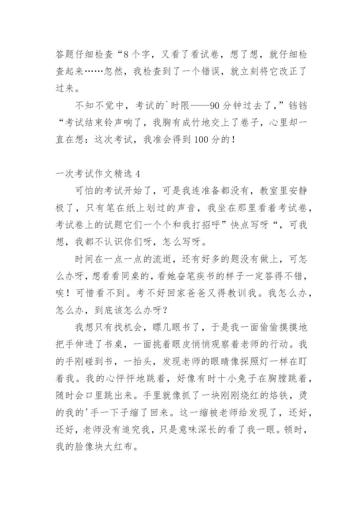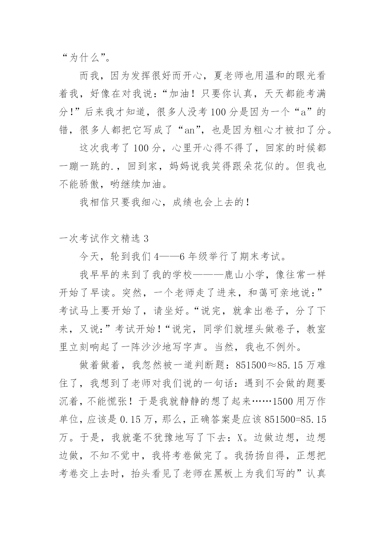 一次考试作文 一次考试作文精选在日常学习、工作和生活中,大家都写过作文,肯定对各类作文都很熟悉吧,根据写作命题的特点,作文可以分为命题作文和非命题作文。你所见过的作文是什么样的呢?以下是小编帮大家整理的一次考试作文精选,欢迎阅读与收藏。一次考试作文精选1“叮铃铃”,“叮铃铃”上课了。前不久,语文老师说星期五要考试。我早已预备好,我目不转睛的望着窗外的行人。不一,轻快的脚步声响起了。咦?怎么是数学老师,我觉得很奇怪。过了一会,数学老师才说:“同学们,今天上数学课,因为我和语文换课了,所以下个星期一才上语文课”。于是数学老师便滔滔不绝的讲了起来。我心里不由自主的想“为什么不上语文课?为什么?不一会,便放学了,居然没有作业,我来到家里,书包一扔,便出去玩了。两天都没有复习。星期一到了,我来到学校,突然想起今天要考试,我心惊胆颤,汗流浃背希望再次换课。”不要上语文课,不要上语文课“我闭着眼睛默念着。我睁眼一看,居然是语文老师,这下子我可惨了。只好等到大祸临头,不一会试卷便发下来了,我一看,居然还是重点部分的B卷,哎!真是天地不容,只好埋头苦干,试卷上的'题我一一解决,可对不对我还不知道,我抬头扫视了一下,只见同学们有的胸有成竹,有的愁眉不展。下课了,我慢吞吞走上讲台,把试卷交给了老师。第一天,试卷分还没有出来,我惊魂未定。第二天,我分出来了,居然只有90分,我愁眉苦脸。哎!这都怪我,星期六,不好好复习一遍,惨!一次考试作文精选2记得在四年级的时候,有一次考试,那次我获得了我在小学里的第一个第一名。一、二年级的时候,我的成绩一直不是很好,甚至有时连80分都考不了。直到三年级,我才把成绩提上去。读四年级时,夏开芳老师教我们英语,我们都很喜欢她。她总是那么温柔。一次,夏老师拿着一份试卷来到我们班,说:“今天我们要考一张试卷,看看你们都有没有进步。它不难,考的就是‘心态’,只要仔细就能考100!”我们听了都很激情,都迫不及待地写了起来,没有一个人发出声音,安静得连针掉在地上都能听得见。第二天下午快要放学了,夏老师又拿着试卷进来了,说:“我们今天要表扬两位同学,只有他们俩考了100分,就是贺昱榕和王晨旭,进步很大!”全班鸦雀无声,因为王晨旭考100没什么,我考100就不怎么正常了,因为我平时考试成绩一般都在90分到96分之间。同学们的脸上都写满了“为什么”。而我,因为发挥很好而开心,夏老师也用温和的眼光看着我,好像在对我说:“加油!只要你认真,天天都能考满分!”后来我才知道,很多人没考100分是因为一个“a”的错,很多人都把它写成了“an”,也是因为粗心才被扣了分。这次我考了100分,心里开心得不得了,回家的时候都一蹦一跳的.,回到家,妈妈说我笑得跟朵花似的。但我也不能骄傲,哟继续加油。我相信只要我细心,成绩也会上去的!一次考试作文精选3今天,轮到我们4——6年级举行了期末考试。我早早的来到了我的学校———鹿山小学,像往常一样开始了早读。突然,一个老师走了进来,和蔼可亲地说:”考试马上要开始了,请坐好。“说完,就拿出卷子,分了下来,又说:”考试开始!“说完,同学们就埋头做卷子,教室里立刻响起了一阵沙沙地写字声。当然,我也不例外。做着做着,我忽然被一道判断题:851500≈85.15万难住了,我想到了老师对我们说的一句话:遇到不会做的题要沉着,不能慌张!于是我就静静的想了起来……1500用万作单位,应该是0.15万,那么,正确答案是应该851500=85.15万。于是,我就毫不犹豫地写了下去:X。边做边想,边想边做,不知不觉中,我将考卷做完了。我扬扬自得,正想把考卷交上去时,抬头看见了老师在黑板上为我们写的”认真答题仔细检查“8个字,又看了看试卷,想了想,就仔细检查起来……忽然,我检查到了一个错误,就立刻将它改正了过来。不知不觉中,考试的`时限——90分钟过去了,”铛铛“考试结束铃声响了,我胸有成竹地交上了卷子,心里却一直在想:这次考试,我准会得到100分的!一次考试作文精选4可怕的考试开始了,可是我连准备都没有,教室里安静极了,只有笔在纸上划过的声音,我坐在那里看着考试卷,考试卷上的试题它们一个个和我打招呼”快点写呀“,可我想,我都不认识你们呀,怎么写呀。时间在一点一点的流逝,还有好多的题没有做上,可怎么办呀,想看看同桌的,看她奋笔疾书的样子一定答得不错,唉!可惜看不到。考不好回家爸爸又得教训我。我怎么办,怎么办,到底该怎么办呀?我想只有找机会,瞟几眼书了,于是我一面偷偷摸摸地把手伸进了书桌,一面挑着眼皮悄悄观察着老师的行动。我的手刚碰到书,一抬头,发现老师的眼睛像探照灯一样在盯着我。我的心怦怦地跳着,好像有时十小兔子在胸膛跳着,随时会口里跳出来。手里就像抓了一块刚刚烧红的烙铁,烫的我的'手一下子缩了回来。这一缩被老师给发现了,还好,还好,老