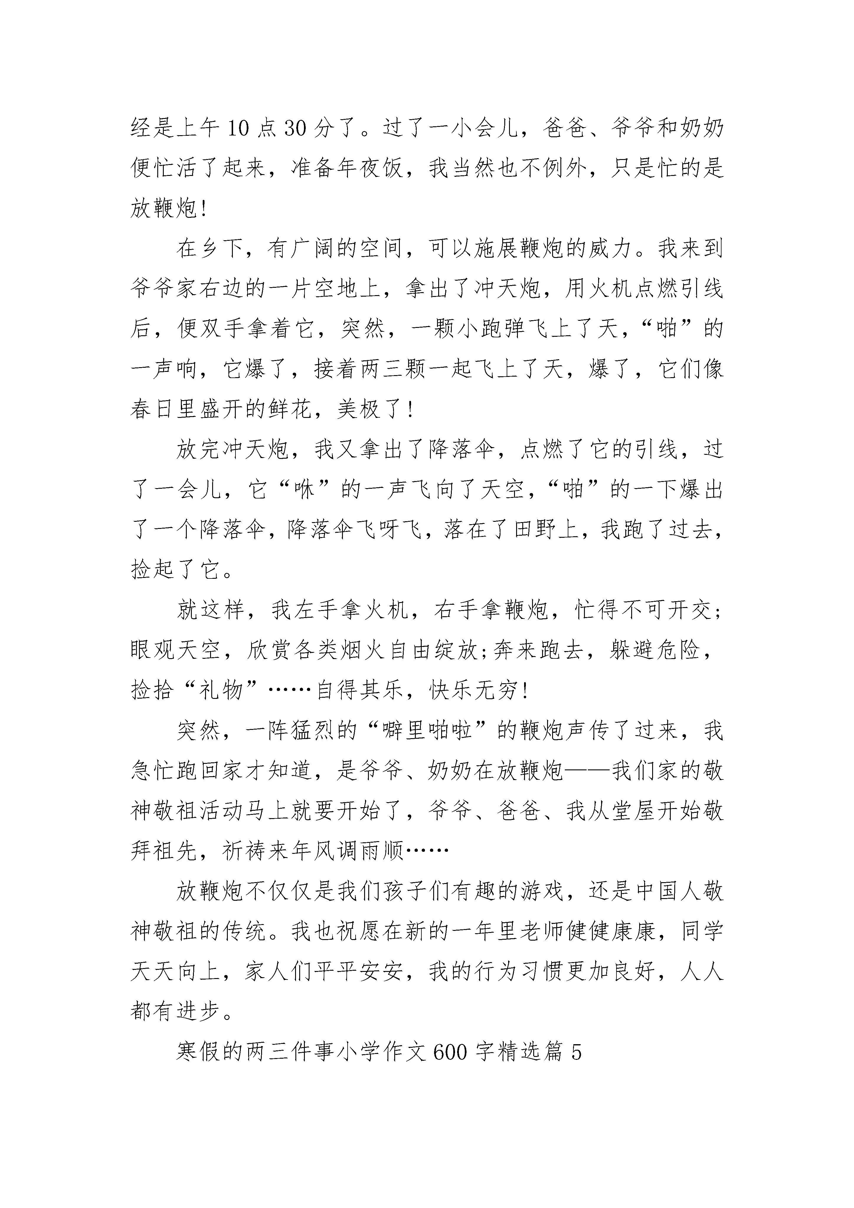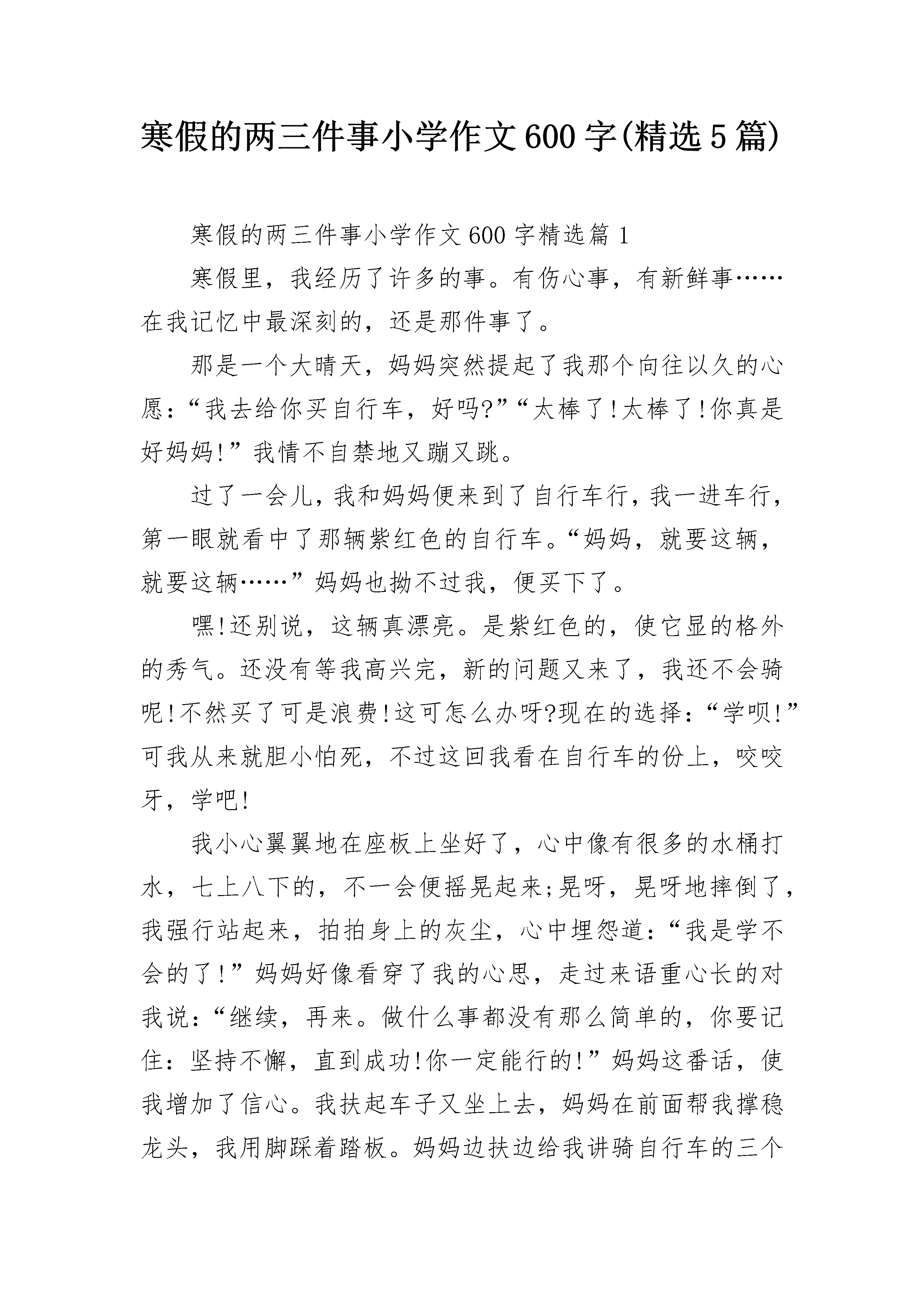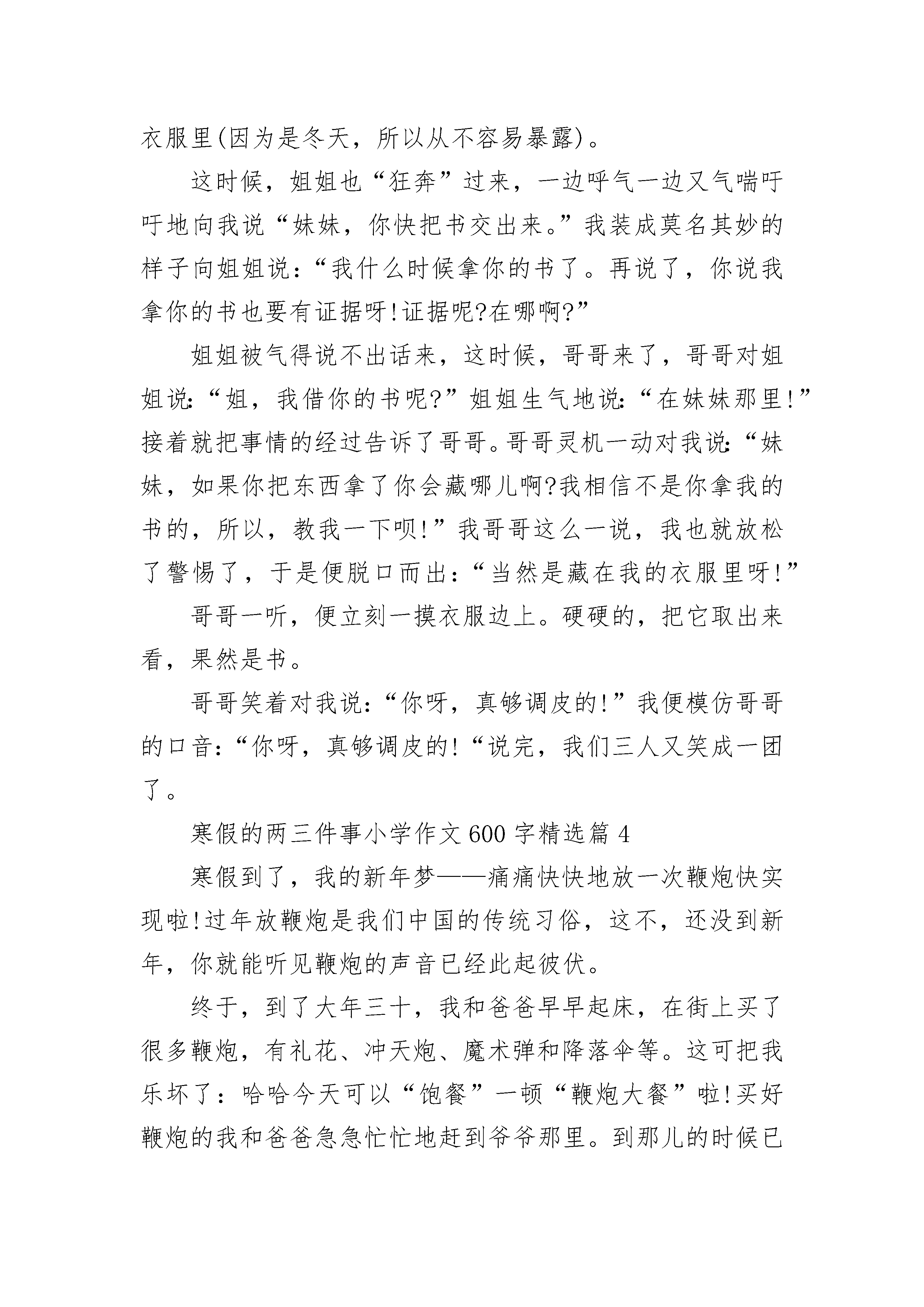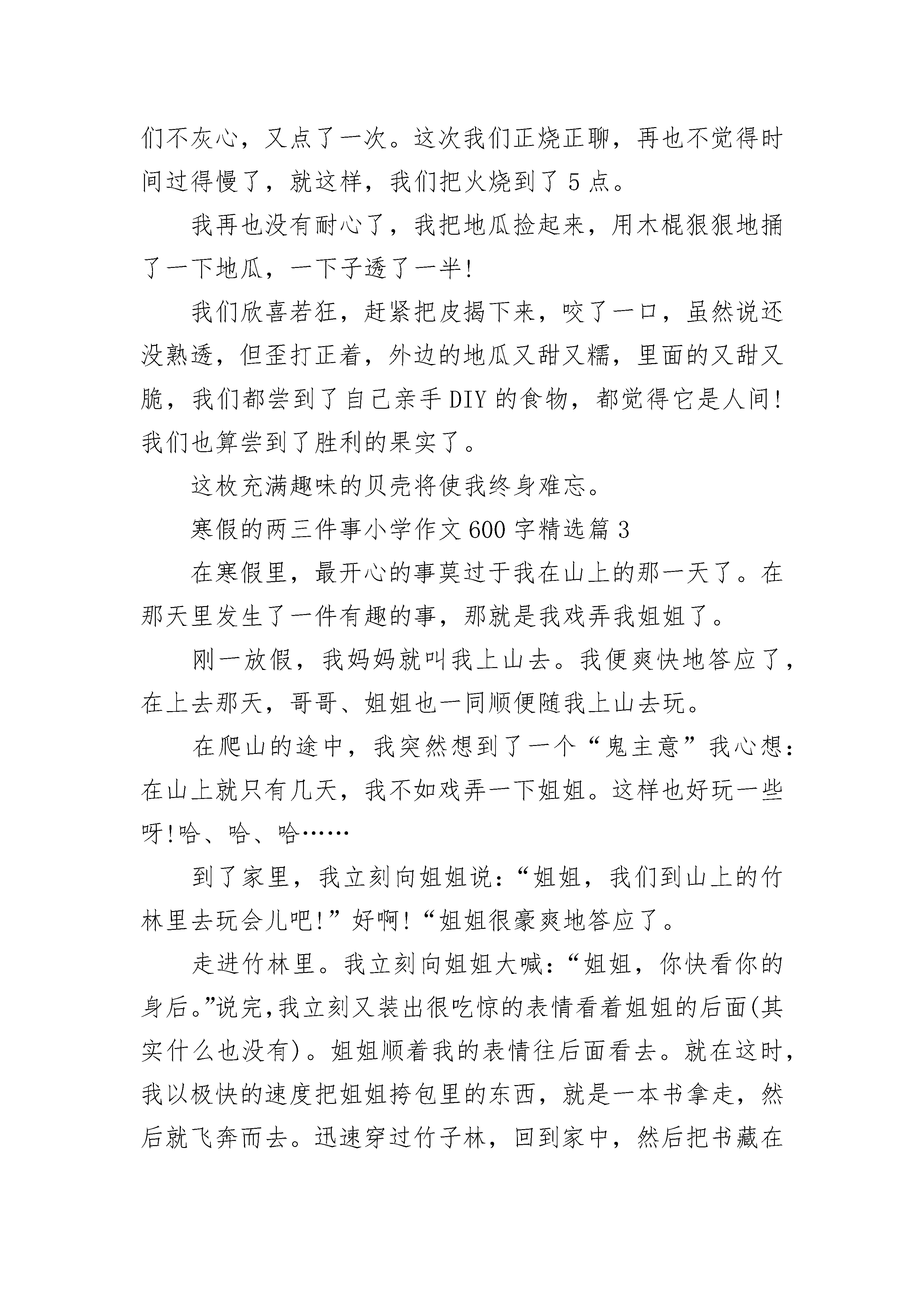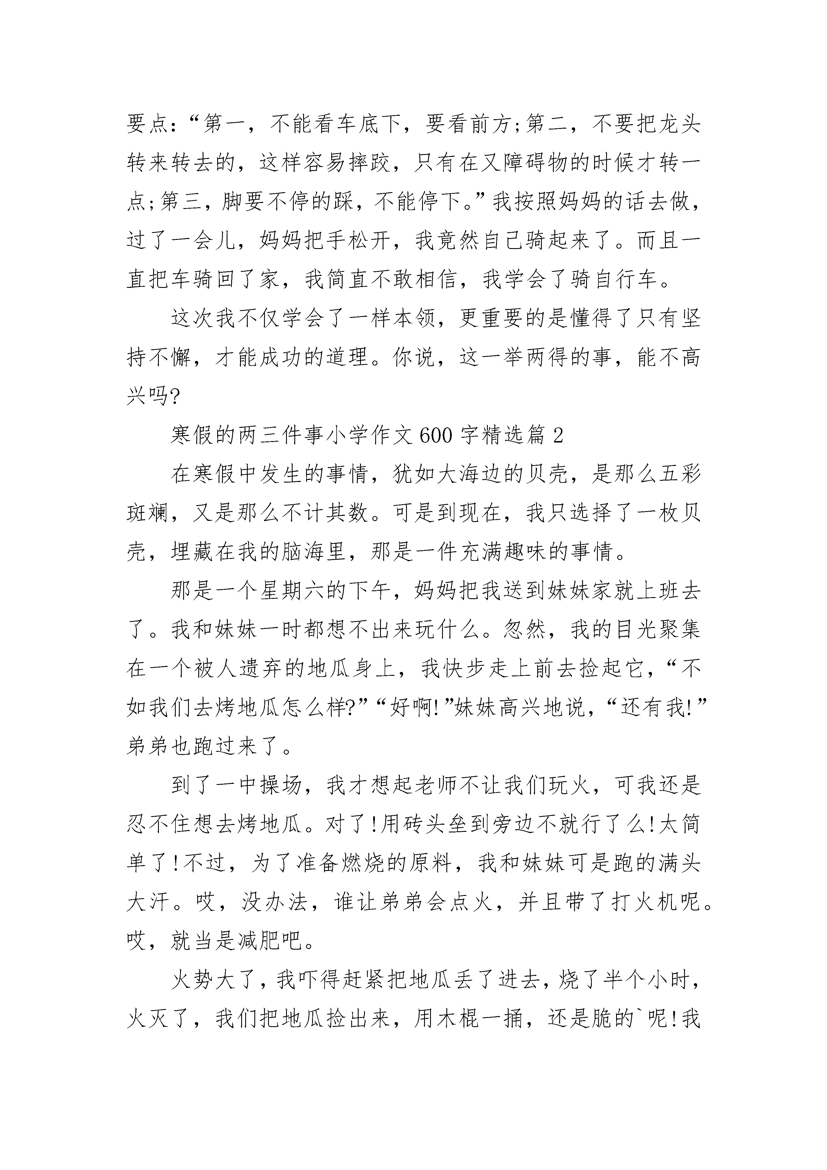 寒假的两三件事小学作文600字(精选5篇)寒假的两三件事小学作文600字精选篇1寒假里,我经历了许多的事。有伤心事,有新鲜事……在我记忆中最深刻的,还是那件事了。那是一个大晴天,妈妈突然提起了我那个向往以久的心愿:“我去给你买自行车,好吗?”“太棒了!太棒了!你真是好妈妈!”我情不自禁地又蹦又跳。过了一会儿,我和妈妈便来到了自行车行,我一进车行,第一眼就看中了那辆紫红色的自行车。“妈妈,就要这辆,就要这辆……”妈妈也拗不过我,便买下了。嘿!还别说,这辆真漂亮。是紫红色的,使它显的格外的秀气。还没有等我高兴完,新的问题又来了,我还不会骑呢!不然买了可是浪费!这可怎么办呀?现在的选择:“学呗!”可我从来就胆小怕死,不过这回我看在自行车的份上,咬咬牙,学吧!我小心翼翼地在座板上坐好了,心中像有很多的水桶打水,七上八下的,不一会便摇晃起来;晃呀,晃呀地摔倒了,我强行站起来,拍拍身上的灰尘,心中埋怨道:“我是学不会的了!”妈妈好像看穿了我的心思,走过来语重心长的对我说:“继续,再来。做什么事都没有那么简单的,你要记住:坚持不懈,直到成功!你一定能行的!”妈妈这番话,使我增加了信心。我扶起车子又坐上去,妈妈在前面帮我撑稳龙头,我用脚踩着踏板。妈妈边扶边给我讲骑自行车的三个要点:“第一,不能看车底下,要看前方;第二,不要把龙头转来转去的,这样容易摔跤,只有在又障碍物的时候才转一点;第三,脚要不停的踩,不能停下。”我按照妈妈的话去做,过了一会儿,妈妈把手松开,我竟然自己骑起来了。而且一直把车骑回了家,我简直不敢相信,我学会了骑自行车。这次我不仅学会了一样本领,更重要的是懂得了只有坚持不懈,才能成功的道理。你说,这一举两得的事,能不高兴吗?寒假的两三件事小学作文600字精选篇2在寒假中发生的事情,犹如大海边的贝壳,是那么五彩斑斓,又是那么不计其数。可是到现在,我只选择了一枚贝壳,埋藏在我的脑海里,那是一件充满趣味的事情。那是一个星期六的下午,妈妈把我送到妹妹家就上班去了。我和妹妹一时都想不出来玩什么。忽然,我的目光聚集在一个被人遗弃的地瓜身上,我快步走上前去捡起它,“不如我们去烤地瓜怎么样?”“好啊!”妹妹高兴地说,“还有我!”弟弟也跑过来了。到了一中操场,我才想起老师不让我们玩火,可我还是忍不住想去烤地瓜。对了!用砖头垒到旁边不就行了么!太简单了!不过,为了准备燃烧的原料,我和妹妹可是跑的满头大汗。哎,没办法,谁让弟弟会点火,并且带了打火机呢。哎,就当是减肥吧。火势大了,我吓得赶紧把地瓜丢了进去,烧了半个小时,火灭了,我们把地瓜捡出来,用木棍一捅,还是脆的`呢!我们不灰心,又点了一次。这次我们正烧正聊,再也不觉得时间过得慢了,就这样,我们把火烧到了5点。我再也没有耐心了,我把地瓜捡起来,用木棍狠狠地捅了一下地瓜,一下子透了一半!我们欣喜若狂,赶紧把皮揭下来,咬了一口,虽然说还没熟透,但歪打正着,外边的地瓜又甜又糯,里面的又甜又脆,我们都尝到了自己亲手DIY的食物,都觉得它是人间!我们也算尝到了胜利的果实了。这枚充满趣味的贝壳将使我终身难忘。寒假的两三件事小学作文600字精选篇3在寒假里,最开心的事莫过于我在山上的那一天了。在那天里发生了一件有趣的事,那就是我戏弄我姐姐了。刚一放假,我妈妈就叫我上山去。我便爽快地答应了,在上去那天,哥哥、姐姐也一同顺便随我上山去玩。在爬山的途中,我突然想到了一个“鬼主意”我心想:在山上就只有几天,我不如戏弄一下姐姐。这样也好玩一些呀!哈、哈、哈……到了家里,我立刻向姐姐说:“姐姐,我们到山上的竹林里去玩会儿吧!”好啊!“姐姐很豪爽地答应了。走进竹林里。我立刻向姐姐大喊:“姐姐,你快看你的身后。”说完,我立刻又装出很吃惊的表情看着姐姐的后面(其实什么也没有)。姐姐顺着我的表情往后面看去。就在这时,我以极快的速度把姐姐挎包里的东西,就是一本书拿走,然后就飞奔而去。迅速穿过竹子林,回到家中,然后把书藏在衣服里(因为是冬天,所以从不容易暴露)。这时候,姐姐也“狂奔”过来,一边呼气一边又气喘吁吁地向我说“妹妹,你快把书交出来。”我装成莫名其妙的样子向姐姐说:“我什么时候拿你的书了。再说了,你说我拿你的书也要有证据呀!证据呢?在哪啊?”姐姐被气得说不出话来,这时候,哥哥来了,哥哥对姐姐说:“姐,我借你的书呢?”姐姐生气地说:“在妹妹那里!”接着就把事情的经过告诉了哥哥。哥哥灵机一动对我说:“妹妹,如果你把东西拿了你会藏哪儿啊?我相信不是你拿我的书的,所以,教我一下呗!”我哥哥这么一说,我也就放松了警惕了,于是便脱口而出:“当然是藏在我的衣服里呀!”哥哥一听,便立刻一摸衣服边上。硬硬的,把它取出来看,果然是书。哥哥笑着对我说:“你呀,真够调皮的!”我便模仿哥哥的口音:“你呀,真够调皮的!“说完,我们三人又笑成一团了。寒假