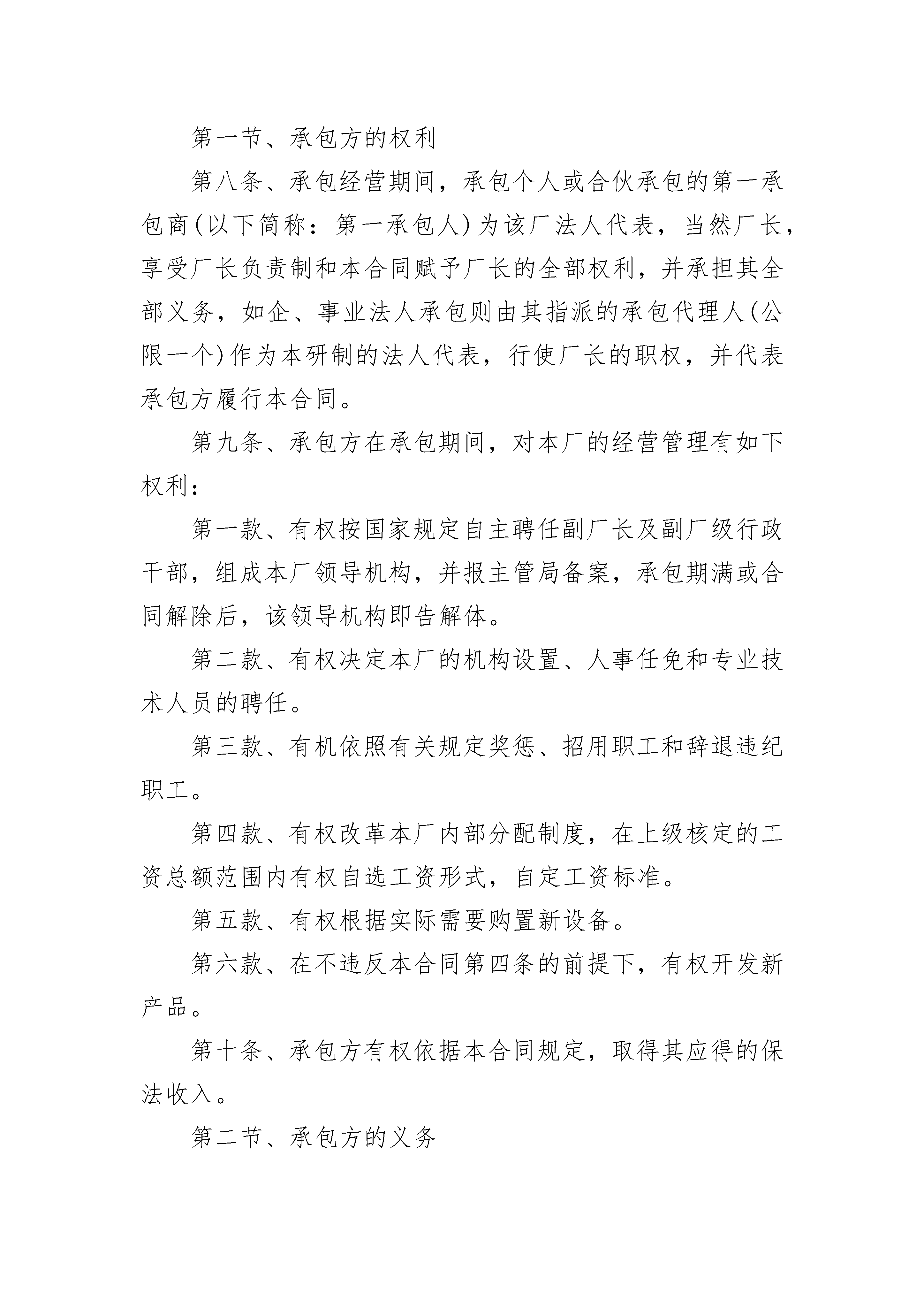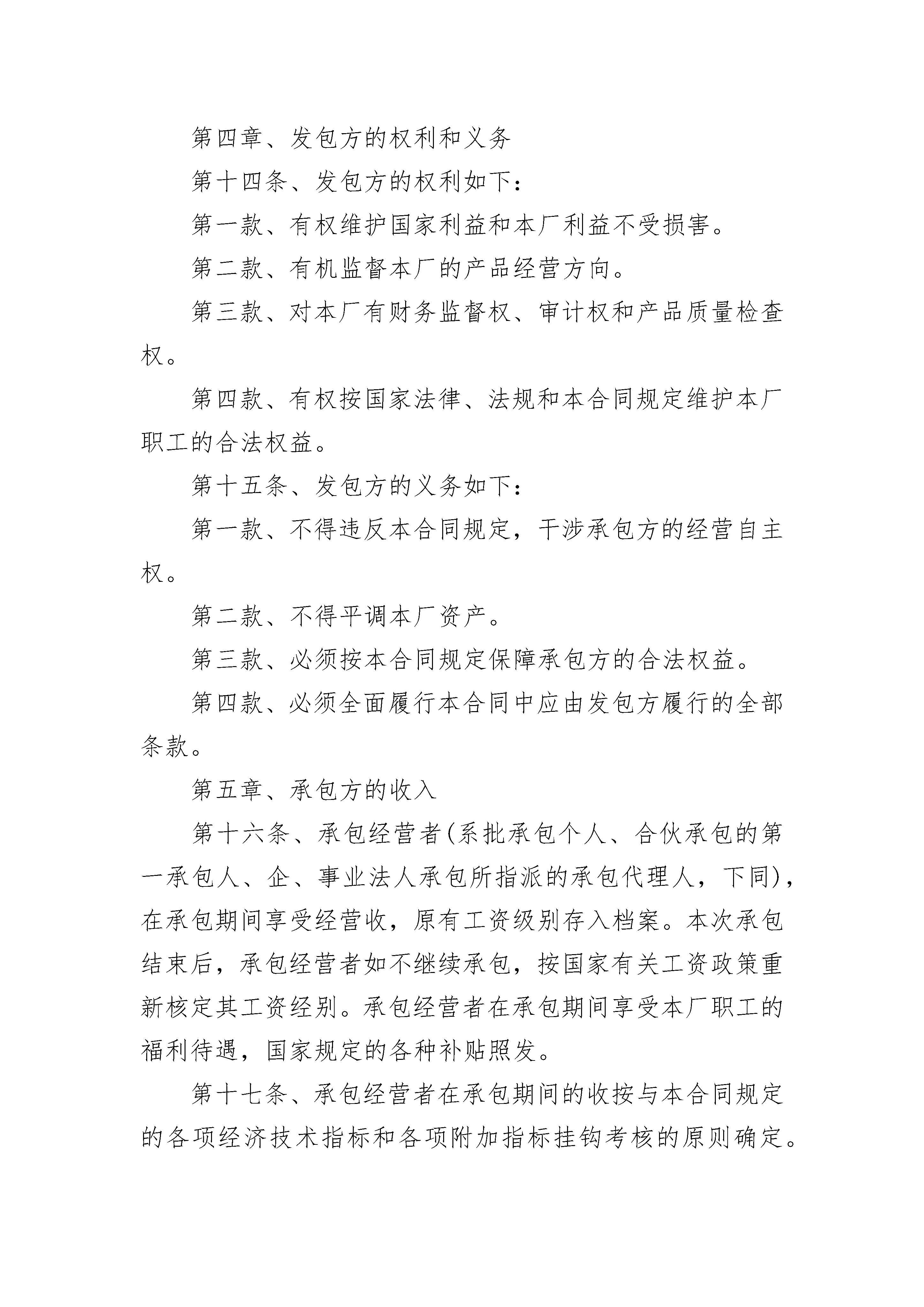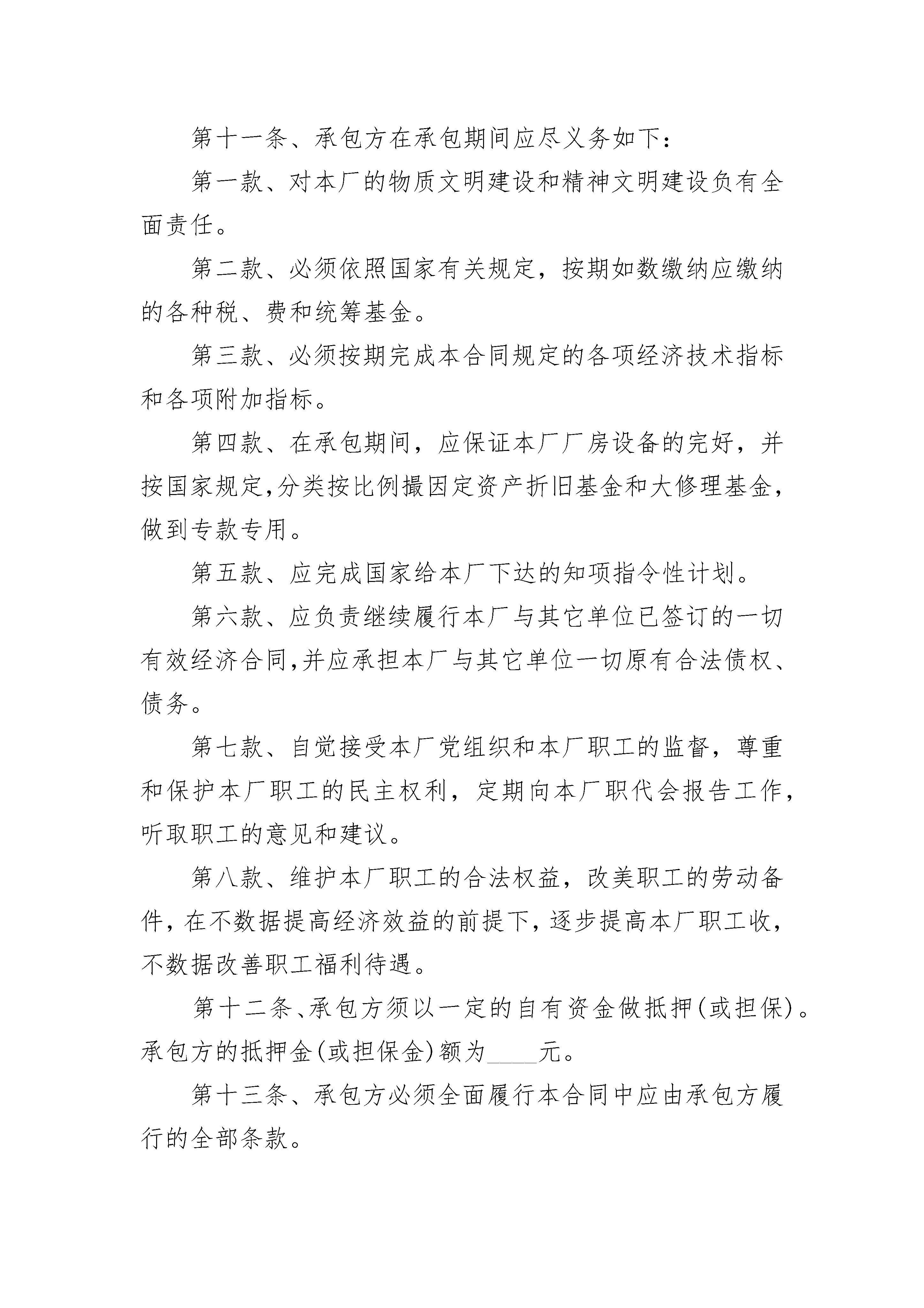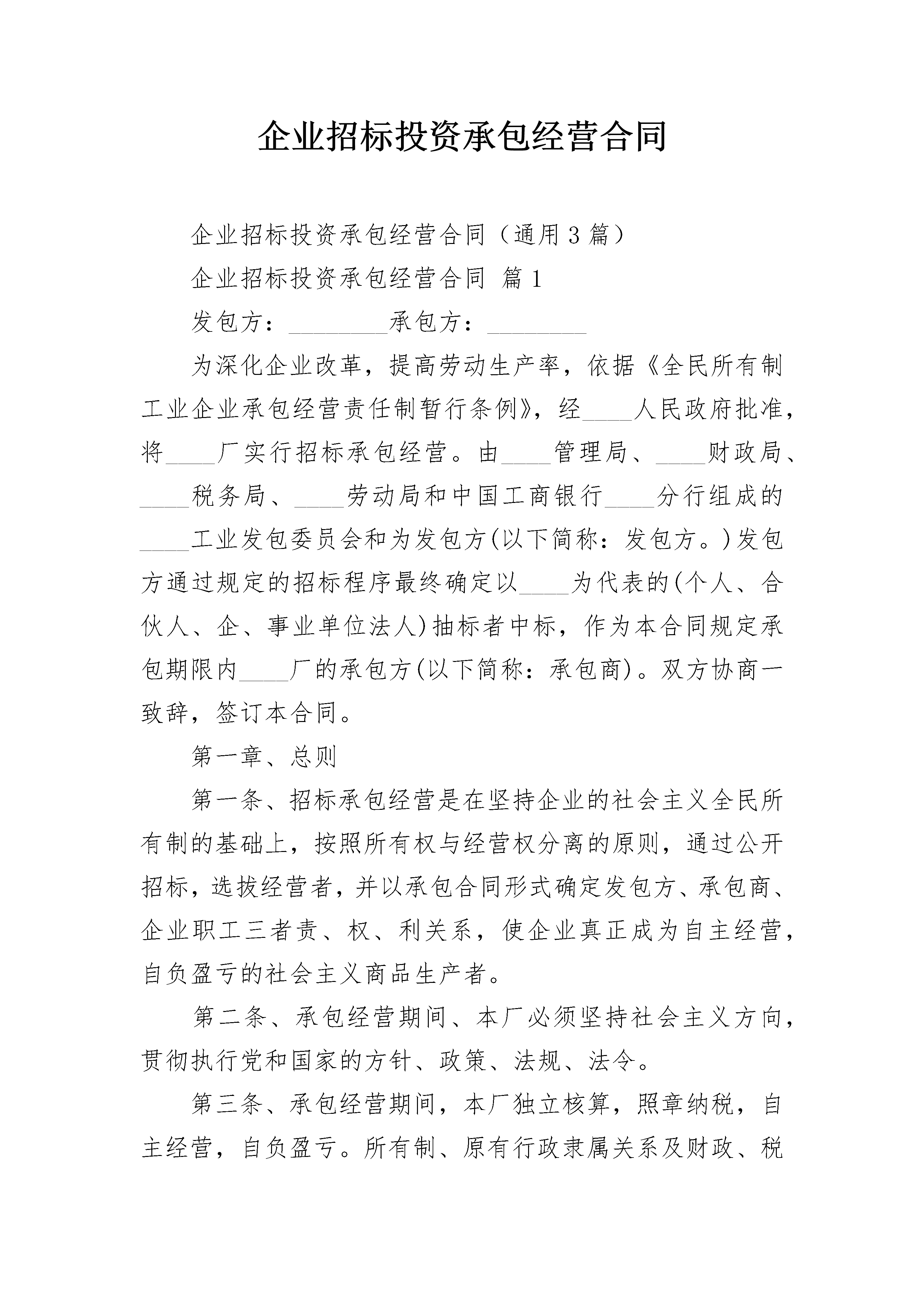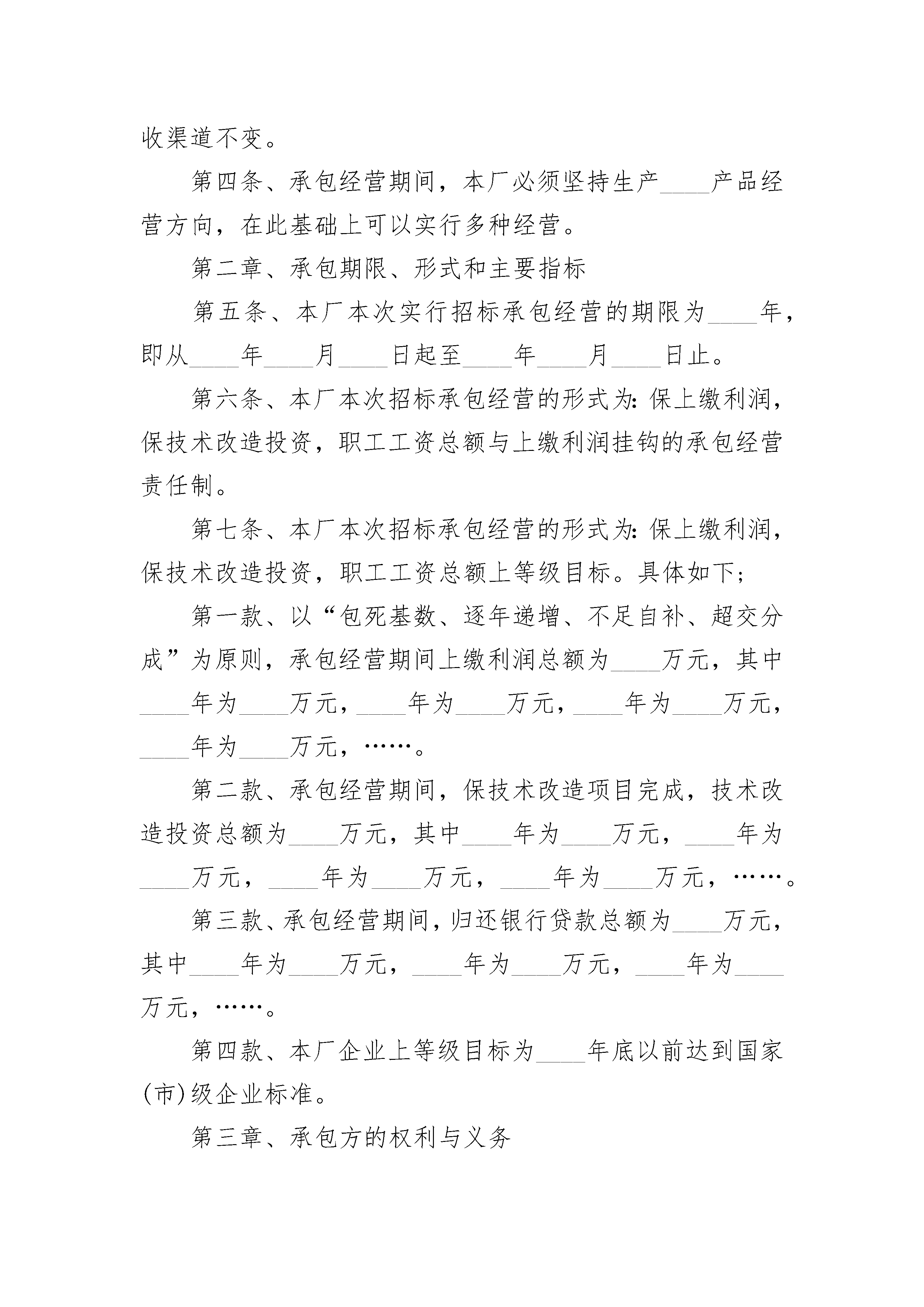 企业招标投资承包经营合同企业招标投资承包经营合同(通用3篇)企业招标投资承包经营合同篇1发包方:________承包方:________为深化企业改革,提高劳动生产率,依据《全民所有制工业企业承包经营责任制暂行条例》,经____人民政府批准,将____厂实行招标承包经营。由____管理局、____财政局、____税务局、____劳动局和中国工商银行____分行组成的____工业发包委员会和为发包方(以下简称:发包方。)发包方通过规定的招标程序最终确定以____为代表的(个人、合伙人、企、事业单位法人)抽标者中标,作为本合同规定承包期限内____厂的承包方(以下简称:承包商)。双方协商一致辞,签订本合同。第一章、总则第一条、招标承包经营是在坚持企业的社会主义全民所有制的基础上,按照所有权与经营权分离的原则,通过公开招标,选拔经营者,并以承包合同形式确定发包方、承包商、企业职工三者责、权、利关系,使企业真正成为自主经营,自负盈亏的社会主义商品生产者。第二条、承包经营期间、本厂必须坚持社会主义方向,贯彻执行党和国家的方针、政策、法规、法令。第三条、承包经营期间,本厂独立核算,照章纳税,自主经营,自负盈亏。所有制、原有行政隶属关系及财政、税收渠道不变。第四条、承包经营期间,本厂必须坚持生产____产品经营方向,在此基础上可以实行多种经营。第二章、承包期限、形式和主要指标第五条、本厂本次实行招标承包经营的期限为____年,即从____年____月____日起至____年____月____日止。第六条、本厂本次招标承包经营的形式为:保上缴利润,保技术改造投资,职工工资总额与上缴利润挂钩的承包经营责任制。第七条、本厂本次招标承包经营的形式为:保上缴利润,保技术改造投资,职工工资总额上等级目标。具体如下;第一款、以“包死基数、逐年递增、不足自补、超交分成”为原则,承包经营期间上缴利润总额为____万元,其中____年为____万元,____年为____万元,____年为____万元,____年为____万元,……。第二款、承包经营期间,保技术改造项目完成,技术改造投资总额为____万元,其中____年为____万元,____年为____万元,____年为____万元,____年为____万元,……。第三款、承包经营期间,归还银行贷款总额为____万元,其中____年为____万元,____年为____万元,____年为____万元,……。第四款、本厂企业上等级目标为____年底以前达到国家(市)级企业标准。第三章、承包方的权利与义务第一节、承包方的权利第八条、承包经营期间,承包个人或合伙承包的第一承包商(以下简称:第一承包人)为该厂法人代表,当然厂长,享受厂长负责制和本合同赋予厂长的全部权利,并承担其全部义务,如企、事业法人承包则由其指派的承包代理人(公限一个)作为本研制的法人代表,行使厂长的职权,并代表承包方履行本合同。第九条、承包方在承包期间,对本厂的经营管理有如下权利:第一款、有权按国家规定自主聘任副厂长及副厂级行政干部,组成本厂领导机构,并报主管局备案,承包期满或合同解除后,该领导机构即告解体。第二款、有权决定本厂的机构设置、人事任免和专业技术人员的聘任。第三款、有机依照有关规定奖惩、招用职工和辞退违纪职工。第四款、有权改革本厂内部分配制度,在上级核定的工资总额范围内有权自选工资形式,自定工资标准。第五款、有权根据实际需要购置新设备。第六款、在不违反本合同第四条的前提下,有权开发新产品。第十条、承包方有权依据本合同规定,取得其应得的保法收入。第二节、承包方的义务第十一条、承包方在承包期间应尽义务如下:第一款、对本厂的物质文明建设和精神文明建设负有全面责任。第二款、必须依照国家有关规定,按期如数缴纳应缴纳的各种税、费和统筹基金。第三款、必须按期完成本合同规定的各项经济技术指标和各项附加指标。第四款、在承包期间,应保证本厂厂房设备的完好,并按国家规定,分类按比例撮因定资产折旧基金和大修理基金,做到专款专用。第五款、应完成国家给本厂下达的知项指令性计划。第六款、应负责继续履行本厂与其它单位已签订的一切有效经济合同,并应承担本厂与其它单位一切原有合法债权、债务。第七款、自觉接受本厂党组织和本厂职工的监督,尊重和保护本厂职工的民主权利,定期向本厂职代会报告工作,听取职工的意见和建议。第八款、维护本厂职工的合法权益,改美职工的劳动备件,在不数据提高经济效益的前提下,逐步提高本厂职工收,不数据改善职工福利待遇。第十二条、承包方须以一定的自有资金做抵押(或担保)。承包方的抵押金(或担保金)额为____元。第十三条、承包方必须全面履行本合同中应由承包方履行的全部条款。第四章、发包方的权利和义务第十四条、发包方的权利如下:第一款、有权维护国家利益和本