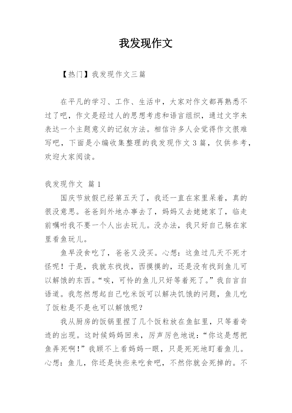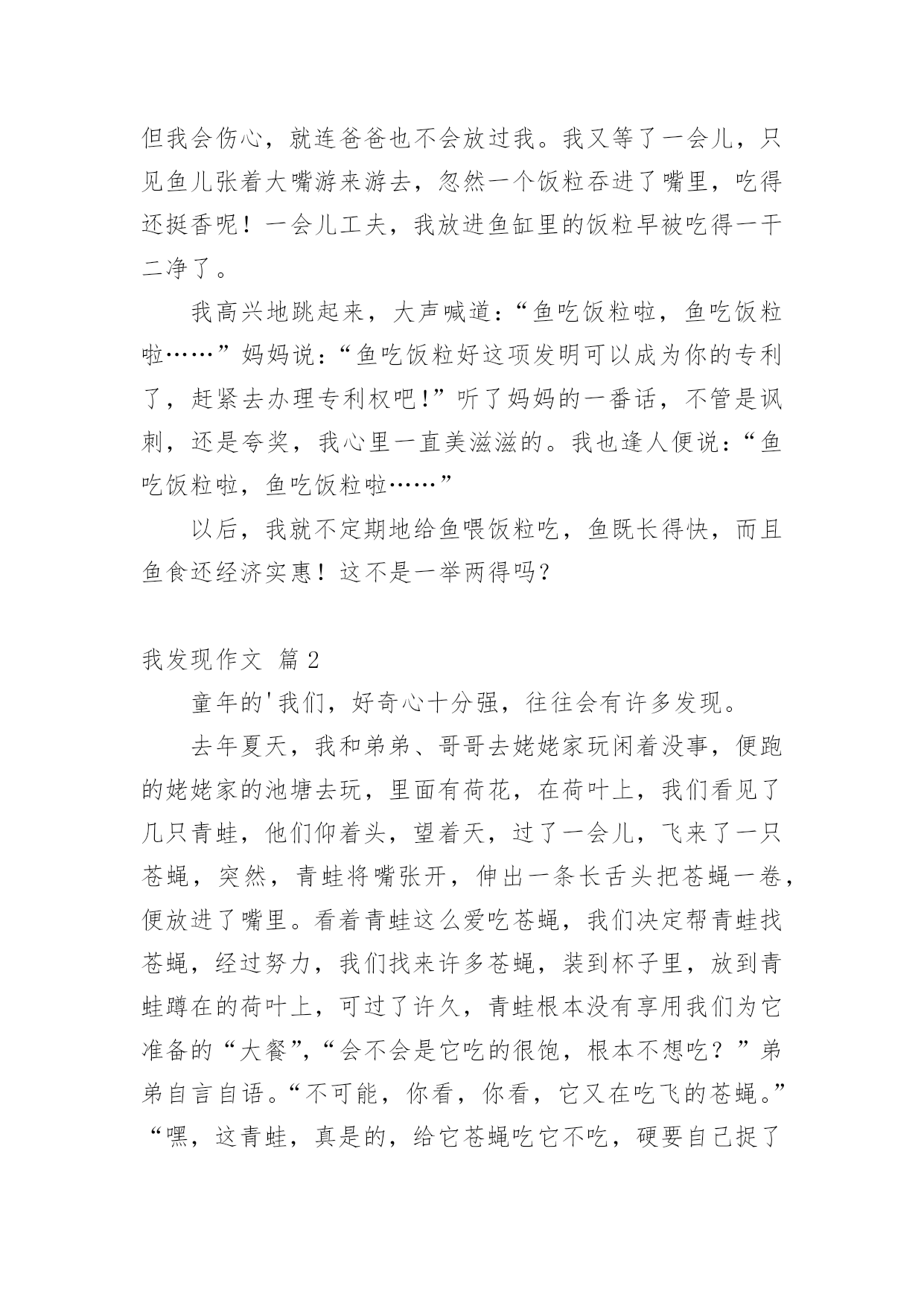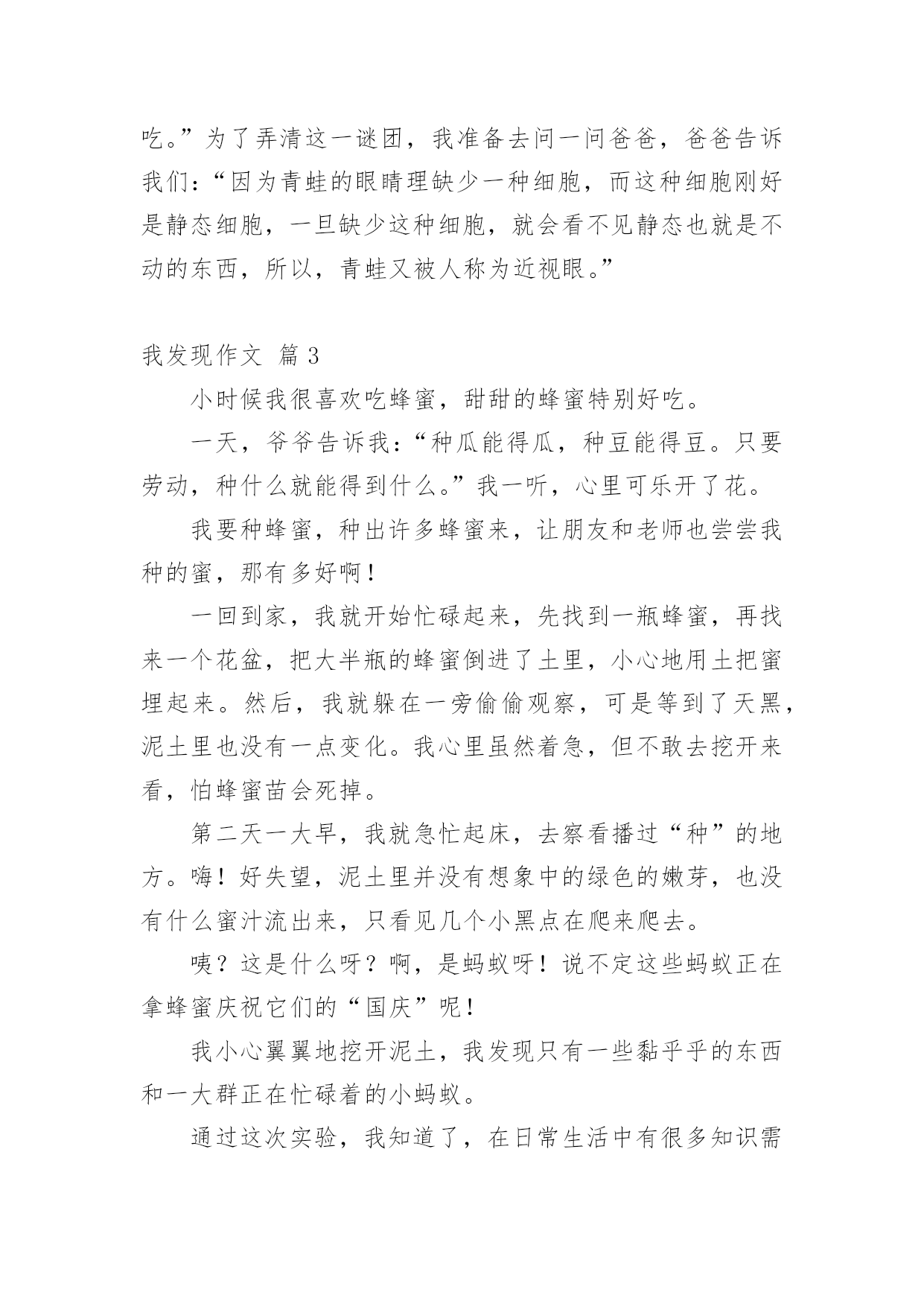 我发现作文 【热门】我发现作文三篇在平凡的学习、工作、生活中,大家对作文都再熟悉不过了吧,作文是经过人的思想考虑和语言组织,通过文字来表达一个主题意义的记叙方法。相信许多人会觉得作文很难写吧,下面是小编收集整理的我发现作文3篇,仅供参考,欢迎大家阅读。我发现作文篇1国庆节放假已经第五天了,我还一直在家里呆着,真的很没意思。爸爸到外地办事去了,妈妈又去姥姥家了,临走前嘱咐我不要一个人出去玩儿。没办法,我只好自己躲在家里看鱼玩儿。鱼早没食吃了,爸爸又没买。心想:这鱼过几天不死才怪呢!于是,我就东找找,西摸摸的,还是没有找到鱼儿可以解饿的东西。“唉,可怜的鱼儿只好等着死了。”我自言自语道。我忽然想起自己吃米饭可以解决饥饿的问题,鱼儿吃了饭粒是不是也可以解饿呢?我从厨房的饭锅里捏了几个饭粒放在鱼缸里,只等着奇迹的出现。这时候妈妈回来,厉声厉色地说:“你这是想把鱼弄死啊!”我顾不上看妈妈一眼,只是死死地盯着鱼儿。心想:鱼儿,你还是快些来吃食吧,不然你就会死掉的。不但我会伤心,就连爸爸也不会放过我。我又等了一会儿,只见鱼儿张着大嘴游来游去,忽然一个饭粒吞进了嘴里,吃得还挺香呢!一会儿工夫,我放进鱼缸里的饭粒早被吃得一干二净了。我高兴地跳起来,大声喊道:“鱼吃饭粒啦,鱼吃饭粒啦……”妈妈说:“鱼吃饭粒好这项发明可以成为你的专利了,赶紧去办理专利权吧!”听了妈妈的一番话,不管是讽刺,还是夸奖,我心里一直美滋滋的。我也逢人便说:“鱼吃饭粒啦,鱼吃饭粒啦……”以后,我就不定期地给鱼喂饭粒吃,鱼既长得快,而且鱼食还经济实惠!这不是一举两得吗?我发现作文篇2童年的'我们,好奇心十分强,往往会有许多发现。去年夏天,我和弟弟、哥哥去姥姥家玩闲着没事,便跑的姥姥家的池塘去玩,里面有荷花,在荷叶上,我们看见了几只青蛙,他们仰着头,望着天,过了一会儿,飞来了一只苍蝇,突然,青蛙将嘴张开,伸出一条长舌头把苍蝇一卷,便放进了嘴里。看着青蛙这么爱吃苍蝇,我们决定帮青蛙找苍蝇,经过努力,我们找来许多苍蝇,装到杯子里,放到青蛙蹲在的荷叶上,可过了许久,青蛙根本没有享用我们为它准备的“大餐”,“会不会是它吃的很饱,根本不想吃?”弟弟自言自语。“不可能,你看,你看,它又在吃飞的苍蝇。”“嘿,这青蛙,真是的,给它苍蝇吃它不吃,硬要自己捉了吃。”为了弄清这一谜团,我准备去问一问爸爸,爸爸告诉我们:“因为青蛙的眼睛理缺少一种细胞,而这种细胞刚好是静态细胞,一旦缺少这种细胞,就会看不见静态也就是不动的东西,所以,青蛙又被人称为近视眼。”我发现作文篇3小时候我很喜欢吃蜂蜜,甜甜的蜂蜜特别好吃。一天,爷爷告诉我:“种瓜能得瓜,种豆能得豆。只要劳动,种什么就能得到什么。”我一听,心里可乐开了花。我要种蜂蜜,种出许多蜂蜜来,让朋友和老师也尝尝我种的蜜,那有多好啊!一回到家,我就开始忙碌起来,先找到一瓶蜂蜜,再找来一个花盆,把大半瓶的蜂蜜倒进了土里,小心地用土把蜜埋起来。然后,我就躲在一旁偷偷观察,可是等到了天黑,泥土里也没有一点变化。我心里虽然着急,但不敢去挖开来看,怕蜂蜜苗会死掉。第二天一大早,我就急忙起床,去察看播过“种”的地方。嗨!好失望,泥土里并没有想象中的绿色的嫩芽,也没有什么蜜汁流出来,只看见几个小黑点在爬来爬去。咦?这是什么呀?啊,是蚂蚁呀!说不定这些蚂蚁正在拿蜂蜜庆祝它们的“国庆”呢!我小心翼翼地挖开泥土,我发现只有一些黏乎乎的东西和一大群正在忙碌着的小蚂蚁。通过这次实验,我知道了,在日常生活中有很多知识需要我们去观察,去发现。只有亲自实践,不断发现,你才会有新的收获!