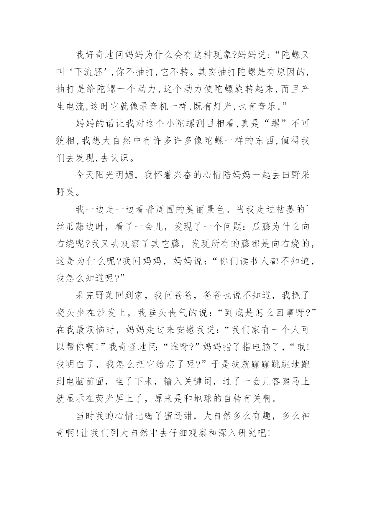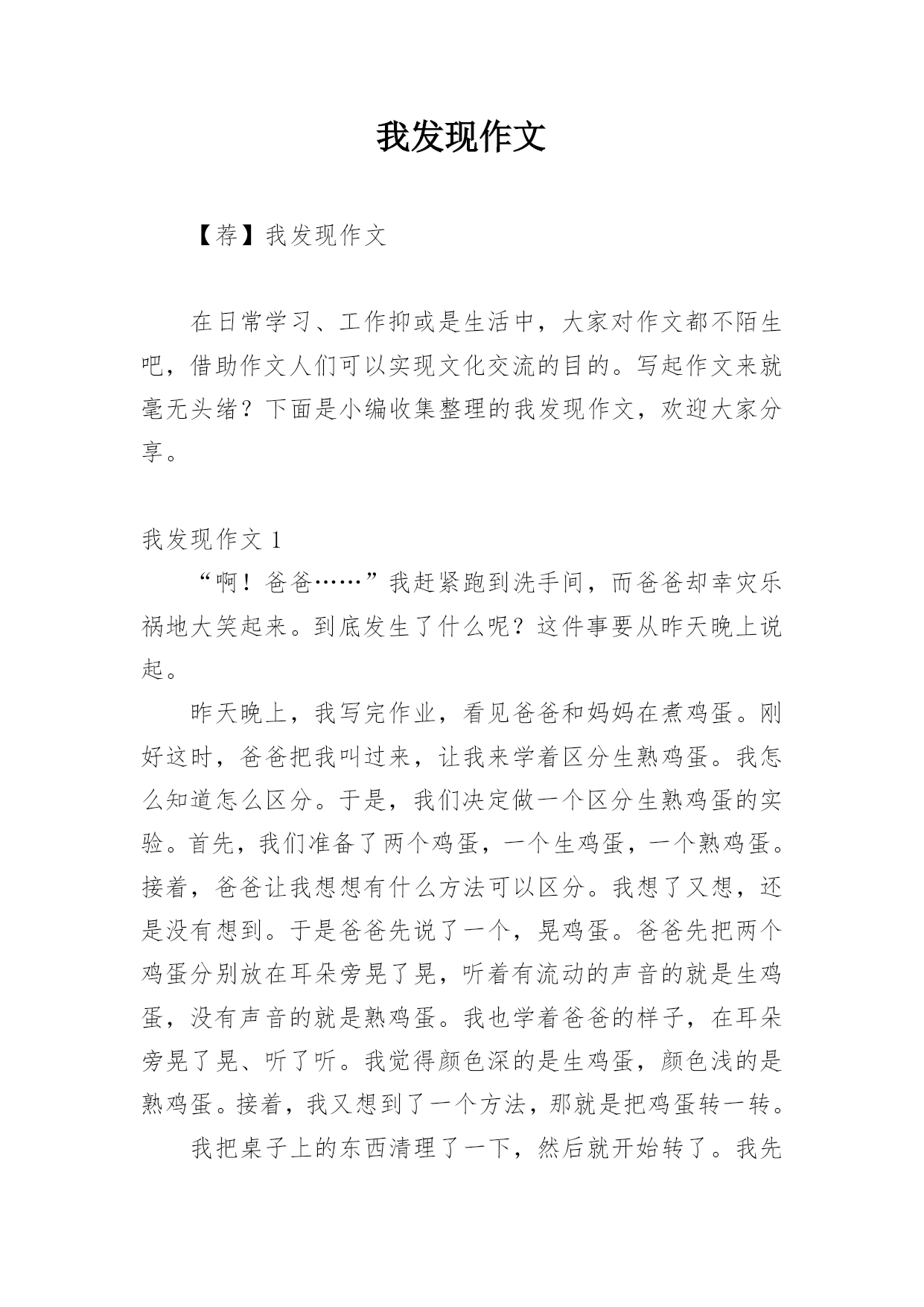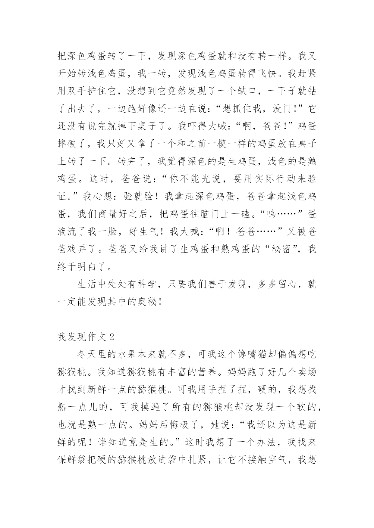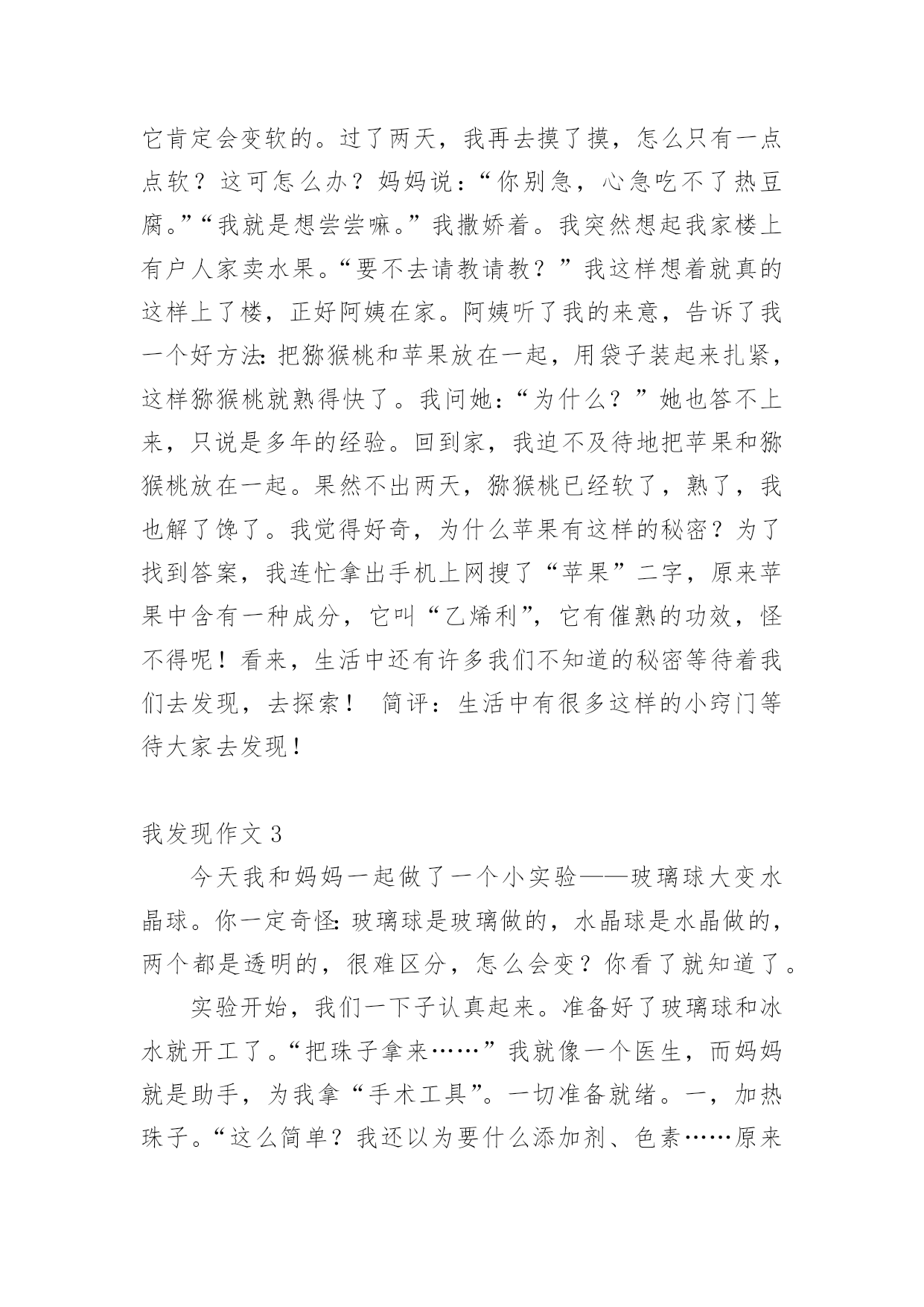 我发现作文 【荐】我发现作文在日常学习、工作抑或是生活中,大家对作文都不陌生吧,借助作文人们可以实现文化交流的目的。写起作文来就毫无头绪?下面是小编收集整理的我发现作文,欢迎大家分享。我发现作文1“啊!爸爸……”我赶紧跑到洗手间,而爸爸却幸灾乐祸地大笑起来。到底发生了什么呢?这件事要从昨天晚上说起。昨天晚上,我写完作业,看见爸爸和妈妈在煮鸡蛋。刚好这时,爸爸把我叫过来,让我来学着区分生熟鸡蛋。我怎么知道怎么区分。于是,我们决定做一个区分生熟鸡蛋的实验。首先,我们准备了两个鸡蛋,一个生鸡蛋,一个熟鸡蛋。接着,爸爸让我想想有什么方法可以区分。我想了又想,还是没有想到。于是爸爸先说了一个,晃鸡蛋。爸爸先把两个鸡蛋分别放在耳朵旁晃了晃,听着有流动的声音的就是生鸡蛋,没有声音的就是熟鸡蛋。我也学着爸爸的样子,在耳朵旁晃了晃、听了听。我觉得颜色深的是生鸡蛋,颜色浅的是熟鸡蛋。接着,我又想到了一个方法,那就是把鸡蛋转一转。我把桌子上的东西清理了一下,然后就开始转了。我先把深色鸡蛋转了一下,发现深色鸡蛋就和没有转一样。我又开始转浅色鸡蛋,我一转,发现浅色鸡蛋转得飞快。我赶紧用双手护住它,没想到它竟然发现了一个缺口,一下子就钻了出去了,一边跑好像还一边在说:“想抓住我,没门!”它还没有说完就掉下桌子了。我吓得大喊:“啊,爸爸!”鸡蛋摔破了,我只好又拿了一个和之前一模一样的鸡蛋放在桌子上转了一下。转完了,我觉得深色的是生鸡蛋,浅色的是熟鸡蛋。这时,爸爸说:“你不能光说,要用实际行动来验证。”我心想:验就验!我拿起深色鸡蛋,爸爸拿起浅色鸡蛋,我们商量好之后,把鸡蛋往脑门上一磕。“呜……”蛋液流了我一脸,好生气!我大喊:“啊!爸爸……”又被爸爸戏弄了。爸爸又给我讲了生鸡蛋和熟鸡蛋的“秘密”,我终于明白了。生活中处处有科学,只要我们善于发现,多多留心,就一定能发现其中的奥秘!我发现作文2冬天里的水果本来就不多,可我这个馋嘴猫却偏偏想吃猕猴桃。我知道猕猴桃有丰富的营养。妈妈跑了好几个卖场才找到新鲜一点的猕猴桃。可我用手捏了捏,硬的,我想找熟一点儿的,可我摸遍了所有的猕猴桃却没发现一个软的,也就是熟一点的。妈妈后悔极了,她说:“我还以为这是新鲜的呢!谁知道竟是生的。”这时我想了一个办法,我找来保鲜袋把硬的猕猴桃放进袋中扎紧,让它不接触空气,我想它肯定会变软的。过了两天,我再去摸了摸,怎么只有一点点软?这可怎么办?妈妈说:“你别急,心急吃不了热豆腐。”“我就是想尝尝嘛。”我撒娇着。我突然想起我家楼上有户人家卖水果。“要不去请教请教?”我这样想着就真的这样上了楼,正好阿姨在家。阿姨听了我的来意,告诉了我一个好方法:把猕猴桃和苹果放在一起,用袋子装起来扎紧,这样猕猴桃就熟得快了。我问她:“为什么?”她也答不上来,只说是多年的经验。回到家,我迫不及待地把苹果和猕猴桃放在一起。果然不出两天,猕猴桃已经软了,熟了,我也解了馋了。我觉得好奇,为什么苹果有这样的秘密?为了找到答案,我连忙拿出手机上网搜了“苹果”二字,原来苹果中含有一种成分,它叫“乙烯利”,它有催熟的功效,怪不得呢!看来,生活中还有许多我们不知道的秘密等待着我们去发现,去探索!简评:生活中有很多这样的小窍门等待大家去发现!我发现作文3今天我和妈妈一起做了一个小实验——玻璃球大变水晶球。你一定奇怪:玻璃球是玻璃做的,水晶球是水晶做的,两个都是透明的,很难区分,怎么会变?你看了就知道了。实验开始,我们一下子认真起来。准备好了玻璃球和冰水就开工了。“把珠子拿来……”我就像一个医生,而妈妈就是助手,为我拿“手术工具”。一切准备就绪。一,加热珠子。“这么简单?我还以为要什么添加剂、色素……原来这么简单。”我随手把玻璃珠子往碗里一放就准备往微波炉里放,“停。”妈妈叫住我,“为什么停下来呢?”我有些不明白,”因为微波炉只能加热含水的东西,玻璃里没有水,无法加热的。”做水晶球怎么这么烦,无奈,只好把这些“贵妇”送进“豪宅”——烤箱了。温度250度,限时30分钟。“叮”时间到!打开烤箱门,玻璃珠还是那样啊!我有些失望。“小心烫!用夹子,放进冰水里。”妈妈一旁说道。我夹住玻璃球随手往冰水里一放,“哧唰”一声爆响。“成功了?”呈现在水中的不是原先的晶莹剔透的玻璃珠了,一道道清澈的纹路贯穿整个球体,把原来透明的球体分割个许多块,光线一照宛如水晶球,我成功了!这次实验成功的原理是这样的:玻璃珠在慢慢受热过程中,内外一起膨胀,当加热后快速放入冰水里时,受冷收缩,珠子外部快速收缩,而里面又是热的来不及收缩,于是就从外表面裂开了。我的发现是不是很不错呀?我发现作文4爸爸出差回来,送给我一个小礼物——陀螺,虽然价格不高,但这是爸爸对我的爱,所以我特别喜欢它。陀螺不转的时候,像一顶小帽子。转动的时候闪烁着五颜六色的光环,还传出一阵阵欢快的音