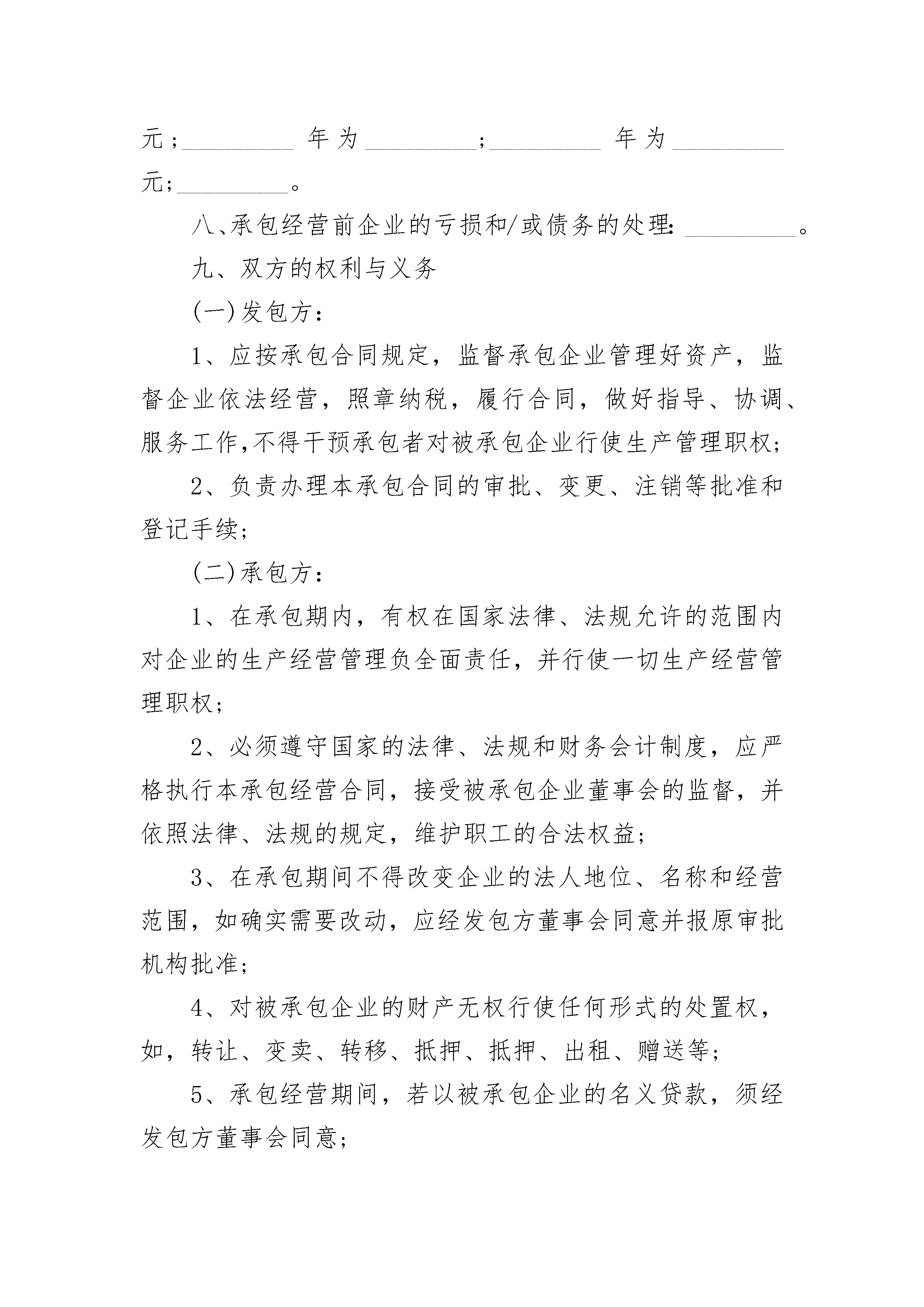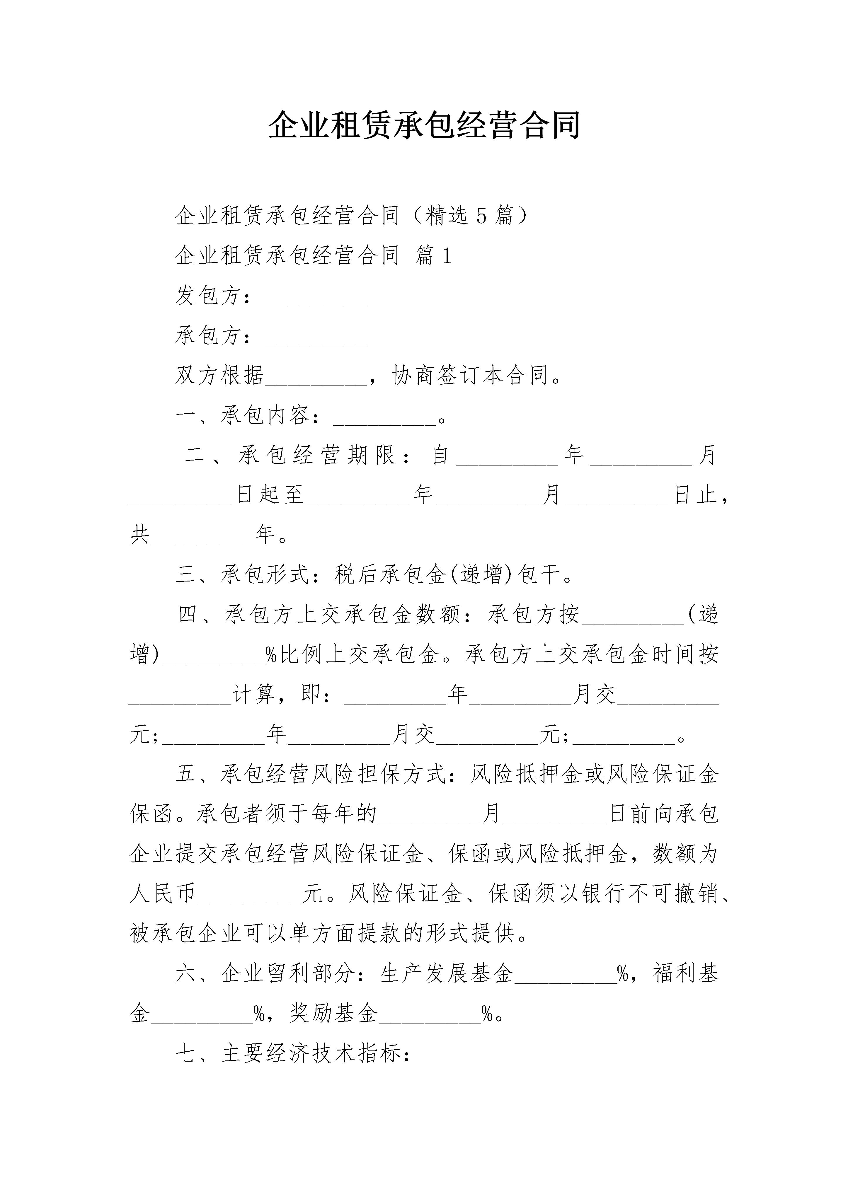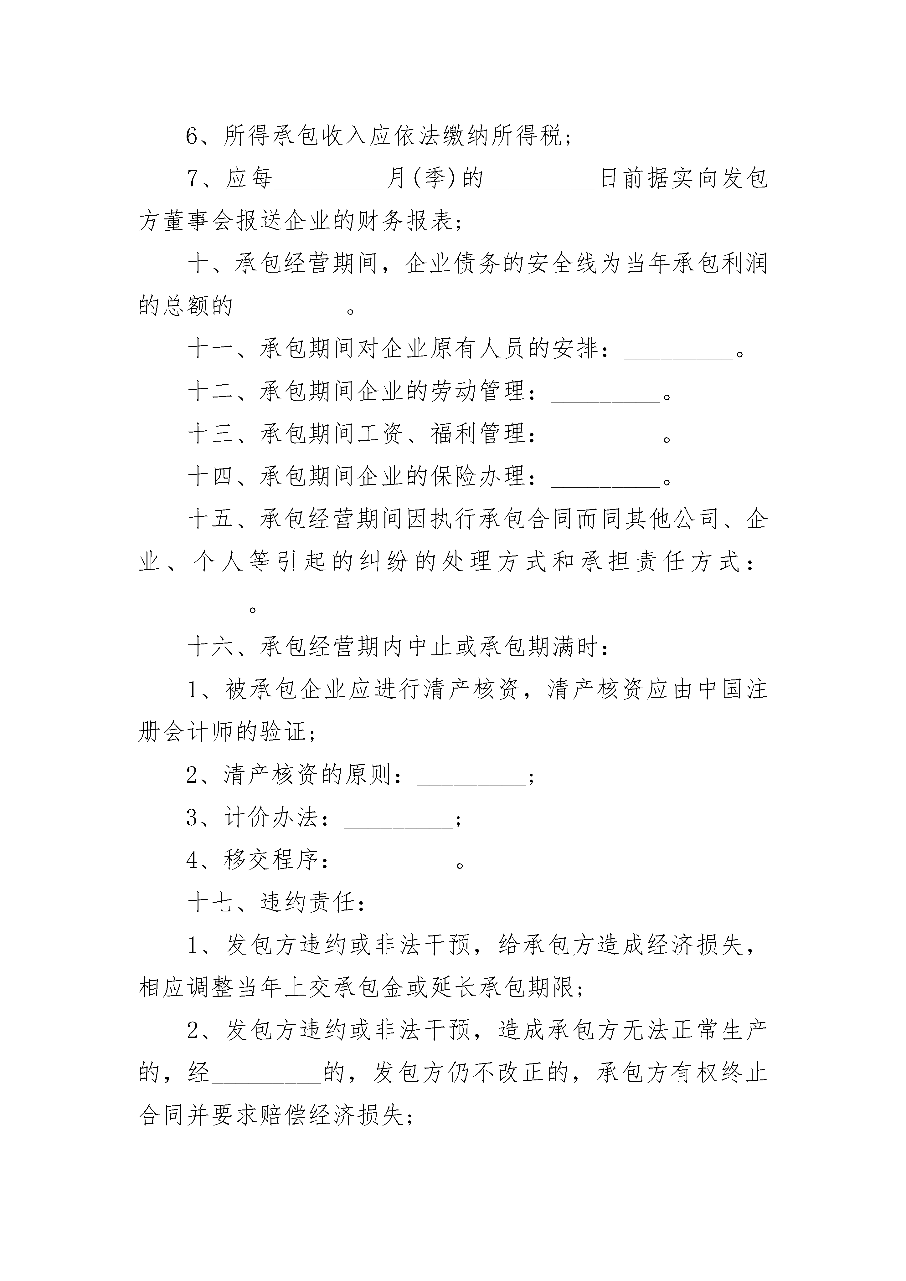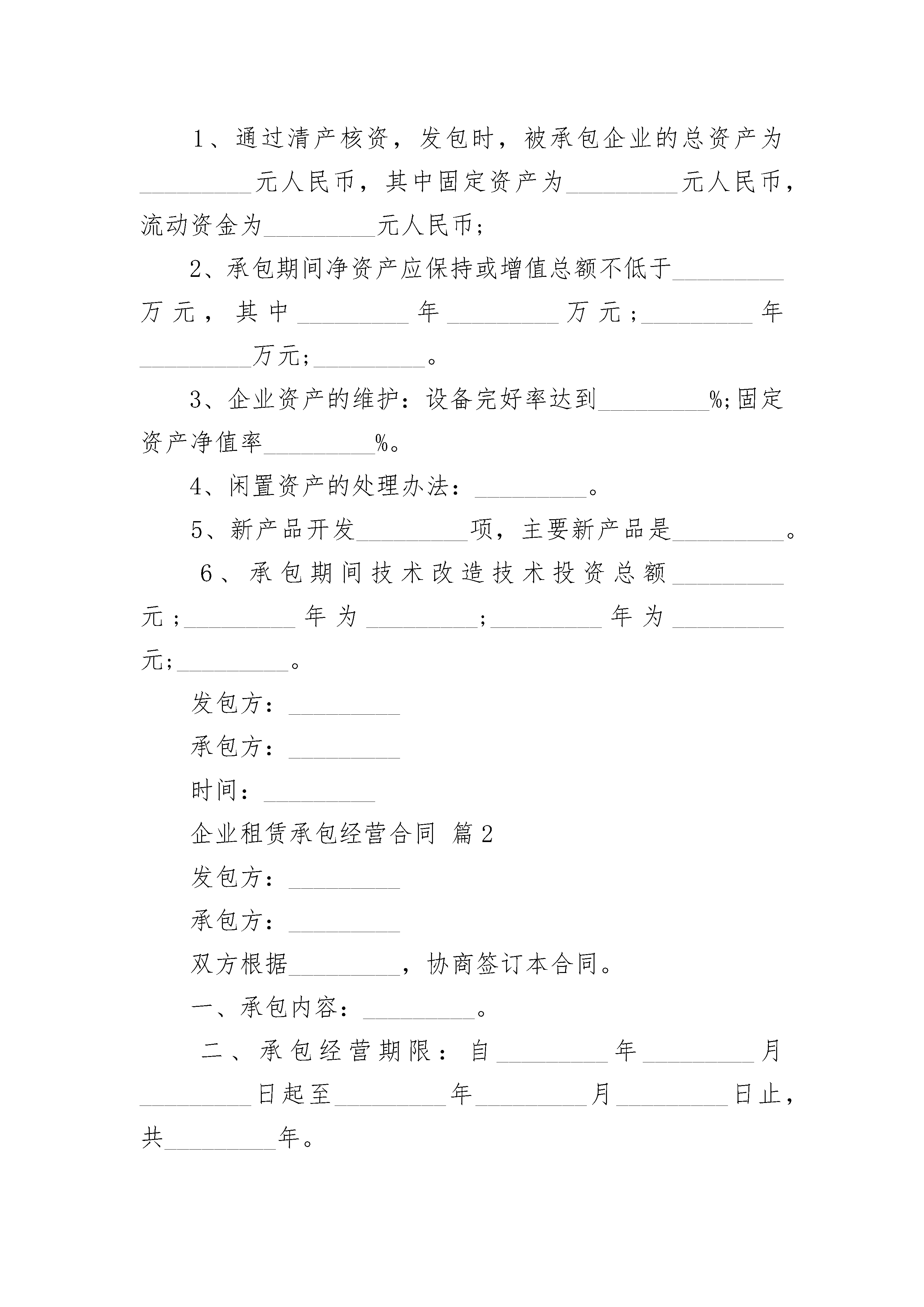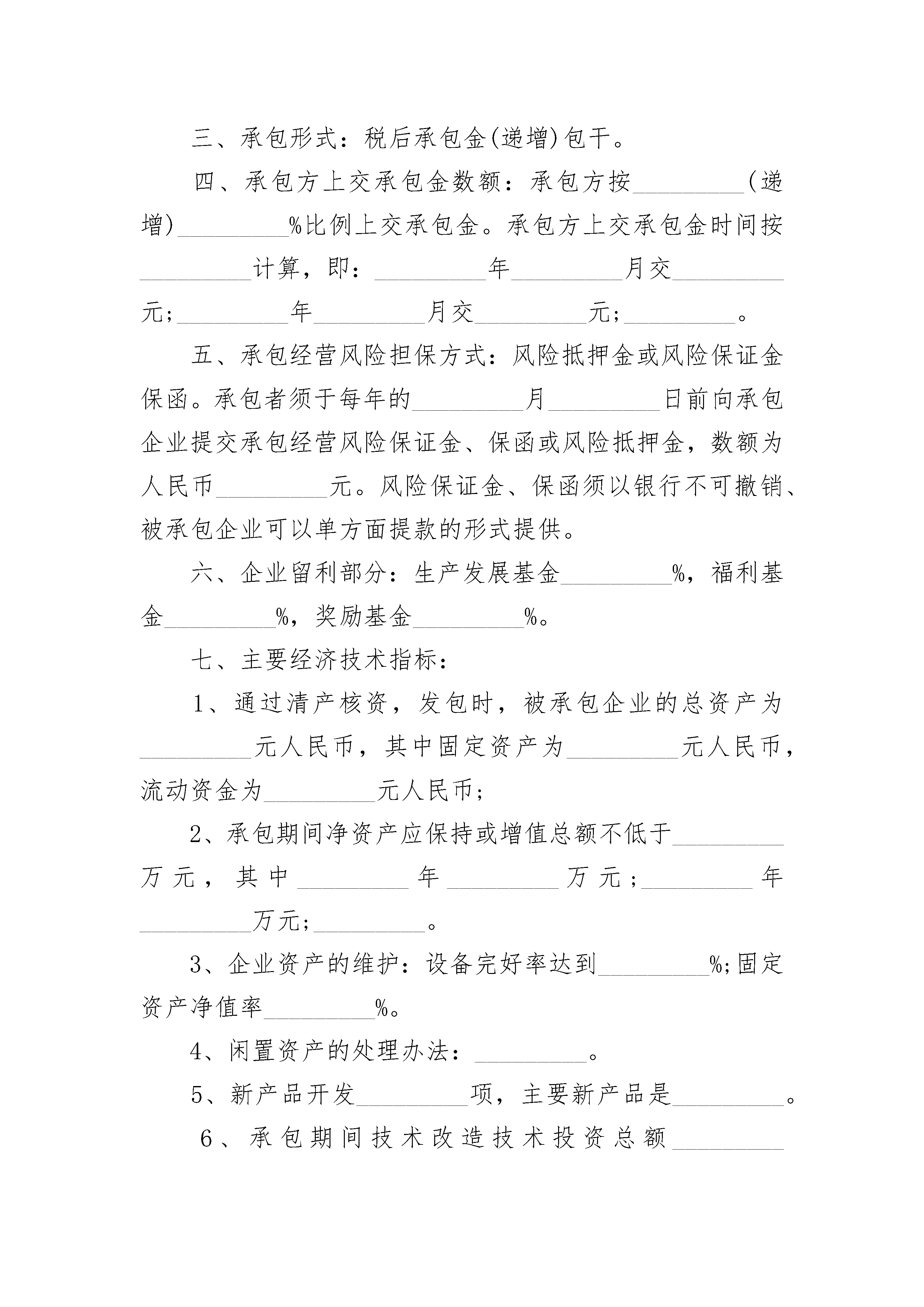 企业租赁承包经营合同企业租赁承包经营合同(精选5篇)企业租赁承包经营合同篇1发包方:_________承包方:_________双方根据_________,协商签订本合同。一、承包内容:_________。二、承包经营期限:自_________年_________月_________日起至_________年_________月_________日止,共_________年。三、承包形式:税后承包金(递增)包干。四、承包方上交承包金数额:承包方按_________(递增)_________%比例上交承包金。承包方上交承包金时间按_________计算,即:_________年_________月交_________元;_________年_________月交_________元;_________。五、承包经营风险担保方式:风险抵押金或风险保证金保函。承包者须于每年的_________月_________日前向承包企业提交承包经营风险保证金、保函或风险抵押金,数额为人民币_________元。风险保证金、保函须以银行不可撤销、被承包企业可以单方面提款的形式提供。六、企业留利部分:生产发展基金_________%,福利基金_________%,奖励基金_________%。七、主要经济技术指标:1、通过清产核资,发包时,被承包企业的总资产为_________元人民币,其中固定资产为_________元人民币,流动资金为_________元人民币;2、承包期间净资产应保持或增值总额不低于_________万元,其中_________年_________万元;_________年_________万元;_________。3、企业资产的维护:设备完好率达到_________%;固定资产净值率_________%。4、闲置资产的处理办法:_________。5、新产品开发_________项,主要新产品是_________。6、承包期间技术改造技术投资总额_________元;_________年为_________;_________年为_________元;_________。发包方:_________承包方:_________时间:_________企业租赁承包经营合同篇2发包方:_________承包方:_________双方根据_________,协商签订本合同。一、承包内容:_________。二、承包经营期限:自_________年_________月_________日起至_________年_________月_________日止,共_________年。三、承包形式:税后承包金(递增)包干。四、承包方上交承包金数额:承包方按_________(递增)_________%比例上交承包金。承包方上交承包金时间按_________计算,即:_________年_________月交_________元;_________年_________月交_________元;_________。五、承包经营风险担保方式:风险抵押金或风险保证金保函。承包者须于每年的_________月_________日前向承包企业提交承包经营风险保证金、保函或风险抵押金,数额为人民币_________元。风险保证金、保函须以银行不可撤销、被承包企业可以单方面提款的形式提供。六、企业留利部分:生产发展基金_________%,福利基金_________%,奖励基金_________%。七、主要经济技术指标:1、通过清产核资,发包时,被承包企业的总资产为_________元人民币,其中固定资产为_________元人民币,流动资金为_________元人民币;2、承包期间净资产应保持或增值总额不低于_________万元,其中_________年_________万元;_________年_________万元;_________。3、企业资产的维护:设备完好率达到_________%;固定资产净值率_________%。4、闲置资产的处理办法:_________。5、新产品开发_________项,主要新产品是_________。6、承包期间技术改造技术投资总额_________元;_________年为_________;_________年为_________元;_________。八、承包经营前企业的亏损和/或债务的处理:_________。九、双方的权利与义务(一)发包方:1、应按承包合同规定,监督承包企业管理好资产,监督企业依法经营,照章纳税,履行合同,做好指导、协调、服务工作,不得干预承包者对被承包企业行使生产管理职权;2、负责办理本承包合同的审批、变更、注销等批准和登记手续;(二)承包方:1、在承包期内,有权在国家法律、法规允