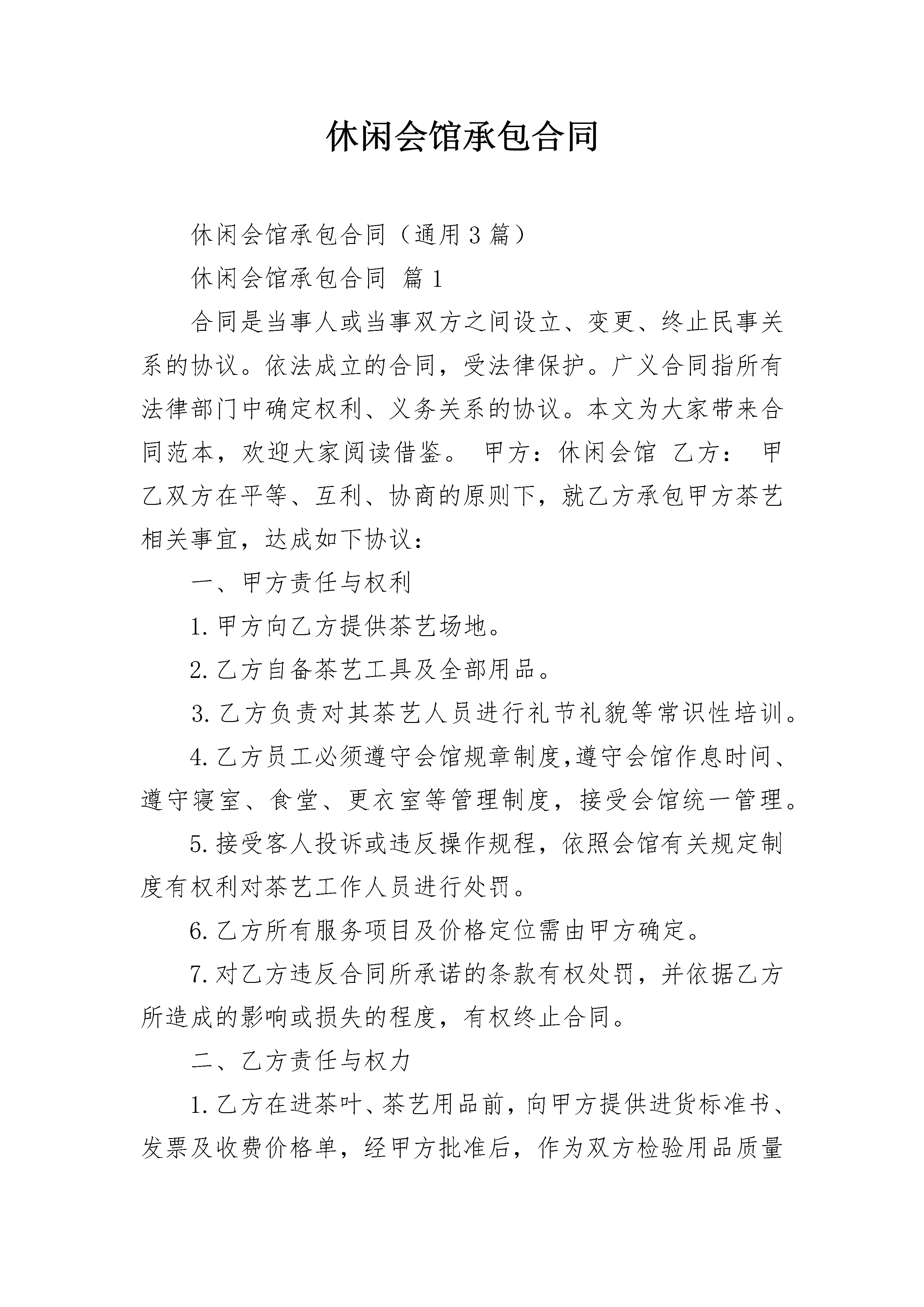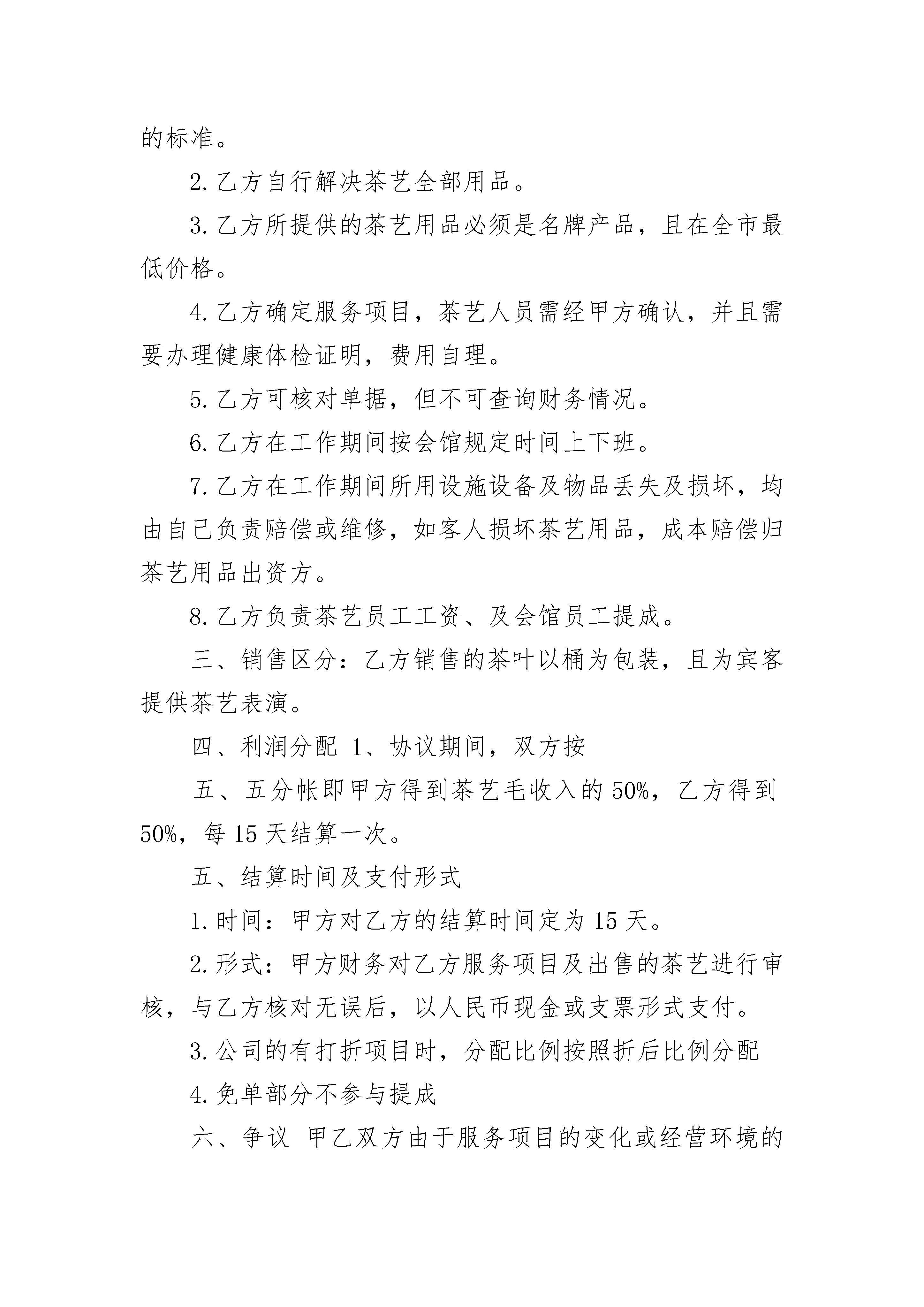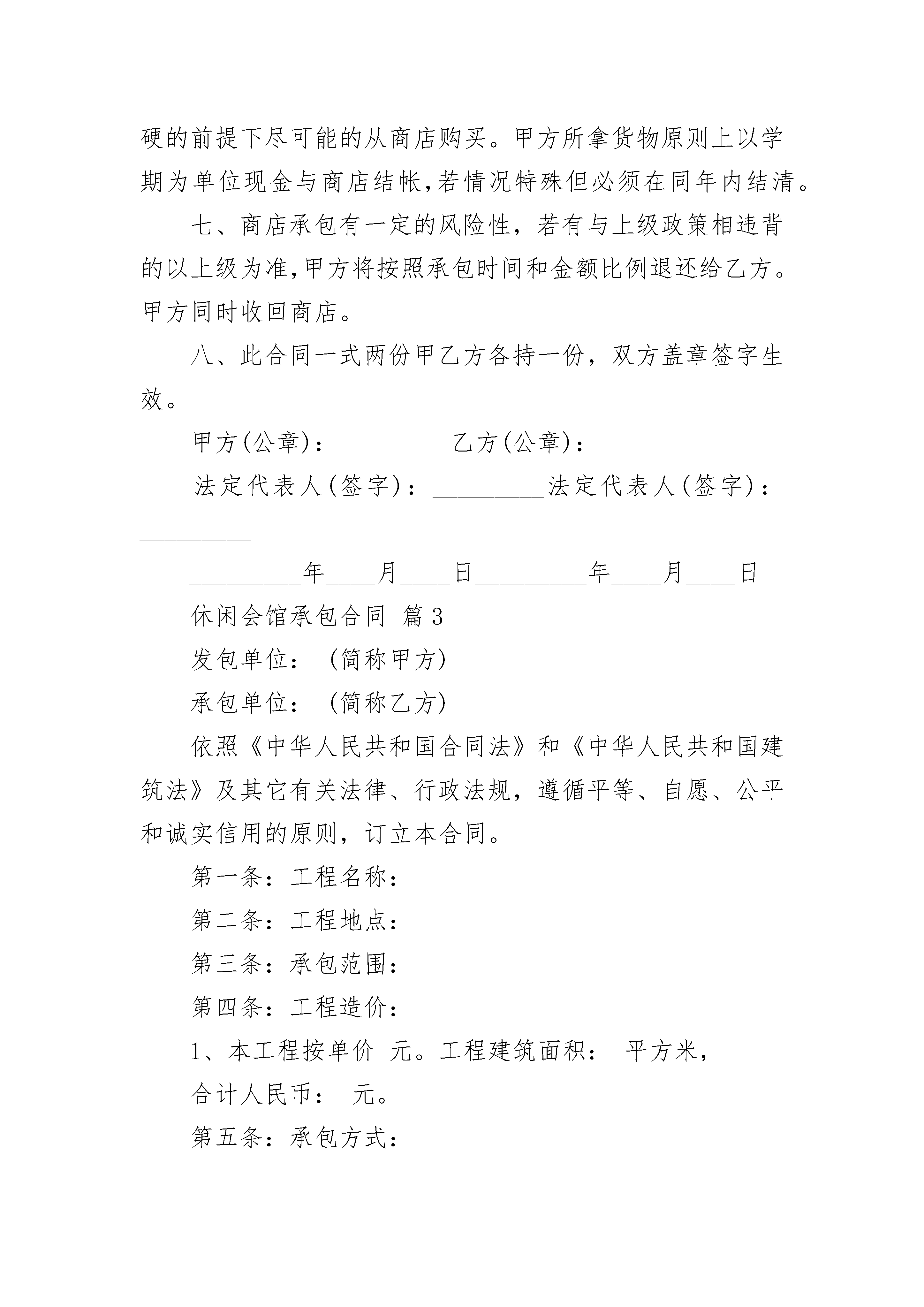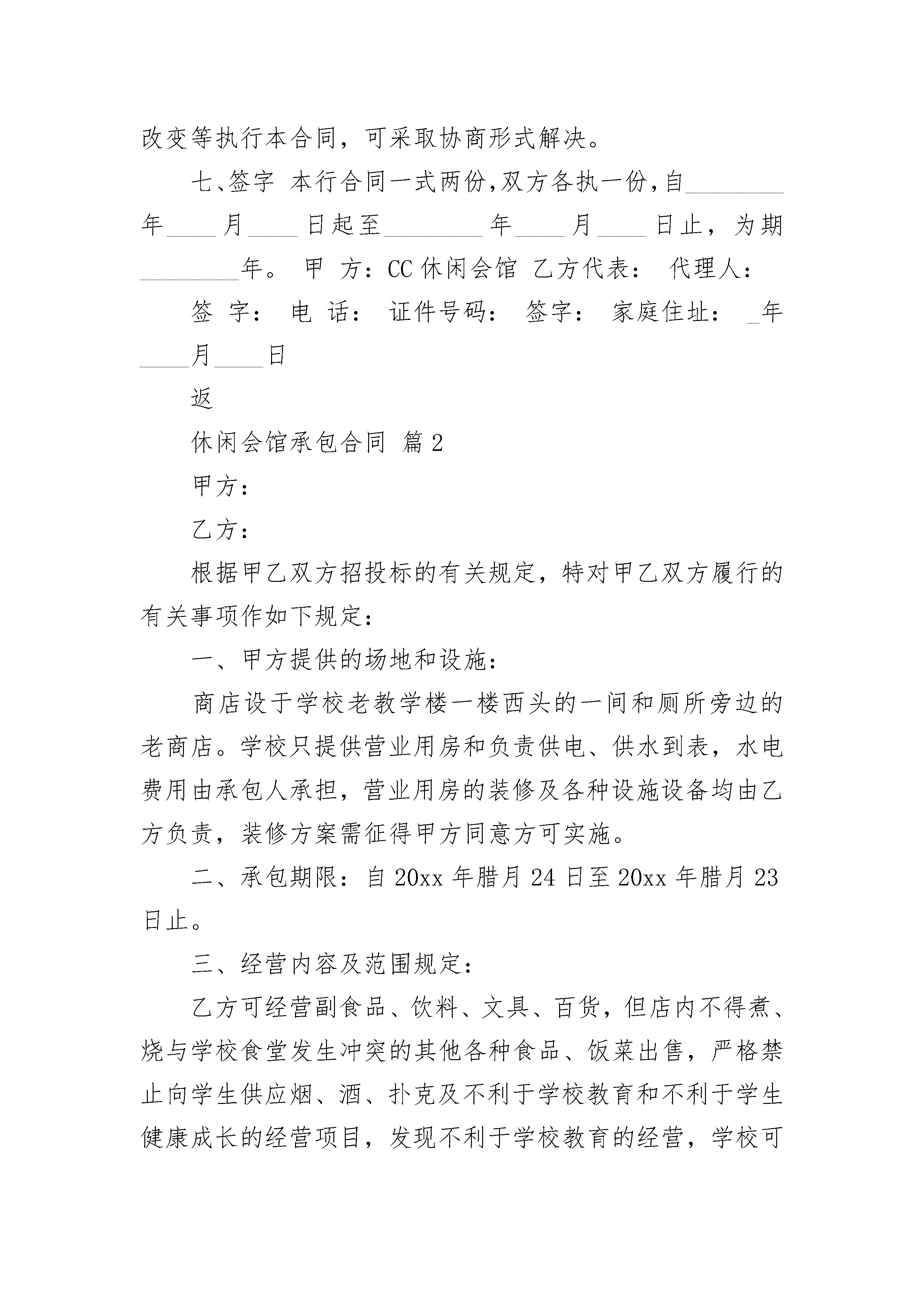 休闲会馆承包合同休闲会馆承包合同(通用3篇)休闲会馆承包合同篇1合同是当事人或当事双方之间设立、变更、终止民事关系的协议。依法成立的合同,受法律保护。广义合同指所有法律部门中确定权利、义务关系的协议。本文为大家带来合同范本,欢迎大家阅读借鉴。甲方:休闲会馆乙方:甲乙双方在平等、互利、协商的原则下,就乙方承包甲方茶艺相关事宜,达成如下协议:一、甲方责任与权利1.甲方向乙方提供茶艺场地。2.乙方自备茶艺工具及全部用品。3.乙方负责对其茶艺人员进行礼节礼貌等常识性培训。4.乙方员工必须遵守会馆规章制度,遵守会馆作息时间、遵守寝室、食堂、更衣室等管理制度,接受会馆统一管理。5.接受客人投诉或违反操作规程,依照会馆有关规定制度有权利对茶艺工作人员进行处罚。6.乙方所有服务项目及价格定位需由甲方确定。7.对乙方违反合同所承诺的条款有权处罚,并依据乙方所造成的影响或损失的程度,有权终止合同。二、乙方责任与权力1.乙方在进茶叶、茶艺用品前,向甲方提供进货标准书、发票及收费价格单,经甲方批准后,作为双方检验用品质量的标准。2.乙方自行解决茶艺全部用品。3.乙方所提供的茶艺用品必须是名牌产品,且在全市最低价格。4.乙方确定服务项目,茶艺人员需经甲方确认,并且需要办理健康体检证明,费用自理。5.乙方可核对单据,但不可查询财务情况。6.乙方在工作期间按会馆规定时间上下班。7.乙方在工作期间所用设施设备及物品丢失及损坏,均由自己负责赔偿或维修,如客人损坏茶艺用品,成本赔偿归茶艺用品出资方。8.乙方负责茶艺员工工资、及会馆员工提成。三、销售区分:乙方销售的茶叶以桶为包装,且为宾客提供茶艺表演。四、利润分配1、协议期间,双方按五、五分帐即甲方得到茶艺毛收入的50%,乙方得到50%,每15天结算一次。五、结算时间及支付形式1.时间:甲方对乙方的结算时间定为15天。2.形式:甲方财务对乙方服务项目及出售的茶艺进行审核,与乙方核对无误后,以人民币现金或支票形式支付。3.公司的有打折项目时,分配比例按照折后比例分配4.免单部分不参与提成六、争议甲乙双方由于服务项目的变化或经营环境的改变等执行本合同,可采取协商形式解决。七、签字本行合同一式两份,双方各执一份,自________年____月____日起至________年____月____日止,为期________年。甲方:CC休闲会馆乙方代表:代理人:签字:电话:证件号码:签字:家庭住址:_年____月____日返休闲会馆承包合同篇2甲方:乙方:根据甲乙双方招投标的有关规定,特对甲乙双方履行的有关事项作如下规定:一、甲方提供的场地和设施:商店设于学校老教学楼一楼西头的一间和厕所旁边的老商店。学校只提供营业用房和负责供电、供水到表,水电费用由承包人承担,营业用房的装修及各种设施设备均由乙方负责,装修方案需征得甲方同意方可实施。二、承包期限:自20xx年腊月24日至20xx年腊月23日止。三、经营内容及范围规定:乙方可经营副食品、饮料、文具、百货,但店内不得煮、烧与学校食堂发生冲突的其他各种食品、饭菜出售,严格禁止向学生供应烟、酒、扑克及不利于学校教育和不利于学生健康成长的经营项目,发现不利于学校教育的经营,学校可随时加以取缔,经劝阻无效的学校可终止合同,由此造成的损失将由承包方承担。四、商品价格及进货规定:商店所销售的物品应通过正常合法渠道进货,一律禁止进“三无”商品,霉变、过期食品进入商店,否则造成的一切损失由承包方自己承担,与学校概不相干,学校概不承担任何经济和其他一切责任。承包人应保存好进货凭证,购货票据备查。每一商品均需明码标价。五、合法经营、文明经营:承包人必须向工商、税务、防疫等部门办理工商登记、税务登记及各种合法经营、上岗手续,在承包经营期内须合法经营,照章纳税,严格执行《中华人民共和国食品卫生法》等各项政策法规,对本商店内外实行卫生三包,自觉接受全校师生及上级部门的监督,对师生反映强烈或受到上级部门通报的,学校将予一定的处罚,严重的可中止承包合同,中止合同后造成的损失由承包者承担,爱护学校财产,损坏或丢失学校财物要负责维修或赔偿。搞好防火、防盗安全措施。经营时,凡是商店承包人员不得进入食堂工作,保持工作的稳定性,确因食堂需要由甲乙双方商定。经营时严禁在商店内抹牌等严重影响学生学习和学校形象的活动。一经发现学校每次罚款20---50元不等。三次仍不改正的学校有权终止合同。六、学校及食堂所需要的物资及办公用品购买本着双方自愿的前提下进行,校方会在双方和谐、价格公平、质量过硬的前提下尽可能的从商店购买。甲方所拿货物原则上以学期为单位现金与商店结帐,若情况特殊但必须在同年内结清。七、商店承包有一定的风险性,若有与上级政策相违背的以上级为准,甲方将按照承包时间和金额比例退还给乙方。甲方同时收回商店。八、此合