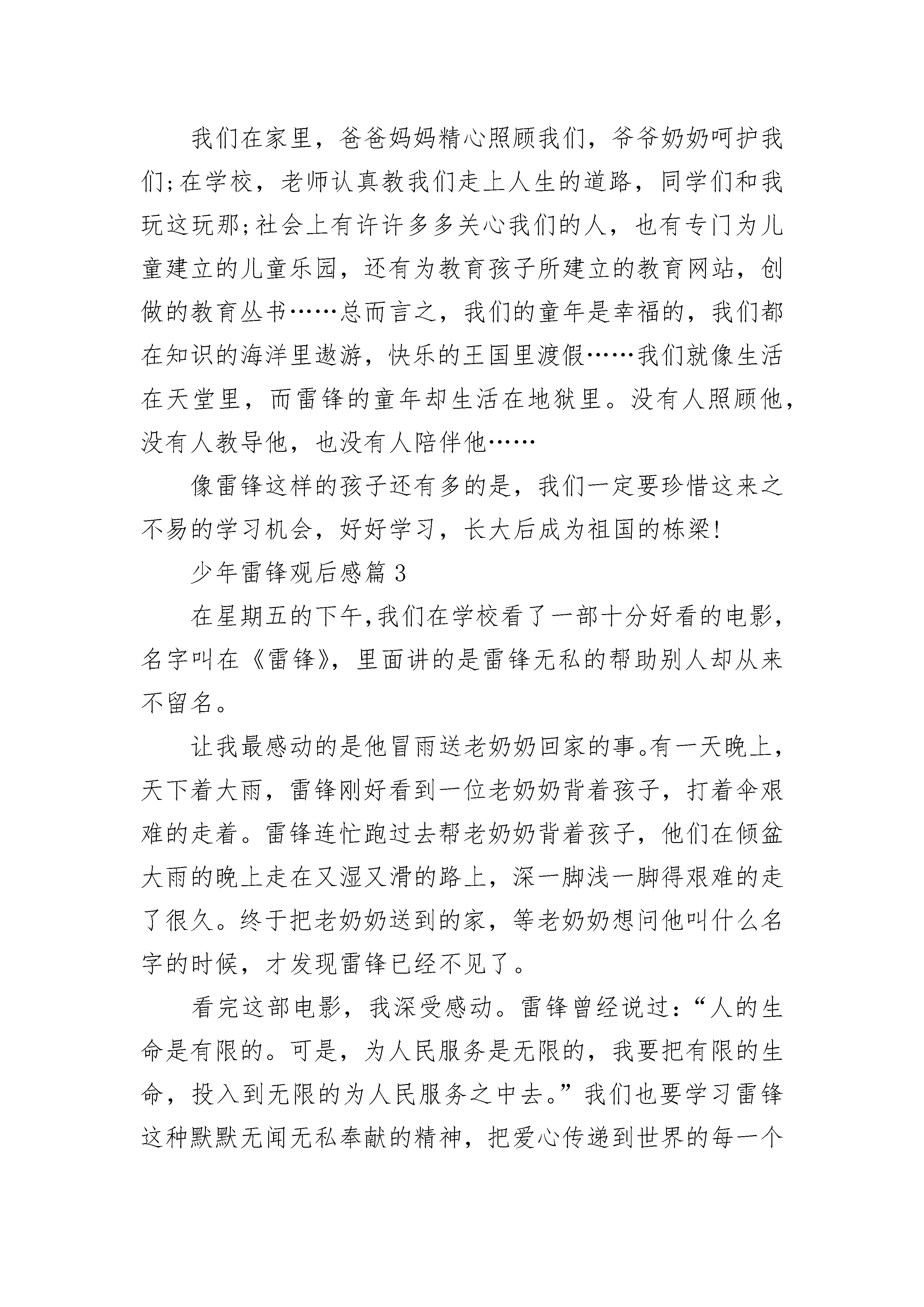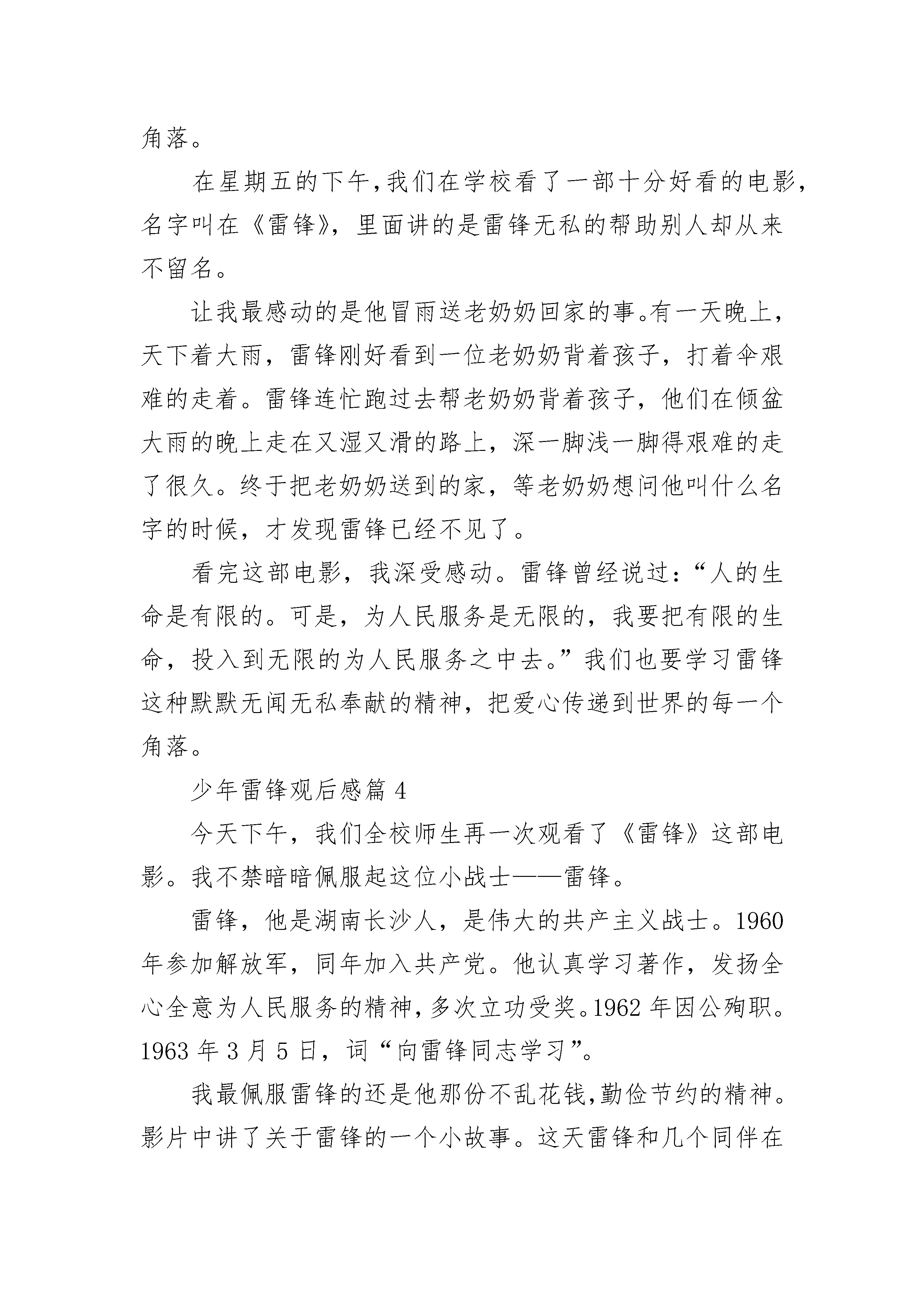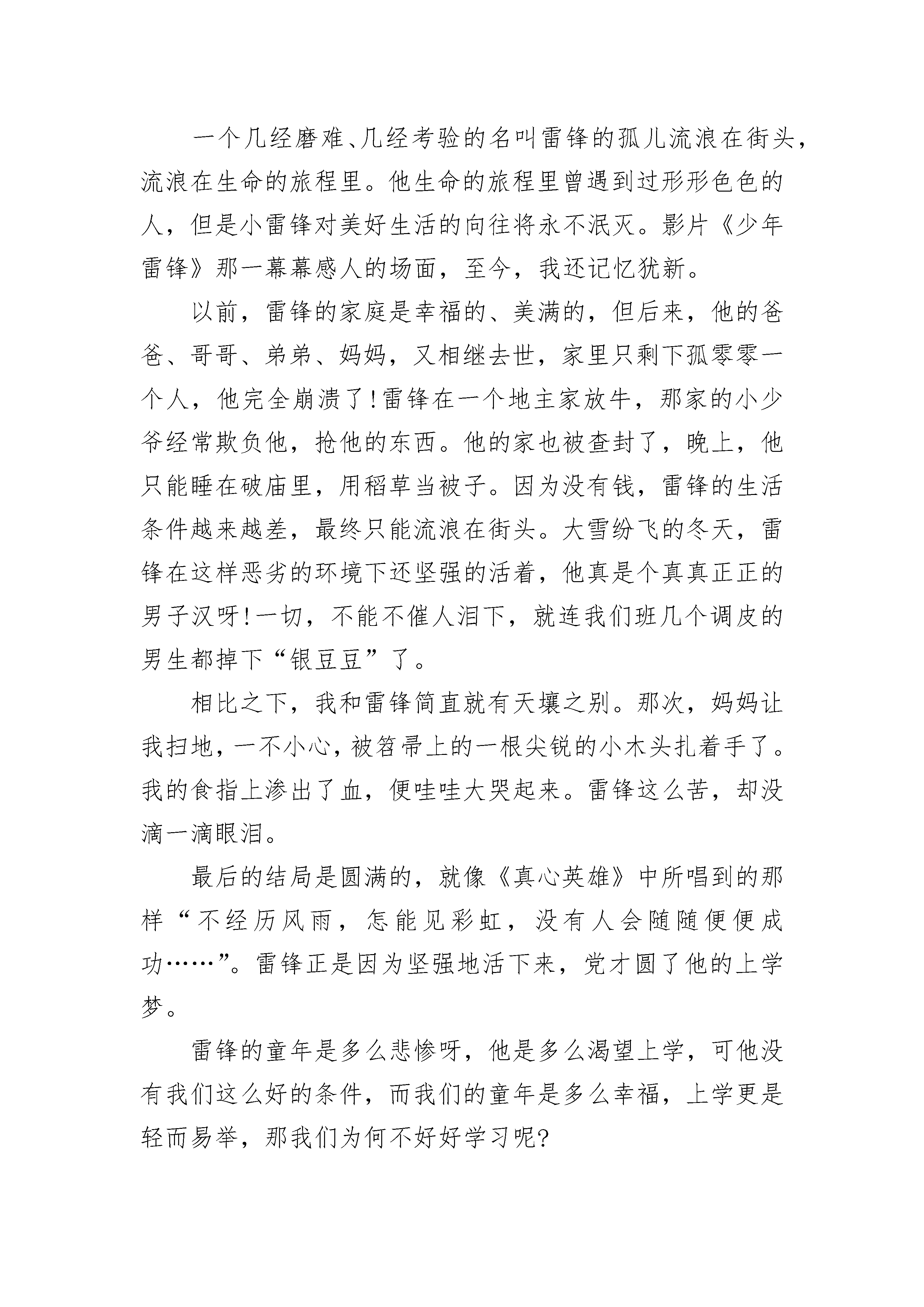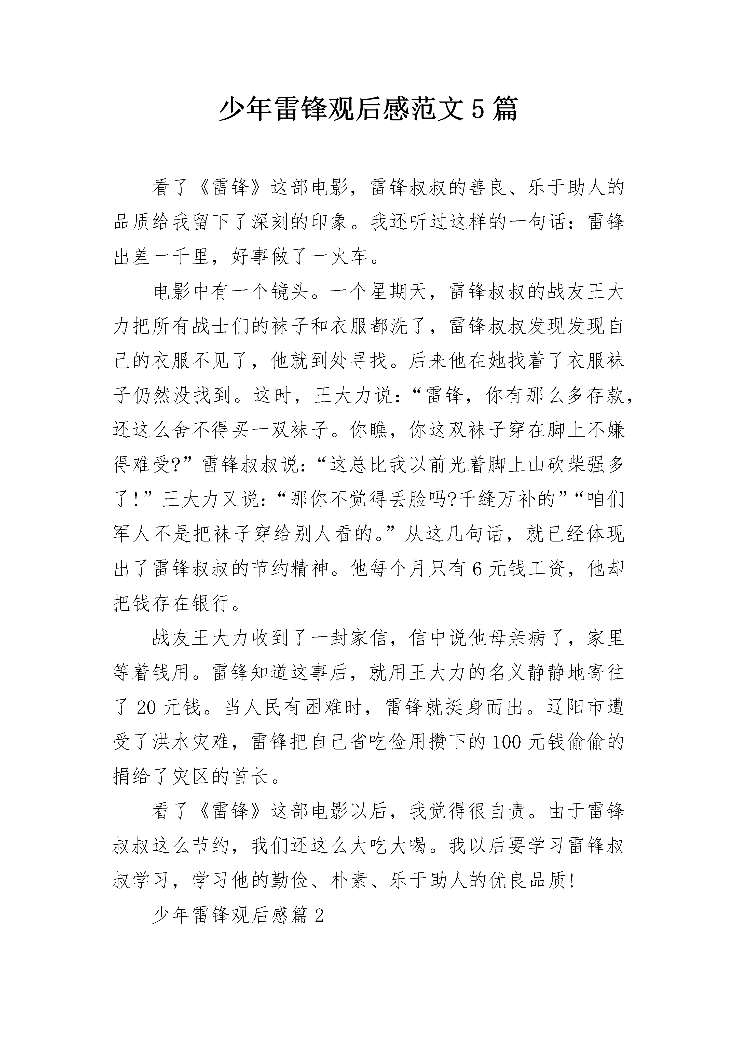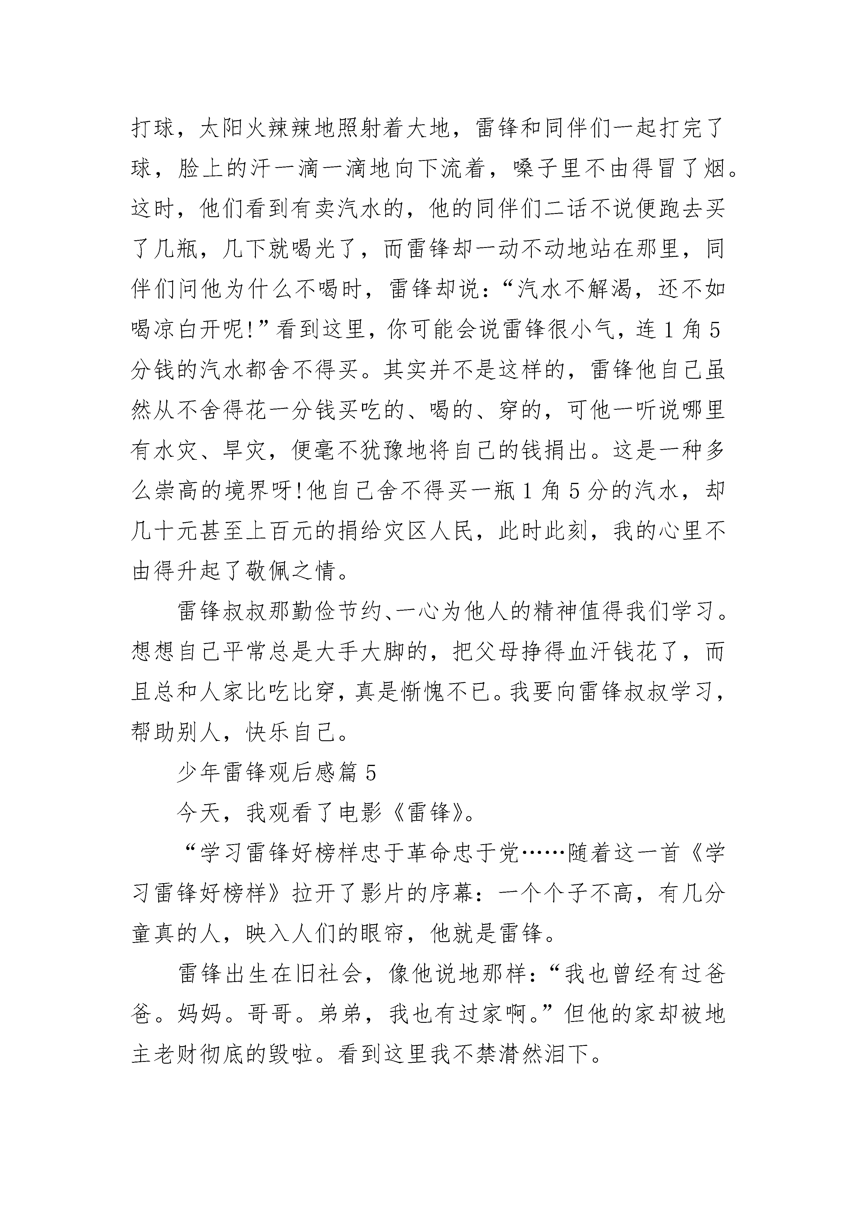 少年雷锋观后感范文5篇看了《雷锋》这部电影,雷锋叔叔的善良、乐于助人的品质给我留下了深刻的印象。我还听过这样的一句话:雷锋出差一千里,好事做了一火车。电影中有一个镜头。一个星期天,雷锋叔叔的战友王大力把所有战士们的袜子和衣服都洗了,雷锋叔叔发现发现自己的衣服不见了,他就到处寻找。后来他在她找着了衣服袜子仍然没找到。这时,王大力说:“雷锋,你有那么多存款,还这么舍不得买一双袜子。你瞧,你这双袜子穿在脚上不嫌得难受?”雷锋叔叔说:“这总比我以前光着脚上山砍柴强多了!”王大力又说:“那你不觉得丢脸吗?千缝万补的”“咱们军人不是把袜子穿给别人看的。”从这几句话,就已经体现出了雷锋叔叔的节约精神。他每个月只有6元钱工资,他却把钱存在银行。战友王大力收到了一封家信,信中说他母亲病了,家里等着钱用。雷锋知道这事后,就用王大力的名义静静地寄往了20元钱。当人民有困难时,雷锋就挺身而出。辽阳市遭受了洪水灾难,雷锋把自己省吃俭用攒下的100元钱偷偷的捐给了灾区的首长。看了《雷锋》这部电影以后,我觉得很自责。由于雷锋叔叔这么节约,我们还这么大吃大喝。我以后要学习雷锋叔叔学习,学习他的勤俭、朴素、乐于助人的优良品质!少年雷锋观后感篇2一个几经磨难、几经考验的名叫雷锋的孤儿流浪在街头,流浪在生命的旅程里。他生命的旅程里曾遇到过形形色色的人,但是小雷锋对美好生活的向往将永不泯灭。影片《少年雷锋》那一幕幕感人的场面,至今,我还记忆犹新。以前,雷锋的家庭是幸福的、美满的,但后来,他的爸爸、哥哥、弟弟、妈妈,又相继去世,家里只剩下孤零零一个人,他完全崩溃了!雷锋在一个地主家放牛,那家的小少爷经常欺负他,抢他的东西。他的家也被查封了,晚上,他只能睡在破庙里,用稻草当被子。因为没有钱,雷锋的生活条件越来越差,最终只能流浪在街头。大雪纷飞的冬天,雷锋在这样恶劣的环境下还坚强的活着,他真是个真真正正的男子汉呀!一切,不能不催人泪下,就连我们班几个调皮的男生都掉下“银豆豆”了。相比之下,我和雷锋简直就有天壤之别。那次,妈妈让我扫地,一不小心,被笤帚上的一根尖锐的小木头扎着手了。我的食指上渗出了血,便哇哇大哭起来。雷锋这么苦,却没滴一滴眼泪。最后的结局是圆满的,就像《真心英雄》中所唱到的那样“不经历风雨,怎能见彩虹,没有人会随随便便成功……”。雷锋正是因为坚强地活下来,党才圆了他的上学梦。雷锋的童年是多么悲惨呀,他是多么渴望上学,可他没有我们这么好的条件,而我们的童年是多么幸福,上学更是轻而易举,那我们为何不好好学习呢?我们在家里,爸爸妈妈精心照顾我们,爷爷奶奶呵护我们;在学校,老师认真教我们走上人生的道路,同学们和我玩这玩那;社会上有许许多多关心我们的人,也有专门为儿童建立的儿童乐园,还有为教育孩子所建立的教育网站,创做的教育丛书……总而言之,我们的童年是幸福的,我们都在知识的海洋里遨游,快乐的王国里渡假……我们就像生活在天堂里,而雷锋的童年却生活在地狱里。没有人照顾他,没有人教导他,也没有人陪伴他……像雷锋这样的孩子还有多的是,我们一定要珍惜这来之不易的学习机会,好好学习,长大后成为祖国的栋梁!少年雷锋观后感篇3在星期五的下午,我们在学校看了一部十分好看的电影,名字叫在《雷锋》,里面讲的是雷锋无私的帮助别人却从来不留名。让我最感动的是他冒雨送老奶奶回家的事。有一天晚上,天下着大雨,雷锋刚好看到一位老奶奶背着孩子,打着伞艰难的走着。雷锋连忙跑过去帮老奶奶背着孩子,他们在倾盆大雨的晚上走在又湿又滑的路上,深一脚浅一脚得艰难的走了很久。终于把老奶奶送到的家,等老奶奶想问他叫什么名字的时候,才发现雷锋已经不见了。看完这部电影,我深受感动。雷锋曾经说过:“人的生命是有限的。可是,为人民服务是无限的,我要把有限的生命,投入到无限的为人民服务之中去。”我们也要学习雷锋这种默默无闻无私奉献的精神,把爱心传递到世界的每一个角落。在星期五的下午,我们在学校看了一部十分好看的电影,名字叫在《雷锋》,里面讲的是雷锋无私的帮助别人却从来不留名。让我最感动的是他冒雨送老奶奶回家的事。有一天晚上,天下着大雨,雷锋刚好看到一位老奶奶背着孩子,打着伞艰难的走着。雷锋连忙跑过去帮老奶奶背着孩子,他们在倾盆大雨的晚上走在又湿又滑的路上,深一脚浅一脚得艰难的走了很久。终于把老奶奶送到的家,等老奶奶想问他叫什么名字的时候,才发现雷锋已经不见了。看完这部电影,我深受感动。雷锋曾经说过:“人的生命是有限的。可是,为人民服务是无限的,我要把有限的生命,投入到无限的为人民服务之中去。”我们也要学习雷锋这种默默无闻无私奉献的精神,把爱心传递到世界的每一个角落。少年雷锋观后感篇4今天下午,我们全校师生再一次观看了《雷锋》这部电影。我不禁暗暗佩服起这位小战士——雷锋。雷锋,他是湖南长沙人,是伟大的共产主义战士。1960