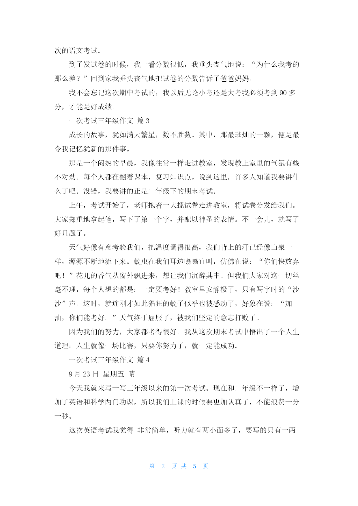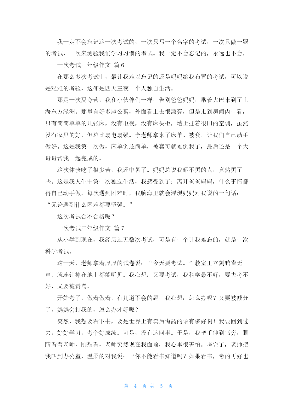第页共NUMPAGES5页 关于一次考试三年级作文7篇 一次考试三年级作文篇1铃声响毕,语文老师便一脚迈进了教室的门。她环顾了四周,突然神秘地一笑,走上讲台,对我们说:“同学们,今天我们来场考试——场没有试卷的考试。”老师话音刚落,同学们就七嘴八舌地议论开了。“这到底是什么考试呀?音乐吗?好像不可能吧!”“老师葫芦里到底卖着什么药啊!考试居然没有卷子!”“这次真怪呀,会不会是让我们口头答呢?我还没做准备呢?”……这时,老师发话了:“请同学们按学号排队,绕着课桌走几圈。”于是,同学们按老师的安排走起来。同学们有的边走边笑,有的还在小声议论……走到墙角边,李力出队列把倒地的扫帚扶了起来;范思思经过张红的课桌旁拾起一把尺子,放在张红的课桌上;班长孙浩顺手把一些带歪的课桌对齐。几圈下来之后,老师让我们归位,再次环视了一下四周,宣布:“这次考满分的是李力、范思思和孙浩。”“凭什么他们得满分?我们不都是在走吗?”有人提出了异议。老师笑着回答道:“这三位同学把班级变得更整洁了,说明他们时时留心班级,关心着班级。所以他们得了满分!”这时,同学们才恍然大快悟。我也明白了,这次考试比的不是知识,它是一场隐形的考试呀!一次考试三年级作文篇2一次难忘的期中考试。期中考试来临了,我们特别紧张。第二天,我们的期中考试来临了,我们考的是数学A卷,虽然不难,但我们很紧张,考了两节课,过了一会儿,叮铃铃到时间了,我们放下紧张的心情,停笔交卷了,我们期待着考试的分数。下午,我们考了语文,在老师没来之前,有的同学翻的翻书,背地背课文,说的说话,写的写试卷,老师把试卷和作文纸发给了我们,考试进行中,没过多久,我写完了,第二节下课铃又响了,到时间了,收卷了。我很期待这次的语文考试。到了发试卷的时候,我一看分数很低,我垂头丧气地说:“为什么我考的那么差?”回到家我垂头丧气地把试卷的分数告诉了爸爸妈妈。我不会忘记这次期中考试的,我以后无论小考还是大考我必须考到90多分,才能是好成绩。一次考试三年级作文篇3成长的故事,犹如满天繁星,数不胜数。其中,那最璀灿的一颗,便是最令我记忆犹新的那件事。那是一个闷热的早晨,我像往常一样走进教室,发现教上室里的气氛有些不对劲。每个人都在翻着课本,复习知识点。说到这里,许多人知道我要讲什么了吧。没错,我要讲的正是二年级下的期末考试。上午,考试开始了,老师抱着一大摞试卷走进教室,将试卷分发给我们。大家郑重地拿起笔,写下了第一个字,并配以神圣的表情。不一会儿,就写了好几题了。天气好像有意考验我们,把温度调得很高,我们背上的汗已经像山泉一样,源源不断地流下来。蚊虫在我们耳边嗡嗡直叫,仿佛在说:“你们快放弃吧!”花儿的香气从窗外飘进来,想让我们沉醉其中。但我们大家对这一切丝毫不理,每个人想的都是:一定要考好!教室里安静极了,只有写字时的“沙沙”声。这时,就连刚才如此猖狂的蚊子似乎也被感动了,好象在说:“加油,你们能考好。”天气终于屈服了,被我们坚定的意志打败了。因为我们的努力,大家都考得很好。我从这次期末考试中悟出了一个人生道理:人生就像一场比赛,只要你努力了,就一定能成功。一次考试三年级作文篇49月23日星期五晴今天我就来写一写三年级以来的第一次考试。现在和二年级不一样了,增加了英语和科学两门功课,所以我们上课的时候要更加认真了,不能浪费一分一秒。这次英语考试我觉得非常简单,听力就有两小面多了,要写的只有一两题,而且也非常简单。当时考的时候我在想,题目那么简单,我肯定能考一百分。后来,爸爸告诉我,我和圆圆都得了一百分,那时候我们开心得不得了。三年级的语文考试也跟二年级不一样了,不再是看图写话了,是让我们自己写作文,比分也增加了。这次的作文是写暑假里的.一件事情,我写的是《摘葡萄》,王老师认为我写得很好,还读给同学们听了呢!这次考试我做错了两道题目,都是因为阅读理解错误。爸爸评论我说基础知识掌握得很好,阅读理解需要加强。我对这次考试很满意,阅读再努力一点就更好了。这次数学也考试了,试卷里就错了两个地方,都是粗心而错的。一个是把17加23算成了70,另一个是把减法算成了加法。我下次数学考试一定要仔细一点。其实这三门考试的题目都不难,只要我们上课认真听讲,一定会取得好成绩。一次考试三年级作文篇5虽然我现在只有三年级,但是我却经历过许多考试,今天我们进行了一场特殊的考试。早晨,老师走进教室,神秘地说:“今天我们要做一份试卷,这是一份天才试卷,是用来测我们的综合素质的。试卷上有二十道题,我们只有五分钟的时间来做,大家一定要抓紧时间。”“啊,不会吧,只有五分钟!”我心里又激动又紧张。老师把一只信封发了下来,一、二、三开始!我连忙把试卷给拿了出来,认真地做着题目,连头也不敢抬一下,生怕浪费了一丁点时间。教室里鸦雀无声,我越做越觉得好玩儿
