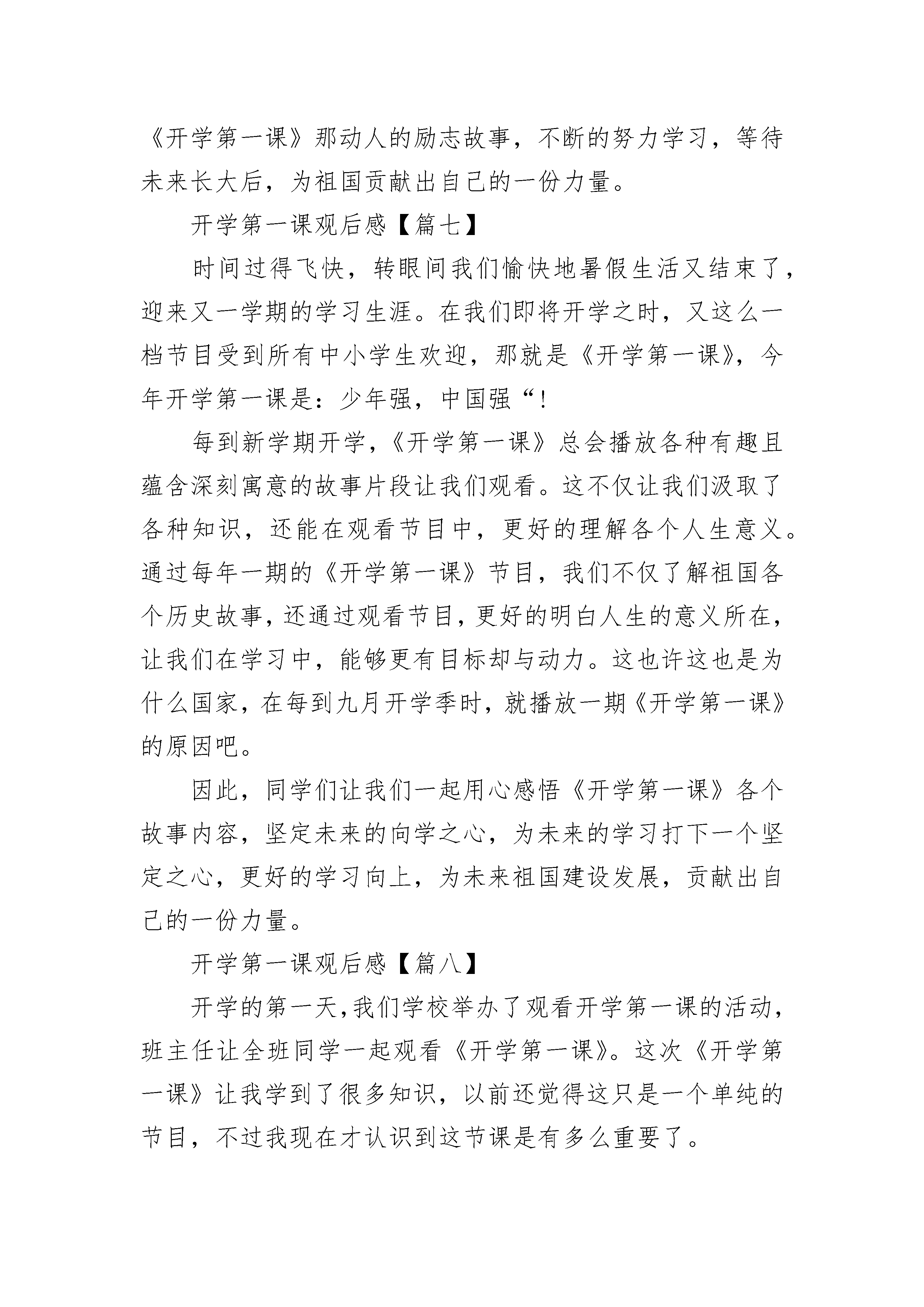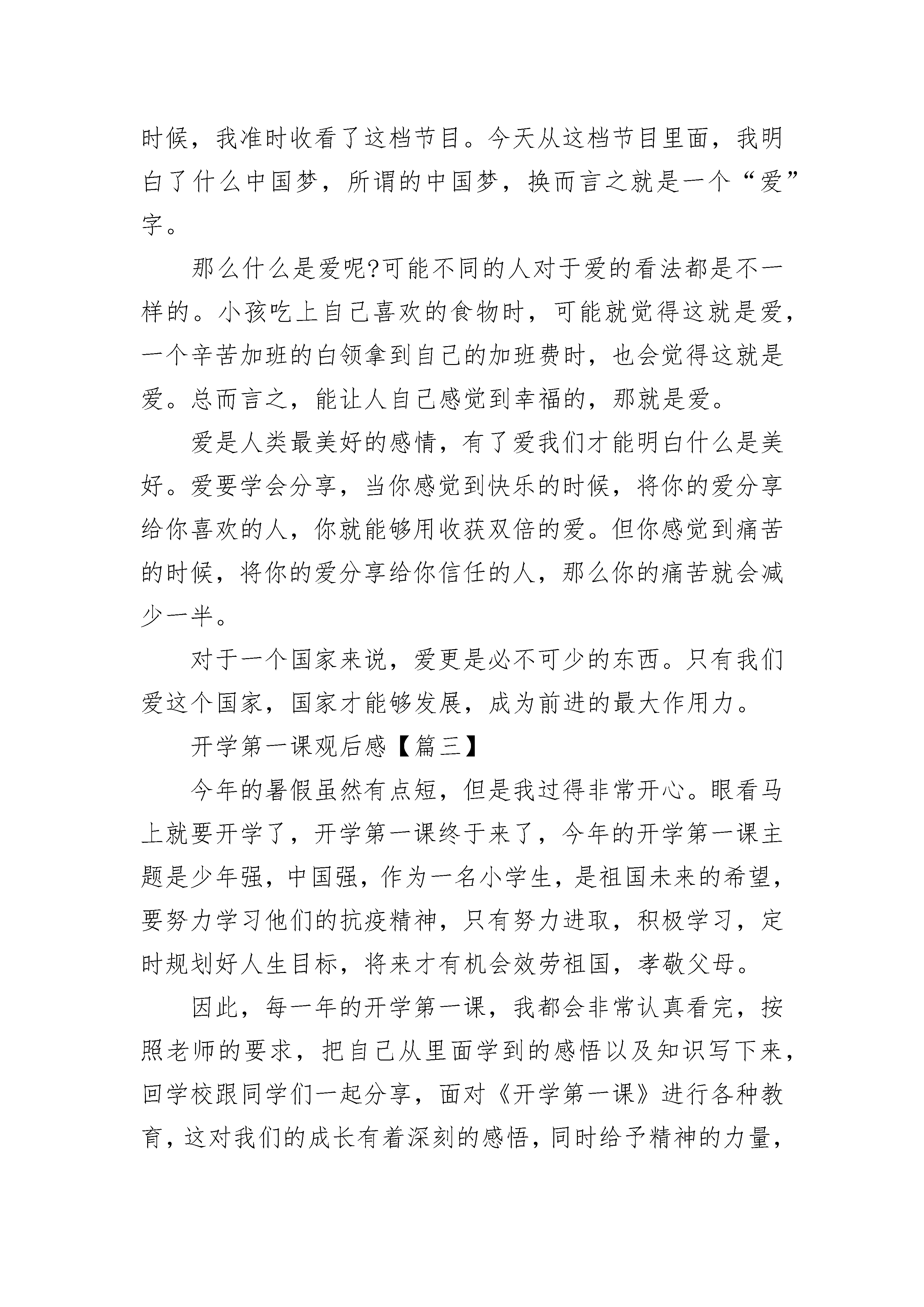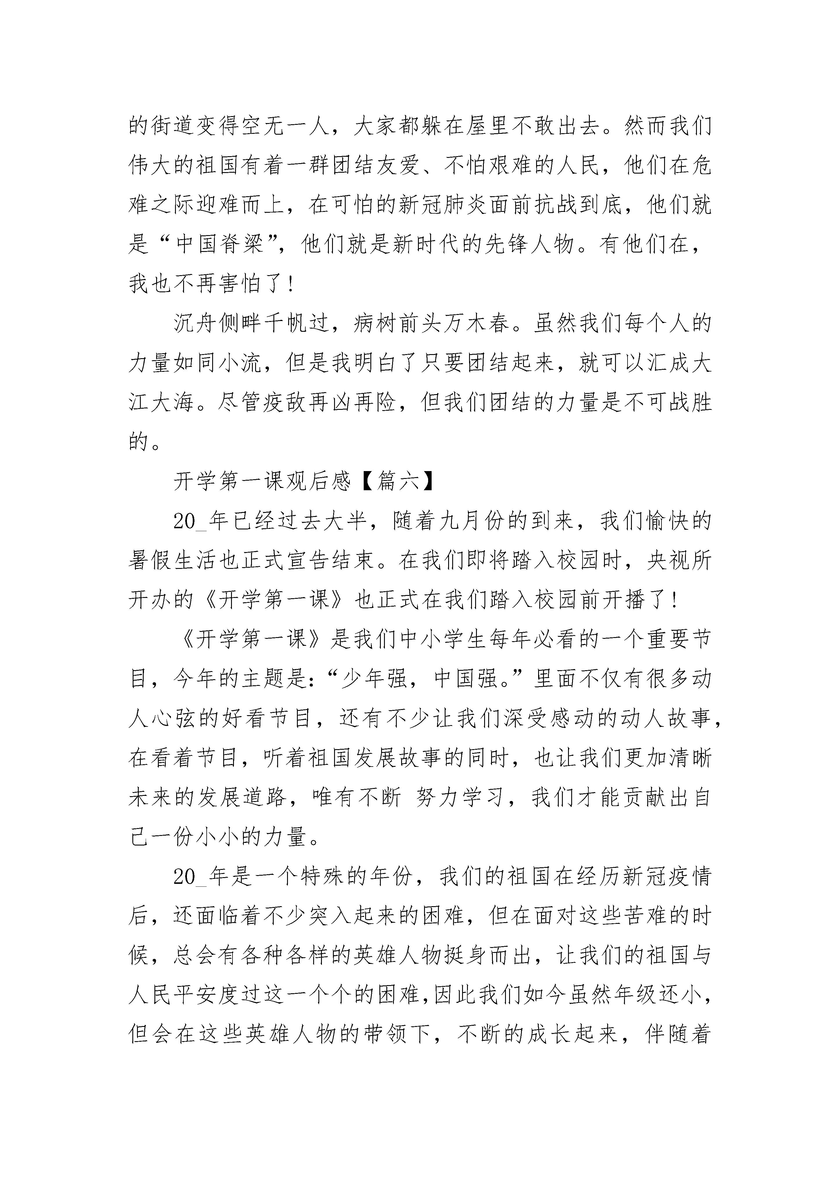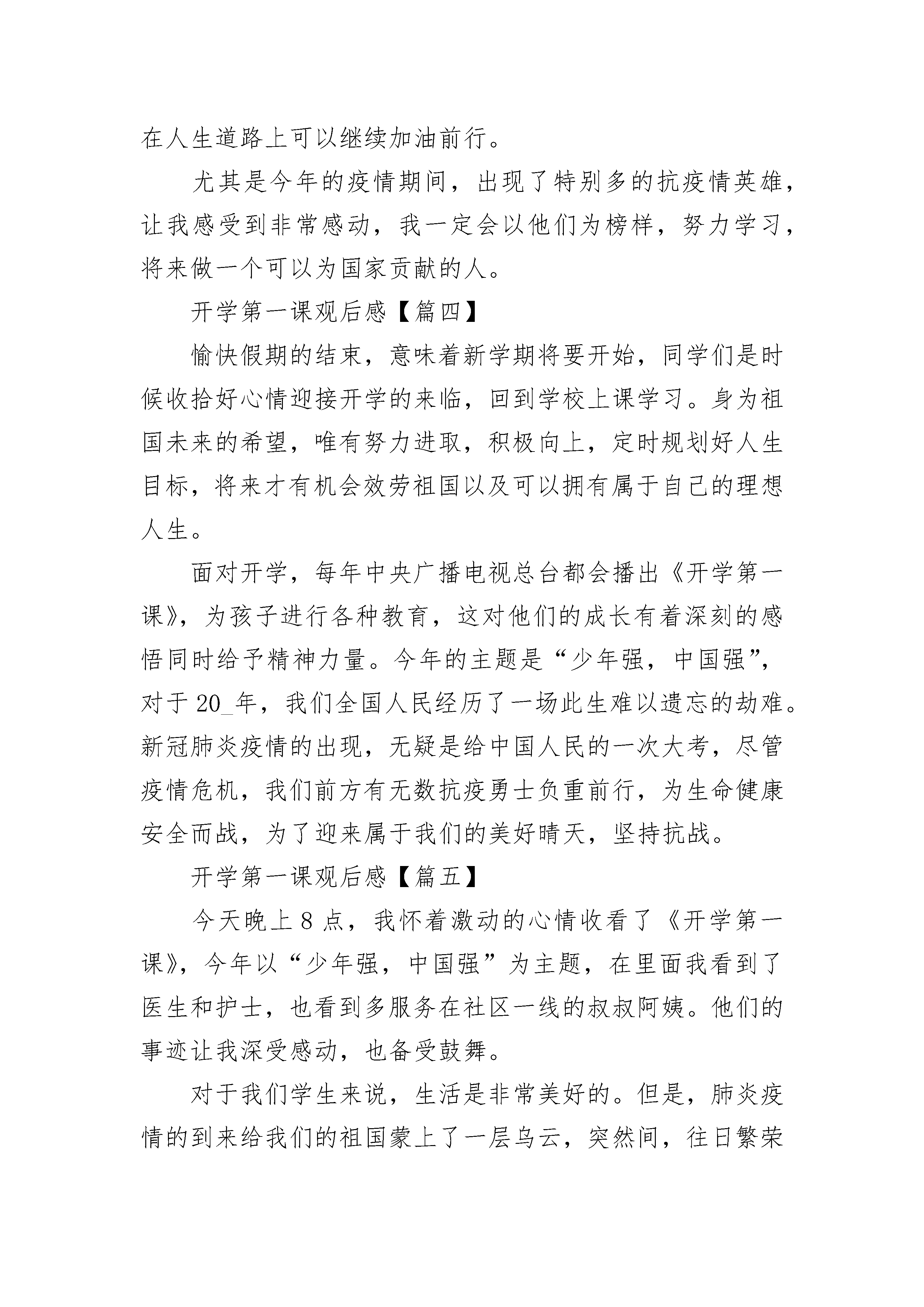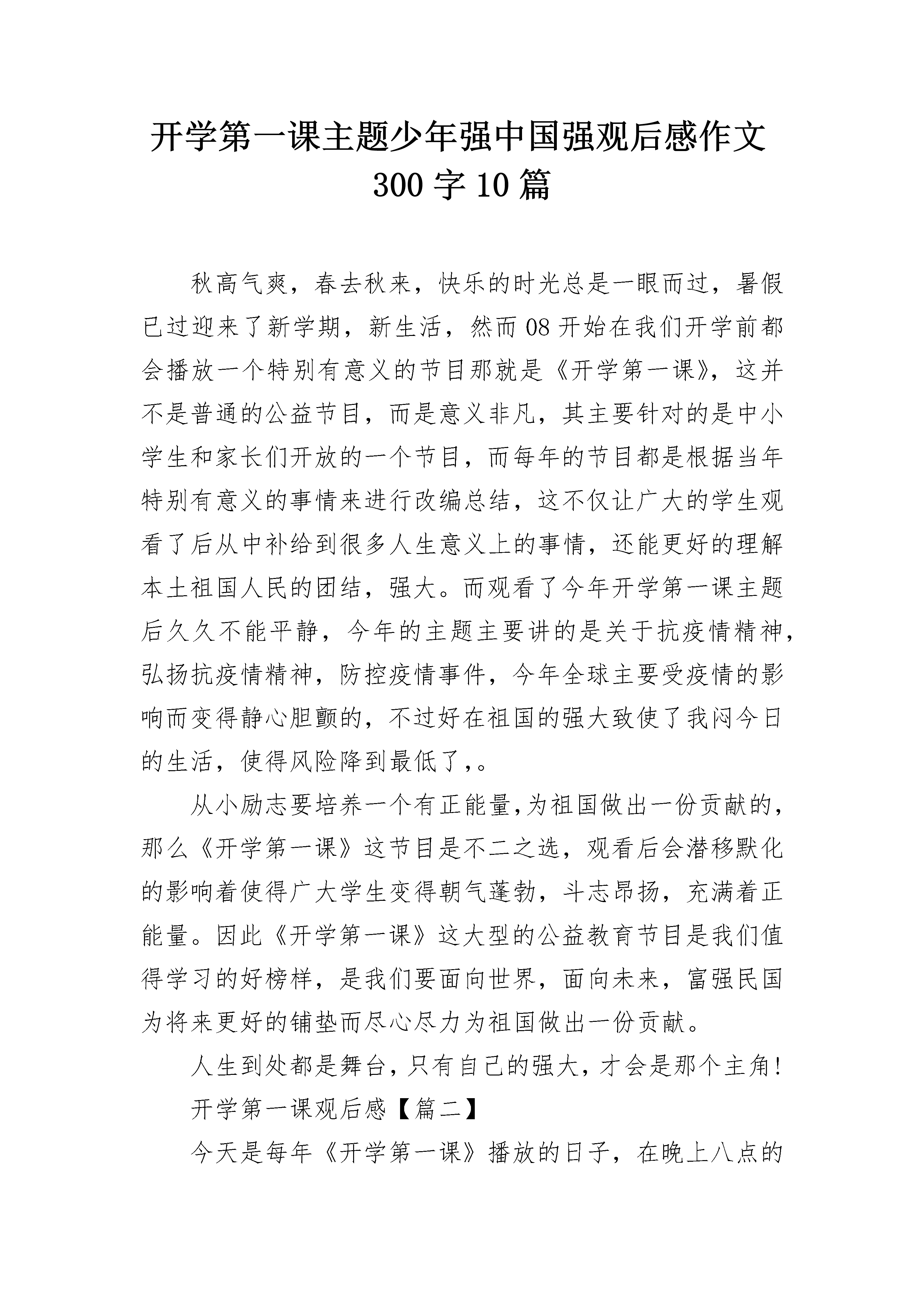 开学第一课主题少年强中国强观后感作文300字10篇秋高气爽,春去秋来,快乐的时光总是一眼而过,暑假已过迎来了新学期,新生活,然而08开始在我们开学前都会播放一个特别有意义的节目那就是《开学第一课》,这并不是普通的公益节目,而是意义非凡,其主要针对的是中小学生和家长们开放的一个节目,而每年的节目都是根据当年特别有意义的事情来进行改编总结,这不仅让广大的学生观看了后从中补给到很多人生意义上的事情,还能更好的理解本土祖国人民的团结,强大。而观看了今年开学第一课主题后久久不能平静,今年的主题主要讲的是关于抗疫情精神,弘扬抗疫情精神,防控疫情事件,今年全球主要受疫情的影响而变得静心胆颤的,不过好在祖国的强大致使了我闷今日的生活,使得风险降到最低了,。从小励志要培养一个有正能量,为祖国做出一份贡献的,那么《开学第一课》这节目是不二之选,观看后会潜移默化的影响着使得广大学生变得朝气蓬勃,斗志昂扬,充满着正能量。因此《开学第一课》这大型的公益教育节目是我们值得学习的好榜样,是我们要面向世界,面向未来,富强民国为将来更好的铺垫而尽心尽力为祖国做出一份贡献。人生到处都是舞台,只有自己的强大,才会是那个主角!开学第一课观后感【篇二】今天是每年《开学第一课》播放的日子,在晚上八点的时候,我准时收看了这档节目。今天从这档节目里面,我明白了什么中国梦,所谓的中国梦,换而言之就是一个“爱”字。那么什么是爱呢?可能不同的人对于爱的看法都是不一样的。小孩吃上自己喜欢的食物时,可能就觉得这就是爱,一个辛苦加班的白领拿到自己的加班费时,也会觉得这就是爱。总而言之,能让人自己感觉到幸福的,那就是爱。爱是人类最美好的感情,有了爱我们才能明白什么是美好。爱要学会分享,当你感觉到快乐的时候,将你的爱分享给你喜欢的人,你就能够用收获双倍的爱。但你感觉到痛苦的时候,将你的爱分享给你信任的人,那么你的痛苦就会减少一半。对于一个国家来说,爱更是必不可少的东西。只有我们爱这个国家,国家才能够发展,成为前进的最大作用力。开学第一课观后感【篇三】今年的暑假虽然有点短,但是我过得非常开心。眼看马上就要开学了,开学第一课终于来了,今年的开学第一课主题是少年强,中国强,作为一名小学生,是祖国未来的希望,要努力学习他们的抗疫精神,只有努力进取,积极学习,定时规划好人生目标,将来才有机会效劳祖国,孝敬父母。因此,每一年的开学第一课,我都会非常认真看完,按照老师的要求,把自己从里面学到的感悟以及知识写下来,回学校跟同学们一起分享,面对《开学第一课》进行各种教育,这对我们的成长有着深刻的感悟,同时给予精神的力量,在人生道路上可以继续加油前行。尤其是今年的疫情期间,出现了特别多的抗疫情英雄,让我感受到非常感动,我一定会以他们为榜样,努力学习,将来做一个可以为国家贡献的人。开学第一课观后感【篇四】愉快假期的结束,意味着新学期将要开始,同学们是时候收拾好心情迎接开学的来临,回到学校上课学习。身为祖国未来的希望,唯有努力进取,积极向上,定时规划好人生目标,将来才有机会效劳祖国以及可以拥有属于自己的理想人生。面对开学,每年中央广播电视总台都会播出《开学第一课》,为孩子进行各种教育,这对他们的成长有着深刻的感悟同时给予精神力量。今年的主题是“少年强,中国强”,对于20_年,我们全国人民经历了一场此生难以遗忘的劫难。新冠肺炎疫情的出现,无疑是给中国人民的一次大考,尽管疫情危机,我们前方有无数抗疫勇士负重前行,为生命健康安全而战,为了迎来属于我们的美好晴天,坚持抗战。开学第一课观后感【篇五】今天晚上8点,我怀着激动的心情收看了《开学第一课》,今年以“少年强,中国强”为主题,在里面我看到了医生和护士,也看到多服务在社区一线的叔叔阿姨。他们的事迹让我深受感动,也备受鼓舞。对于我们学生来说,生活是非常美好的。但是,肺炎疫情的到来给我们的祖国蒙上了一层乌云,突然间,往日繁荣的街道变得空无一人,大家都躲在屋里不敢出去。然而我们伟大的祖国有着一群团结友爱、不怕艰难的人民,他们在危难之际迎难而上,在可怕的新冠肺炎面前抗战到底,他们就是“中国脊梁”,他们就是新时代的先锋人物。有他们在,我也不再害怕了!沉舟侧畔千帆过,病树前头万木春。虽然我们每个人的力量如同小流,但是我明白了只要团结起来,就可以汇成大江大海。尽管疫敌再凶再险,但我们团结的力量是不可战胜的。开学第一课观后感【篇六】20_年已经过去大半,随着九月份的到来,我们愉快的暑假生活也正式宣告结束。在我们即将踏入校园时,央视所开办的《开学第一课》也正式在我们踏入校园前开播了!《开学第一课》是我们中小学生每年必看的一个重要节目,今年的主题是:“少年强,中国强。”里面不仅有很多动人心弦的好看节目,还有不少让我们深受感动的动人故事,在看着节目,听着祖国发展故事的同时,也让我们更加清