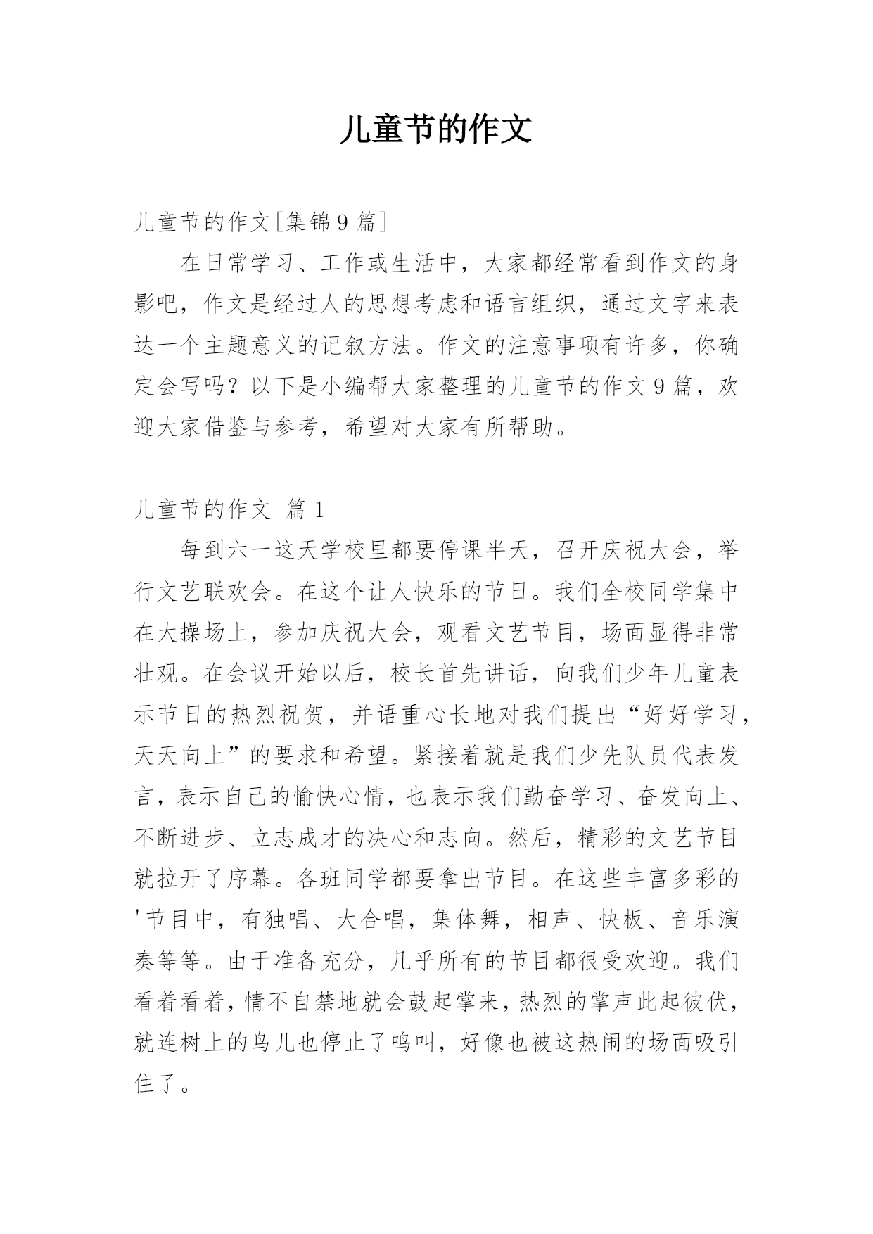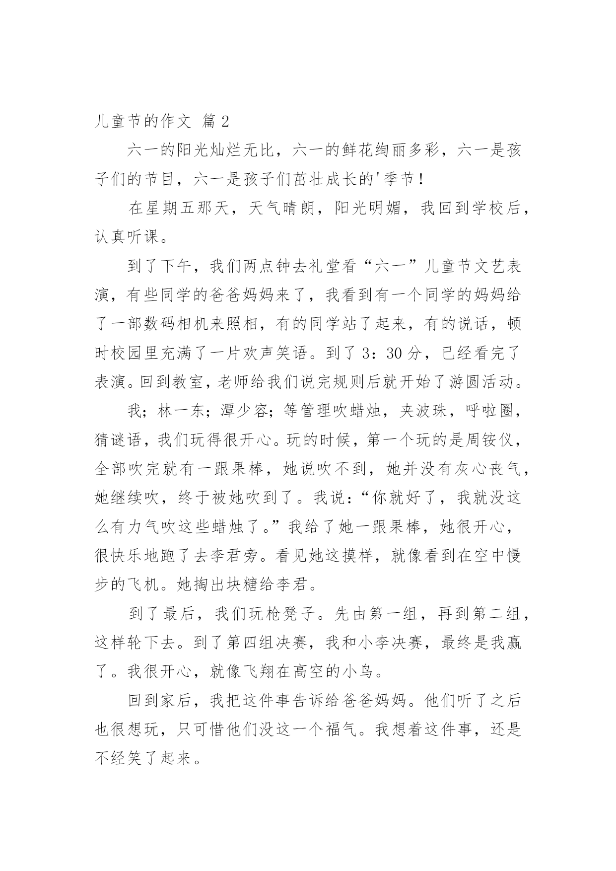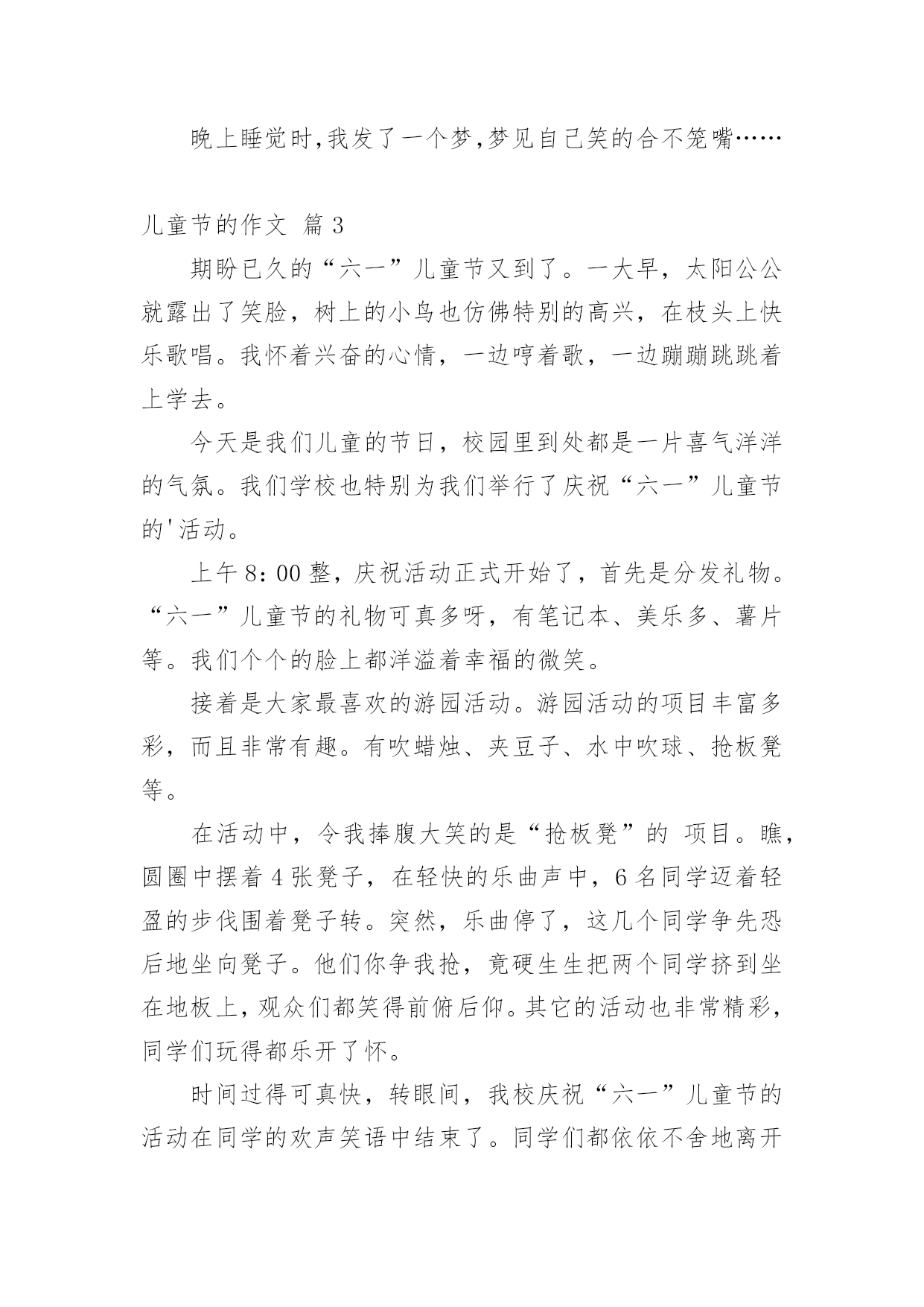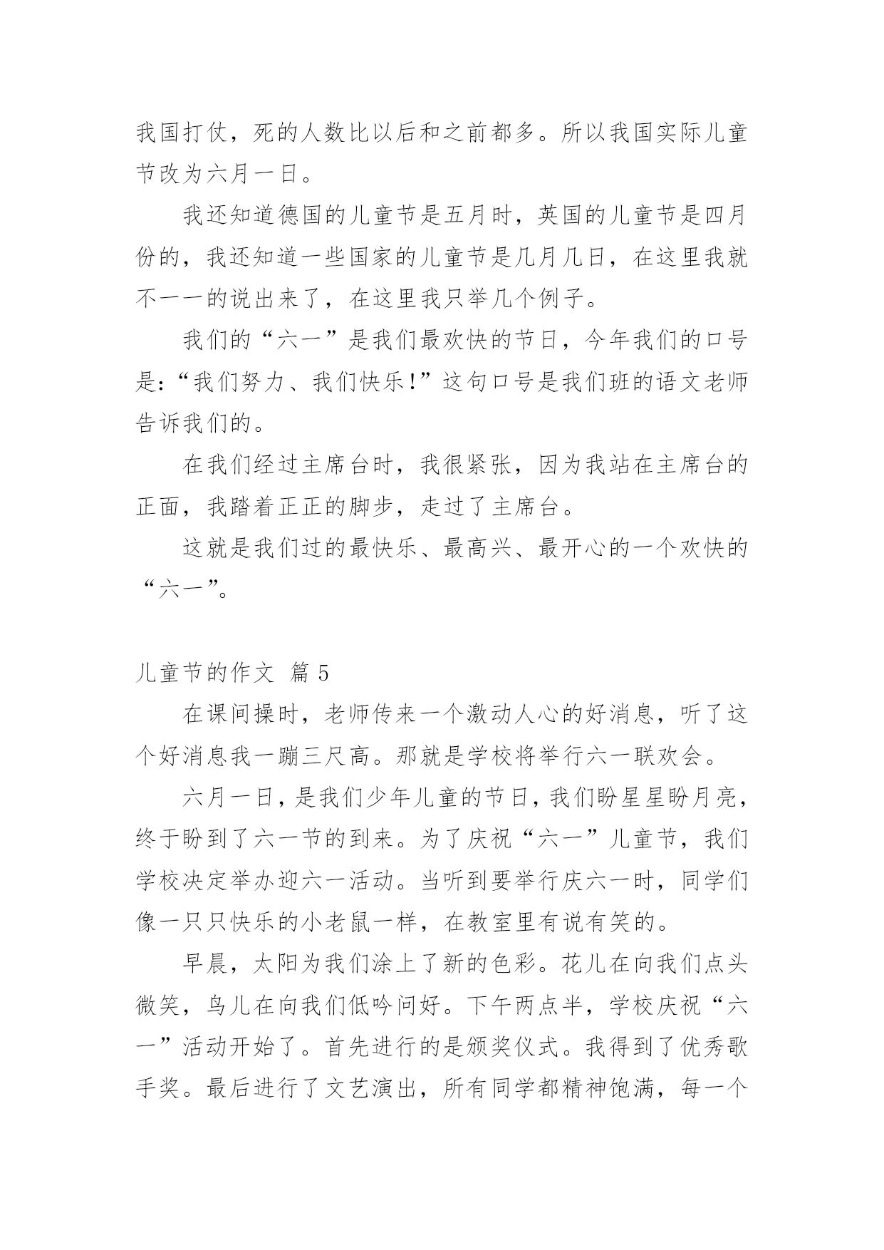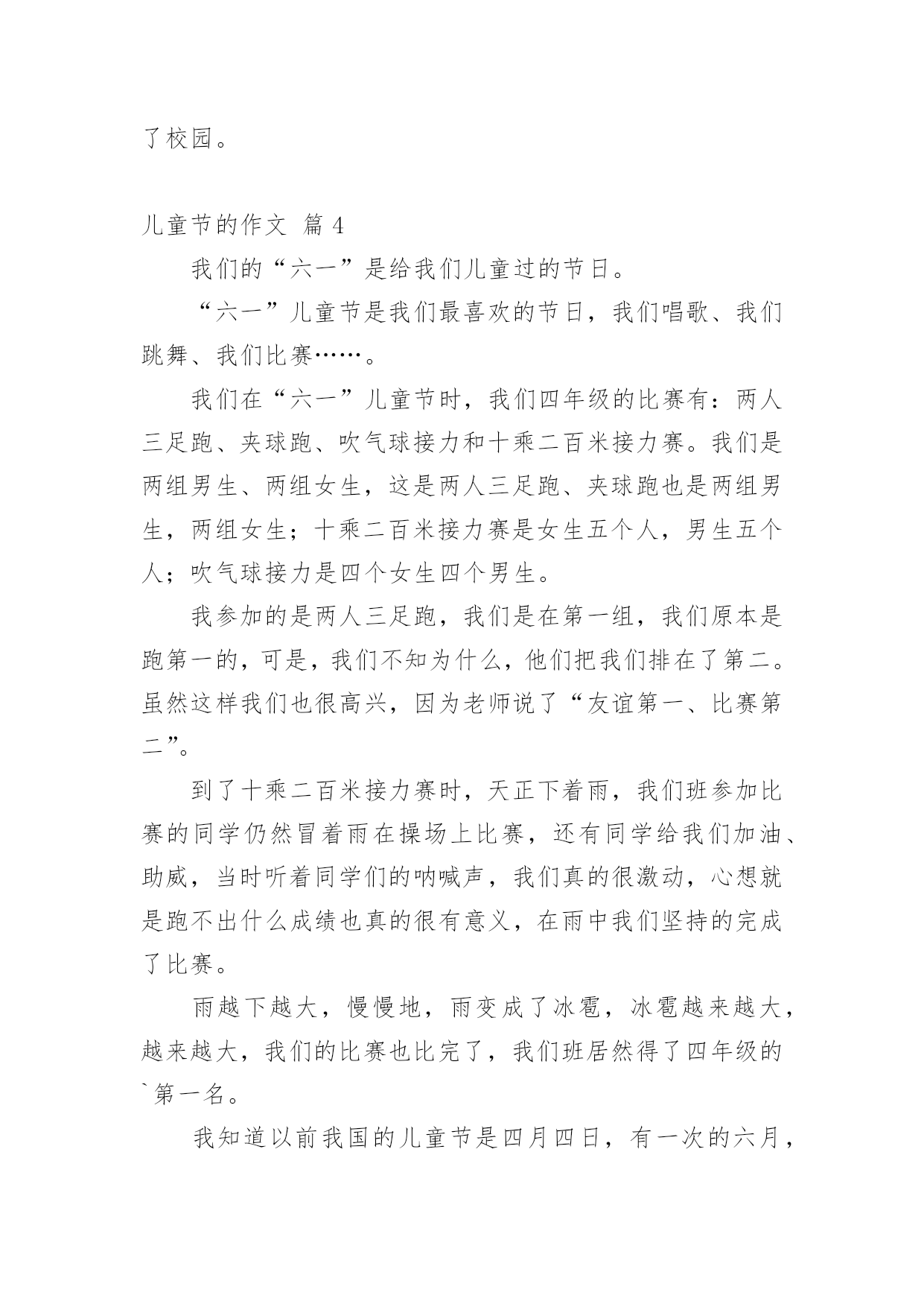 儿童节的作文 儿童节的作文[集锦9篇]在日常学习、工作或生活中,大家都经常看到作文的身影吧,作文是经过人的思想考虑和语言组织,通过文字来表达一个主题意义的记叙方法。作文的注意事项有许多,你确定会写吗?以下是小编帮大家整理的儿童节的作文9篇,欢迎大家借鉴与参考,希望对大家有所帮助。儿童节的作文篇1每到六一这天学校里都要停课半天,召开庆祝大会,举行文艺联欢会。在这个让人快乐的节日。我们全校同学集中在大操场上,参加庆祝大会,观看文艺节目,场面显得非常壮观。在会议开始以后,校长首先讲话,向我们少年儿童表示节日的热烈祝贺,并语重心长地对我们提出“好好学习,天天向上”的要求和希望。紧接着就是我们少先队员代表发言,表示自己的愉快心情,也表示我们勤奋学习、奋发向上、不断进步、立志成才的决心和志向。然后,精彩的文艺节目就拉开了序幕。各班同学都要拿出节目。在这些丰富多彩的'节目中,有独唱、大合唱,集体舞,相声、快板、音乐演奏等等。由于准备充分,几乎所有的节目都很受欢迎。我们看着看着,情不自禁地就会鼓起掌来,热烈的掌声此起彼伏,就连树上的鸟儿也停止了鸣叫,好像也被这热闹的场面吸引住了。儿童节的作文篇2六一的阳光灿烂无比,六一的鲜花绚丽多彩,六一是孩子们的节目,六一是孩子们茁壮成长的'季节!在星期五那天,天气晴朗,阳光明媚,我回到学校后,认真听课。到了下午,我们两点钟去礼堂看“六一”儿童节文艺表演,有些同学的爸爸妈妈来了,我看到有一个同学的妈妈给了一部数码相机来照相,有的同学站了起来,有的说话,顿时校园里充满了一片欢声笑语。到了3:30分,已经看完了表演。回到教室,老师给我们说完规则后就开始了游圆活动。我;林一东;潭少容;等管理吹蜡烛,夹波珠,呼啦圈,猜谜语,我们玩得很开心。玩的时候,第一个玩的是周铵仪,全部吹完就有一跟果棒,她说吹不到,她并没有灰心丧气,她继续吹,终于被她吹到了。我说:“你就好了,我就没这么有力气吹这些蜡烛了。”我给了她一跟果棒,她很开心,很快乐地跑了去李君旁。看见她这摸样,就像看到在空中慢步的飞机。她掏出块糖给李君。到了最后,我们玩枪凳子。先由第一组,再到第二组,这样轮下去。到了第四组决赛,我和小李决赛,最终是我赢了。我很开心,就像飞翔在高空的小鸟。回到家后,我把这件事告诉给爸爸妈妈。他们听了之后也很想玩,只可惜他们没这一个福气。我想着这件事,还是不经笑了起来。晚上睡觉时,我发了一个梦,梦见自己笑的合不笼嘴……儿童节的作文篇3期盼已久的“六一”儿童节又到了。一大早,太阳公公就露出了笑脸,树上的小鸟也仿佛特别的高兴,在枝头上快乐歌唱。我怀着兴奋的心情,一边哼着歌,一边蹦蹦跳跳着上学去。今天是我们儿童的节日,校园里到处都是一片喜气洋洋的气氛。我们学校也特别为我们举行了庆祝“六一”儿童节的'活动。上午8:00整,庆祝活动正式开始了,首先是分发礼物。“六一”儿童节的礼物可真多呀,有笔记本、美乐多、薯片等。我们个个的脸上都洋溢着幸福的微笑。接着是大家最喜欢的游园活动。游园活动的项目丰富多彩,而且非常有趣。有吹蜡烛、夹豆子、水中吹球、抢板凳等。在活动中,令我捧腹大笑的是“抢板凳”的项目。瞧,圆圈中摆着4张凳子,在轻快的乐曲声中,6名同学迈着轻盈的步伐围着凳子转。突然,乐曲停了,这几个同学争先恐后地坐向凳子。他们你争我抢,竟硬生生把两个同学挤到坐在地板上,观众们都笑得前俯后仰。其它的活动也非常精彩,同学们玩得都乐开了怀。时间过得可真快,转眼间,我校庆祝“六一”儿童节的活动在同学的欢声笑语中结束了。同学们都依依不舍地离开了校园。儿童节的作文篇4我们的“六一”是给我们儿童过的节日。“六一”儿童节是我们最喜欢的节日,我们唱歌、我们跳舞、我们比赛……。我们在“六一”儿童节时,我们四年级的比赛有:两人三足跑、夹球跑、吹气球接力和十乘二百米接力赛。我们是两组男生、两组女生,这是两人三足跑、夹球跑也是两组男生,两组女生;十乘二百米接力赛是女生五个人,男生五个人;吹气球接力是四个女生四个男生。我参加的是两人三足跑,我们是在第一组,我们原本是跑第一的,可是,我们不知为什么,他们把我们排在了第二。虽然这样我们也很高兴,因为老师说了“友谊第一、比赛第二”。到了十乘二百米接力赛时,天正下着雨,我们班参加比赛的同学仍然冒着雨在操场上比赛,还有同学给我们加油、助威,当时听着同学们的呐喊声,我们真的很激动,心想就是跑不出什么成绩也真的很有意义,在雨中我们坚持的完成了比赛。雨越下越大,慢慢地,雨变成了冰雹,冰雹越来越大,越来越大,我们的比赛也比完了,我们班居然得了四年级的`第一名。我知道以前我国的儿童节是四月四日,有一次的六月,我国打仗,死的人数比以后和之前都多。所以我国实际儿童节改为六月一日。我还知道德国的儿童节是五月时,英国的儿童节是四月份的,我还知道一些国家的儿童节是