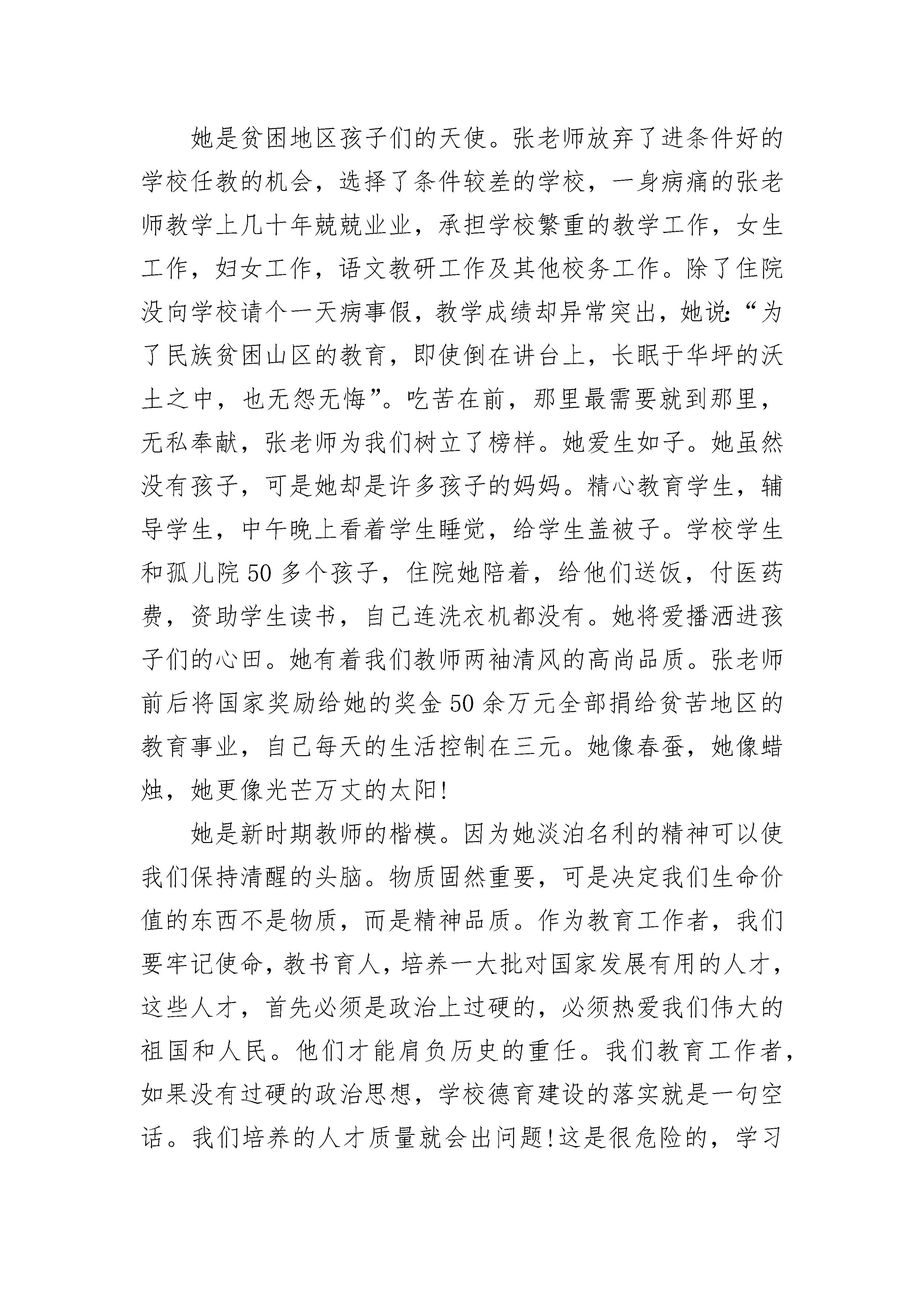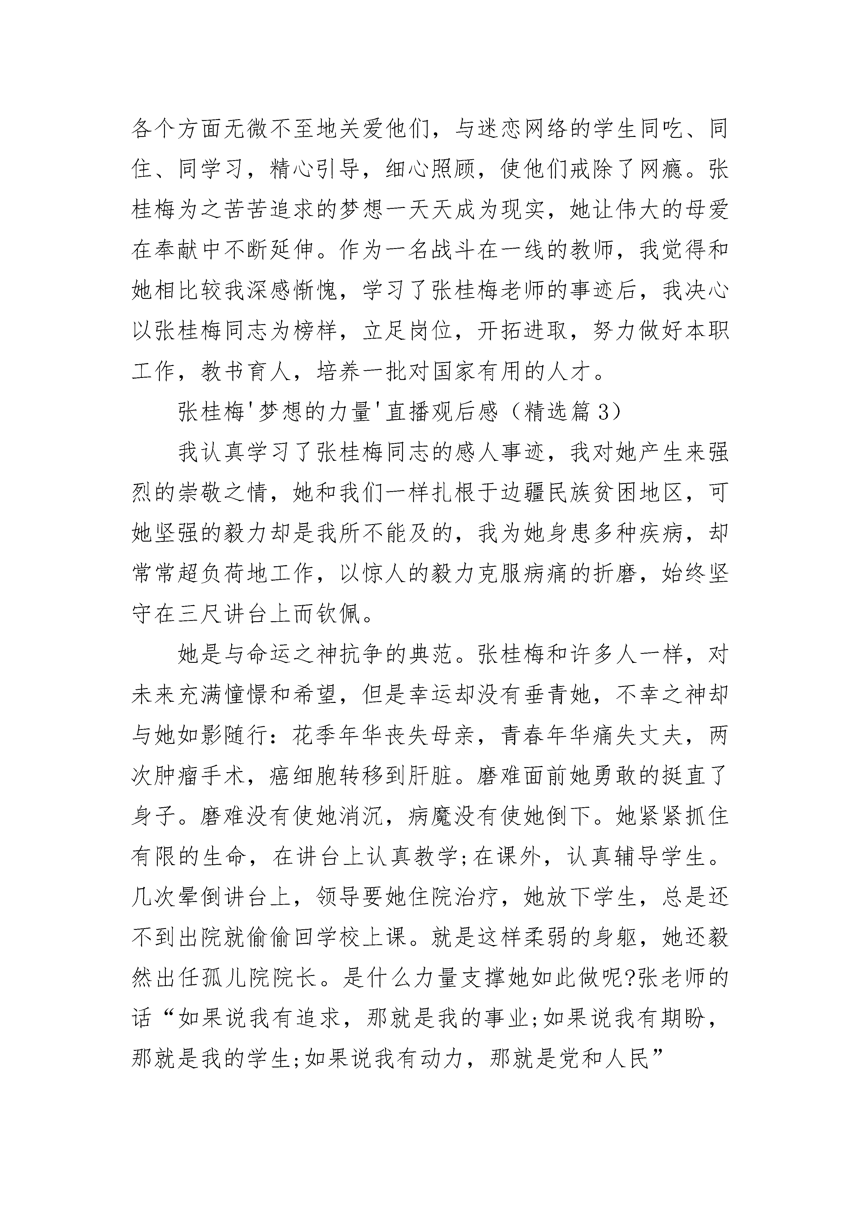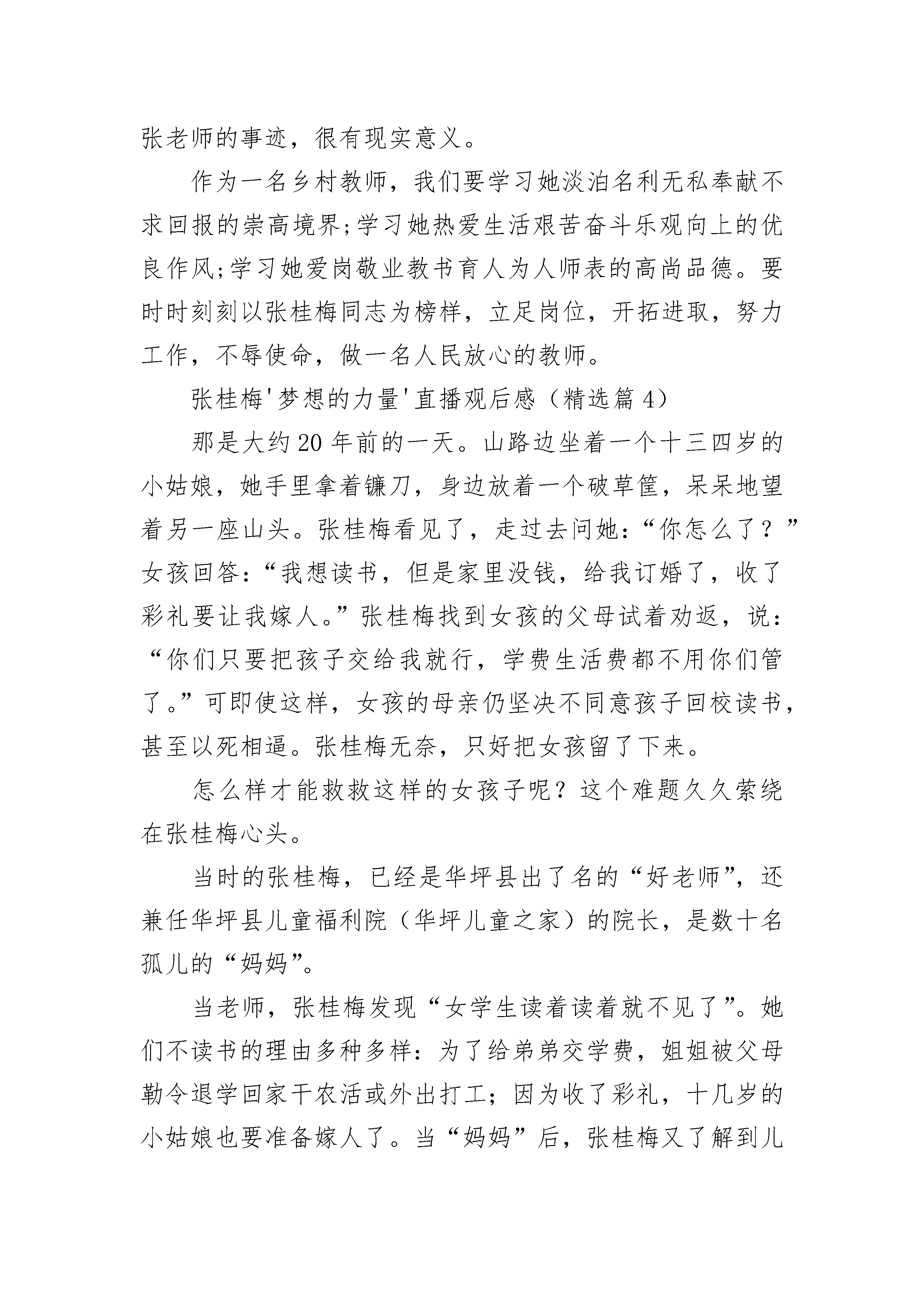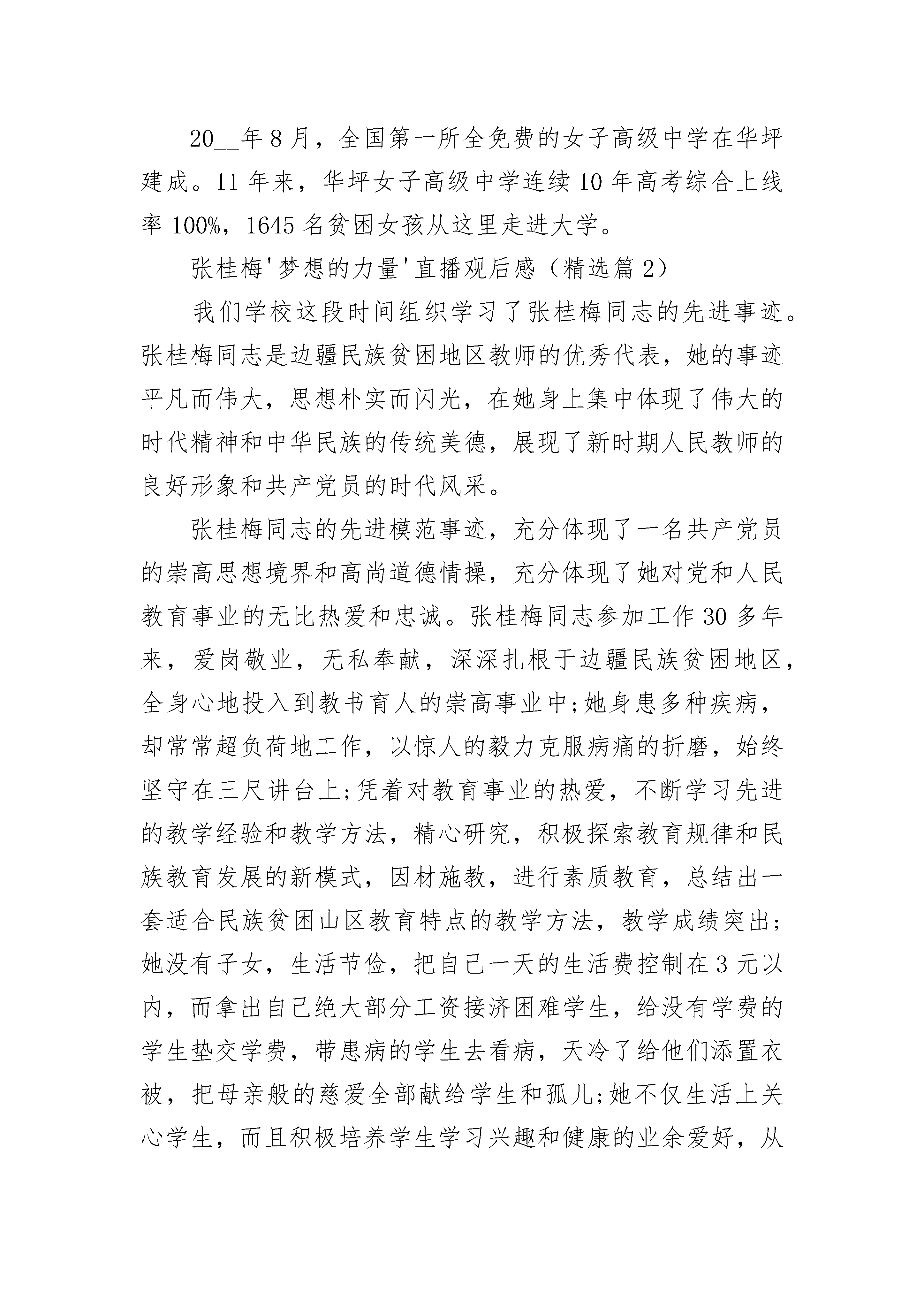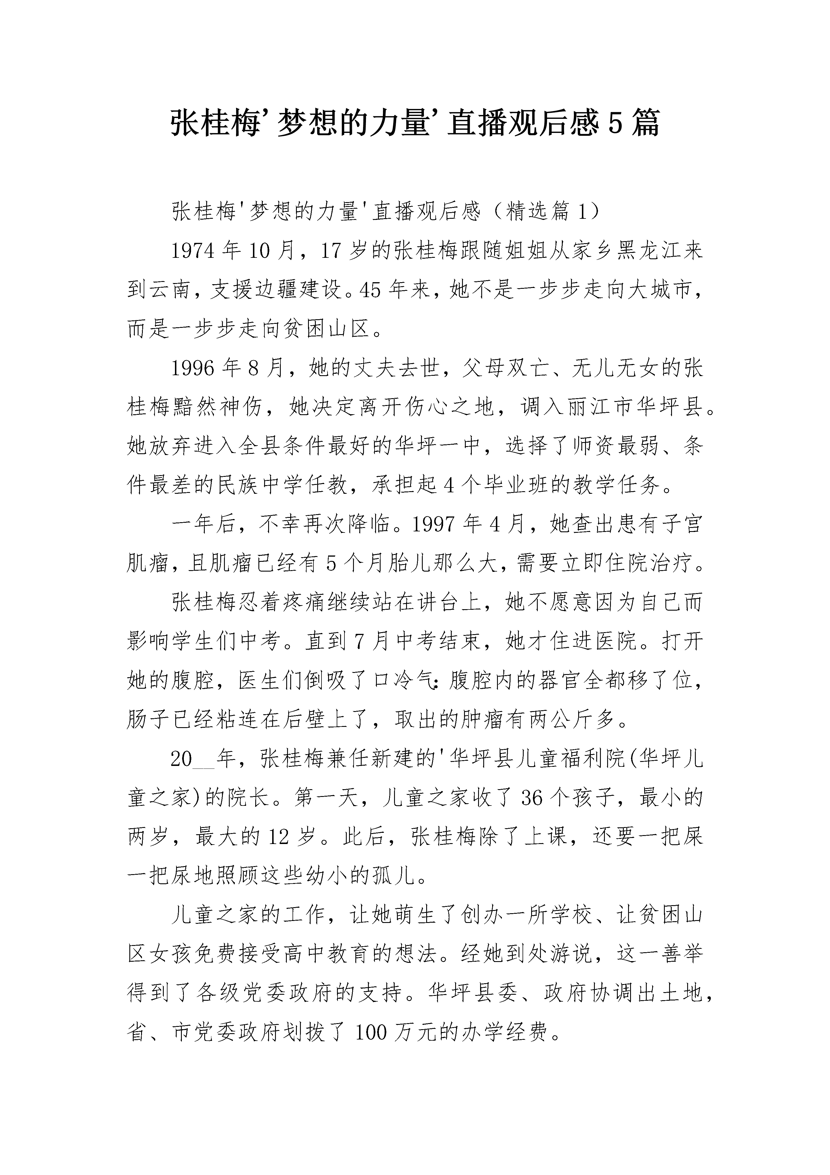 张桂梅'梦想的力量'直播观后感5篇张桂梅'梦想的力量'直播观后感(精选篇1)1974年10月,17岁的张桂梅跟随姐姐从家乡黑龙江来到云南,支援边疆建设。45年来,她不是一步步走向大城市,而是一步步走向贫困山区。1996年8月,她的丈夫去世,父母双亡、无儿无女的张桂梅黯然神伤,她决定离开伤心之地,调入丽江市华坪县。她放弃进入全县条件最好的华坪一中,选择了师资最弱、条件最差的民族中学任教,承担起4个毕业班的教学任务。一年后,不幸再次降临。1997年4月,她查出患有子宫肌瘤,且肌瘤已经有5个月胎儿那么大,需要立即住院治疗。张桂梅忍着疼痛继续站在讲台上,她不愿意因为自己而影响学生们中考。直到7月中考结束,她才住进医院。打开她的腹腔,医生们倒吸了口冷气:腹腔内的器官全都移了位,肠子已经粘连在后壁上了,取出的肿瘤有两公斤多。20__年,张桂梅兼任新建的'华坪县儿童福利院(华坪儿童之家)的院长。第一天,儿童之家收了36个孩子,最小的两岁,最大的12岁。此后,张桂梅除了上课,还要一把屎一把尿地照顾这些幼小的孤儿。儿童之家的工作,让她萌生了创办一所学校、让贫困山区女孩免费接受高中教育的想法。经她到处游说,这一善举得到了各级党委政府的支持。华坪县委、政府协调出土地,省、市党委政府划拨了100万元的办学经费。20__年8月,全国第一所全免费的女子高级中学在华坪建成。11年来,华坪女子高级中学连续10年高考综合上线率100%,1645名贫困女孩从这里走进大学。张桂梅'梦想的力量'直播观后感(精选篇2)我们学校这段时间组织学习了张桂梅同志的先进事迹。张桂梅同志是边疆民族贫困地区教师的优秀代表,她的事迹平凡而伟大,思想朴实而闪光,在她身上集中体现了伟大的时代精神和中华民族的传统美德,展现了新时期人民教师的良好形象和共产党员的时代风采。张桂梅同志的先进模范事迹,充分体现了一名共产党员的崇高思想境界和高尚道德情操,充分体现了她对党和人民教育事业的无比热爱和忠诚。张桂梅同志参加工作30多年来,爱岗敬业,无私奉献,深深扎根于边疆民族贫困地区,全身心地投入到教书育人的崇高事业中;她身患多种疾病,却常常超负荷地工作,以惊人的毅力克服病痛的折磨,始终坚守在三尺讲台上;凭着对教育事业的热爱,不断学习先进的教学经验和教学方法,精心研究,积极探索教育规律和民族教育发展的新模式,因材施教,进行素质教育,总结出一套适合民族贫困山区教育特点的教学方法,教学成绩突出;她没有子女,生活节俭,把自己一天的生活费控制在3元以内,而拿出自己绝大部分工资接济困难学生,给没有学费的学生垫交学费,带患病的学生去看病,天冷了给他们添置衣被,把母亲般的慈爱全部献给学生和孤儿;她不仅生活上关心学生,而且积极培养学生学习兴趣和健康的业余爱好,从各个方面无微不至地关爱他们,与迷恋网络的学生同吃、同住、同学习,精心引导,细心照顾,使他们戒除了网瘾。张桂梅为之苦苦追求的梦想一天天成为现实,她让伟大的母爱在奉献中不断延伸。作为一名战斗在一线的教师,我觉得和她相比较我深感惭愧,学习了张桂梅老师的事迹后,我决心以张桂梅同志为榜样,立足岗位,开拓进取,努力做好本职工作,教书育人,培养一批对国家有用的人才。张桂梅'梦想的力量'直播观后感(精选篇3)我认真学习了张桂梅同志的感人事迹,我对她产生来强烈的崇敬之情,她和我们一样扎根于边疆民族贫困地区,可她坚强的毅力却是我所不能及的,我为她身患多种疾病,却常常超负荷地工作,以惊人的毅力克服病痛的折磨,始终坚守在三尺讲台上而钦佩。她是与命运之神抗争的典范。张桂梅和许多人一样,对未来充满憧憬和希望,但是幸运却没有垂青她,不幸之神却与她如影随行:花季年华丧失母亲,青春年华痛失丈夫,两次肿瘤手术,癌细胞转移到肝脏。磨难面前她勇敢的挺直了身子。磨难没有使她消沉,病魔没有使她倒下。她紧紧抓住有限的生命,在讲台上认真教学;在课外,认真辅导学生。几次晕倒讲台上,领导要她住院治疗,她放下学生,总是还不到出院就偷偷回学校上课。就是这样柔弱的身躯,她还毅然出任孤儿院院长。是什么力量支撑她如此做呢?张老师的话“如果说我有追求,那就是我的事业;如果说我有期盼,那就是我的学生;如果说我有动力,那就是党和人民”她是贫困地区孩子们的天使。张老师放弃了进条件好的学校任教的机会,选择了条件较差的学校,一身病痛的张老师教学上几十年兢兢业业,承担学校繁重的教学工作,女生工作,妇女工作,语文教研工作及其他校务工作。除了住院没向学校请个一天病事假,教学成绩却异常突出,她说:“为了民族贫困山区的教育,即使倒在讲台上,长眠于华坪的沃土之中,也无怨无悔”。吃苦在前,那里最需要就到那里,无私奉献,张老师为我们树立了榜样。她爱生如子。她虽然没有孩子,可是她却是许多孩子的妈妈。精心教育学生,辅导学生,中午晚上看着学生睡觉,给学生