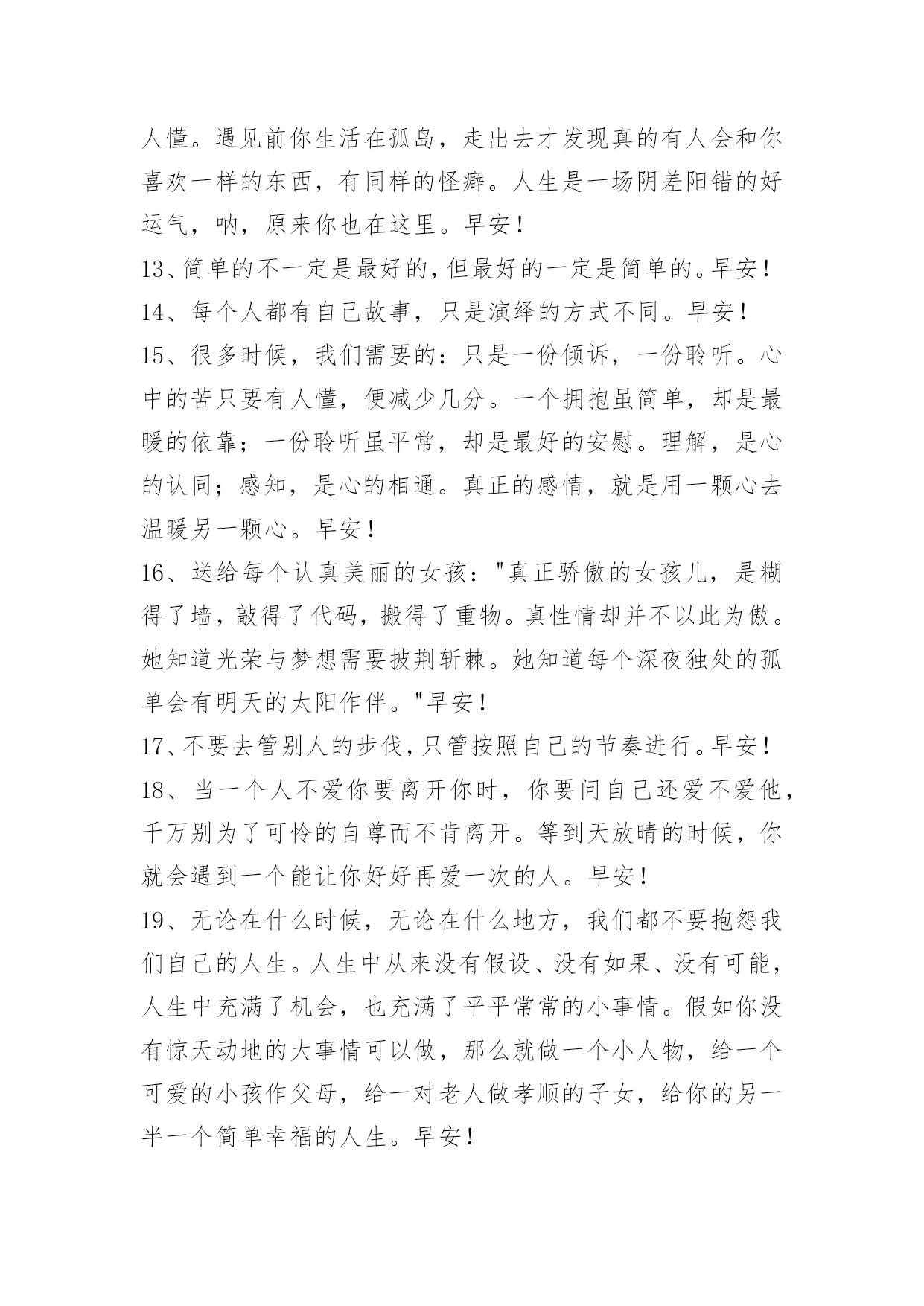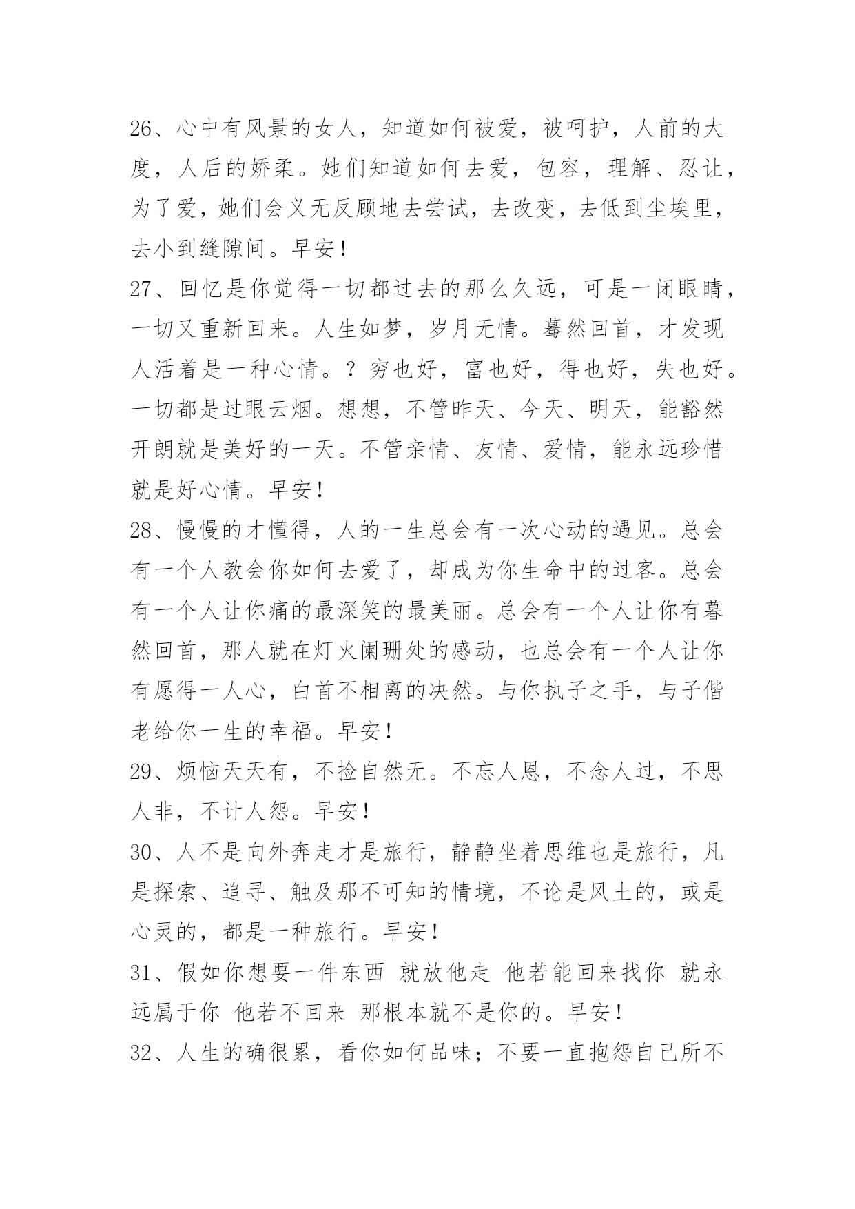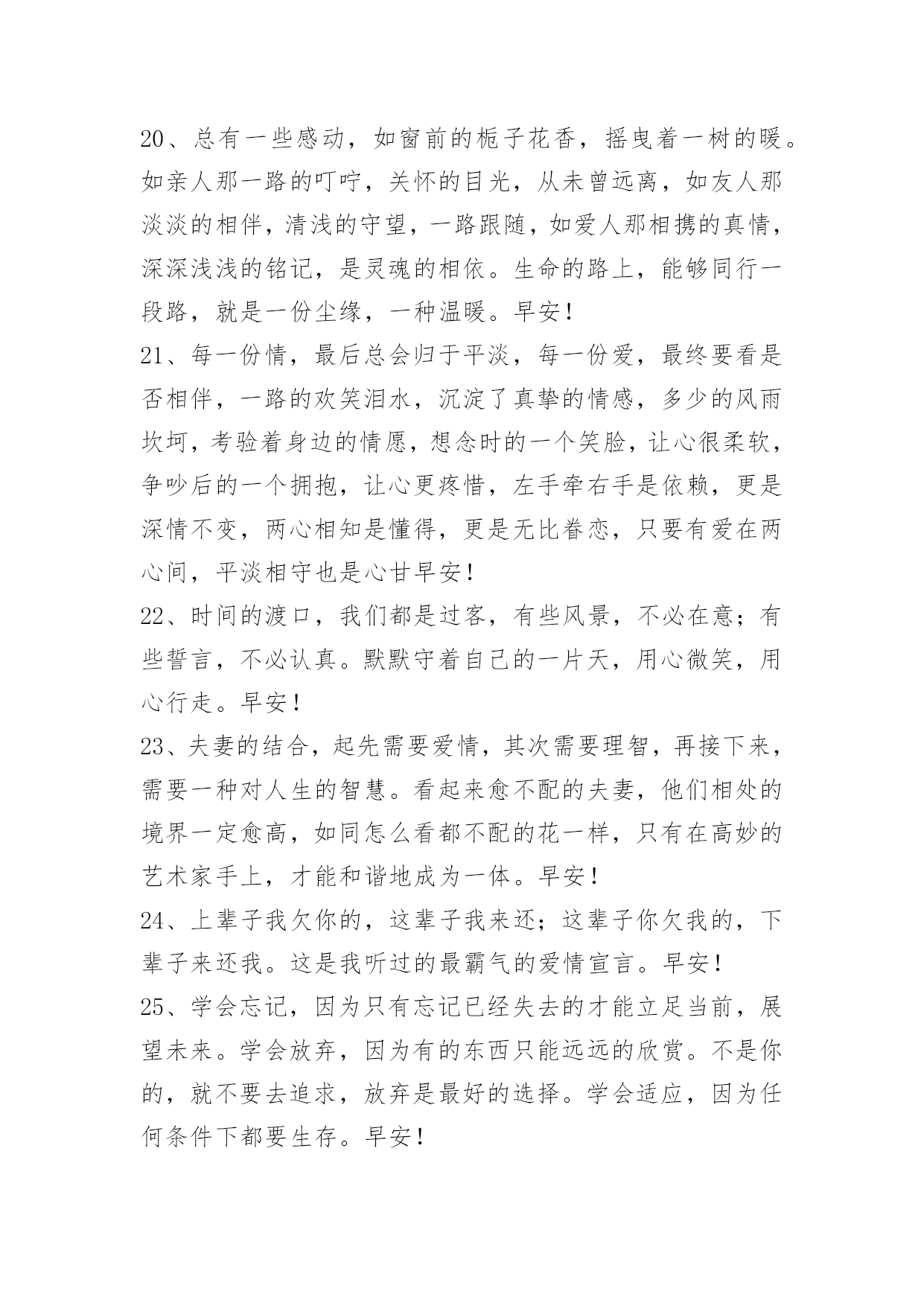 正能量早安祝福语 常用正能量早安祝福语60句我以为真正的美丽,是可以通过时间考验的东西。时间,有着压迫、不赦免任何人的腐蚀力量,以及将所有事物归还土地的意志。能够耐受这些而留存下来的形与色,才是真正的美丽。早安!这篇文章是小编精心整理的正能量早安祝福语,赶紧来看看吧。1、男人的四个优秀品质:毅力、勇敢、包容、智慧。什么叫毅力?别人认为痛苦的时候、看不见光明的时候,你看见了黑暗尽头的光明。什么叫勇敢?当你勇敢的时候会奋不顾身。什么叫包容?把所有的是非恩怨搁你肚子里消化。什么叫智慧?不随波逐流,能看到别人看不到的层面。ii早安!2、征途漫漫,你也许会感觉疲累。那是你还没有完全把自己投入,还未彻底地懂得欣赏自己,总把自己迷失在他人的风彩之中。其实,你完全可以融入青春这个大家庭,唱着属于自己的歌,焕发出自己的那一份光与彩。3、关于"明天",有两种可能。一种是比今天好,所以今天应该开心!一种是比今天苦,那今天就更值得开心了!你说呢?早安!4、到二十几岁,你会发现好多未曾想过的问题突然之间就要面对了,婚姻、工作等等。汹涌而来的现实让我们变得格外焦虑,而焦虑的后果便是如同无头苍蝇般每天都不停歇但依旧一点头绪都没有。其实面对焦虑最好的方式是慢下来、静下来,要相信所有人都会经历这个阶段,以体验的心态度过它就好了。早安!5、世界不管怎样荒凉,爱过你就不会孤单。早安!6、好的男女关系应该是没有负荷的,不是瞻前顾后焦头烂额,也不是如履薄冰如临深渊。而是自然而然地牵手拥抱亲吻,偶尔为芝麻绿豆的事闹个小架,醒来时他在为你煎荷包蛋,睡觉时你为她盖好被子。你们的心里除了彼此,再也容不下其他闲杂人等,"唯一"这个词,你能用得理所当然。早安!7、我不知道自己究竟要多坚强,但是我知道,我只有强大,才能像一棵大树那样,给你遮风避雨,给你温暖,给你保护。早安!8、有一种爱叫做固执。我就要你,我偏要你,挡不住爱,管不着爱,流了眼泪受了伤,舔舔伤口继续爱。早安!9、很多时候限制我们的,不是周遭的环境,也不是他人的言行,而是我们自己。如果不能打破心的禁锢,即使给你整个天空,你也找不到自由的感觉。心是一个人的翅膀,心有多大,世界就有多大。早安~10、带着自己的世界奔走他方。早安!11、真正的爱情要懂得珍惜,没有谁和谁是天生注定就在一起的,一辈子其实不长,能遇到心爱的人是多么幸运,为何不握紧她(他)的手。早安!12、坚持,赶路,有时是你一个人的事;吹风,听歌,有时世界都跟你没关系。春去秋来,人来人往,你的怪癖好像没人懂。遇见前你生活在孤岛,走出去才发现真的有人会和你喜欢一样的东西,有同样的怪癖。人生是一场阴差阳错的好运气,呐,原来你也在这里。早安!13、简单的不一定是最好的,但最好的一定是简单的。早安!14、每个人都有自己故事,只是演绎的方式不同。早安!15、很多时候,我们需要的:只是一份倾诉,一份聆听。心中的苦只要有人懂,便减少几分。一个拥抱虽简单,却是最暖的依靠;一份聆听虽平常,却是最好的安慰。理解,是心的认同;感知,是心的相通。真正的感情,就是用一颗心去温暖另一颗心。早安!16、送给每个认真美丽的女孩:"真正骄傲的女孩儿,是糊得了墙,敲得了代码,搬得了重物。真性情却并不以此为傲。她知道光荣与梦想需要披荆斩棘。她知道每个深夜独处的孤单会有明天的太阳作伴。"早安!17、不要去管别人的步伐,只管按照自己的节奏进行。早安!18、当一个人不爱你要离开你时,你要问自己还爱不爱他,千万别为了可怜的自尊而不肯离开。等到天放晴的时候,你就会遇到一个能让你好好再爱一次的人。早安!19、无论在什么时候,无论在什么地方,我们都不要抱怨我们自己的人生。人生中从来没有假设、没有如果、没有可能,人生中充满了机会,也充满了平平常常的小事情。假如你没有惊天动地的大事情可以做,那么就做一个小人物,给一个可爱的小孩作父母,给一对老人做孝顺的子女,给你的另一半一个简单幸福的人生。早安!20、总有一些感动,如窗前的栀子花香,摇曳着一树的暖。如亲人那一路的叮咛,关怀的目光,从未曾远离,如友人那淡淡的相伴,清浅的守望,一路跟随,如爱人那相携的真情,深深浅浅的铭记,是灵魂的相依。生命的路上,能够同行一段路,就是一份尘缘,一种温暖。早安!21、每一份情,最后总会归于平淡,每一份爱,最终要看是否相伴,一路的欢笑泪水,沉淀了真挚的情感,多少的风雨坎坷,考验着身边的情愿,想念时的一个笑脸,让心很柔软,争吵后的一个拥抱,让心更疼惜,左手牵右手是依赖,更是深情不变,两心相知是懂得,更是无比眷恋,只要有爱在两心间,平淡相守也是心甘早安!22、时间的渡口,我们都是过客,有些风景,不必在意;有些誓言,不必认真。默默守着自己的一片天,用心微笑,用心行走。早安!23、夫妻的结合,起先需要爱情,其次需要理智,再接下来,需要一种对人生的智慧。