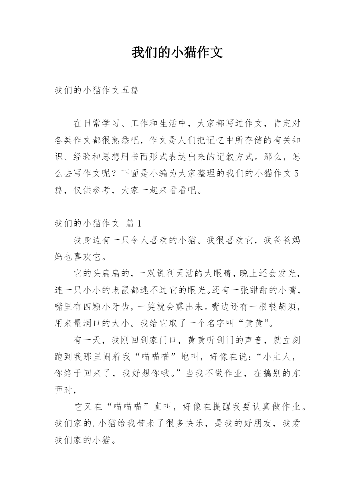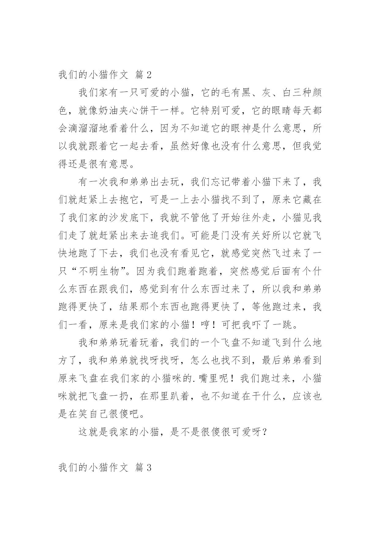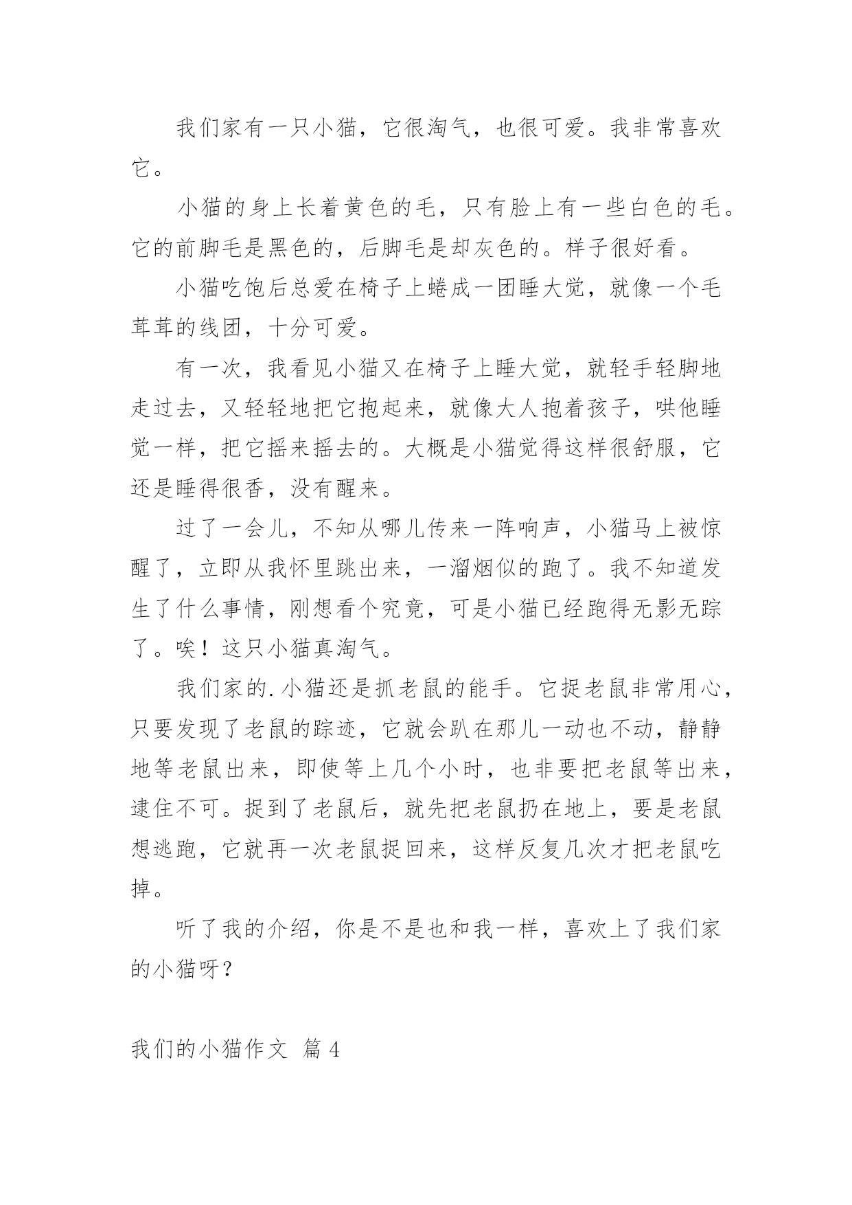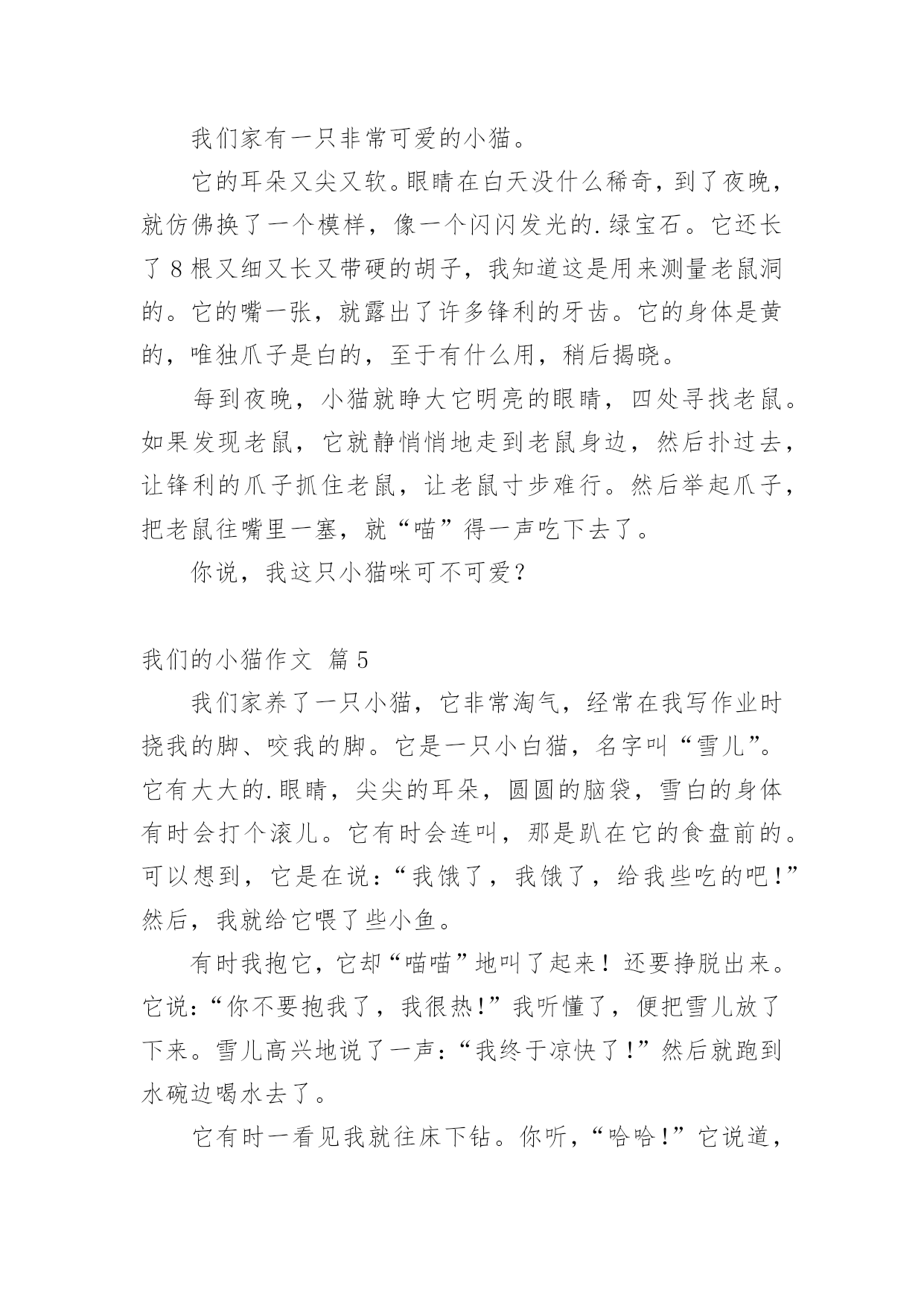 我们的小猫作文 我们的小猫作文五篇在日常学习、工作和生活中,大家都写过作文,肯定对各类作文都很熟悉吧,作文是人们把记忆中所存储的有关知识、经验和思想用书面形式表达出来的记叙方式。那么,怎么去写作文呢?下面是小编为大家整理的我们的小猫作文5篇,仅供参考,大家一起来看看吧。我们的小猫作文篇1我身边有一只令人喜欢的小猫。我很喜欢它,我爸爸妈妈也喜欢它。它的头扁扁的,一双锐利灵活的大眼睛,晚上还会发光,连一只小小的老鼠都逃不过它的眼光。还有一张甜甜的小嘴,嘴里有四颗小牙齿,一笑就会露出来。嘴边还有一根哏胡须,用来量洞口的大小。我给它取了一个名字叫“黄黄”。有一天,我刚回到家门口,黄黄听到门的声音,就立刻跑到我那里闹着我“喵喵喵”地叫,好像在说:“小主人,你终于回来了,我好想你哦。”当我不做作业,在搞别的东西时,它又在“喵喵喵”直叫,好像在提醒我要认真做作业。我们家的.小猫给我带来了很多快乐,是我的好朋友,我爱我们家的小猫。我们的小猫作文篇2我们家有一只可爱的小猫,它的毛有黑、灰、白三种颜色,就像奶油夹心饼干一样。它特别可爱,它的眼睛每天都会滴溜溜地看着什么,因为不知道它的眼神是什么意思,所以我就跟着它一起去看,虽然好像也没有什么意思,但我觉得还是很有意思。有一次我和弟弟出去玩,我们忘记带着小猫下来了,我们就赶紧上去抱它,可是一上去小猫找不到了,原来它藏在了我们家的沙发底下,我就不管他了开始往外走,小猫见我们走了就赶紧出来去追我们。可能是门没有关好所以它就飞快地跑了下去,我们也没有看见它,就感觉突然飞过来了一只“不明生物”。因为我们跑着跑着,突然感觉后面有个什么东西在跟我们,感觉到有什么东西过来了,所以我和弟弟跑得更快了,结果那个东西也跑得更快了,等他跑过来,我们一看,原来是我们家的小猫!哼!可把我吓了一跳。我和弟弟玩着玩着,我们的一个飞盘不知道飞到什么地方了,我和弟弟就找呀找呀,怎么也找不到,最后弟弟看到原来飞盘在我们家的小猫咪的.嘴里呢!我们跑过来,小猫咪就把飞盘一扔,在那里趴着,也不知道在干什么,应该也是在笑自己很傻吧。这就是我家的小猫,是不是很傻很可爱呀?我们的小猫作文篇3我们家有一只小猫,它很淘气,也很可爱。我非常喜欢它。小猫的身上长着黄色的毛,只有脸上有一些白色的毛。它的前脚毛是黑色的,后脚毛是却灰色的。样子很好看。小猫吃饱后总爱在椅子上蜷成一团睡大觉,就像一个毛茸茸的线团,十分可爱。有一次,我看见小猫又在椅子上睡大觉,就轻手轻脚地走过去,又轻轻地把它抱起来,就像大人抱着孩子,哄他睡觉一样,把它摇来摇去的。大概是小猫觉得这样很舒服,它还是睡得很香,没有醒来。过了一会儿,不知从哪儿传来一阵响声,小猫马上被惊醒了,立即从我怀里跳出来,一溜烟似的跑了。我不知道发生了什么事情,刚想看个究竟,可是小猫已经跑得无影无踪了。唉!这只小猫真淘气。我们家的.小猫还是抓老鼠的能手。它捉老鼠非常用心,只要发现了老鼠的踪迹,它就会趴在那儿一动也不动,静静地等老鼠出来,即使等上几个小时,也非要把老鼠等出来,逮住不可。捉到了老鼠后,就先把老鼠扔在地上,要是老鼠想逃跑,它就再一次老鼠捉回来,这样反复几次才把老鼠吃掉。听了我的介绍,你是不是也和我一样,喜欢上了我们家的小猫呀?我们的小猫作文篇4我们家有一只非常可爱的小猫。它的耳朵又尖又软。眼睛在白天没什么稀奇,到了夜晚,就仿佛换了一个模样,像一个闪闪发光的.绿宝石。它还长了8根又细又长又带硬的胡子,我知道这是用来测量老鼠洞的。它的嘴一张,就露出了许多锋利的牙齿。它的身体是黄的,唯独爪子是白的,至于有什么用,稍后揭晓。每到夜晚,小猫就睁大它明亮的眼睛,四处寻找老鼠。如果发现老鼠,它就静悄悄地走到老鼠身边,然后扑过去,让锋利的爪子抓住老鼠,让老鼠寸步难行。然后举起爪子,把老鼠往嘴里一塞,就“喵”得一声吃下去了。你说,我这只小猫咪可不可爱?我们的小猫作文篇5我们家养了一只小猫,它非常淘气,经常在我写作业时挠我的脚、咬我的脚。它是一只小白猫,名字叫“雪儿”。它有大大的.眼睛,尖尖的耳朵,圆圆的脑袋,雪白的身体有时会打个滚儿。它有时会连叫,那是趴在它的食盘前的。可以想到,它是在说:“我饿了,我饿了,给我些吃的吧!”然后,我就给它喂了些小鱼。有时我抱它,它却“喵喵”地叫了起来!还要挣脱出来。它说:“你不要抱我了,我很热!”我听懂了,便把雪儿放了下来。雪儿高兴地说了一声:“我终于凉快了!”然后就跑到水碗边喝水去了。它有时一看见我就往床下钻。你听,“哈哈!”它说道,“你抓不住我的!”可真够调皮的!它是一只小懒猫,白天总是呼呼地睡大觉。我爱我们家的小猫。