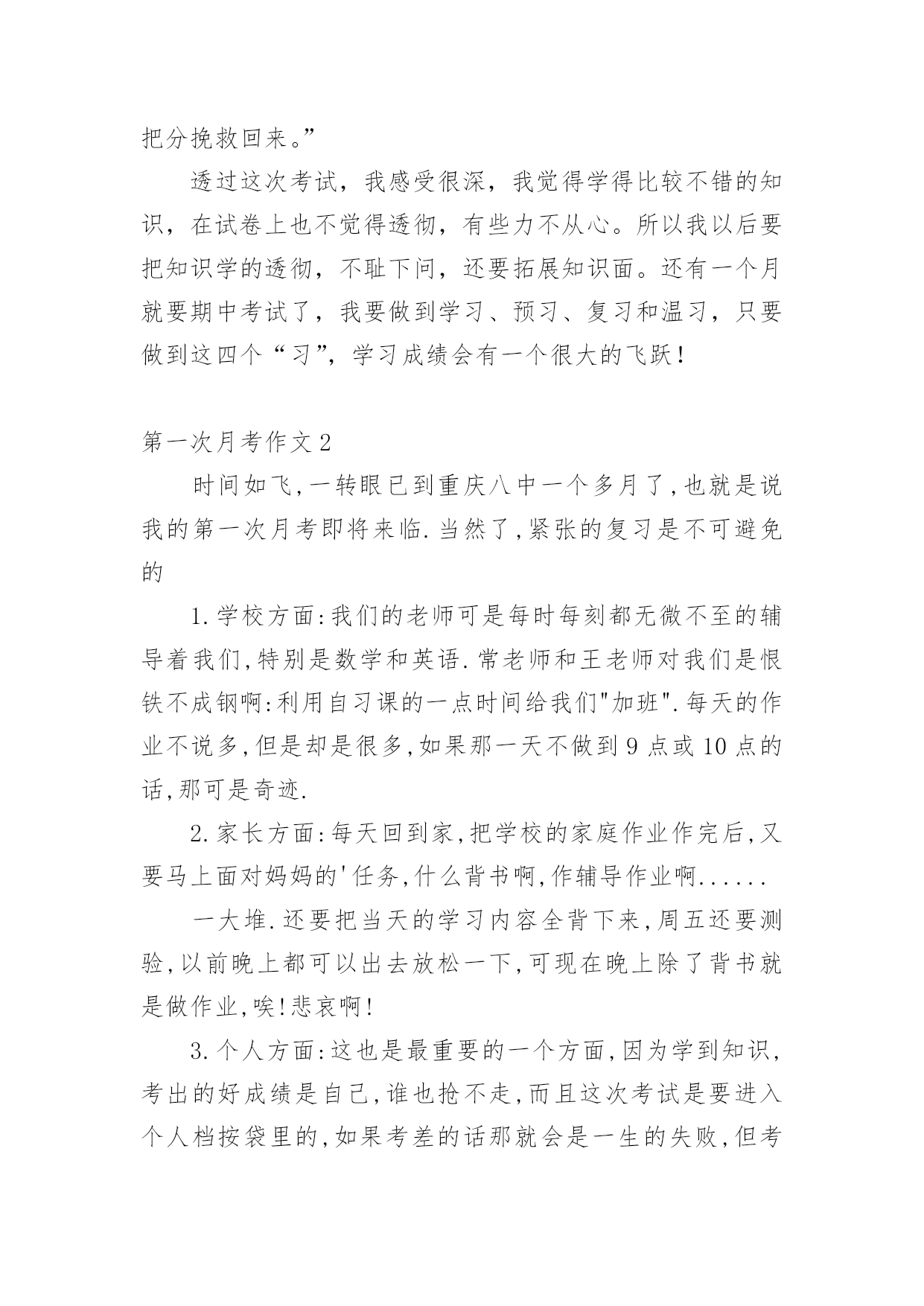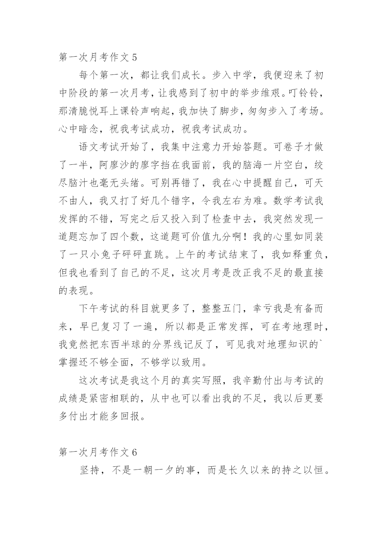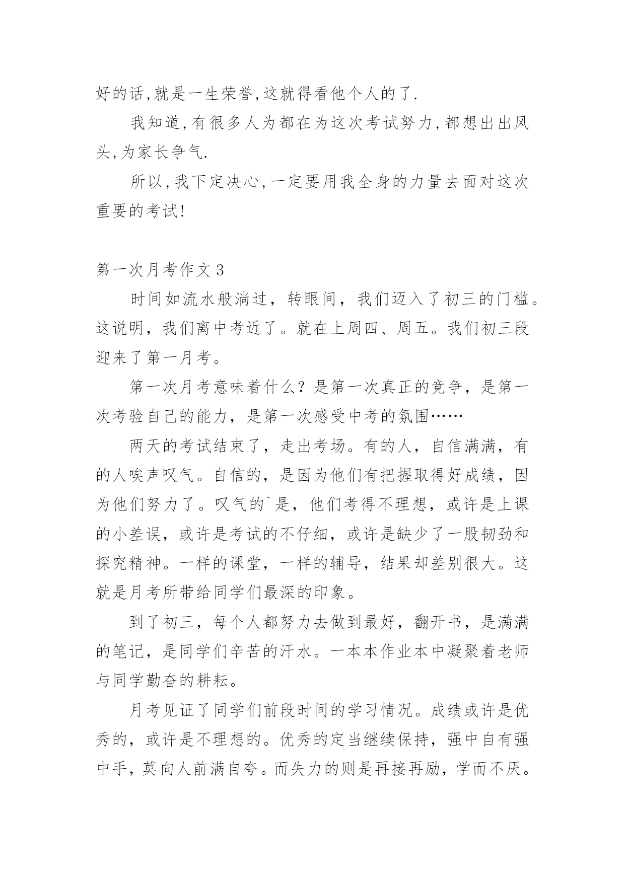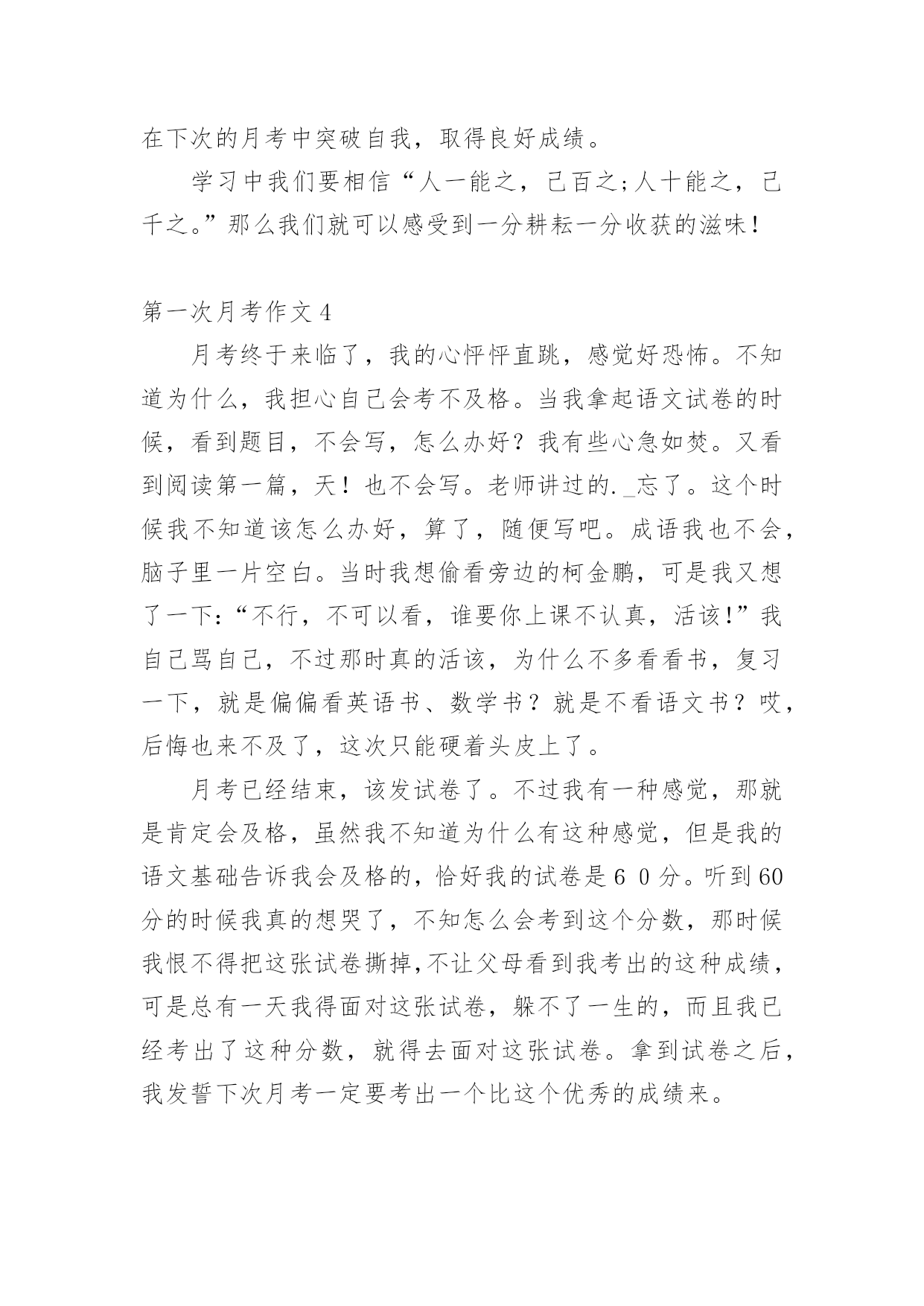 第一次月考作文 第一次月考作文【推荐】在学习、工作乃至生活中,大家最不陌生的就是作文了吧,作文是由文字组成,经过人的思想考虑,通过语言组织来表达一个主题意义的文体。那要怎么写好作文呢?下面是小编为大家整理的第一次月考作文,欢迎阅读,希望大家能够喜欢。第一次月考作文1这天,是我上初一年级的第一次月考,月考、月考,就是检阅同学们在这一个月中的学习状况。伴着铃声,监考老师拿着试卷走进来,打开数学试卷,分为几份,发了下去,然后,说:“同学们都拿到试卷了吧,先写上班级、姓名和考试座位号,再进行答卷。”我拿到试卷,先进行5分钟浏览一下,然后开始答卷。直到监考老师说:“收卷!”这两个字,我从试卷上抬起头来。我初一年级的第一次月考第一科结束了。考试过后,鸦雀无声的教室立刻沸腾起来,大家想着各题的答案。教室里炸开了锅,大家有的为自我因为题目漏做而惋惜;有的为自我的失误而垂头丧气;有的因为自我做对而激动……这时这班监考老师的'走进来,说:“第一科已经考完了,大家不要讨论了,如果没有考好,争取在下一科中把分挽救回来。”透过这次考试,我感受很深,我觉得学得比较不错的知识,在试卷上也不觉得透彻,有些力不从心。所以我以后要把知识学的透彻,不耻下问,还要拓展知识面。还有一个月就要期中考试了,我要做到学习、预习、复习和温习,只要做到这四个“习”,学习成绩会有一个很大的飞跃!第一次月考作文2时间如飞,一转眼已到重庆八中一个多月了,也就是说我的第一次月考即将来临.当然了,紧张的复习是不可避免的1.学校方面:我们的老师可是每时每刻都无微不至的辅导着我们,特别是数学和英语.常老师和王老师对我们是恨铁不成钢啊:利用自习课的一点时间给我们"加班".每天的作业不说多,但是却是很多,如果那一天不做到9点或10点的话,那可是奇迹.2.家长方面:每天回到家,把学校的家庭作业作完后,又要马上面对妈妈的'任务,什么背书啊,作辅导作业啊......一大堆.还要把当天的学习内容全背下来,周五还要测验,以前晚上都可以出去放松一下,可现在晚上除了背书就是做作业,唉!悲哀啊!3.个人方面:这也是最重要的一个方面,因为学到知识,考出的好成绩是自己,谁也抢不走,而且这次考试是要进入个人档按袋里的,如果考差的话那就会是一生的失败,但考好的话,就是一生荣誉,这就得看他个人的了.我知道,有很多人为都在为这次考试努力,都想出出风头,为家长争气.所以,我下定决心,一定要用我全身的力量去面对这次重要的考试!第一次月考作文3时间如流水般淌过,转眼间,我们迈入了初三的门槛。这说明,我们离中考近了。就在上周四、周五。我们初三段迎来了第一月考。第一次月考意味着什么?是第一次真正的竞争,是第一次考验自己的能力,是第一次感受中考的氛围……两天的考试结束了,走出考场。有的人,自信满满,有的人唉声叹气。自信的,是因为他们有把握取得好成绩,因为他们努力了。叹气的`是,他们考得不理想,或许是上课的小差误,或许是考试的不仔细,或许是缺少了一股韧劲和探究精神。一样的课堂,一样的辅导,结果却差别很大。这就是月考所带给同学们最深的印象。到了初三,每个人都努力去做到最好,翻开书,是满满的笔记,是同学们辛苦的汗水。一本本作业本中凝聚着老师与同学勤奋的耕耘。月考见证了同学们前段时间的学习情况。成绩或许是优秀的,或许是不理想的。优秀的定当继续保持,强中自有强中手,莫向人前满自夸。而失力的则是再接再励,学而不厌。在下次的月考中突破自我,取得良好成绩。学习中我们要相信“人一能之,己百之;人十能之,己千之。”那么我们就可以感受到一分耕耘一分收获的滋味!第一次月考作文4月考终于来临了,我的心怦怦直跳,感觉好恐怖。不知道为什么,我担心自己会考不及格。当我拿起语文试卷的时候,看到题目,不会写,怎么办好?我有些心急如焚。又看到阅读第一篇,天!也不会写。老师讲过的._忘了。这个时候我不知道该怎么办好,算了,随便写吧。成语我也不会,脑子里一片空白。当时我想偷看旁边的柯金鹏,可是我又想了一下:“不行,不可以看,谁要你上课不认真,活该!”我自己骂自己,不过那时真的活该,为什么不多看看书,复习一下,就是偏偏看英语书、数学书?就是不看语文书?哎,后悔也来不及了,这次只能硬着头皮上了。月考已经结束,该发试卷了。不过我有一种感觉,那就是肯定会及格,虽然我不知道为什么有这种感觉,但是我的语文基础告诉我会及格的,恰好我的试卷是60分。听到60分的时候我真的想哭了,不知怎么会考到这个分数,那时候我恨不得把这张试卷撕掉,不让父母看到我考出的这种成绩,可是总有一天我得面对这张试卷,躲不了一生的,而且我已经考出了这种分数,就得去面对这张试卷。拿到试卷之后,我发誓下次月考一定要考出一个比这个优秀的成绩来。第一次月考作文5每个第一次,都让我们成长。步入中学,我便迎来了初中阶段的第一次月