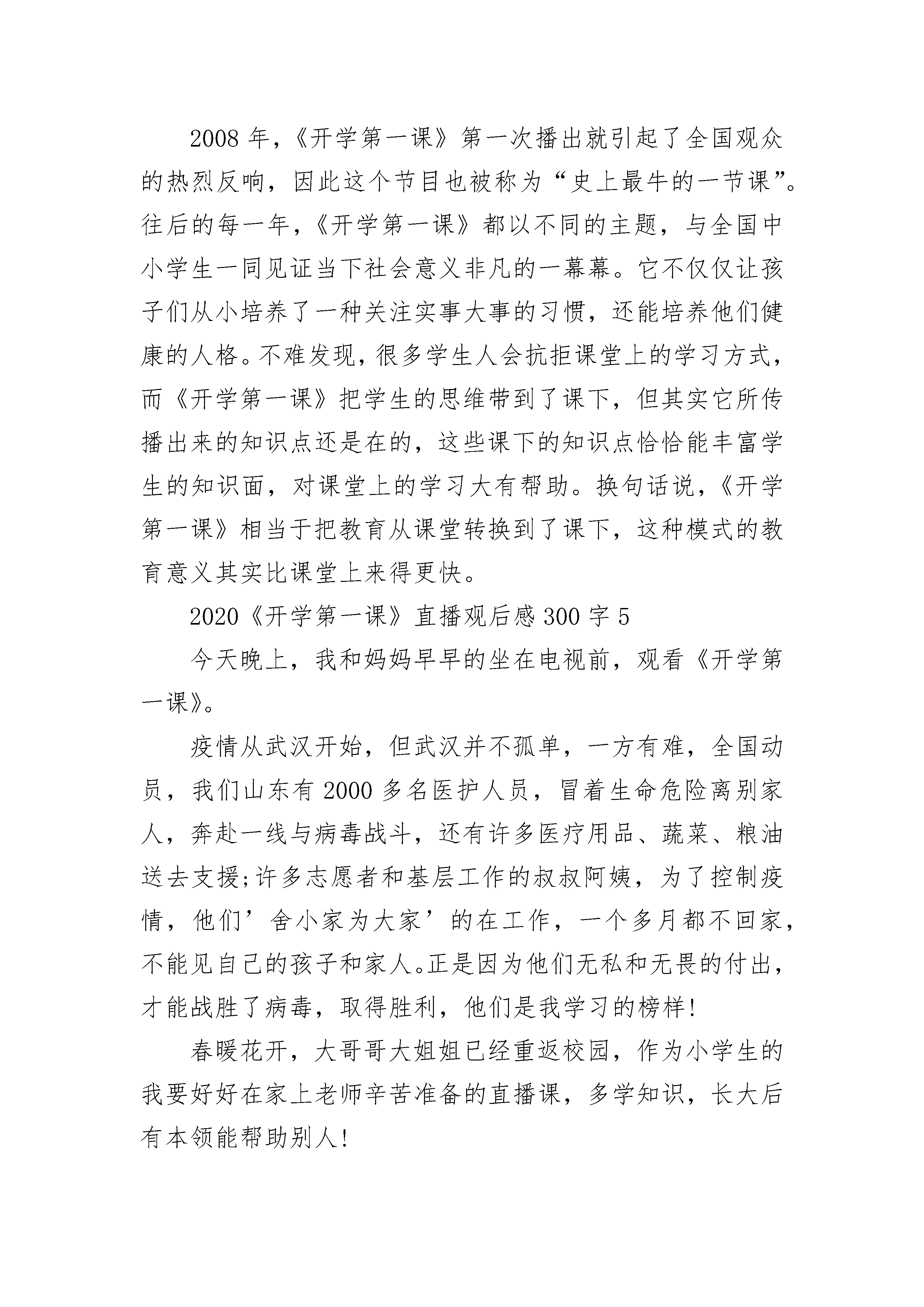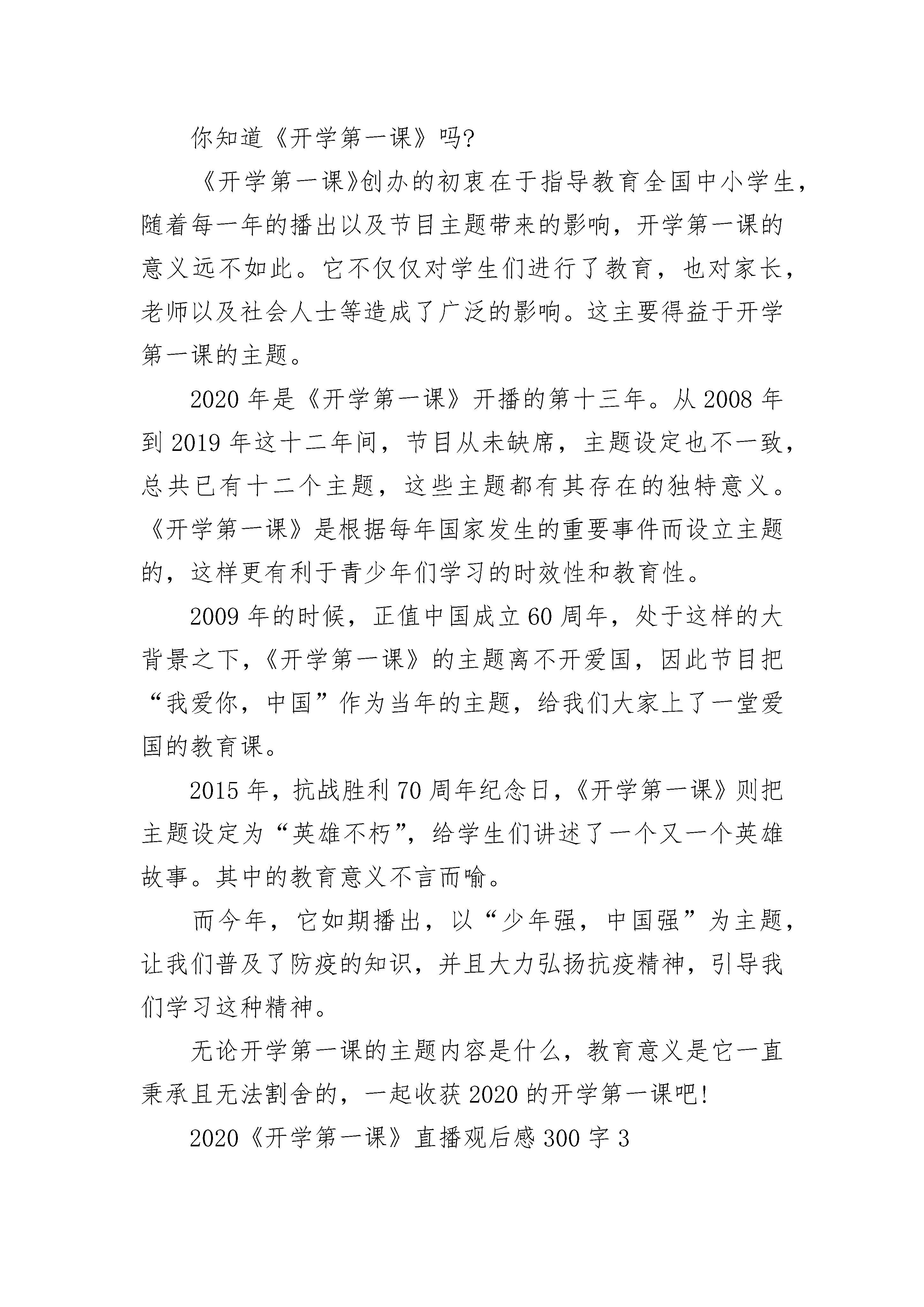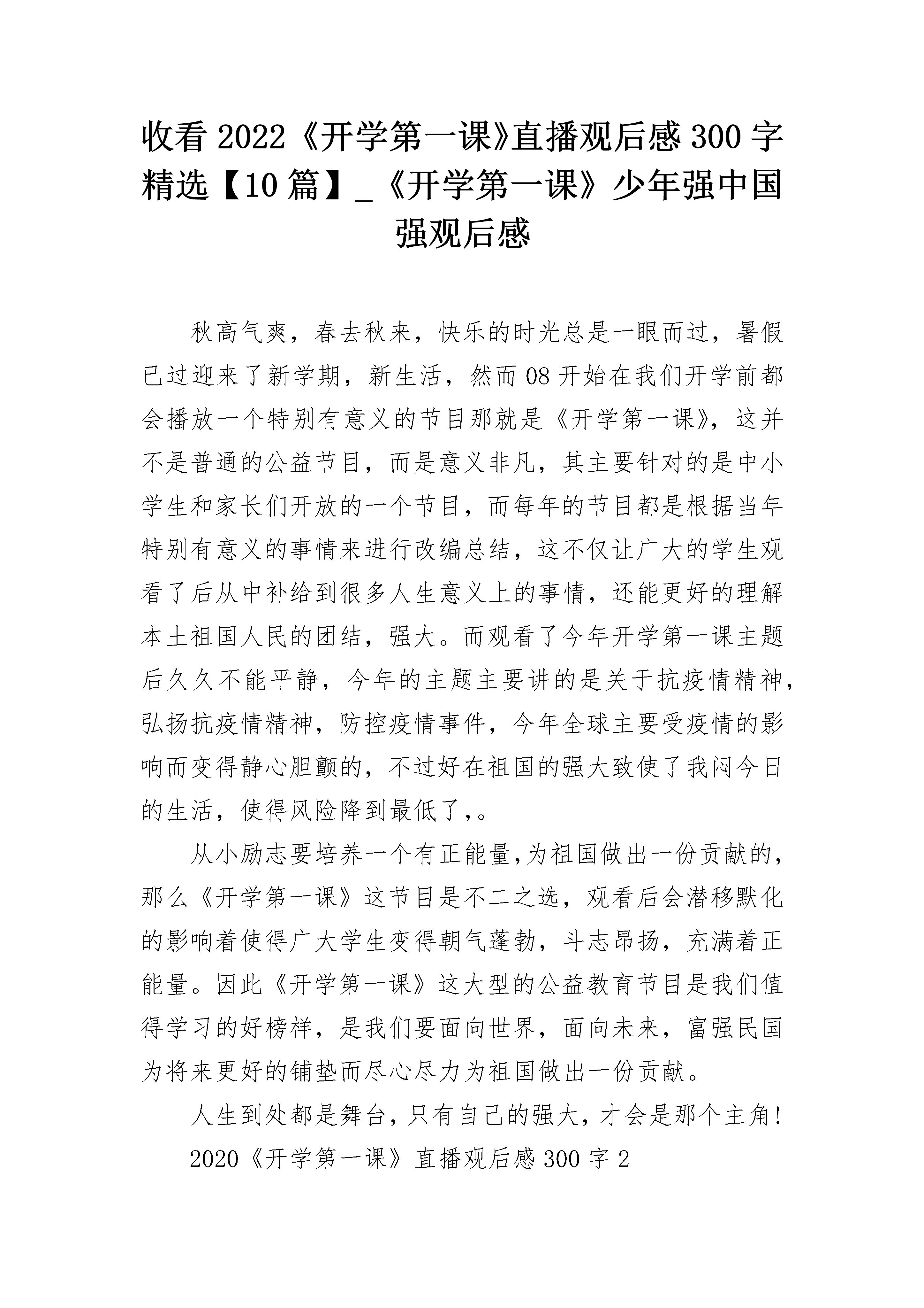 收看2022《开学第一课》直播观后感300字精选【10篇】_《开学第一课》少年强中国强观后感秋高气爽,春去秋来,快乐的时光总是一眼而过,暑假已过迎来了新学期,新生活,然而08开始在我们开学前都会播放一个特别有意义的节目那就是《开学第一课》,这并不是普通的公益节目,而是意义非凡,其主要针对的是中小学生和家长们开放的一个节目,而每年的节目都是根据当年特别有意义的事情来进行改编总结,这不仅让广大的学生观看了后从中补给到很多人生意义上的事情,还能更好的理解本土祖国人民的团结,强大。而观看了今年开学第一课主题后久久不能平静,今年的主题主要讲的是关于抗疫情精神,弘扬抗疫情精神,防控疫情事件,今年全球主要受疫情的影响而变得静心胆颤的,不过好在祖国的强大致使了我闷今日的生活,使得风险降到最低了,。从小励志要培养一个有正能量,为祖国做出一份贡献的,那么《开学第一课》这节目是不二之选,观看后会潜移默化的影响着使得广大学生变得朝气蓬勃,斗志昂扬,充满着正能量。因此《开学第一课》这大型的公益教育节目是我们值得学习的好榜样,是我们要面向世界,面向未来,富强民国为将来更好的铺垫而尽心尽力为祖国做出一份贡献。人生到处都是舞台,只有自己的强大,才会是那个主角!2020《开学第一课》直播观后感300字2你知道《开学第一课》吗?《开学第一课》创办的初衷在于指导教育全国中小学生,随着每一年的播出以及节目主题带来的影响,开学第一课的意义远不如此。它不仅仅对学生们进行了教育,也对家长,老师以及社会人士等造成了广泛的影响。这主要得益于开学第一课的主题。2020年是《开学第一课》开播的第十三年。从2008年到2019年这十二年间,节目从未缺席,主题设定也不一致,总共已有十二个主题,这些主题都有其存在的独特意义。《开学第一课》是根据每年国家发生的重要事件而设立主题的,这样更有利于青少年们学习的时效性和教育性。2009年的时候,正值中国成立60周年,处于这样的大背景之下,《开学第一课》的主题离不开爱国,因此节目把“我爱你,中国”作为当年的主题,给我们大家上了一堂爱国的教育课。2015年,抗战胜利70周年纪念日,《开学第一课》则把主题设定为“英雄不朽”,给学生们讲述了一个又一个英雄故事。其中的教育意义不言而喻。而今年,它如期播出,以“少年强,中国强”为主题,让我们普及了防疫的知识,并且大力弘扬抗疫精神,引导我们学习这种精神。无论开学第一课的主题内容是什么,教育意义是它一直秉承且无法割舍的,一起收获2020的开学第一课吧!2020《开学第一课》直播观后感300字3今天我观看了2020年全国中小学生《开学第一课》节目,今年的主题是“少年强,中国强”,这个电视节目告诉我们:年初流行的病毒叫新型冠状病毒,同时详细地给我们讲解了这种病毒的来源、传播方式以及人们可采取的防护措施、配套的消毒方式、正确的健康检测。我一边看一边用笔记住,学习到了很多防疫技巧。除此之外,我也看到了白衣天使们的伟大。当我们躲在家里不敢出门的时候,是他们冒着极大被感染的风险冲到抗击疫情的前线去,去帮助那些需要救治的人。看到他们的英勇事迹后,我明白了什么是“一方有难、八方支援”,感受到了人民的团结与祖国强大。哪有什么岁月静好,不过是有人替你负重前行。在这场没有硝烟的战斗中,没有一个人抱怨工作的辛苦,看到他们疲惫的背影,我的眼泪就这样不知不觉中流了出来,泱泱中华,就没有过不去的坎!作为一名小学生的我,应该像视频中的哥哥姐姐一样,就算身处逆境也要扛起肩头的责任。在新学期到来之时,也要好好学习,将知识变成力量,将来帮助更多的人。2020《开学第一课》直播观后感300字42020年注定不平凡,此前由教育部和中央电视台联合举办的大型公益节目《开学第一课》,在武汉成功录制。现在它终于播出啦,,主题是“少年强,中国强”。虽然看完之后学生们好像又多了一项作业,但是我相信,这无论如何都不会变成一种负担。为什么呢?因为这么有时代感和教育意义的一节课,少看一次就等于错过一个提升人生高度的知识点。2008年,《开学第一课》第一次播出就引起了全国观众的热烈反响,因此这个节目也被称为“史上最牛的一节课”。往后的每一年,《开学第一课》都以不同的主题,与全国中小学生一同见证当下社会意义非凡的一幕幕。它不仅仅让孩子们从小培养了一种关注实事大事的习惯,还能培养他们健康的人格。不难发现,很多学生人会抗拒课堂上的学习方式,而《开学第一课》把学生的思维带到了课下,但其实它所传播出来的知识点还是在的,这些课下的知识点恰恰能丰富学生的知识面,对课堂上的学习大有帮助。换句话说,《开学第一课》相当于把教育从课堂转换到了课下,这种模式的教育意义其实比课堂上来得更快。2020《开学第一课》直播观后感300字5今天晚上,我和妈妈早早的坐在电视前,观看《开学第一课》。疫情