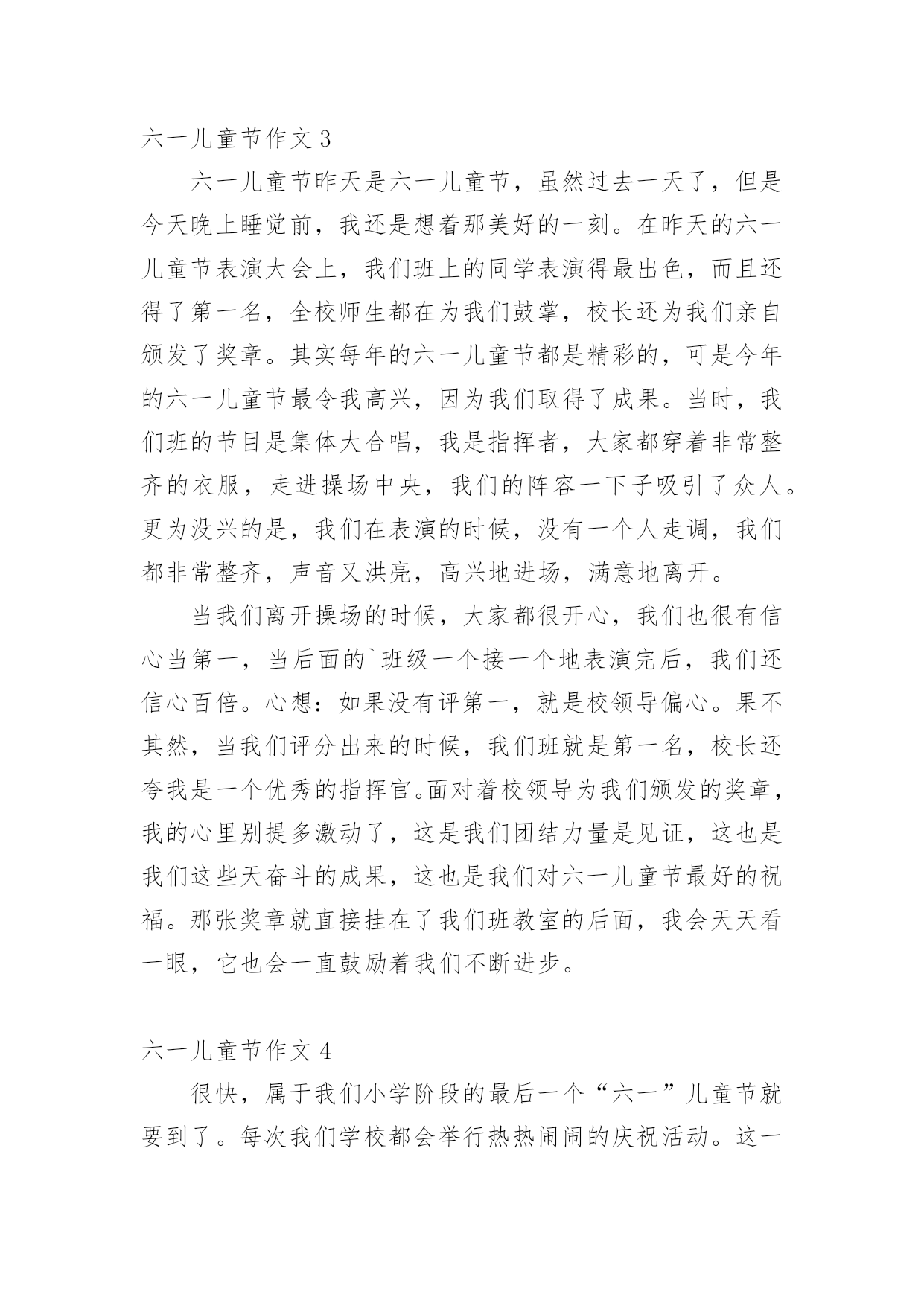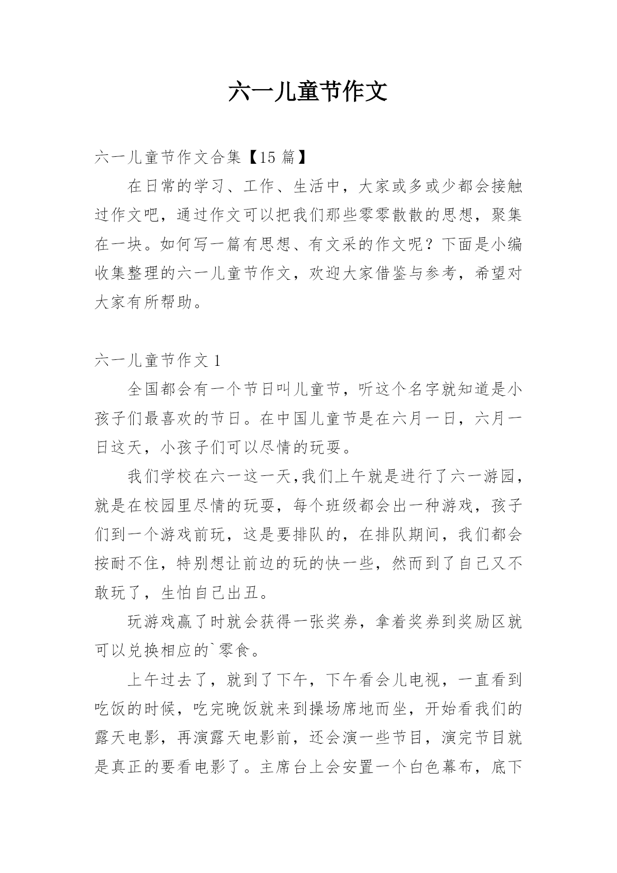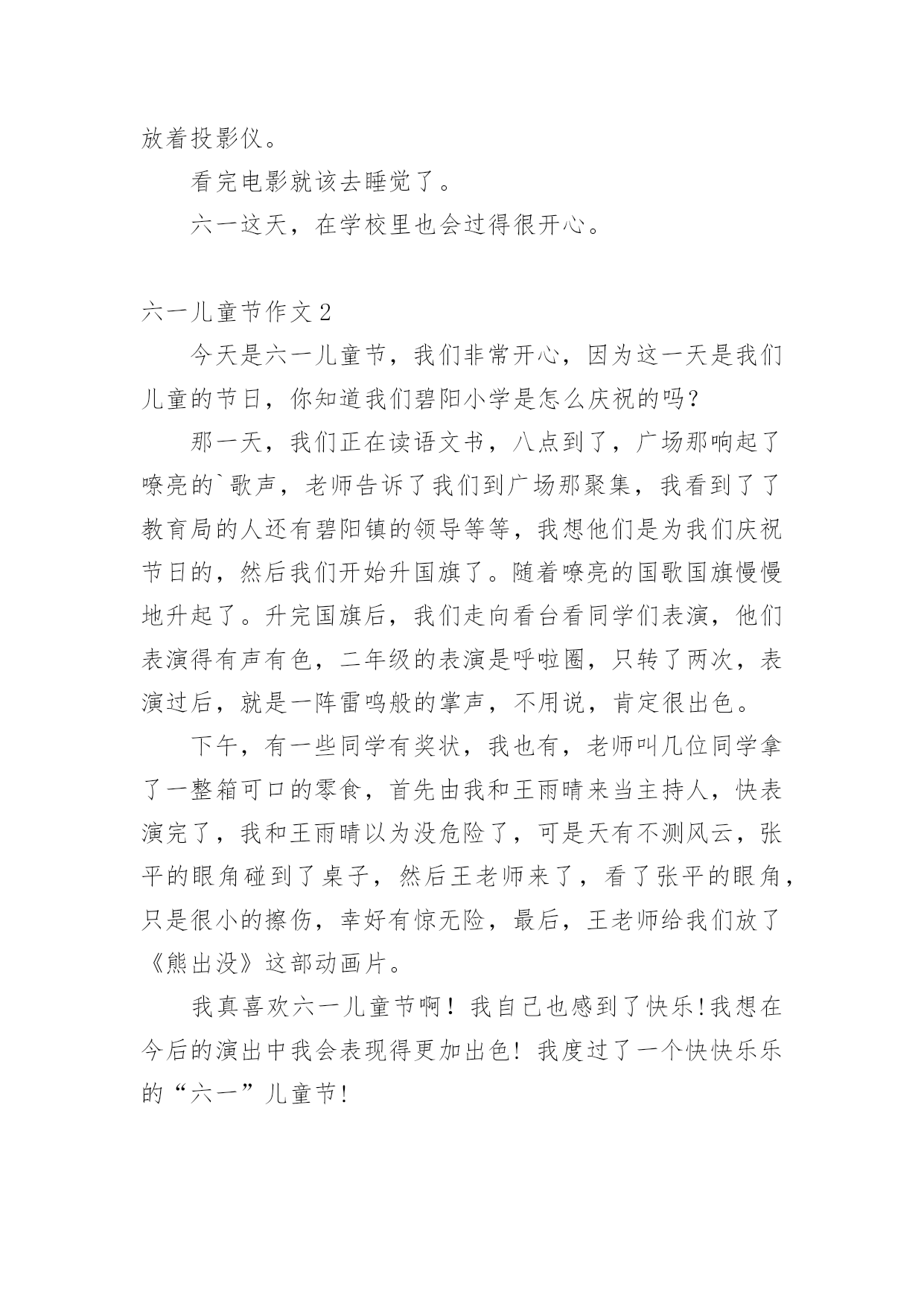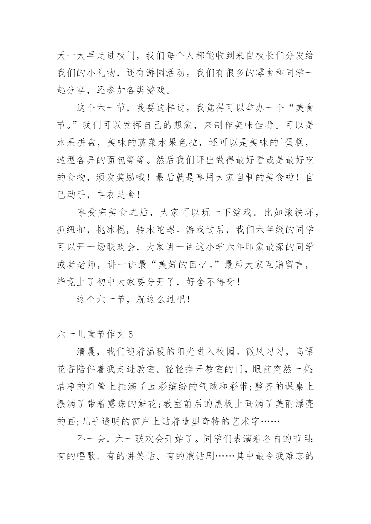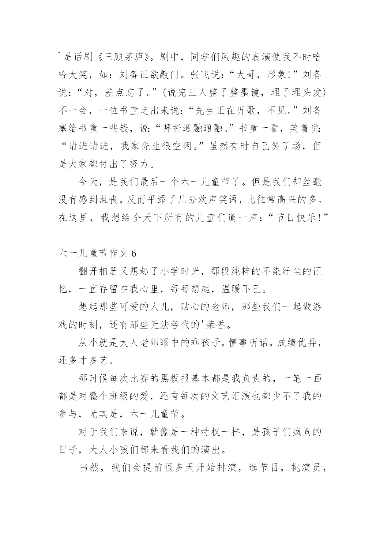 六一儿童节作文 六一儿童节作文合集【15篇】在日常的学习、工作、生活中,大家或多或少都会接触过作文吧,通过作文可以把我们那些零零散散的思想,聚集在一块。如何写一篇有思想、有文采的作文呢?下面是小编收集整理的六一儿童节作文,欢迎大家借鉴与参考,希望对大家有所帮助。六一儿童节作文1全国都会有一个节日叫儿童节,听这个名字就知道是小孩子们最喜欢的节日。在中国儿童节是在六月一日,六月一日这天,小孩子们可以尽情的玩耍。我们学校在六一这一天,我们上午就是进行了六一游园,就是在校园里尽情的玩耍,每个班级都会出一种游戏,孩子们到一个游戏前玩,这是要排队的,在排队期间,我们都会按耐不住,特别想让前边的玩的快一些,然而到了自己又不敢玩了,生怕自己出丑。玩游戏赢了时就会获得一张奖券,拿着奖券到奖励区就可以兑换相应的`零食。上午过去了,就到了下午,下午看会儿电视,一直看到吃饭的时候,吃完晚饭就来到操场席地而坐,开始看我们的露天电影,再演露天电影前,还会演一些节目,演完节目就是真正的要看电影了。主席台上会安置一个白色幕布,底下放着投影仪。看完电影就该去睡觉了。六一这天,在学校里也会过得很开心。六一儿童节作文2今天是六一儿童节,我们非常开心,因为这一天是我们儿童的节日,你知道我们碧阳小学是怎么庆祝的吗?那一天,我们正在读语文书,八点到了,广场那响起了嘹亮的`歌声,老师告诉了我们到广场那聚集,我看到了了教育局的人还有碧阳镇的领导等等,我想他们是为我们庆祝节日的,然后我们开始升国旗了。随着嘹亮的国歌国旗慢慢地升起了。升完国旗后,我们走向看台看同学们表演,他们表演得有声有色,二年级的表演是呼啦圈,只转了两次,表演过后,就是一阵雷鸣般的掌声,不用说,肯定很出色。下午,有一些同学有奖状,我也有,老师叫几位同学拿了一整箱可口的零食,首先由我和王雨晴来当主持人,快表演完了,我和王雨晴以为没危险了,可是天有不测风云,张平的眼角碰到了桌子,然后王老师来了,看了张平的眼角,只是很小的擦伤,幸好有惊无险,最后,王老师给我们放了《熊出没》这部动画片。我真喜欢六一儿童节啊!我自己也感到了快乐!我想在今后的演出中我会表现得更加出色!我度过了一个快快乐乐的“六一”儿童节!六一儿童节作文3六一儿童节昨天是六一儿童节,虽然过去一天了,但是今天晚上睡觉前,我还是想着那美好的一刻。在昨天的六一儿童节表演大会上,我们班上的同学表演得最出色,而且还得了第一名,全校师生都在为我们鼓掌,校长还为我们亲自颁发了奖章。其实每年的六一儿童节都是精彩的,可是今年的六一儿童节最令我高兴,因为我们取得了成果。当时,我们班的节目是集体大合唱,我是指挥者,大家都穿着非常整齐的衣服,走进操场中央,我们的阵容一下子吸引了众人。更为没兴的是,我们在表演的时候,没有一个人走调,我们都非常整齐,声音又洪亮,高兴地进场,满意地离开。当我们离开操场的时候,大家都很开心,我们也很有信心当第一,当后面的`班级一个接一个地表演完后,我们还信心百倍。心想:如果没有评第一,就是校领导偏心。果不其然,当我们评分出来的时候,我们班就是第一名,校长还夸我是一个优秀的指挥官。面对着校领导为我们颁发的奖章,我的心里别提多激动了,这是我们团结力量是见证,这也是我们这些天奋斗的成果,这也是我们对六一儿童节最好的祝福。那张奖章就直接挂在了我们班教室的后面,我会天天看一眼,它也会一直鼓励着我们不断进步。六一儿童节作文4很快,属于我们小学阶段的最后一个“六一”儿童节就要到了。每次我们学校都会举行热热闹闹的庆祝活动。这一天一大早走进校门,我们每个人都能收到来自校长们分发给我们的小礼物,还有游园活动。我们有很多的零食和同学一起分享,还参加各类游戏。这个六一节,我要这样过。我觉得可以举办一个“美食节。”我们可以发挥自己的想象,来制作美味佳肴。可以是水果拼盘,美味的蔬菜水果色拉,还可以是美味的`蛋糕,造型各异的面包等等。然后我们评出做得最好看或是最好吃的食物,颁发奖励哦!最后就是享用大家自制的美食啦!自己动手,丰衣足食!享受完美食之后,大家可以玩一下游戏。比如滚铁环,抓纽扣,挑冰棍,转木陀螺。游戏过后,我们六年级的同学可以开一场联欢会,大家讲一讲这小学六年印象最深的同学或者老师,讲一讲最“美好的回忆。”最后大家互赠留言,毕竟上了初中大家要分开了,好舍不得呀!这个六一节,就这么过吧!六一儿童节作文5清晨,我们迎着温暖的阳光进入校园。微风习习,鸟语花香陪伴着我走进教室。轻轻推开教室的门,眼前突然一亮:洁净的灯管上挂满了五彩缤纷的气球和彩带;整齐的课桌上摆满了带着露珠的鲜花;教室前后的黑板上画满了美丽漂亮的画;几乎透明的窗户上贴着造型奇特的艺术字……不一会,六一联欢会开始了。同学们表演着各自的节目:有的唱歌、有的讲笑话、有的演话剧……其中最令我难忘的`是话剧《三顾茅庐》。