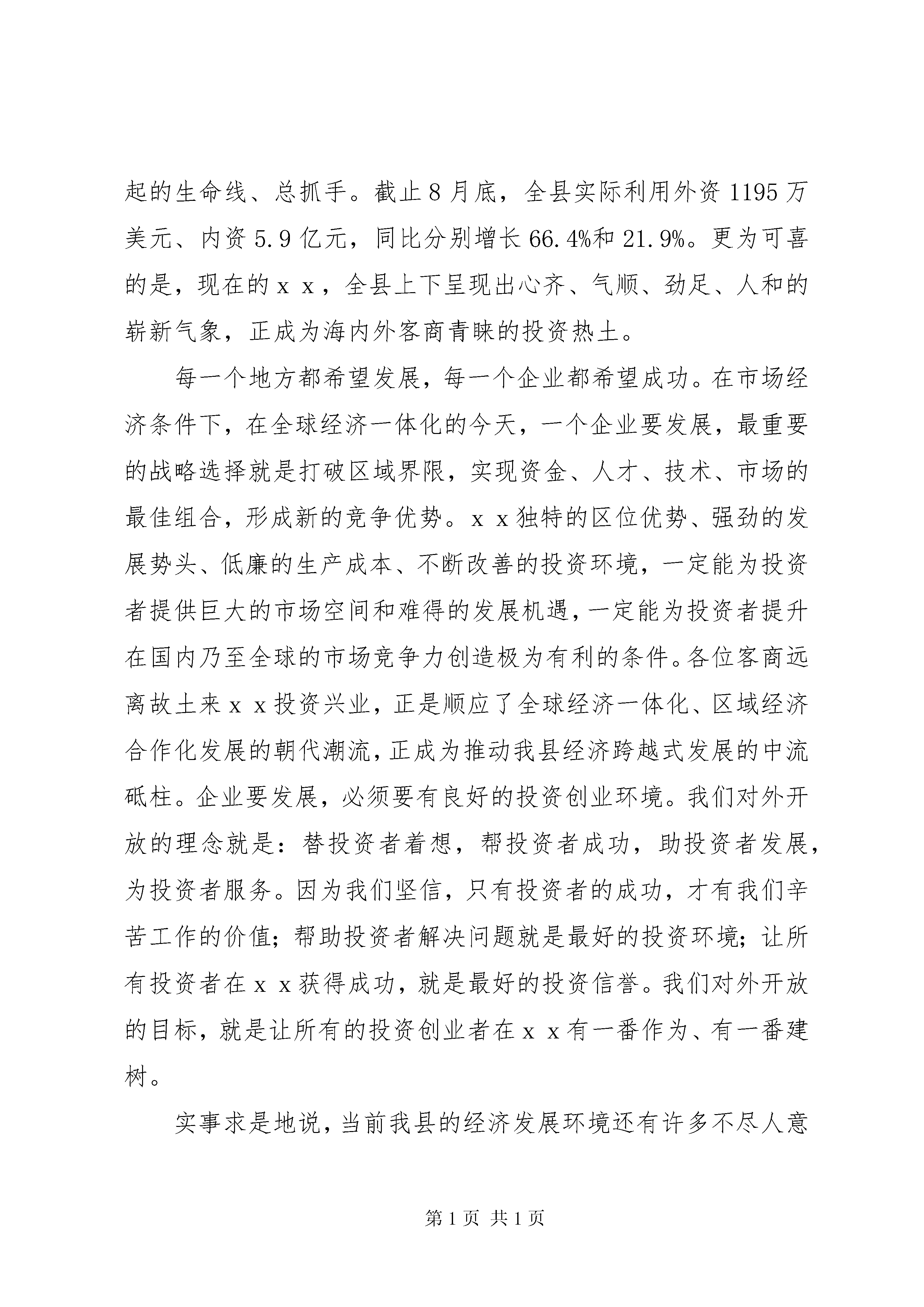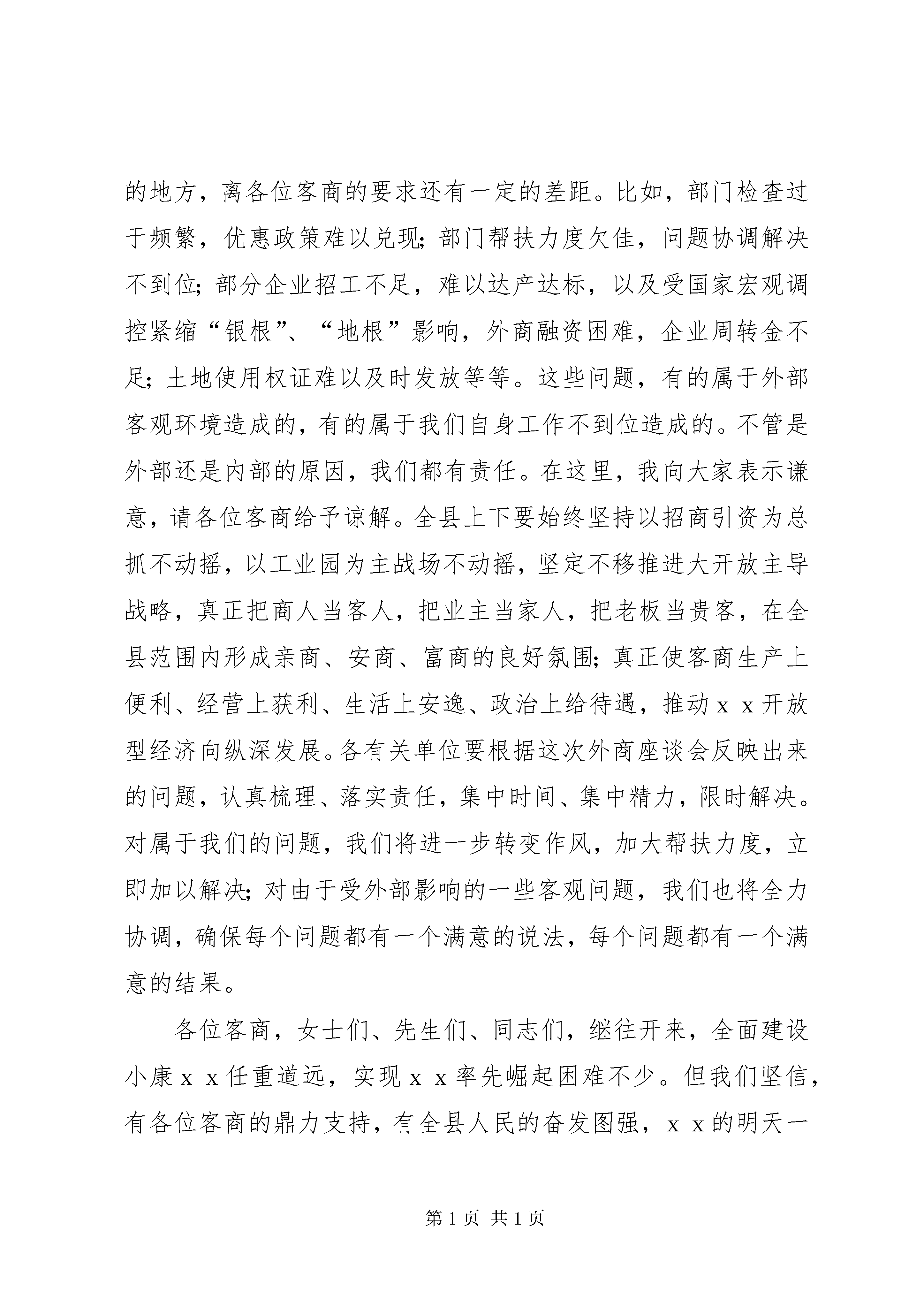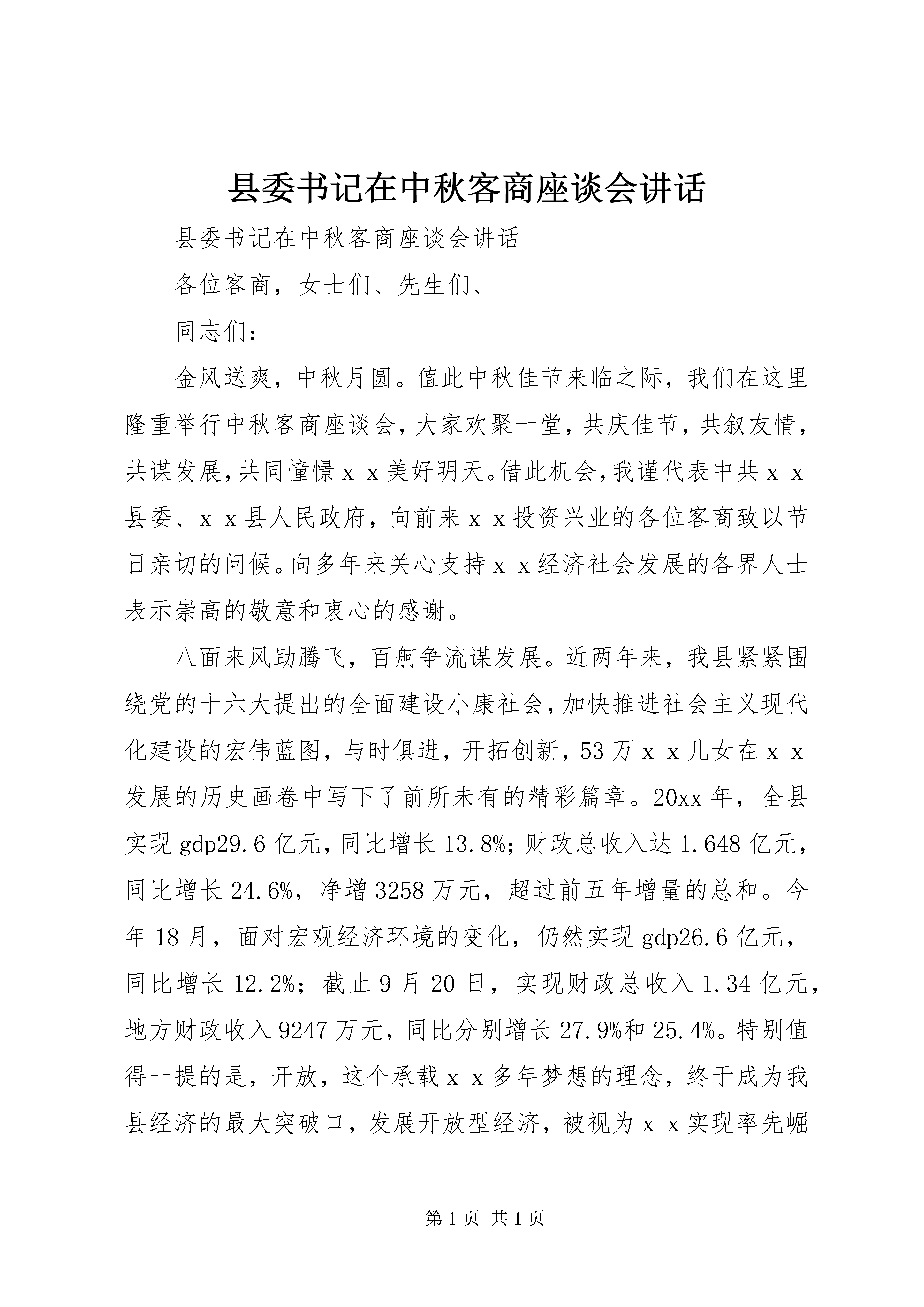 县委书记在中秋客商座谈会讲话县委书记在中秋客商座谈会讲话各位客商,女士们、先生们、同志们:金风送爽,中秋月圆。值此中秋佳节来临之际,我们在这里隆重举行中秋客商座谈会,大家欢聚一堂,共庆佳节,共叙友情,共谋发展,共同憧憬xx美好明天。借此机会,我谨代表中共xx县委、xx县人民政府,向前来xx投资兴业的各位客商致以节日亲切的问候。向多年来关心支持xx经济社会发展的各界人士表示崇高的敬意和衷心的感谢。八面来风助腾飞,百舸争流谋发展。近两年来,我县紧紧围绕党的十六大提出的全面建设小康社会,加快推进社会主义现代化建设的宏伟蓝图,与时俱进,开拓创新,53万xx儿女在xx发展的历史画卷中写下了前所未有的精彩篇章。20xx年,全县实现gdp29.6亿元,同比增长13.8%;财政总收入达1.648亿元,同比增长24.6%,净增3258万元,超过前五年增量的总和。今年18月,面对宏观经济环境的变化,仍然实现gdp26.6亿元,同比增长12.2%;截止9月20日,实现财政总收入1.34亿元,地方财政收入9247万元,同比分别增长27.9%和25.4%。特别值得一提的是,开放,这个承载xx多年梦想的理念,终于成为我县经济的最大突破口,发展开放型经济,被视为xx实现率先崛起的生命线、总抓手。截止8月底,全县实际利用外资1195万美元、内资5.9亿元,同比分别增长66.4%和21.9%。更为可喜的是,现在的xx,全县上下呈现出心齐、气顺、劲足、人和的崭新气象,正成为海内外客商青睐的投资热土。每一个地方都希望发展,每一个企业都希望成功。在市场经济条件下,在全球经济一体化的今天,一个企业要发展,最重要的战略选择就是打破区域界限,实现资金、人才、技术、市场的最佳组合,形成新的竞争优势。xx独特的区位优势、强劲的发展势头、低廉的生产成本、不断改善的投资环境,一定能为投资者提供巨大的市场空间和难得的发展机遇,一定能为投资者提升在国内乃至全球的市场竞争力创造极为有利的条件。各位客商远离故土来xx投资兴业,正是顺应了全球经济一体化、区域经济合作化发展的朝代潮流,正成为推动我县经济跨越式发展的中流砥柱。企业要发展,必须要有良好的投资创业环境。我们对外开放的理念就是:替投资者着想,帮投资者成功,助投资者发展,为投资者服务。因为我们坚信,只有投资者的成功,才有我们辛苦工作的价值;帮助投资者解决问题就是最好的投资环境;让所有投资者在xx获得成功,就是最好的投资信誉。我们对外开放的目标,就是让所有的投资创业者在xx有一番作为、有一番建树。实事求是地说,当前我县的经济发展环境还有许多不尽人意的地方,离各位客商的要求还有一定的差距。比如,部门检查过于频繁,优惠政策难以兑现;部门帮扶力度欠佳,问题协调解决不到位;部分企业招工不足,难以达产达标,以及受国家宏观调控紧缩“银根”、“地根”影响,外商融资困难,企业周转金不足;土地使用权证难以及时发放等等。这些问题,有的属于外部客观环境造成的,有的属于我们自身工作不到位造成的。不管是外部还是内部的原因,我们都有责任。在这里,我向大家表示谦意,请各位客商给予谅解。全县上下要始终坚持以招商引资为总抓不动摇,以工业园为主战场不动摇,坚定不移推进大开放主导战略,真正把商人当客人,把业主当家人,把老板当贵客,在全县范围内形成亲商、安商、富商的良好氛围;真正使客商生产上便利、经营上获利、生活上安逸、政治上给待遇,推动xx开放型经济向纵深发展。各有关单位要根据这次外商座谈会反映出来的问题,认真梳理、落实责任,集中时间、集中精力,限时解决。对属于我们的问题,我们将进一步转变作风,加大帮扶力度,立即加以解决;对由于受外部影响的一些客观问题,我们也将全力协调,确保每个问题都有一个满意的说法,每个问题都有一个满意的结果。各位客商,女士们、先生们、同志们,继往开来,全面建设小康xx任重道远,实现xx率先崛起困难不少。但我们坚信,有各位客商的鼎力支持,有全县人民的奋发图强,xx的明天一定会更加美好。最后,祝大家节日愉快,身体健康,财源滚滚。