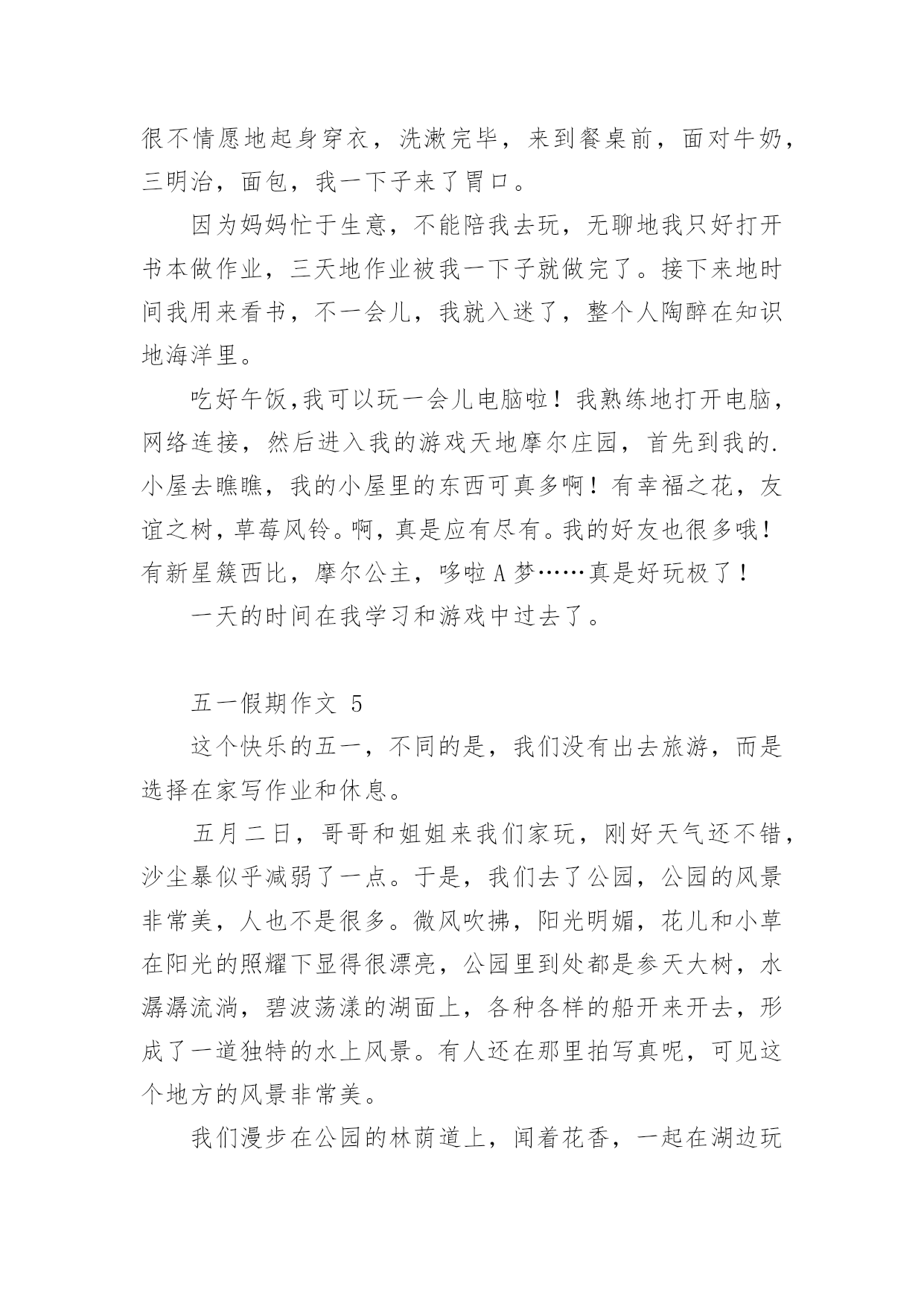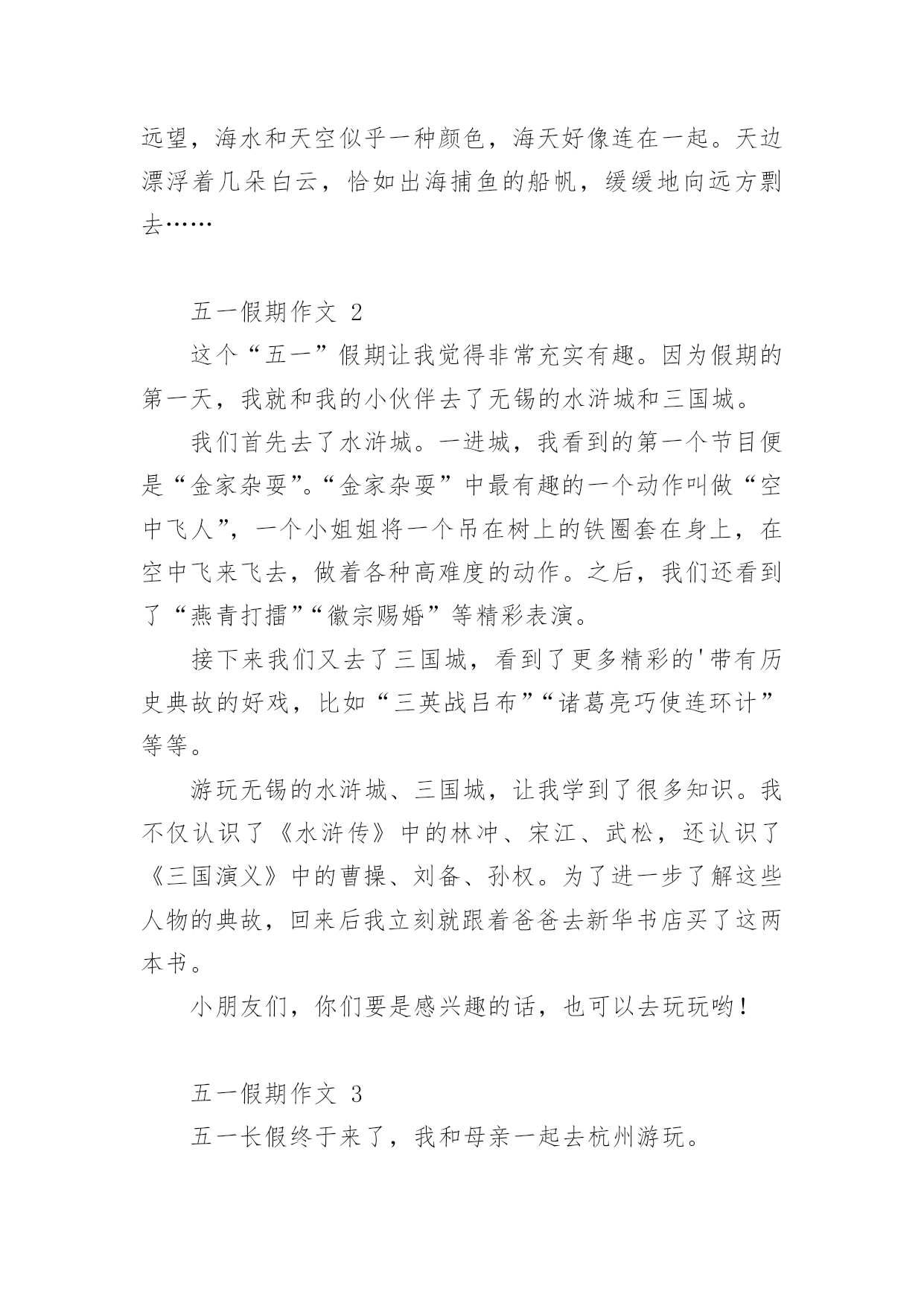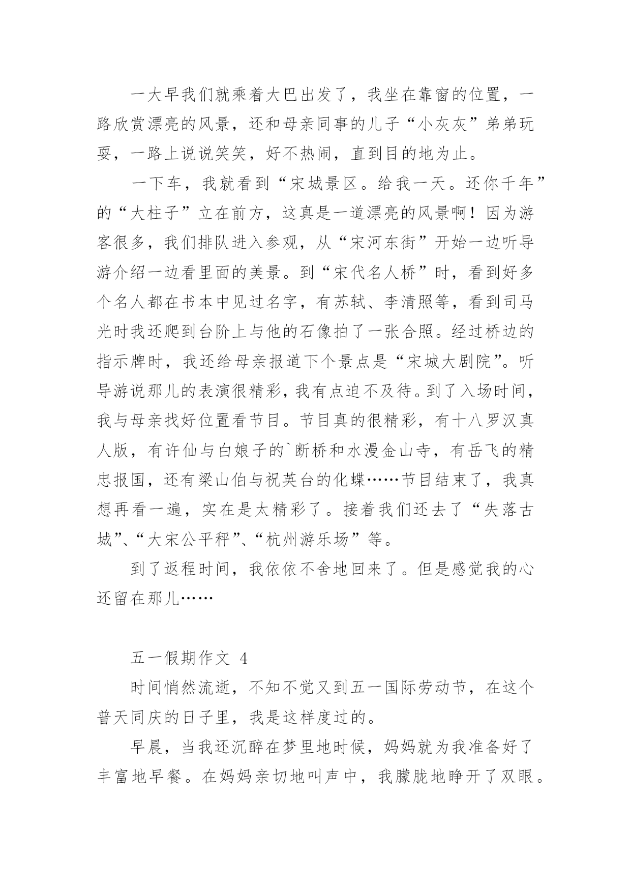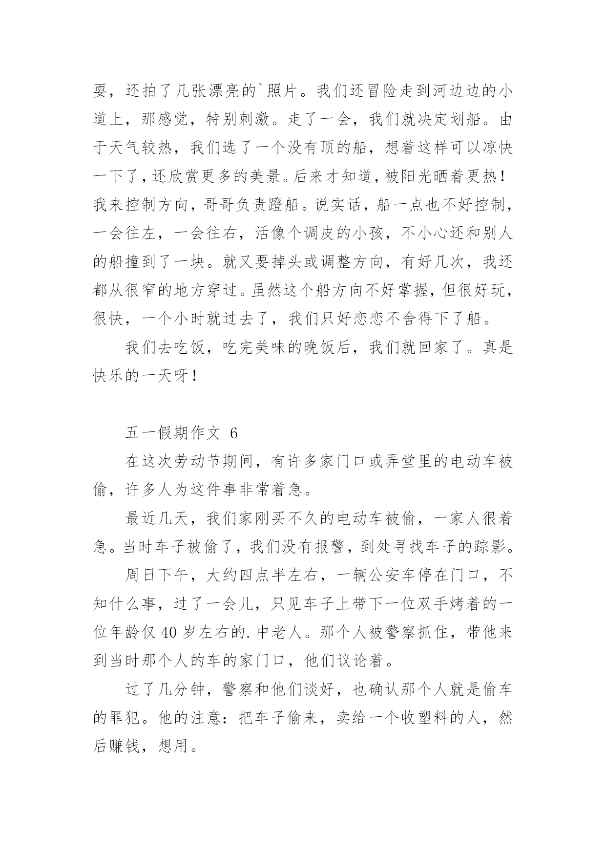 五一假期作文 五一假期作文(通用39篇)在现实生活或工作学习中,大家都尝试过写作文吧,借助作文可以宣泄心中的情感,调节自己的心情。那么你知道一篇好的作文该怎么写吗?下面是小编为大家整理的五一假期作文,仅供参考,大家一起来看看吧。五一假期作文1这个五一,我陪者父母来到了深圳,在这片黄金海滩边有一片波澜壮阔的大海,这些地方留下了我许多美好的回忆。我刚来到沙滩时,母亲就叫我去礁石上戏耍,我走过去,站在礁石上,凉滋滋的海水轻轻地抚摸着我的脚面。洁白的浪花追逐着人们的脚印,发出“哗啦,哗啦”的“笑声”。海风是那样凉爽,像一只只小鱼似的滑过我的.腿间。我轻快地跳上沙滩,嘴里哼着欢快的小曲,我望着蔚蓝的天空,小鸟自由地飞翔着,一朵朵雪白的云朵成了数不清的羊群。深蓝色的大海和蔚蓝的天空紧紧相连,一幅自然而美丽的海景画承现在我的眼前,在阳光的照射下,这幅美丽的图画更加充满生机,充满活力。海是无边无际的,近出的海的海面是那么明净透彻。轻轻的微波渐渐地向岸边移来,越来越近,冲在沙滩上,岩石上,泛出层层白花,溅起颗颗银珠,又悄悄地消失在海滩上。远望,海水和天空似乎一种颜色,海天好像连在一起。天边漂浮着几朵白云,恰如出海捕鱼的船帆,缓缓地向远方剽去……五一假期作文2这个“五一”假期让我觉得非常充实有趣。因为假期的第一天,我就和我的小伙伴去了无锡的水浒城和三国城。我们首先去了水浒城。一进城,我看到的第一个节目便是“金家杂耍”。“金家杂耍”中最有趣的一个动作叫做“空中飞人”,一个小姐姐将一个吊在树上的铁圈套在身上,在空中飞来飞去,做着各种高难度的动作。之后,我们还看到了“燕青打擂”“徽宗赐婚”等精彩表演。接下来我们又去了三国城,看到了更多精彩的'带有历史典故的好戏,比如“三英战吕布”“诸葛亮巧使连环计”等等。游玩无锡的水浒城、三国城,让我学到了很多知识。我不仅认识了《水浒传》中的林冲、宋江、武松,还认识了《三国演义》中的曹操、刘备、孙权。为了进一步了解这些人物的典故,回来后我立刻就跟着爸爸去新华书店买了这两本书。小朋友们,你们要是感兴趣的话,也可以去玩玩哟!五一假期作文3五一长假终于来了,我和母亲一起去杭州游玩。一大早我们就乘着大巴出发了,我坐在靠窗的位置,一路欣赏漂亮的风景,还和母亲同事的儿子“小灰灰”弟弟玩耍,一路上说说笑笑,好不热闹,直到目的地为止。一下车,我就看到“宋城景区。给我一天。还你千年”的“大柱子”立在前方,这真是一道漂亮的风景啊!因为游客很多,我们排队进入参观,从“宋河东街”开始一边听导游介绍一边看里面的美景。到“宋代名人桥”时,看到好多个名人都在书本中见过名字,有苏轼、李清照等,看到司马光时我还爬到台阶上与他的石像拍了一张合照。经过桥边的指示牌时,我还给母亲报道下个景点是“宋城大剧院”。听导游说那儿的表演很精彩,我有点迫不及待。到了入场时间,我与母亲找好位置看节目。节目真的很精彩,有十八罗汉真人版,有许仙与白娘子的`断桥和水漫金山寺,有岳飞的精忠报国,还有梁山伯与祝英台的化蝶……节目结束了,我真想再看一遍,实在是太精彩了。接着我们还去了“失落古城”、“大宋公平秤”、“杭州游乐场”等。到了返程时间,我依依不舍地回来了。但是感觉我的心还留在那儿……五一假期作文4时间悄然流逝,不知不觉又到五一国际劳动节,在这个普天同庆的日子里,我是这样度过的。早晨,当我还沉醉在梦里地时候,妈妈就为我准备好了丰富地早餐。在妈妈亲切地叫声中,我朦胧地睁开了双眼。很不情愿地起身穿衣,洗漱完毕,来到餐桌前,面对牛奶,三明治,面包,我一下子来了胃口。因为妈妈忙于生意,不能陪我去玩,无聊地我只好打开书本做作业,三天地作业被我一下子就做完了。接下来地时间我用来看书,不一会儿,我就入迷了,整个人陶醉在知识地海洋里。吃好午饭,我可以玩一会儿电脑啦!我熟练地打开电脑,网络连接,然后进入我的游戏天地摩尔庄园,首先到我的.小屋去瞧瞧,我的小屋里的东西可真多啊!有幸福之花,友谊之树,草莓风铃。啊,真是应有尽有。我的好友也很多哦!有新星簇西比,摩尔公主,哆啦A梦……真是好玩极了!一天的时间在我学习和游戏中过去了。五一假期作文5这个快乐的五一,不同的是,我们没有出去旅游,而是选择在家写作业和休息。五月二日,哥哥和姐姐来我们家玩,刚好天气还不错,沙尘暴似乎减弱了一点。于是,我们去了公园,公园的风景非常美,人也不是很多。微风吹拂,阳光明媚,花儿和小草在阳光的照耀下显得很漂亮,公园里到处都是参天大树,水潺潺流淌,碧波荡漾的湖面上,各种各样的船开来开去,形成了一道独特的水上风景。有人还在那里拍写真呢,可见这个地方的风景非常美。我们漫步在公园的林荫道上,闻着花香,一起在湖边玩耍,还拍了几张漂亮的`照片。我们还冒险走到河边边的小道上,那感觉,特别刺激。走了一会,我们就决定划船。由于天气较热,我们选