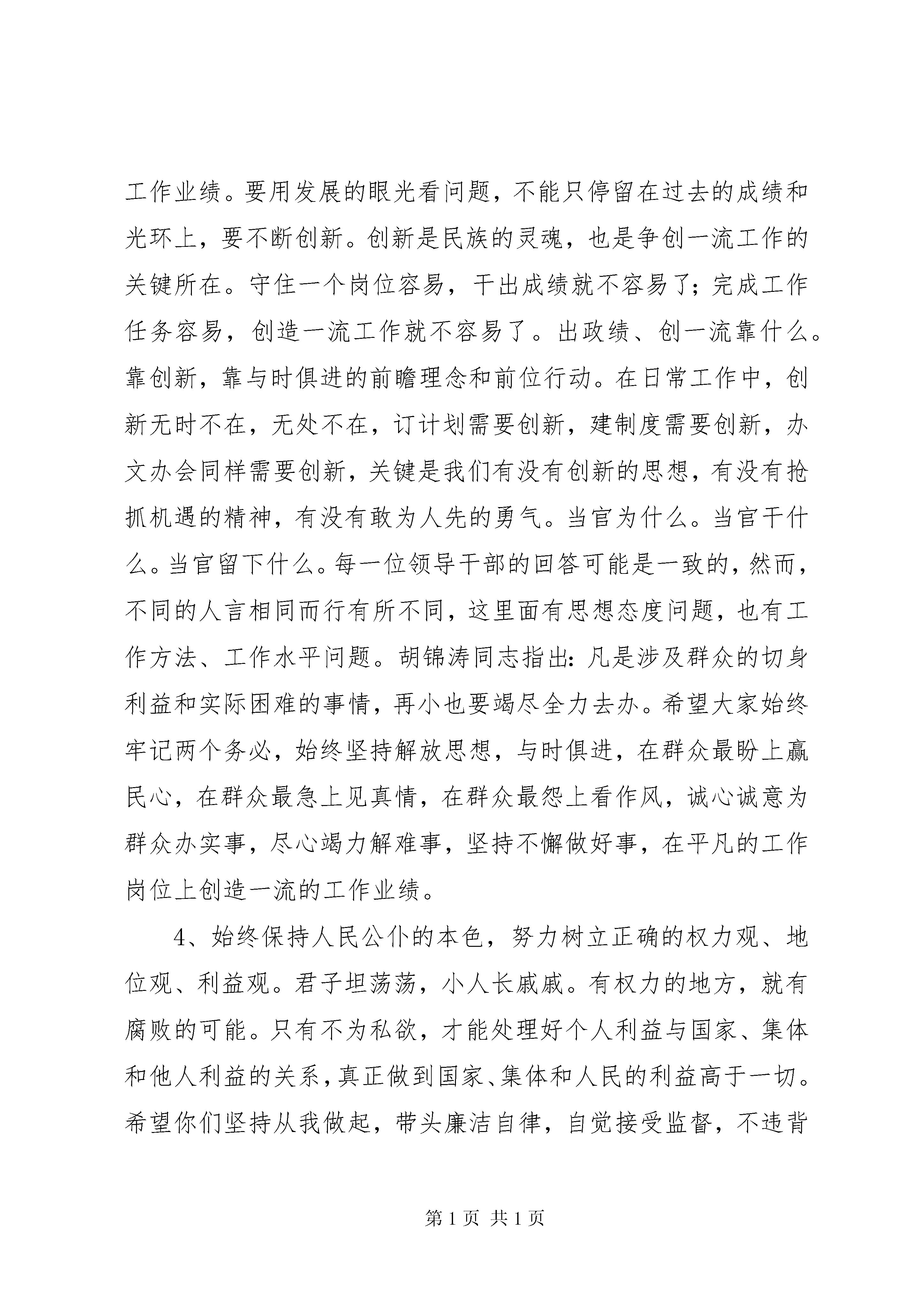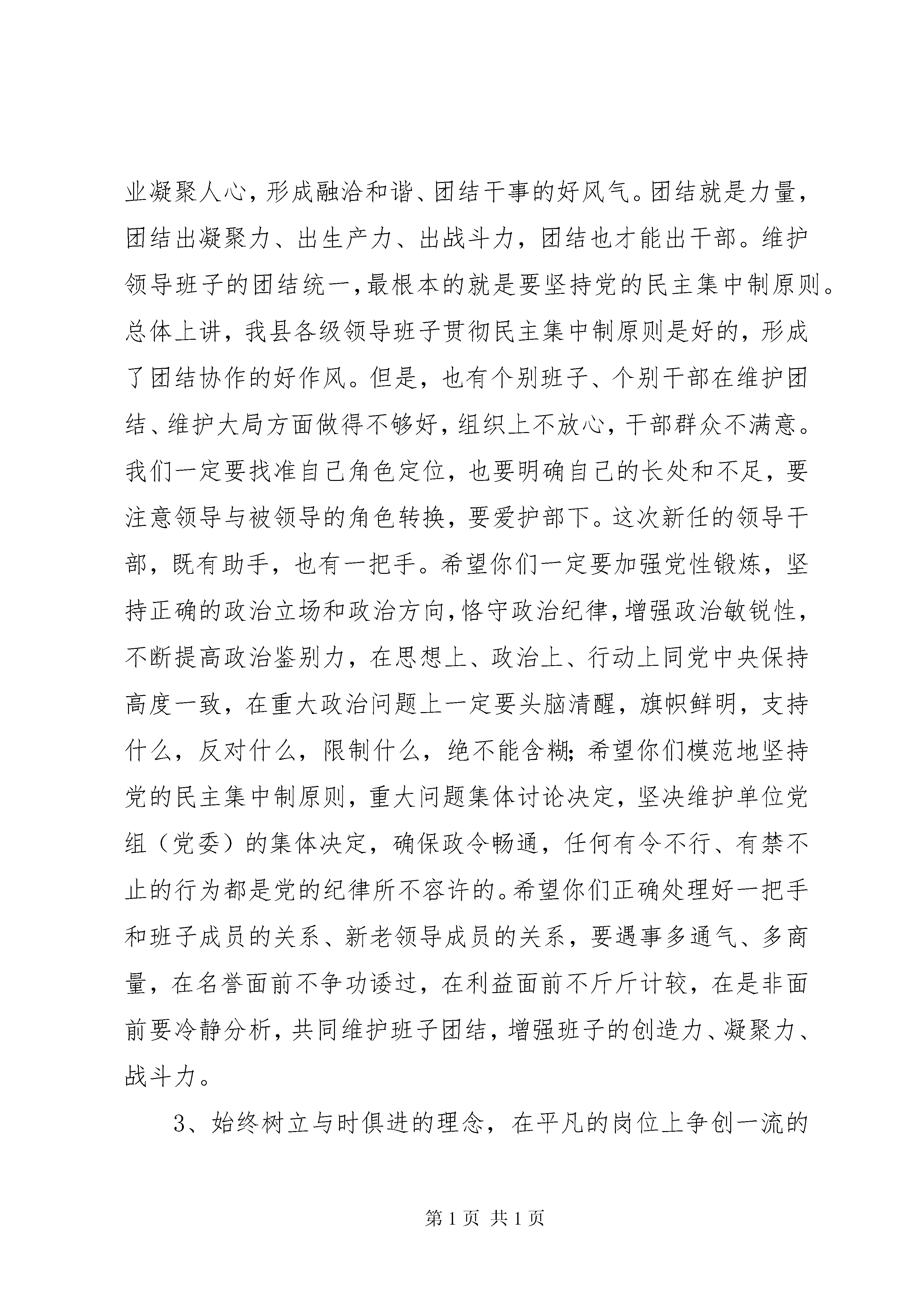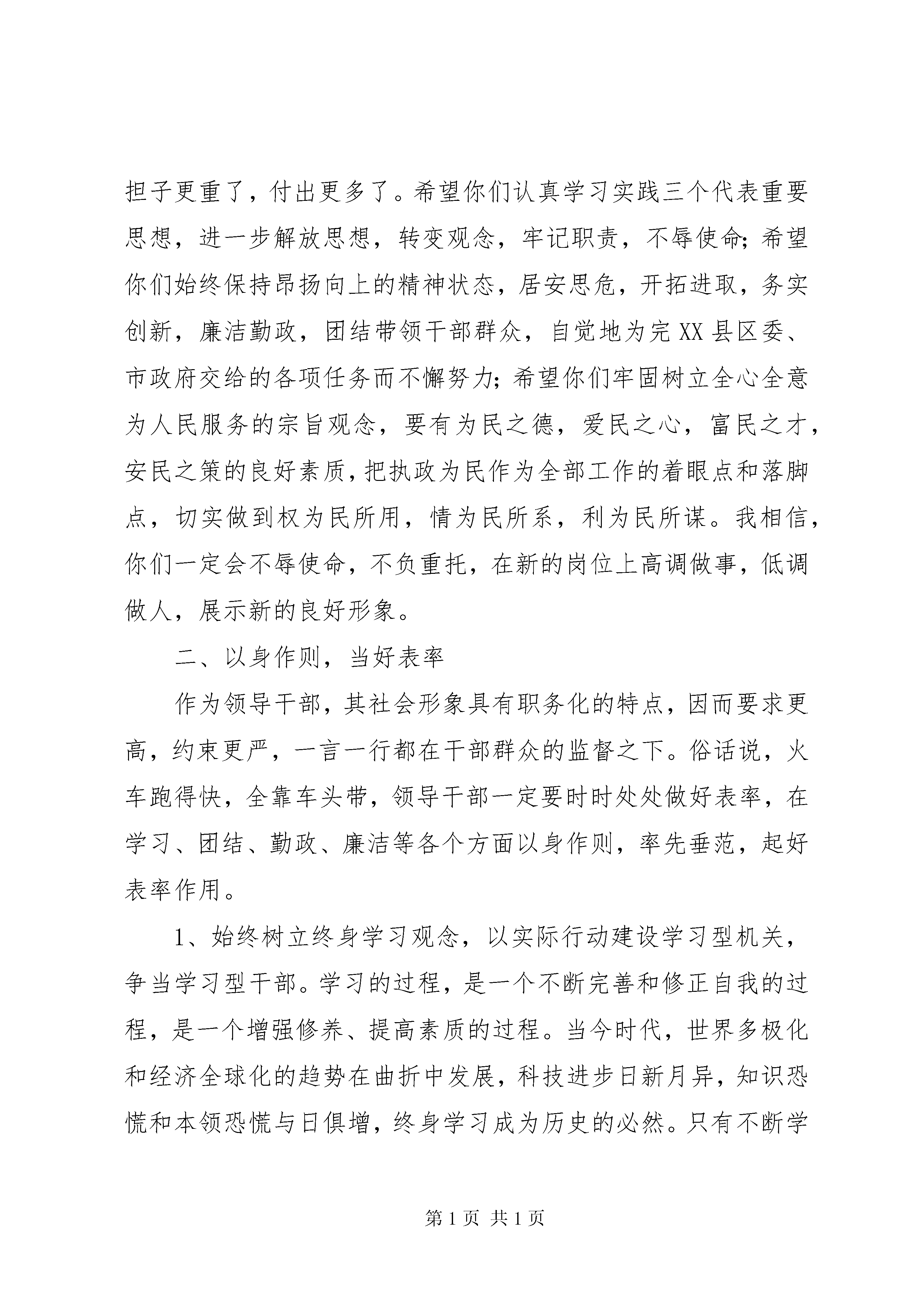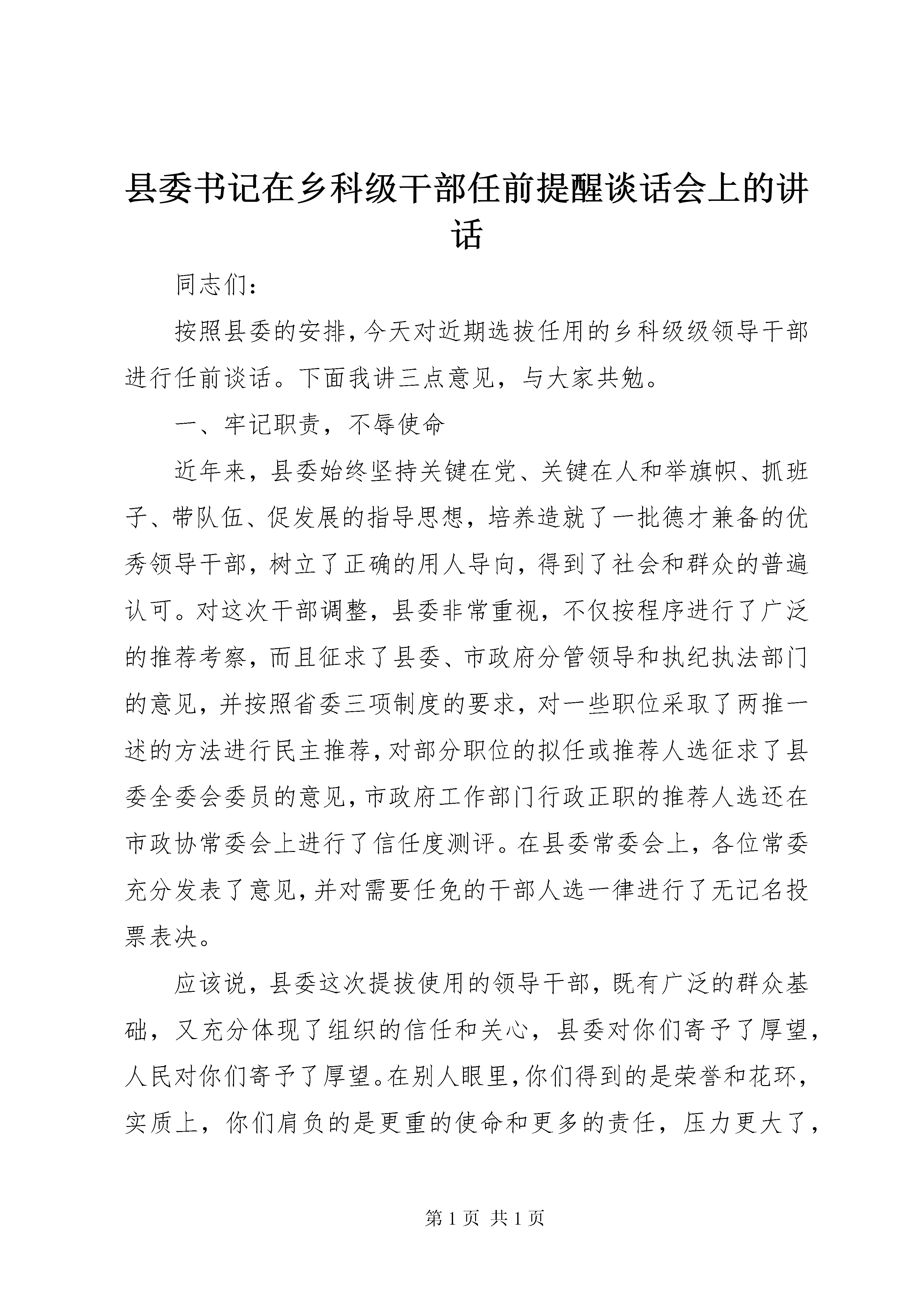 县委书记在乡科级干部任前提醒谈话会上的讲话同志们:按照县委的安排,今天对近期选拔任用的乡科级级领导干部进行任前谈话。下面我讲三点意见,与大家共勉。一、牢记职责,不辱使命近年来,县委始终坚持关键在党、关键在人和举旗帜、抓班子、带队伍、促发展的指导思想,培养造就了一批德才兼备的优秀领导干部,树立了正确的用人导向,得到了社会和群众的普遍认可。对这次干部调整,县委非常重视,不仅按程序进行了广泛的推荐考察,而且征求了县委、市政府分管领导和执纪执法部门的意见,并按照省委三项制度的要求,对一些职位采取了两推一述的方法进行民主推荐,对部分职位的拟任或推荐人选征求了县委全委会委员的意见,市政府工作部门行政正职的推荐人选还在市政协常委会上进行了信任度测评。在县委常委会上,各位常委充分发表了意见,并对需要任免的干部人选一律进行了无记名投票表决。应该说,县委这次提拔使用的领导干部,既有广泛的群众基础,又充分体现了组织的信任和关心,县委对你们寄予了厚望,人民对你们寄予了厚望。在别人眼里,你们得到的是荣誉和花环,实质上,你们肩负的是更重的使命和更多的责任,压力更大了,担子更重了,付出更多了。希望你们认真学习实践三个代表重要思想,进一步解放思想,转变观念,牢记职责,不辱使命;希望你们始终保持昂扬向上的精神状态,居安思危,开拓进取,务实创新,廉洁勤政,团结带领干部群众,自觉地为完XX县区委、市政府交给的各项任务而不懈努力;希望你们牢固树立全心全意为人民服务的宗旨观念,要有为民之德,爱民之心,富民之才,安民之策的良好素质,把执政为民作为全部工作的着眼点和落脚点,切实做到权为民所用,情为民所系,利为民所谋。我相信,你们一定会不辱使命,不负重托,在新的岗位上高调做事,低调做人,展示新的良好形象。二、以身作则,当好表率作为领导干部,其社会形象具有职务化的特点,因而要求更高,约束更严,一言一行都在干部群众的监督之下。俗话说,火车跑得快,全靠车头带,领导干部一定要时时处处做好表率,在学习、团结、勤政、廉洁等各个方面以身作则,率先垂范,起好表率作用。1、始终树立终身学习观念,以实际行动建设学习型机关,争当学习型干部。学习的过程,是一个不断完善和修正自我的过程,是一个增强修养、提高素质的过程。当今时代,世界多极化和经济全球化的趋势在曲折中发展,科技进步日新月异,知识恐慌和本领恐慌与日俱增,终身学习成为历史的必然。只有不断学习,才能不断完善和修正自我,才能准确把握事物发展的规律和趋势,才能解决前进中的各种困难和问题,也才能练就领导干部先进的思想、宽阔的胸怀、豁达的气度,从而实施正确有效的领导。大家一定要带头学习贯彻三个代表重要思想,在解放思想中统一思想,保持与时俱进、开拓创新的精神状态;一定要认真学习市场经济、政策法律、现代科技管理知识和历史知识,不断提高理论素养,拓展知识范围,提升知识层次;一定要坚持学以致用,用发展着的马克思主义指导新的实践,树立科学的发展观和政绩观,努力提高科学判断形势、驾驭市场经济、应对复杂局面、依法行政、总揽全局的能力,使我们的工作更加体现时代性、把握规律性、富于创造性。2、始终坚持民主集中制原则,增强领导班子的凝聚力和战斗力。民主集中制是党的根本组织制度,是维护班子团结、激发班子活力的重要制度保证。要坚持集体领导、民主集中、个别酝酿、会议决定的原则,凡是重大决策和重要事项,都要提交集体讨论决定。讨论问题时充分发表意见,集思广益作出决策;一旦形成决议,就要共同维护、坚决执行,班子内保持一个声音、一个步调、一个方向。要坚持集体领导与个人分工负责相结合,鼓励和支持班子成员充分履行职责。强调一切出以公心、坚持原则,着力营造清明的政治氛围。要积极倡导班子成员之间尤其是党政主要负责同志之间相互沟通、相互支持、相互配合,以共同的事业凝聚人心,形成融洽和谐、团结干事的好风气。团结就是力量,团结出凝聚力、出生产力、出战斗力,团结也才能出干部。维护领导班子的团结统一,最根本的就是要坚持党的民主集中制原则。总体上讲,我县各级领导班子贯彻民主集中制原则是好的,形成了团结协作的好作风。但是,也有个别班子、个别干部在维护团结、维护大局方面做得不够好,组织上不放心,干部群众不满意。我们一定要找准自己角色定位,也要明确自己的长处和不足,要注意领导与被领导的角色转换,要爱护部下。这次新任的领导干部,既有助手,也有一把手。希望你们一定要加强党性锻炼,坚持正确的政治立场和政治方向,恪守政治纪律,增强政治敏锐性,不断提高政治鉴别力,在思想上、政治上、行动上同党中央保持高度一致,在重大政治问题上一定要头脑清醒,旗帜鲜明,支持什么,反对什么,限制什么,绝不能含糊;希望你们模范地坚持党的民主集中制原则,重大问题集体讨论决定,坚决维护单位党组(党委)的集体决定,确保政令