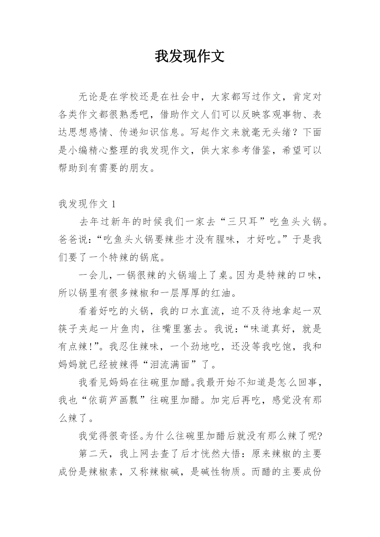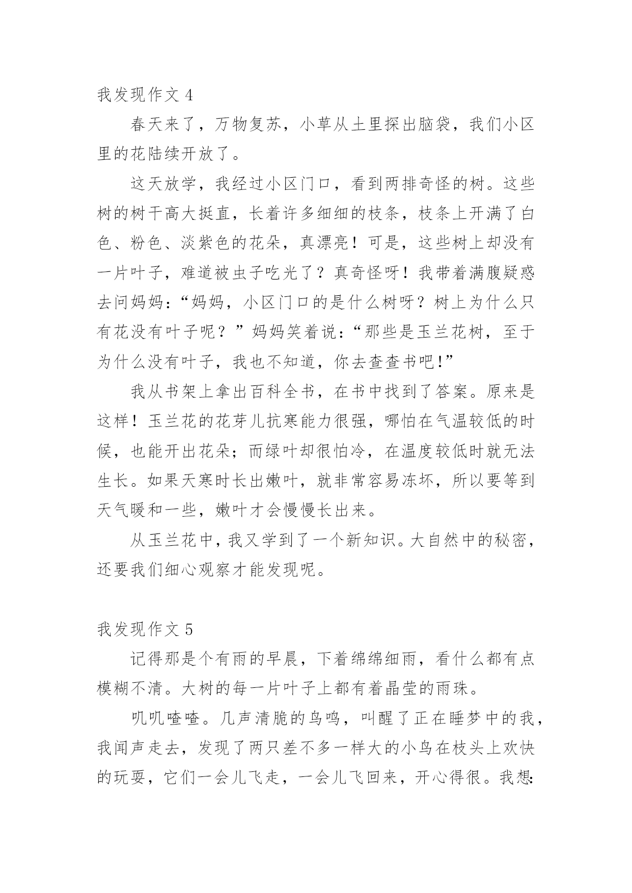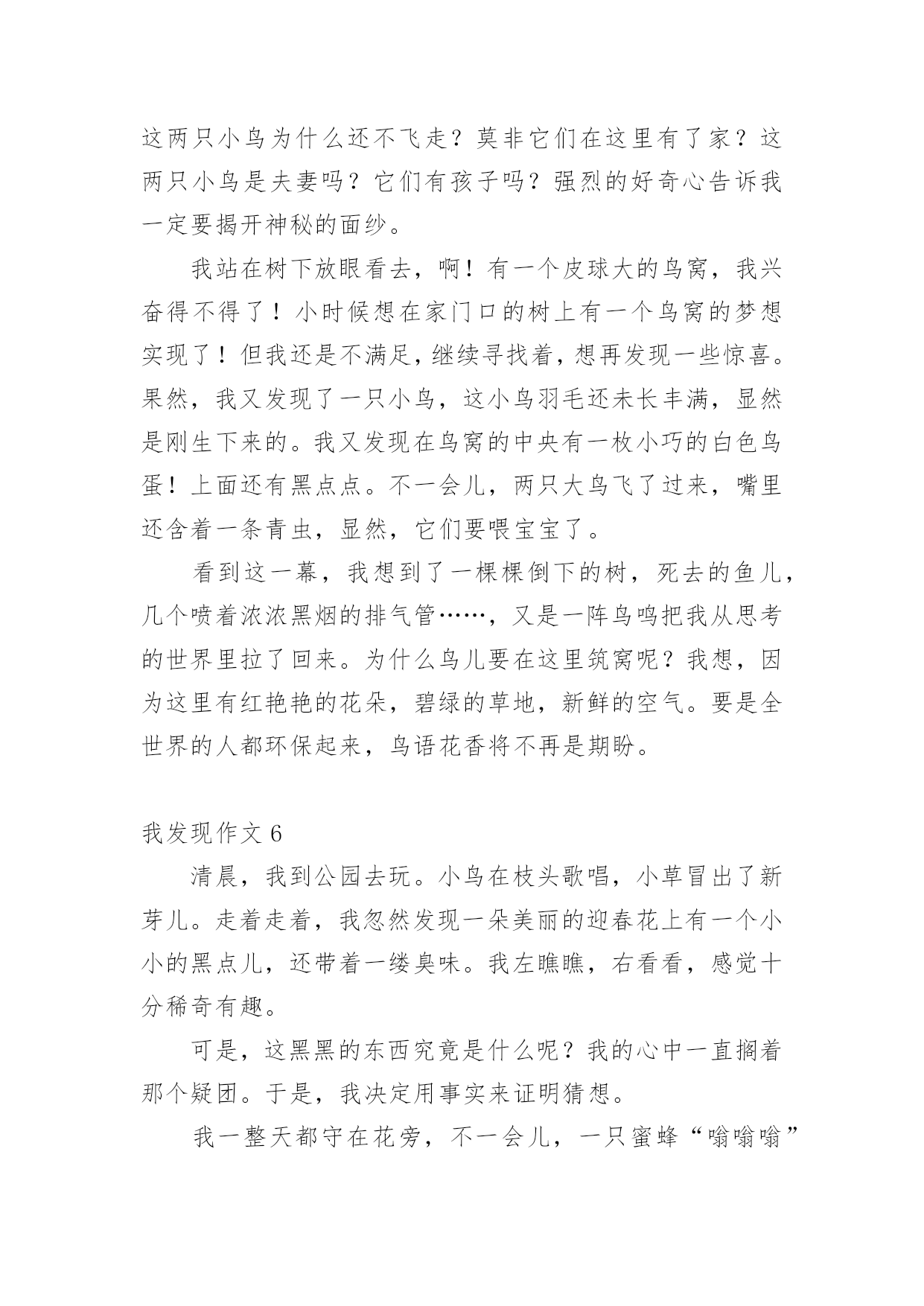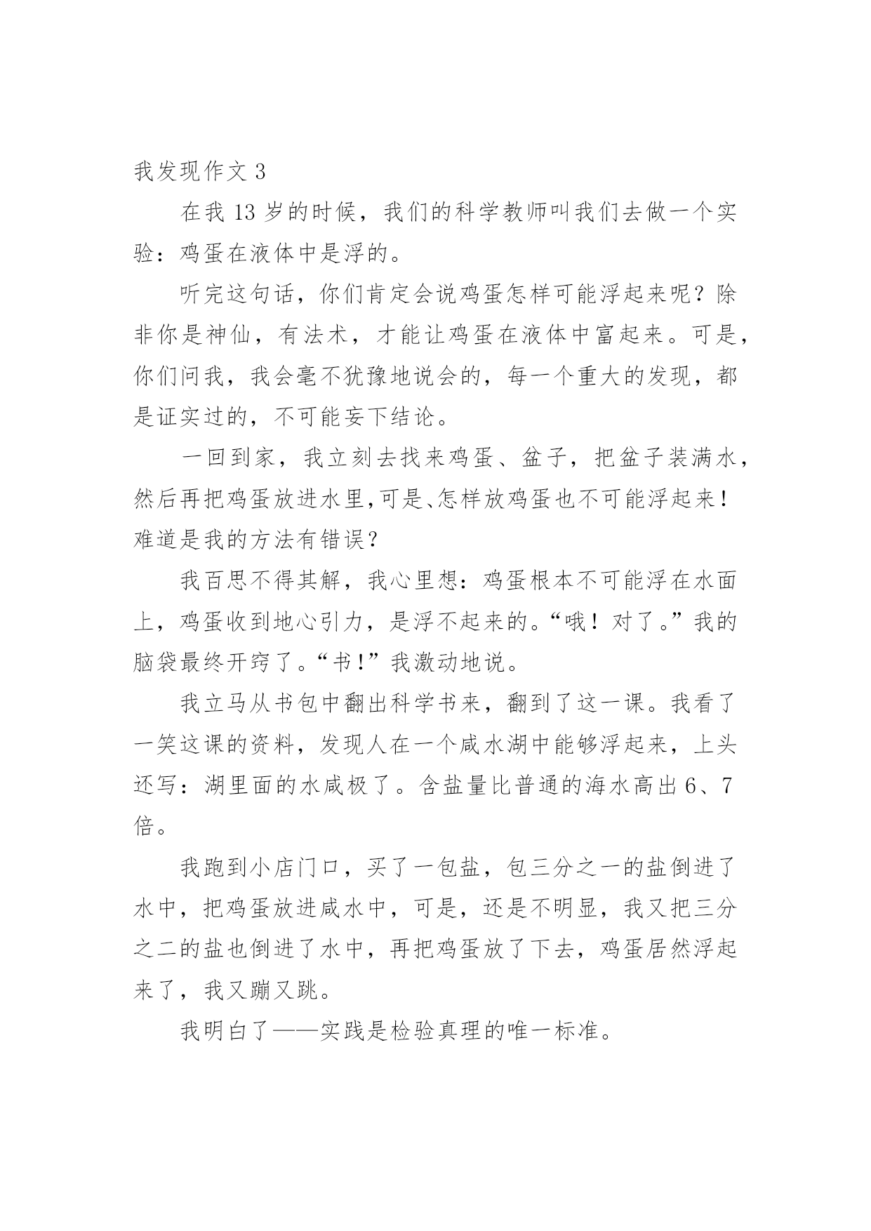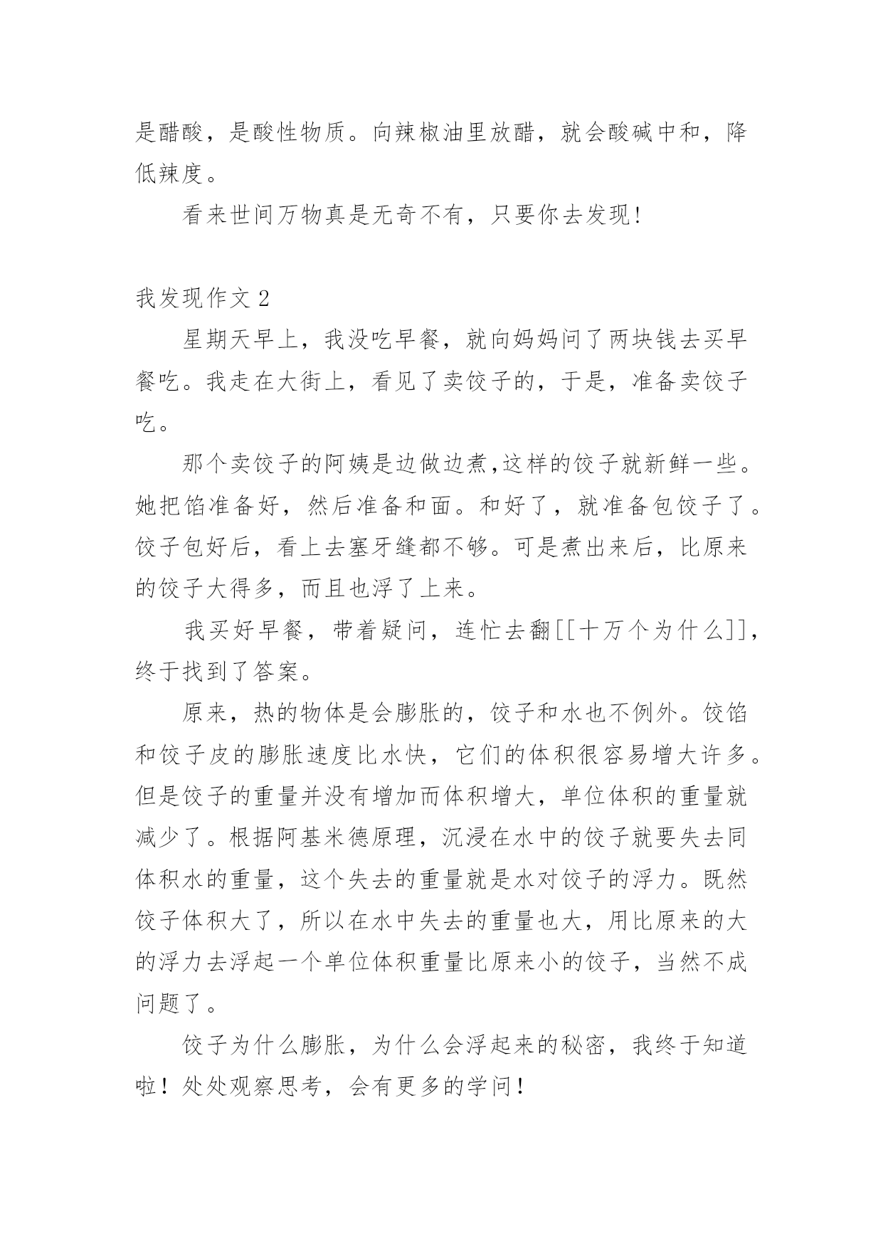 我发现作文 无论是在学校还是在社会中,大家都写过作文,肯定对各类作文都很熟悉吧,借助作文人们可以反映客观事物、表达思想感情、传递知识信息。写起作文来就毫无头绪?下面是小编精心整理的我发现作文,供大家参考借鉴,希望可以帮助到有需要的朋友。我发现作文1去年过新年的时候我们一家去“三只耳”吃鱼头火锅。爸爸说:“吃鱼头火锅要辣些才没有腥味,才好吃。”于是我们要了一个特辣的锅底。一会儿,一锅很辣的火锅端上了桌。因为是特辣的口味,所以锅里有很多辣椒和一层厚厚的红油。看着好吃的火锅,我的口水直流,迫不及待地拿起一双筷子夹起一片鱼肉,往嘴里塞去。我说:“味道真好,就是有点辣!”。我忍住辣味,一个劲地吃,还没等我吃饱,我和妈妈就已经被辣得“泪流满面”了。我看见妈妈在往碗里加醋。我最开始不知道是怎么回事,我也“依葫芦画瓢”往碗里加醋。加完后再吃,感觉没有那么辣了。我觉得很奇怪。为什么往碗里加醋后就没有那么辣了呢?第二天,我上网去查了后才恍然大悟:原来辣椒的主要成份是辣椒素,又称辣椒碱,是碱性物质。而醋的主要成份是醋酸,是酸性物质。向辣椒油里放醋,就会酸碱中和,降低辣度。看来世间万物真是无奇不有,只要你去发现!我发现作文2星期天早上,我没吃早餐,就向妈妈问了两块钱去买早餐吃。我走在大街上,看见了卖饺子的,于是,准备卖饺子吃。那个卖饺子的阿姨是边做边煮,这样的饺子就新鲜一些。她把馅准备好,然后准备和面。和好了,就准备包饺子了。饺子包好后,看上去塞牙缝都不够。可是煮出来后,比原来的饺子大得多,而且也浮了上来。我买好早餐,带着疑问,连忙去翻[[十万个为什么]],终于找到了答案。原来,热的物体是会膨胀的,饺子和水也不例外。饺馅和饺子皮的膨胀速度比水快,它们的体积很容易增大许多。但是饺子的重量并没有增加而体积增大,单位体积的重量就减少了。根据阿基米德原理,沉浸在水中的饺子就要失去同体积水的重量,这个失去的重量就是水对饺子的浮力。既然饺子体积大了,所以在水中失去的重量也大,用比原来的大的浮力去浮起一个单位体积重量比原来小的饺子,当然不成问题了。饺子为什么膨胀,为什么会浮起来的秘密,我终于知道啦!处处观察思考,会有更多的学问!我发现作文3在我13岁的时候,我们的科学教师叫我们去做一个实验:鸡蛋在液体中是浮的。听完这句话,你们肯定会说鸡蛋怎样可能浮起来呢?除非你是神仙,有法术,才能让鸡蛋在液体中富起来。可是,你们问我,我会毫不犹豫地说会的,每一个重大的发现,都是证实过的,不可能妄下结论。一回到家,我立刻去找来鸡蛋、盆子,把盆子装满水,然后再把鸡蛋放进水里,可是、怎样放鸡蛋也不可能浮起来!难道是我的方法有错误?我百思不得其解,我心里想:鸡蛋根本不可能浮在水面上,鸡蛋收到地心引力,是浮不起来的。“哦!对了。”我的脑袋最终开窍了。“书!”我激动地说。我立马从书包中翻出科学书来,翻到了这一课。我看了一笑这课的资料,发现人在一个咸水湖中能够浮起来,上头还写:湖里面的水咸极了。含盐量比普通的海水高出6、7倍。我跑到小店门口,买了一包盐,包三分之一的盐倒进了水中,把鸡蛋放进咸水中,可是,还是不明显,我又把三分之二的盐也倒进了水中,再把鸡蛋放了下去,鸡蛋居然浮起来了,我又蹦又跳。我明白了——实践是检验真理的唯一标准。我发现作文4春天来了,万物复苏,小草从土里探出脑袋,我们小区里的花陆续开放了。这天放学,我经过小区门口,看到两排奇怪的树。这些树的树干高大挺直,长着许多细细的枝条,枝条上开满了白色、粉色、淡紫色的花朵,真漂亮!可是,这些树上却没有一片叶子,难道被虫子吃光了?真奇怪呀!我带着满腹疑惑去问妈妈:“妈妈,小区门口的是什么树呀?树上为什么只有花没有叶子呢?”妈妈笑着说:“那些是玉兰花树,至于为什么没有叶子,我也不知道,你去查查书吧!”我从书架上拿出百科全书,在书中找到了答案。原来是这样!玉兰花的花芽儿抗寒能力很强,哪怕在气温较低的时候,也能开出花朵;而绿叶却很怕冷,在温度较低时就无法生长。如果天寒时长出嫩叶,就非常容易冻坏,所以要等到天气暖和一些,嫩叶才会慢慢长出来。从玉兰花中,我又学到了一个新知识。大自然中的秘密,还要我们细心观察才能发现呢。我发现作文5记得那是个有雨的早晨,下着绵绵细雨,看什么都有点模糊不清。大树的每一片叶子上都有着晶莹的雨珠。叽叽喳喳。几声清脆的鸟鸣,叫醒了正在睡梦中的我,我闻声走去,发现了两只差不多一样大的小鸟在枝头上欢快的玩耍,它们一会儿飞走,一会儿飞回来,开心得很。我想:这两只小鸟为什么还不飞走?莫非它们在这里有了家?这两只小鸟是夫妻吗?它们有孩子吗?强烈的好奇心告诉我一定要揭开神秘的面纱。我站在树下放眼看去,啊!有一个皮球大的鸟窝,我兴奋得不得了!小时候想在家门口的树上有一个鸟窝的梦想实现了!但我还是不满足,继续寻找着,想再发现一些惊喜。果然,